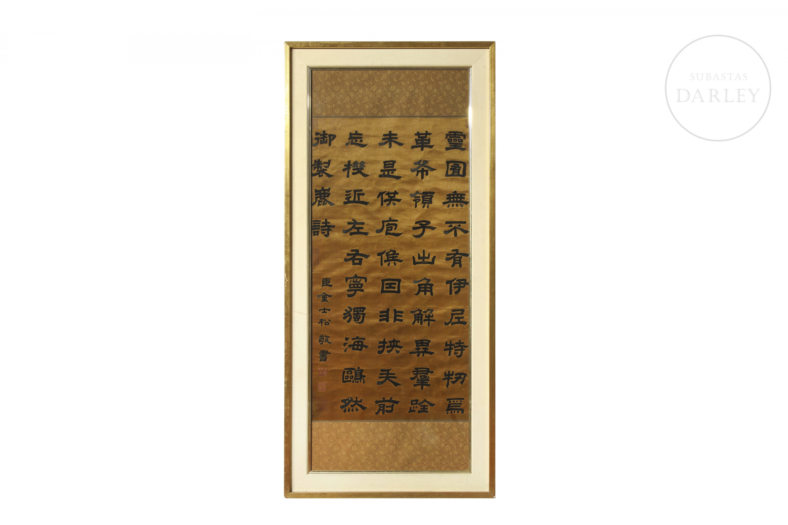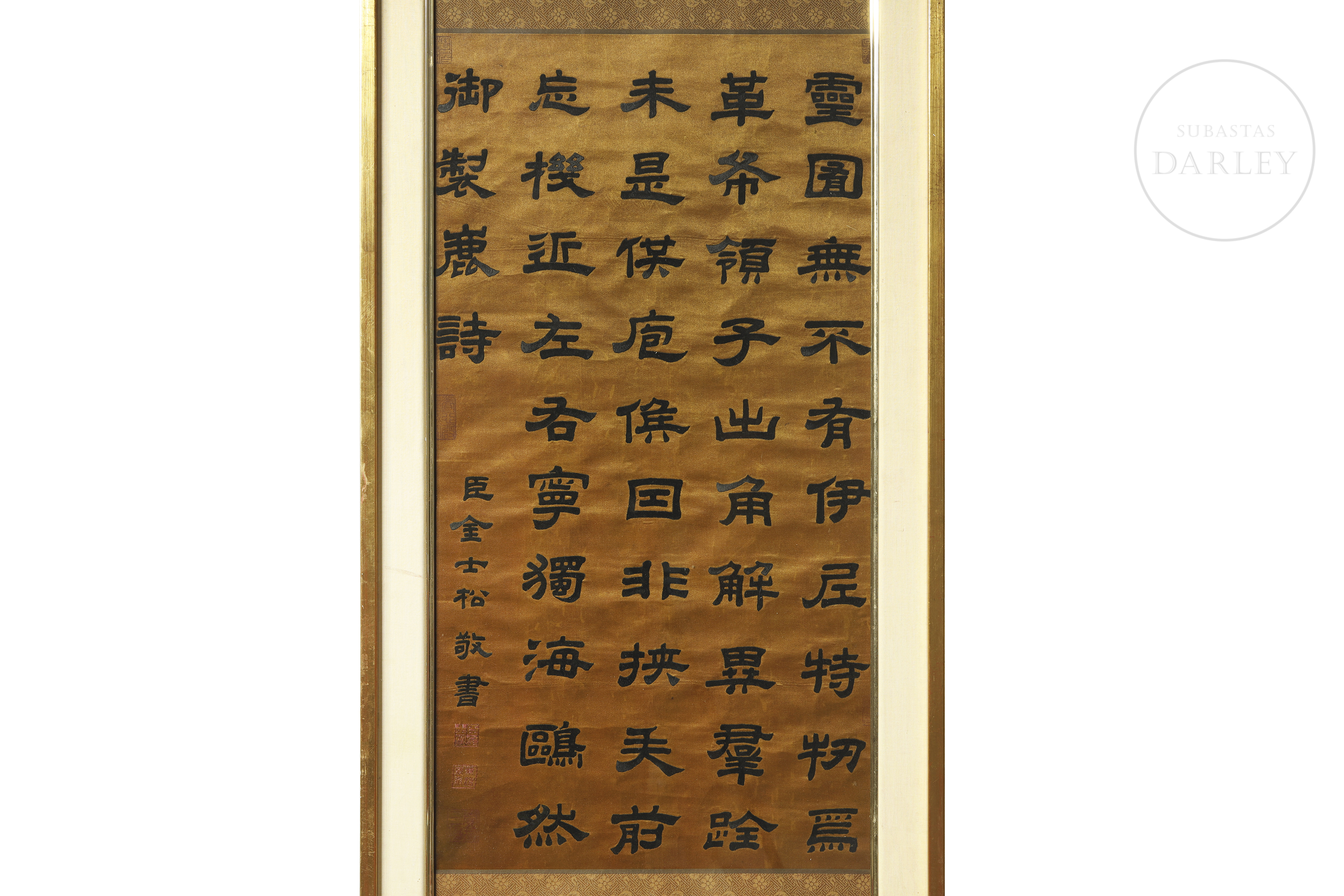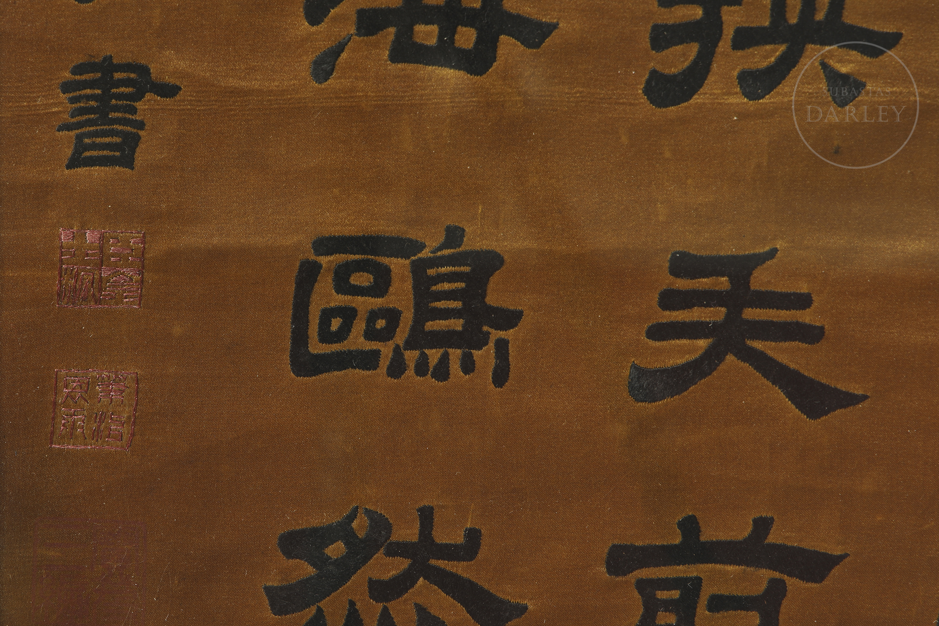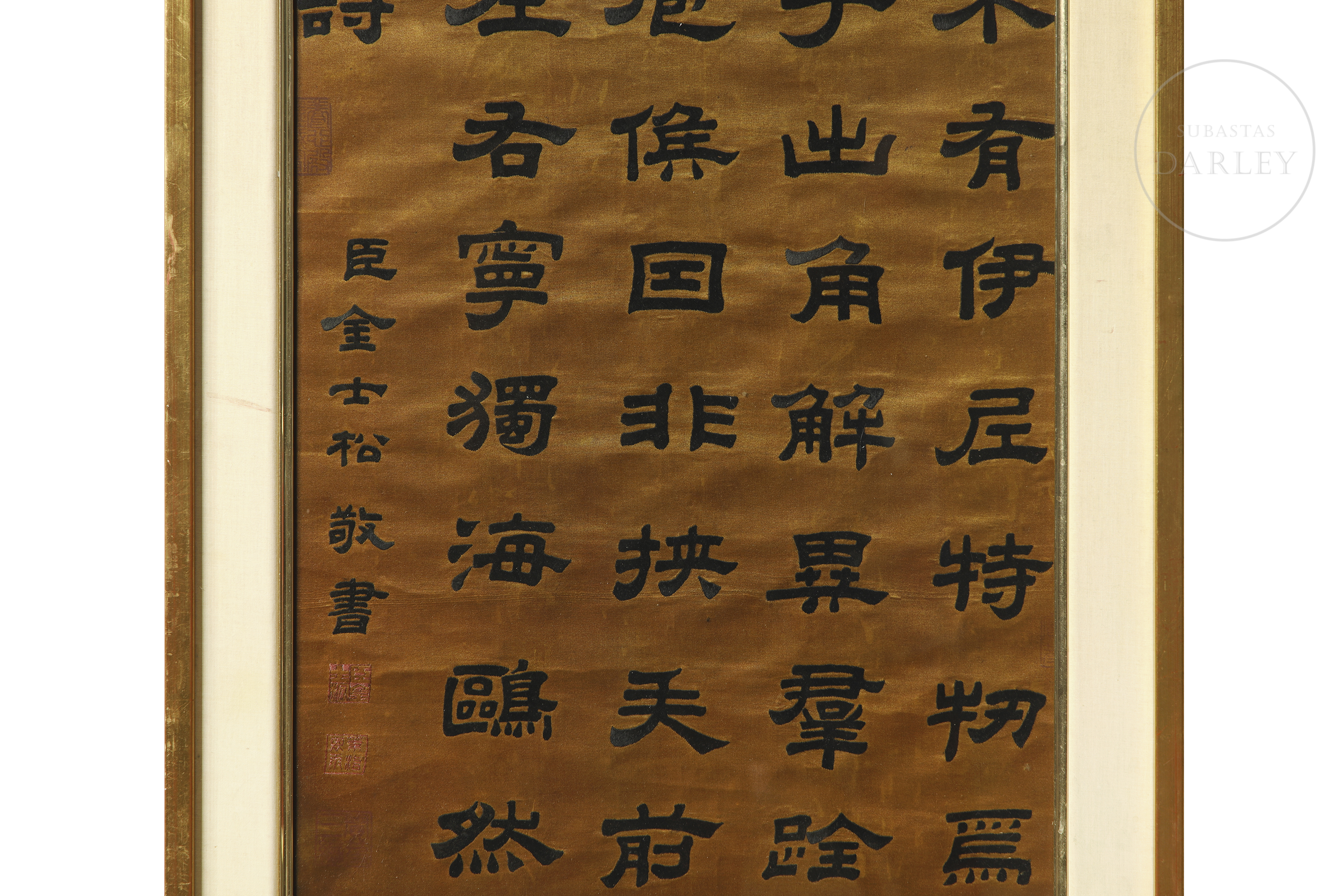 Calligraphy and embroidered seals on ochre-toned silk with brocade frame.