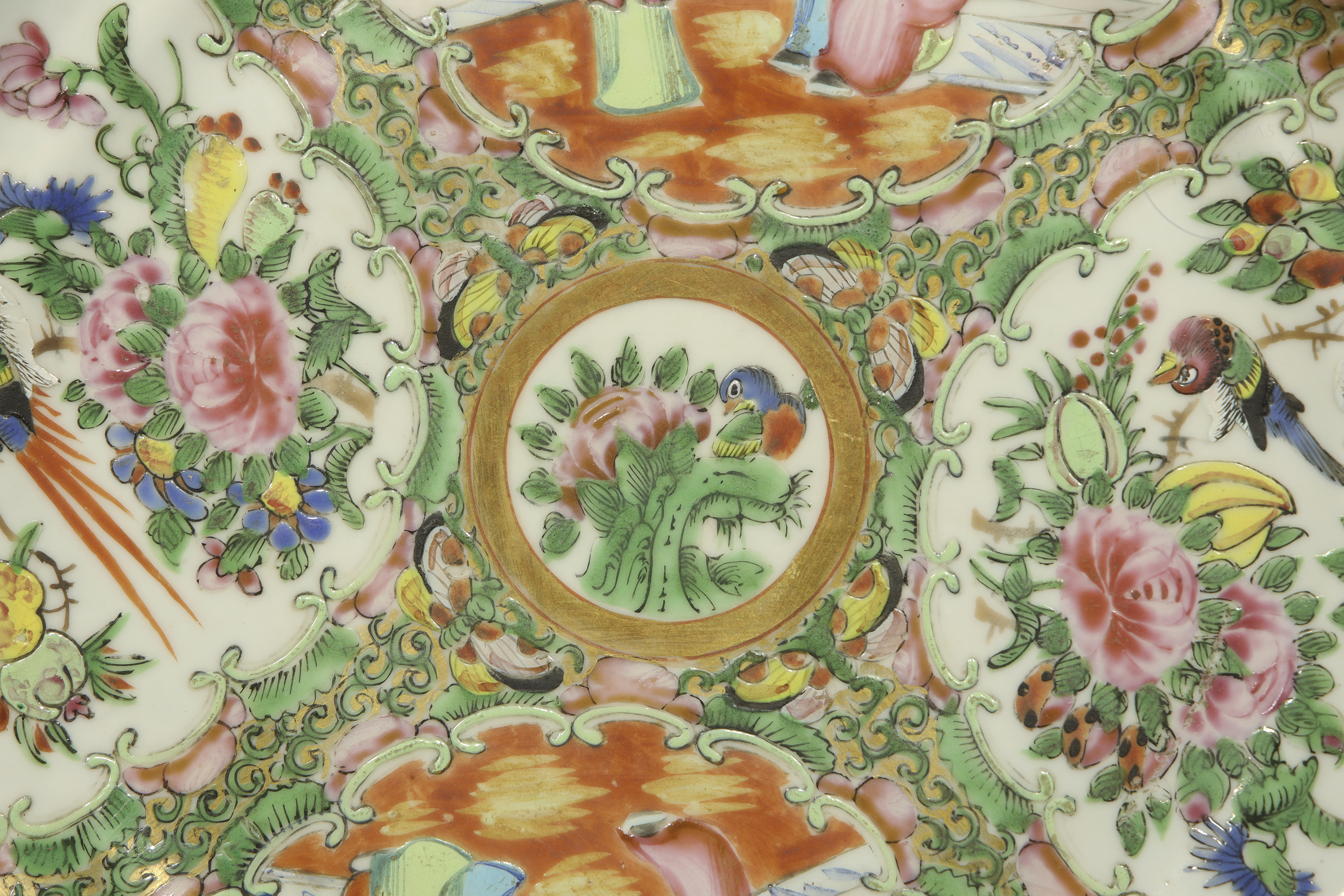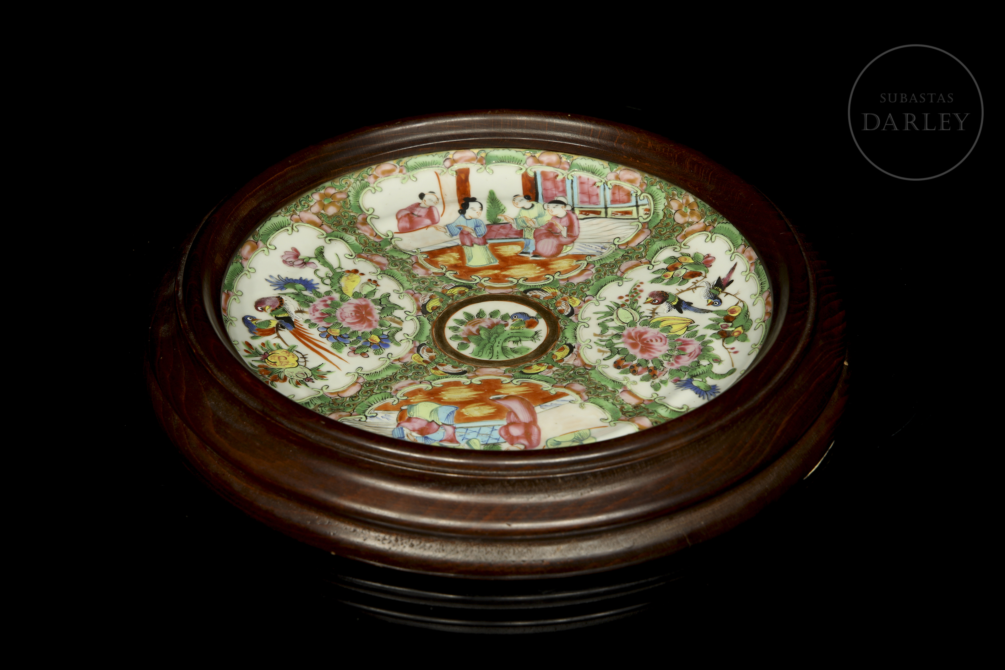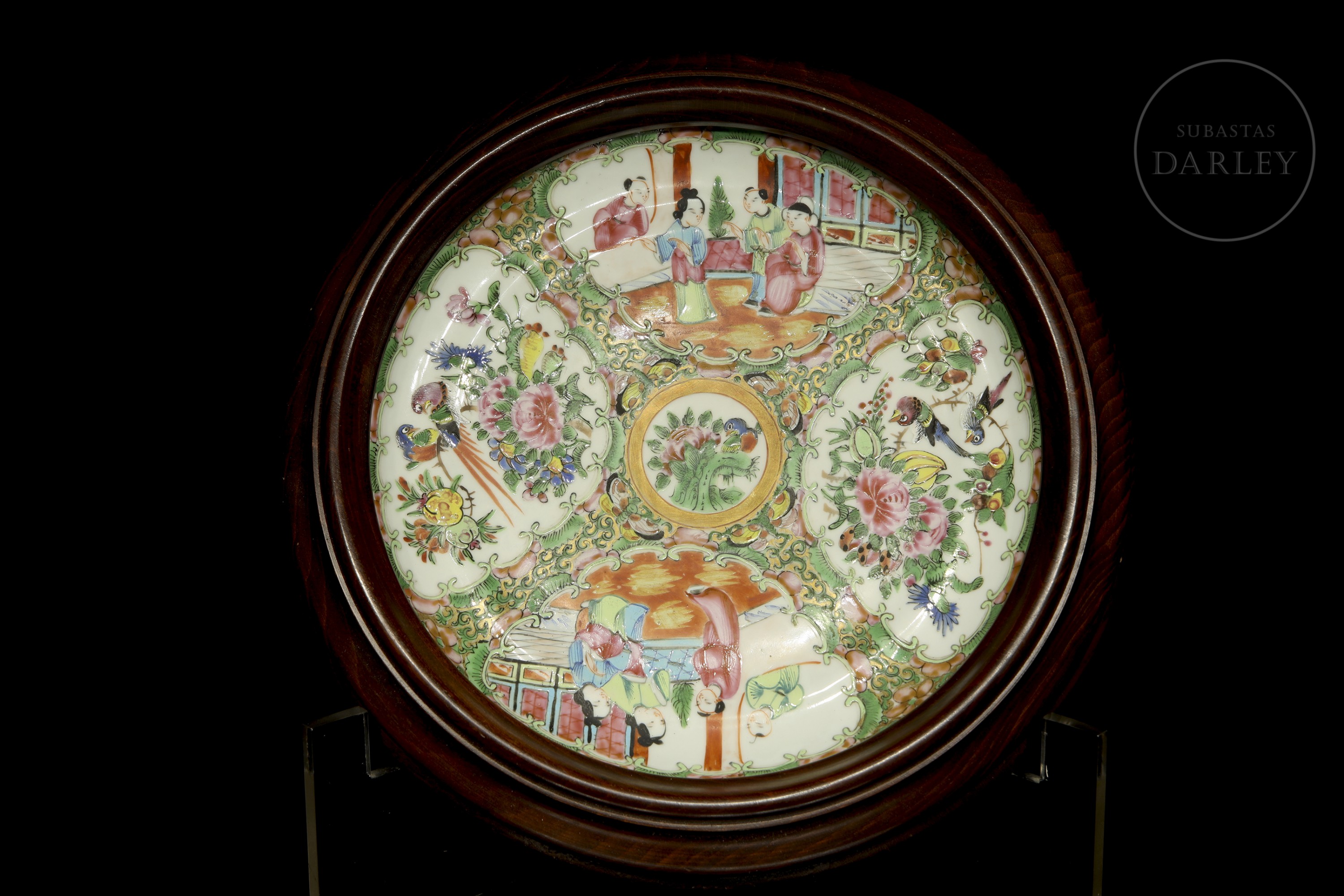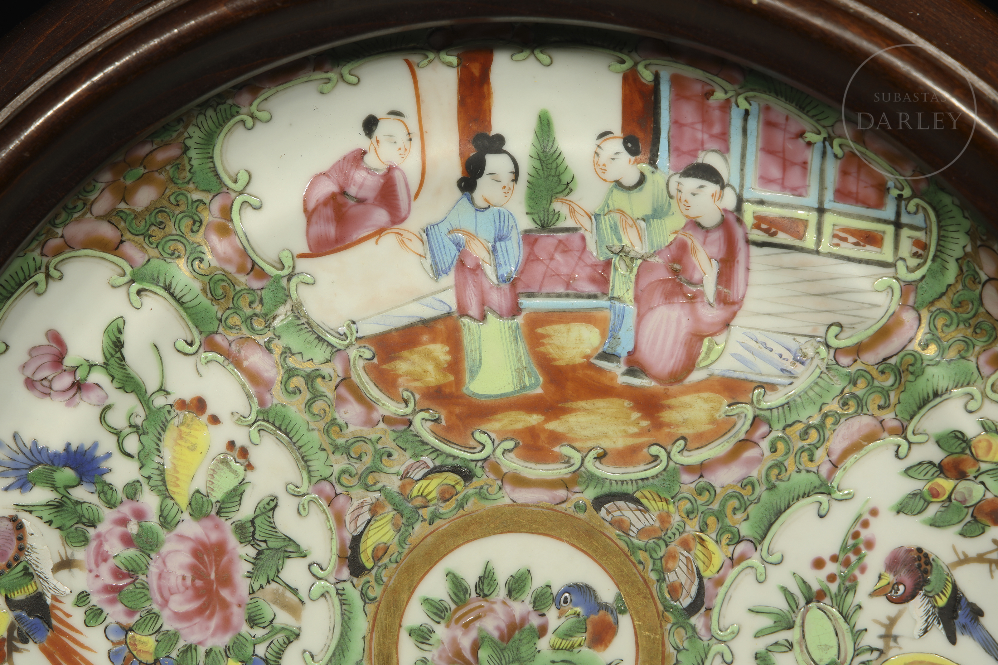Porcelain plates with polychrome enamelled decoration and gilt details. It has a central medallion with a large lotus branch in blossom on which a small bird rests. The rim is also decorated with a succession of scenes framed by rows of ruyis, depicting palace figures interspersed with trees and birds on large bouquets of flowers.