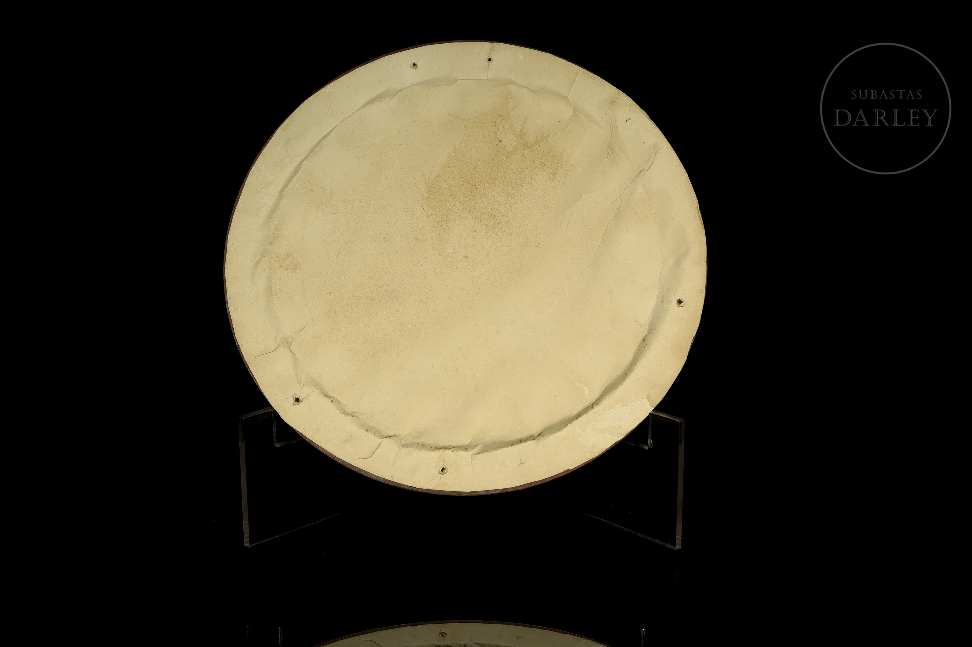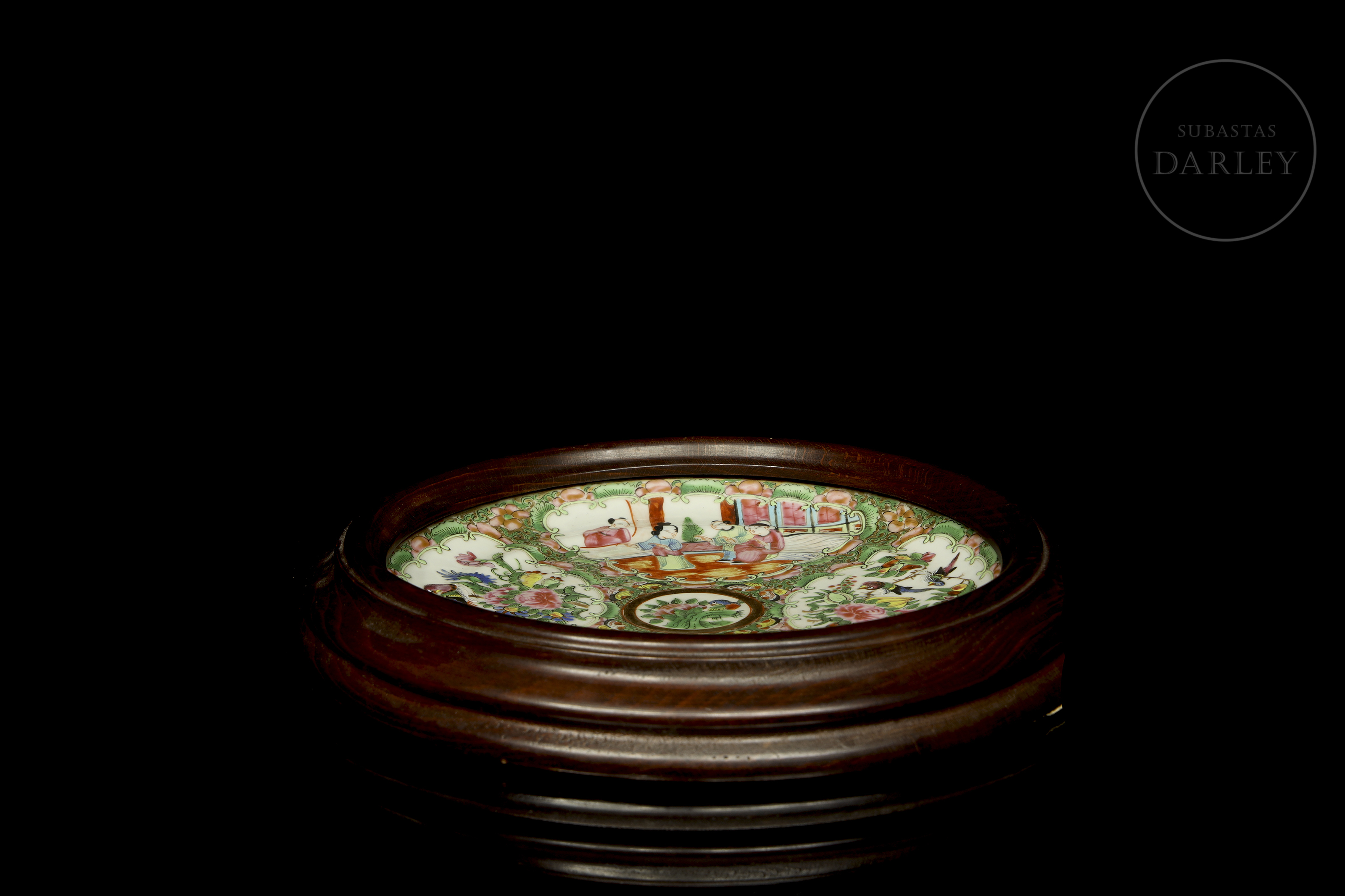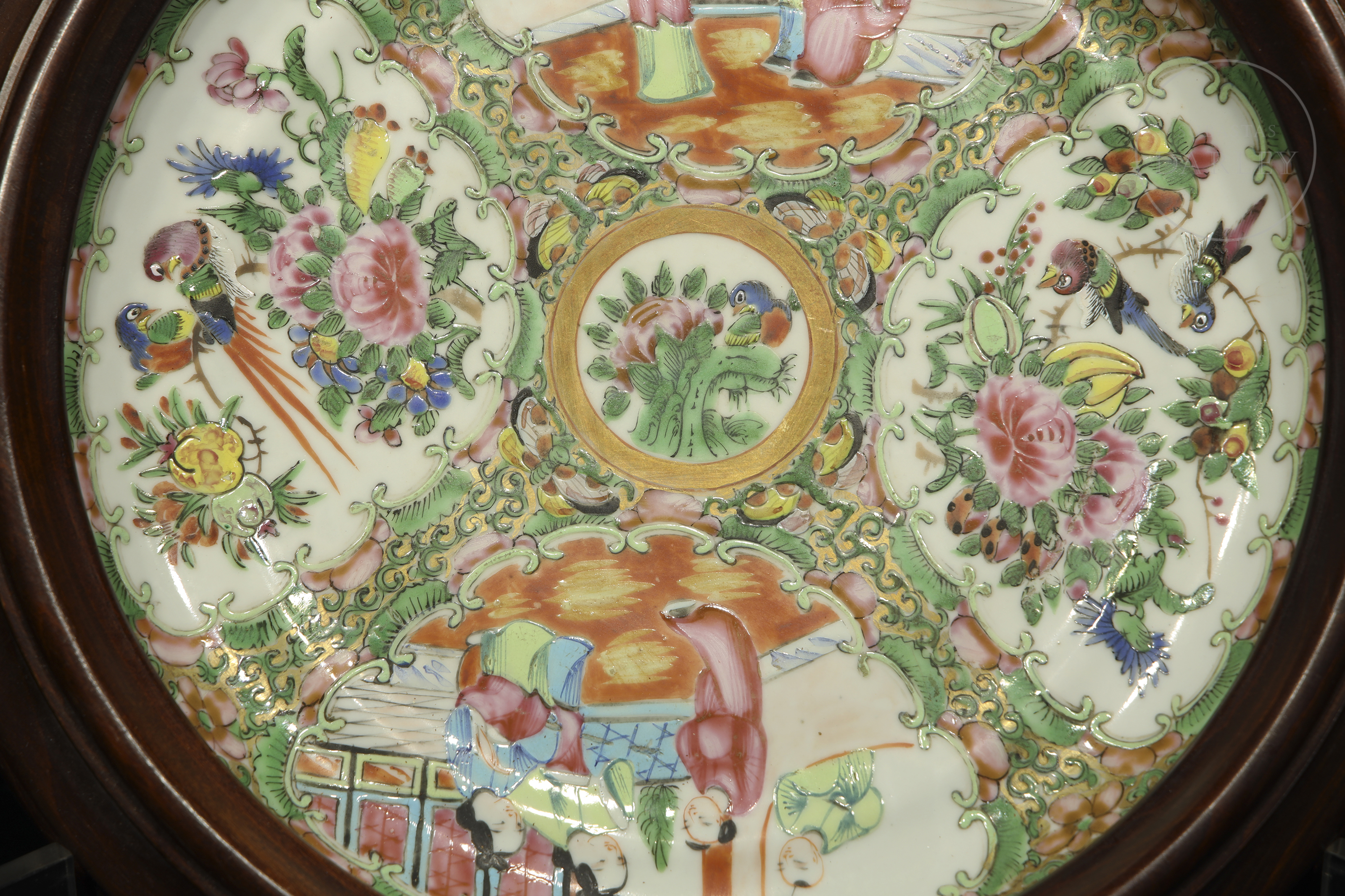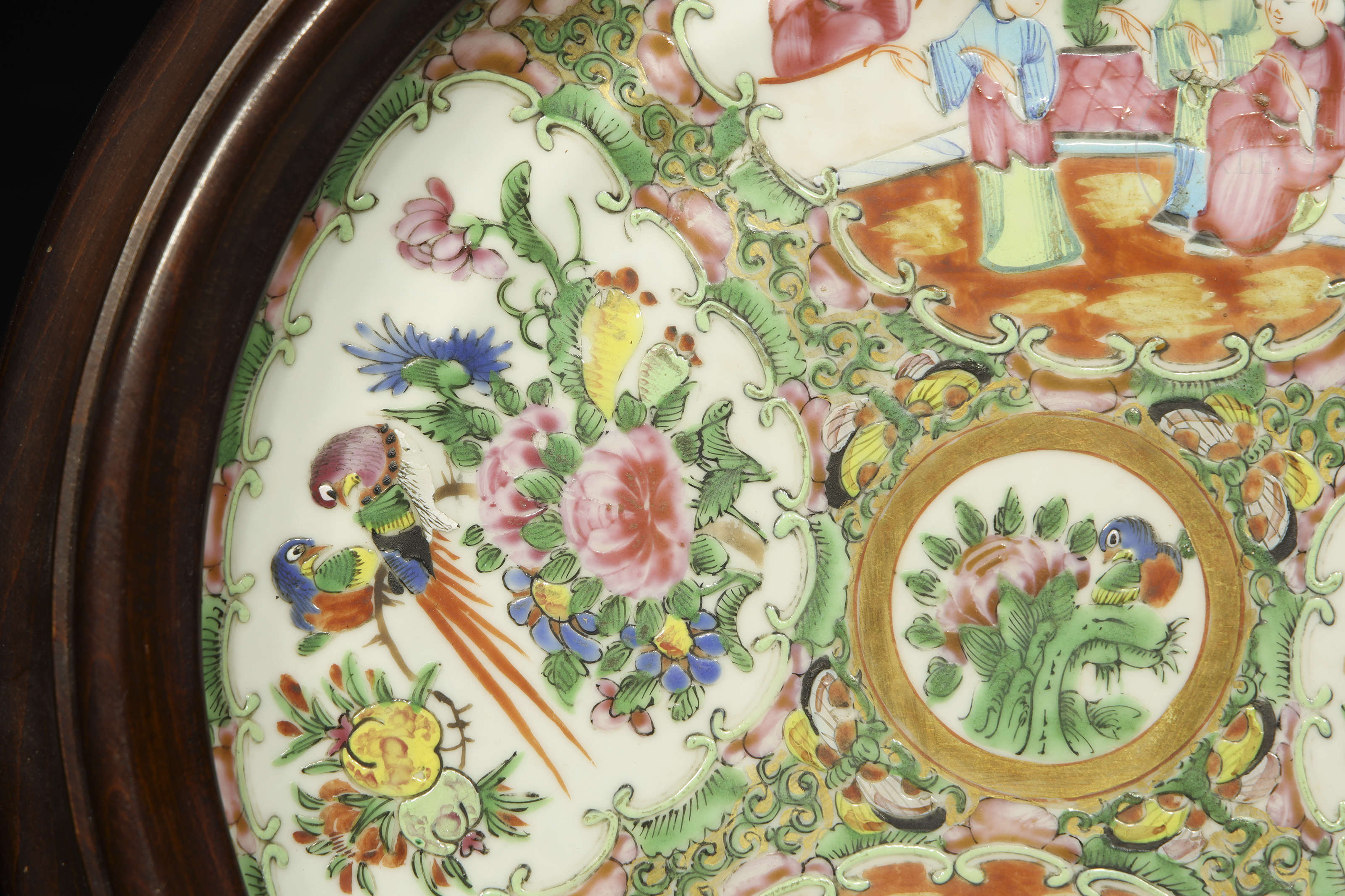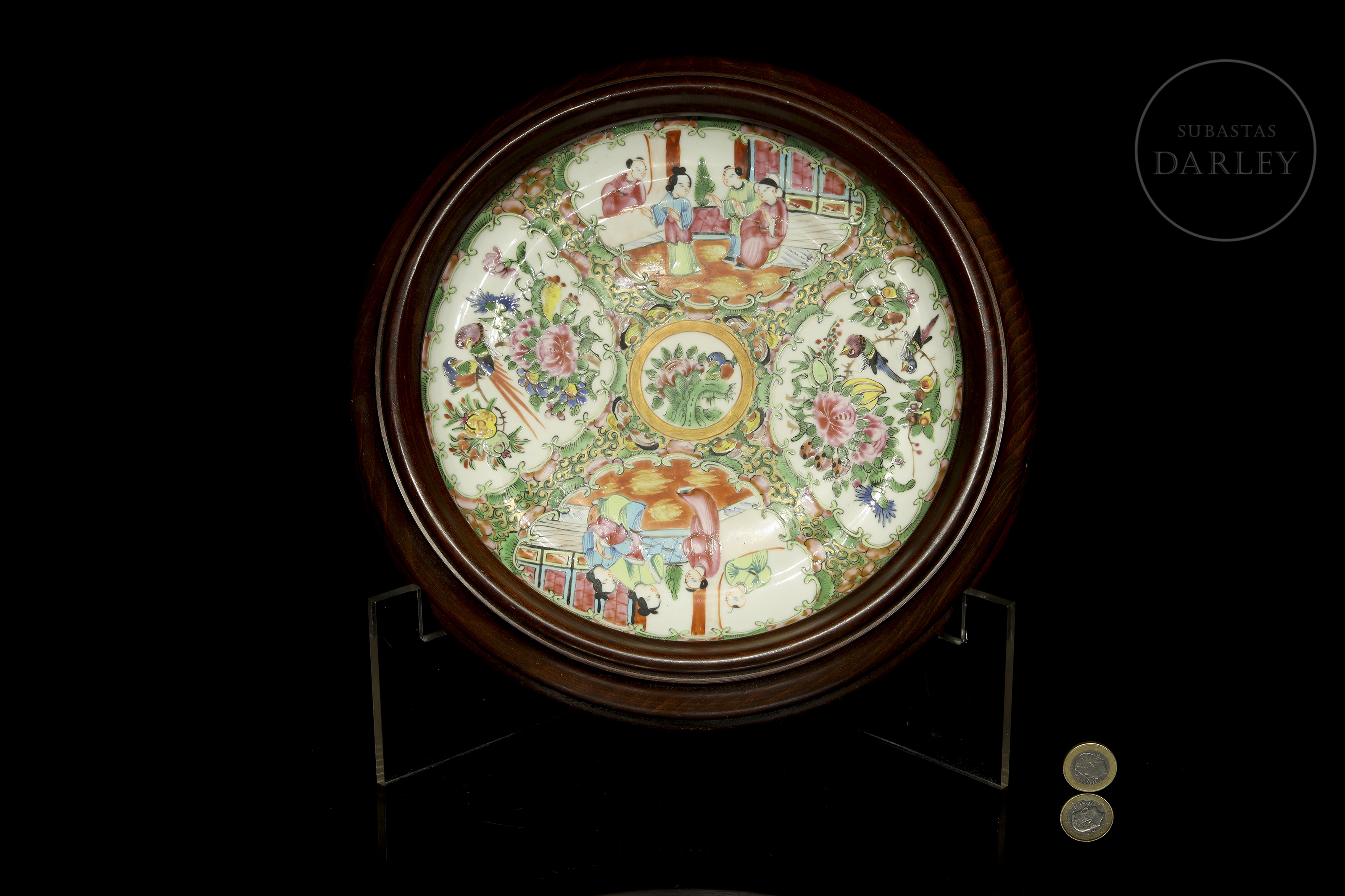 Porcelain plates with polychrome enamelled decoration and gilt details. It has a central medallion with a large lotus branch in blossom on which a small bird rests. The rim is also decorated with a succession of scenes framed by rows of ruyis, depicting palace figures interspersed with trees and birds on large bouquets of flowers.