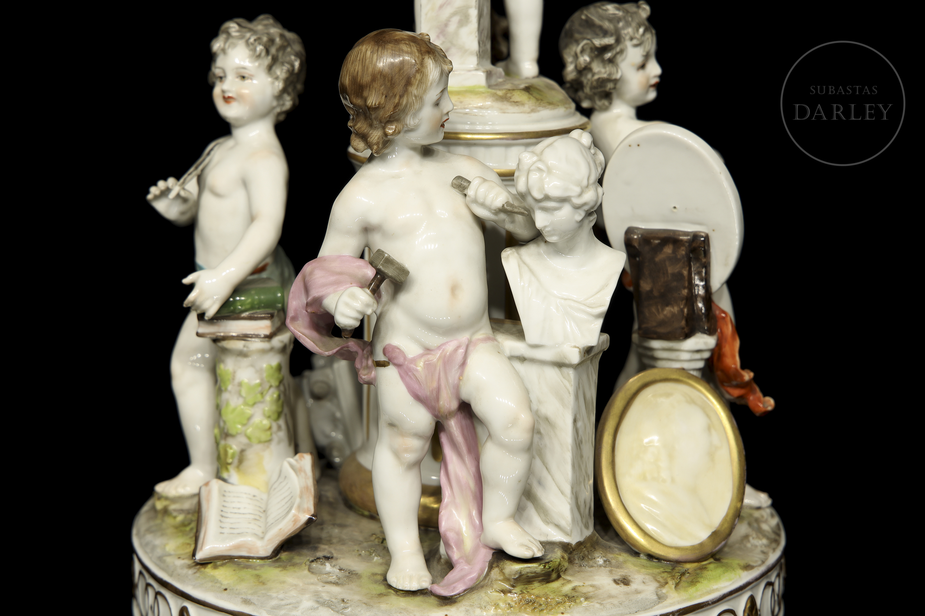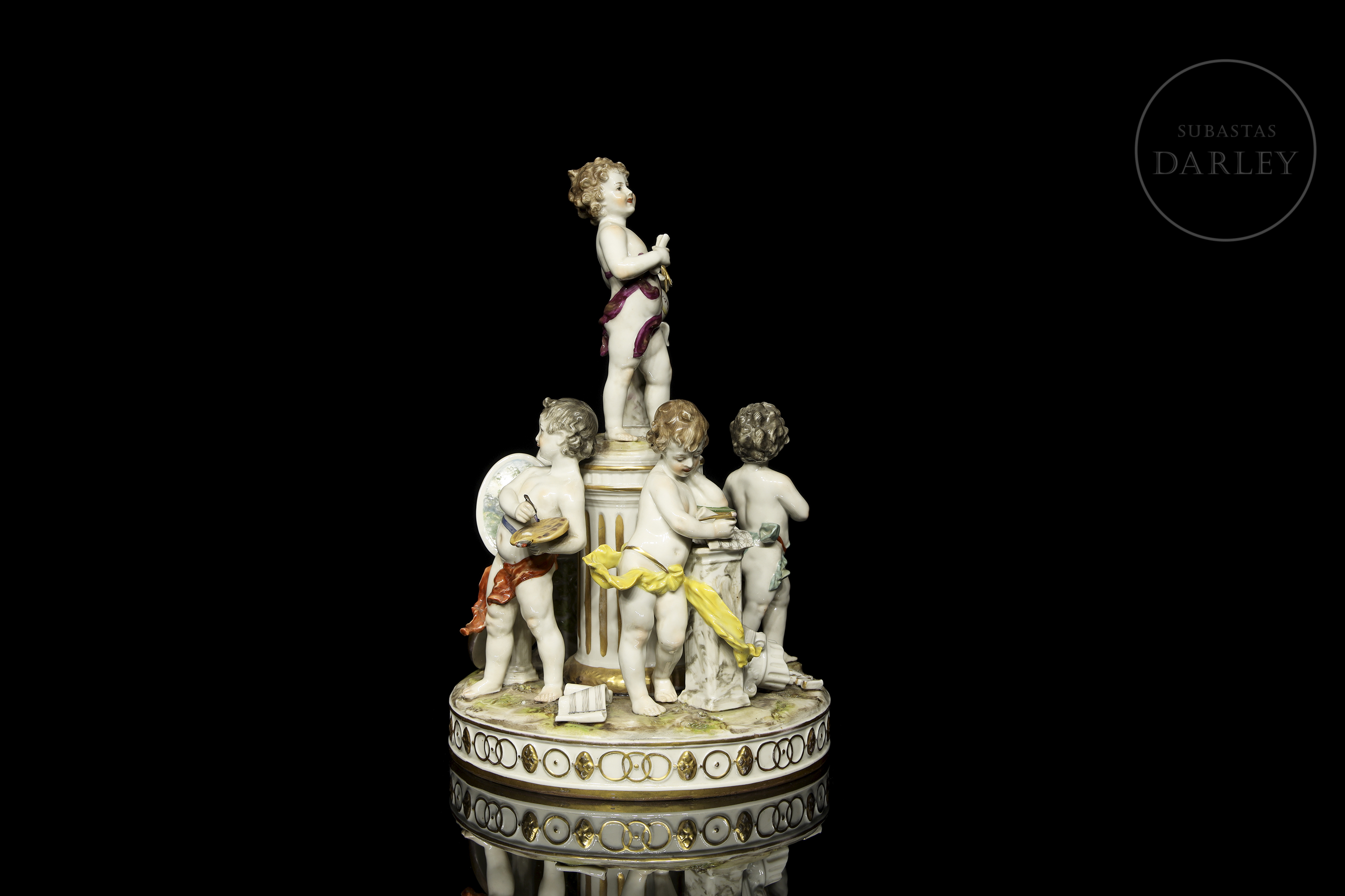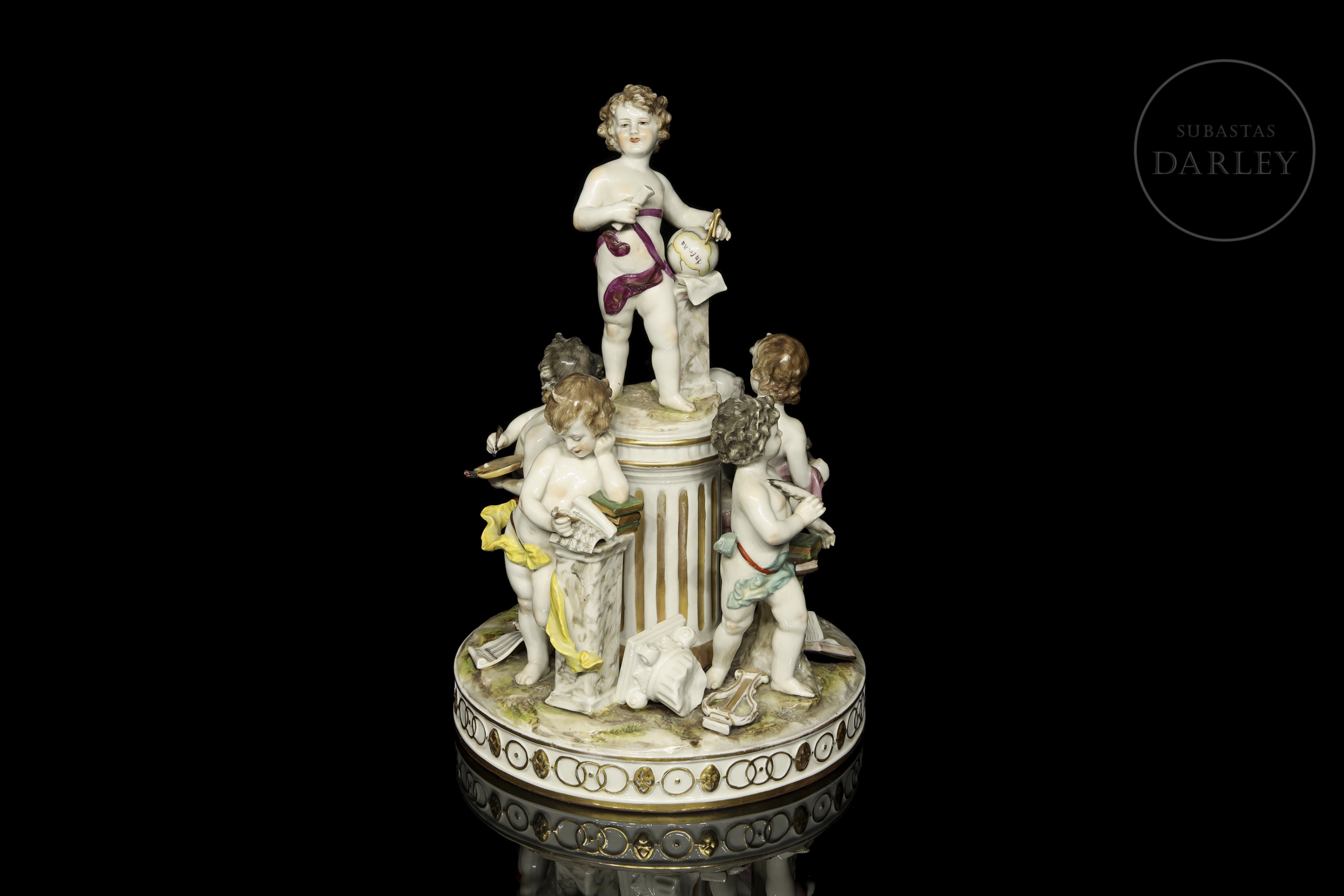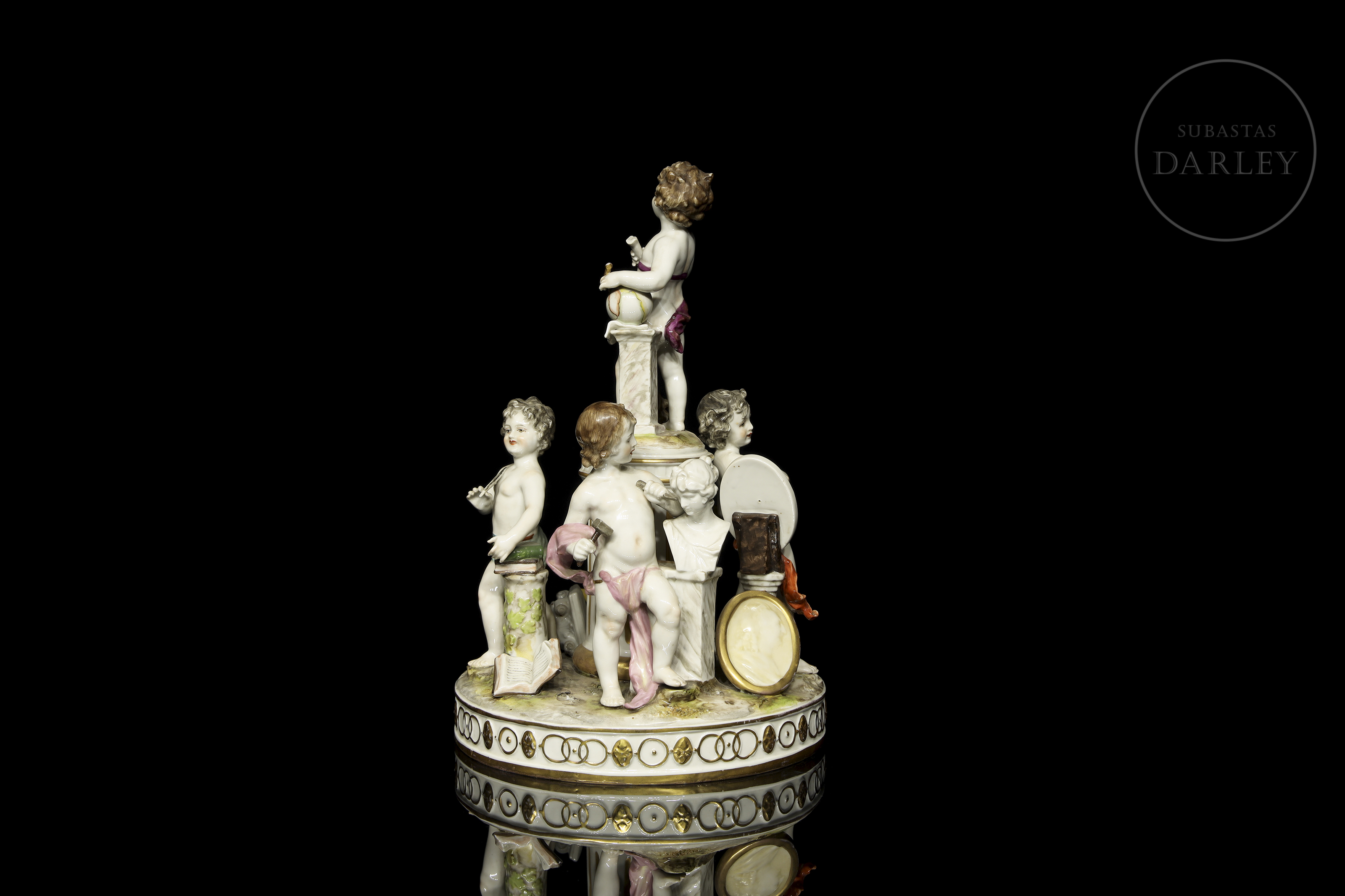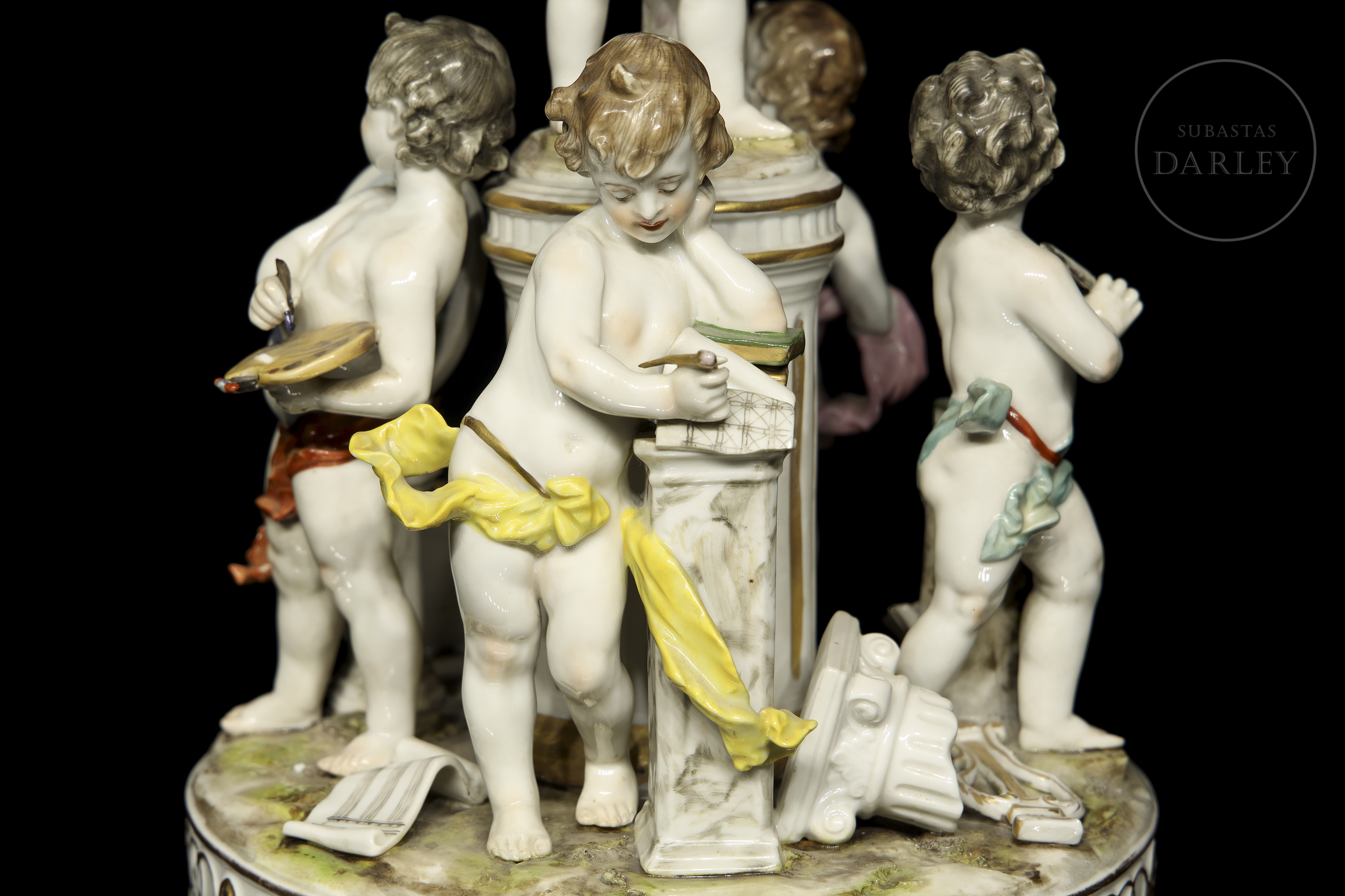 Porcelain figure modelled and enamelled with a glossy effect finish. It depicts five small little love birds with attributes referring to the arts and studies. Stamped on the base. Slight damage.