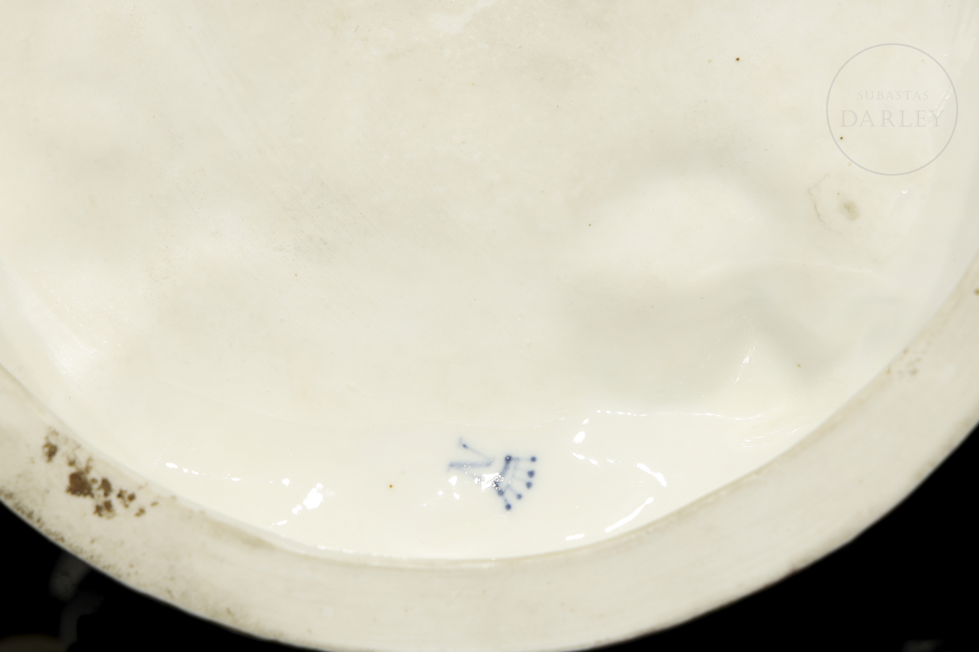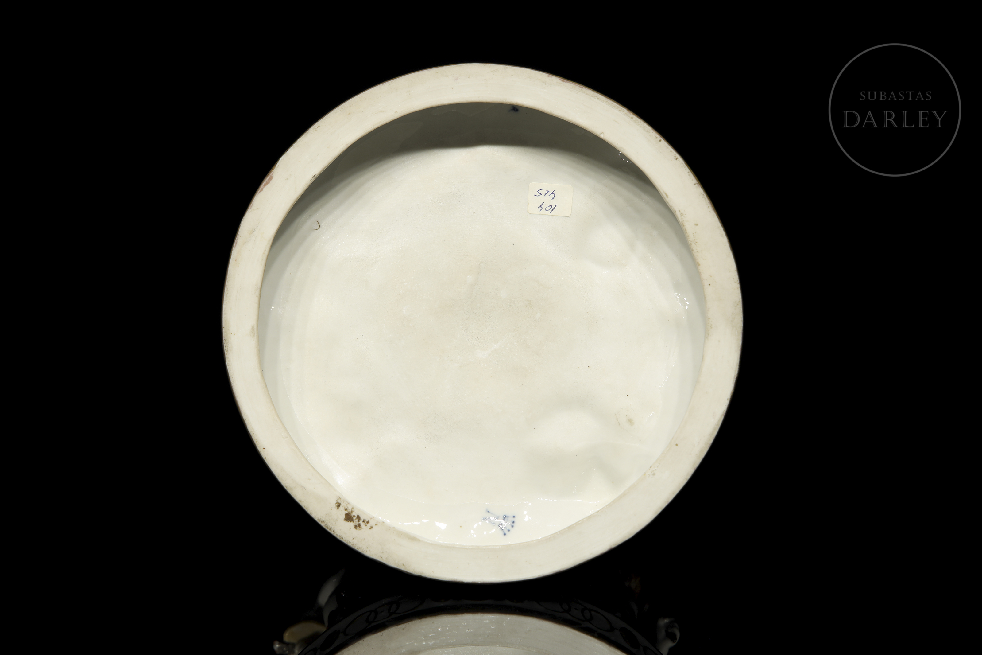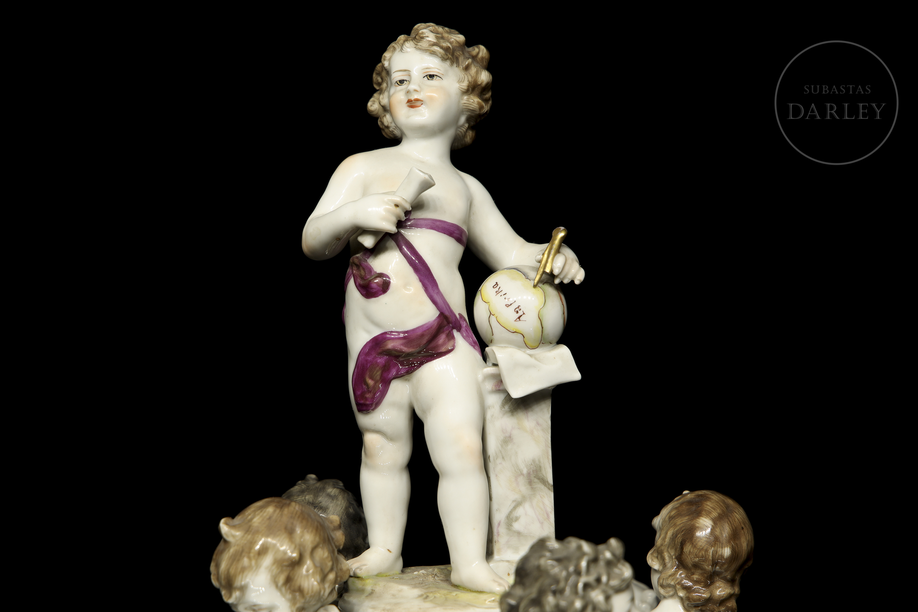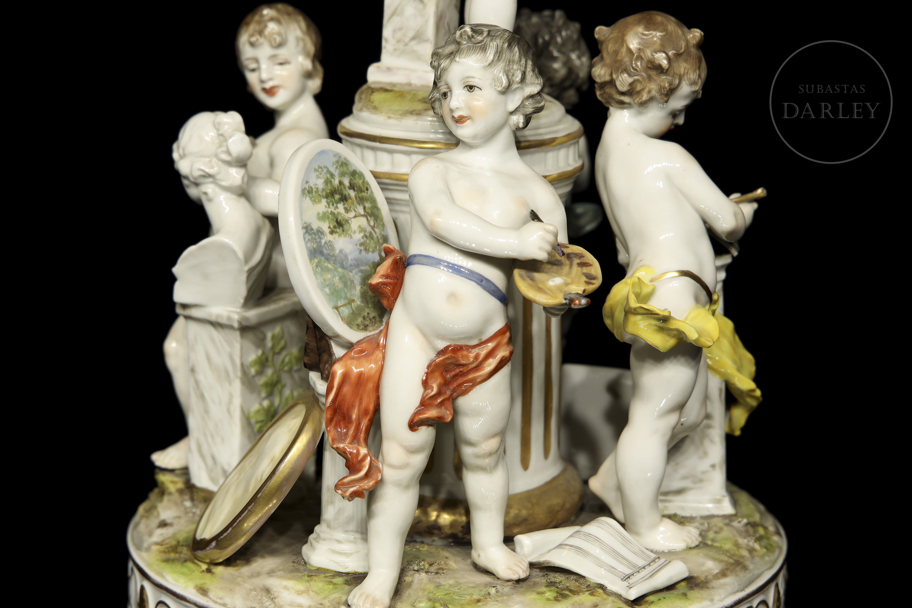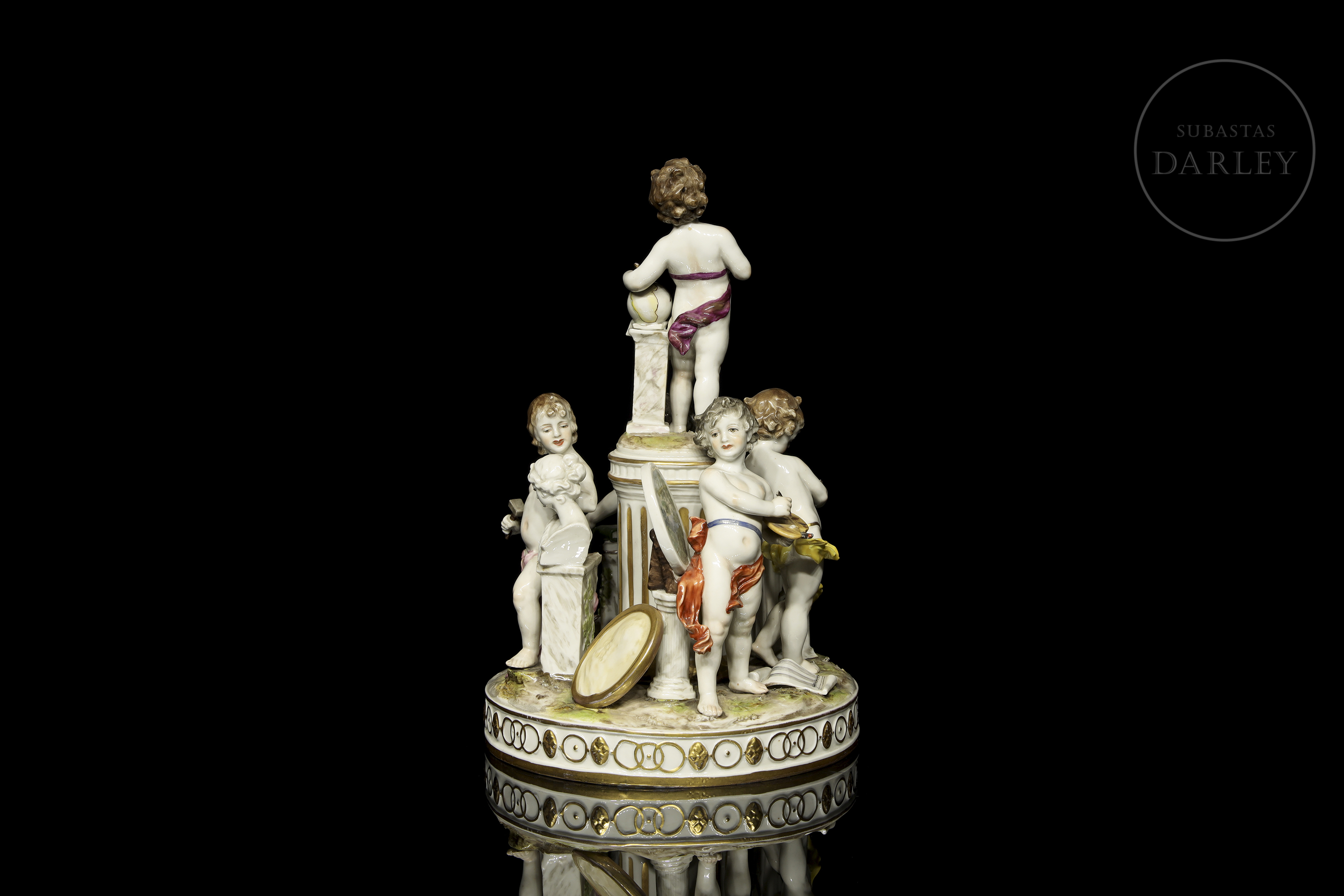 Porcelain figure modelled and enamelled with a glossy effect finish. It depicts five small little love birds with attributes referring to the arts and studies. Stamped on the base. Slight damage.