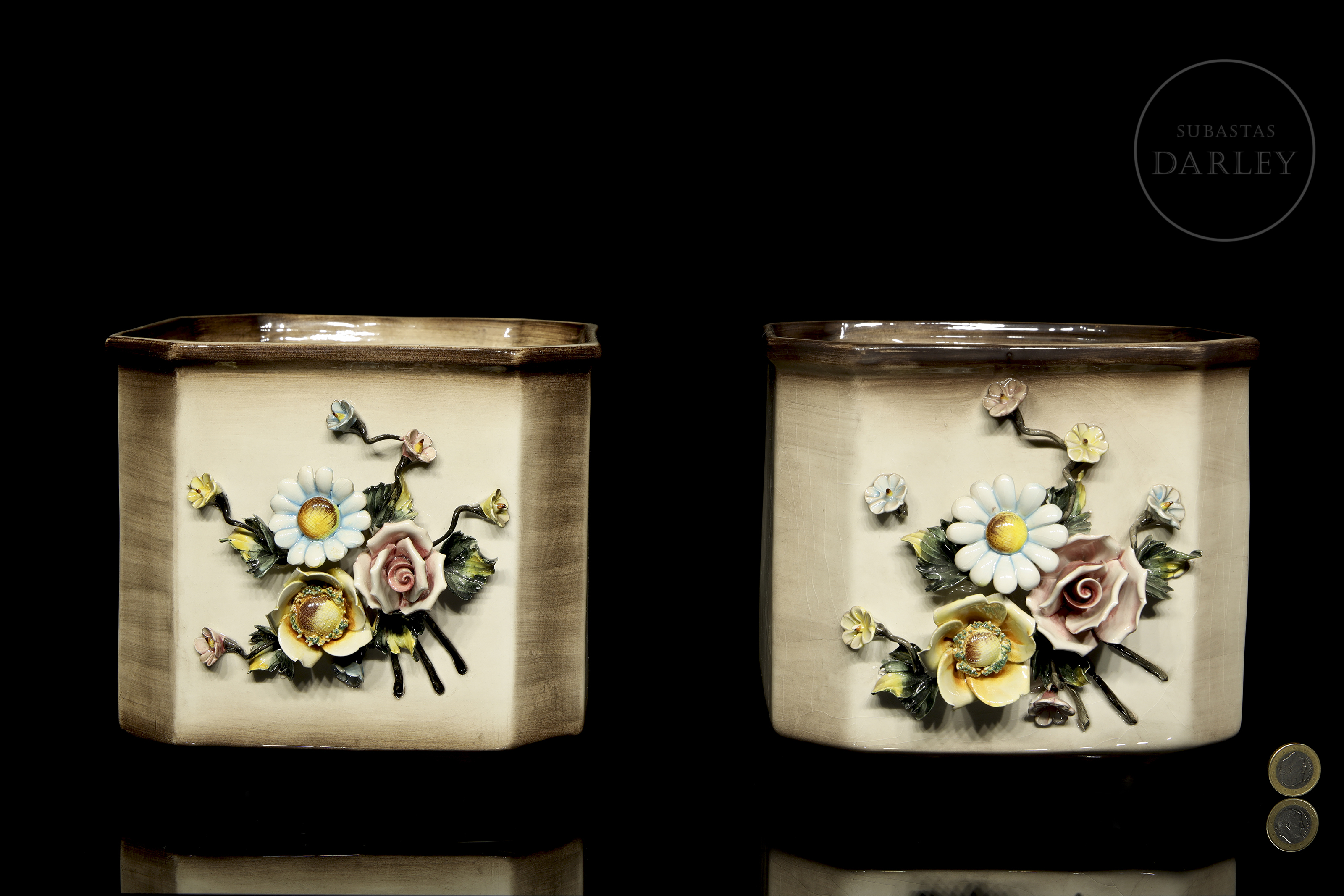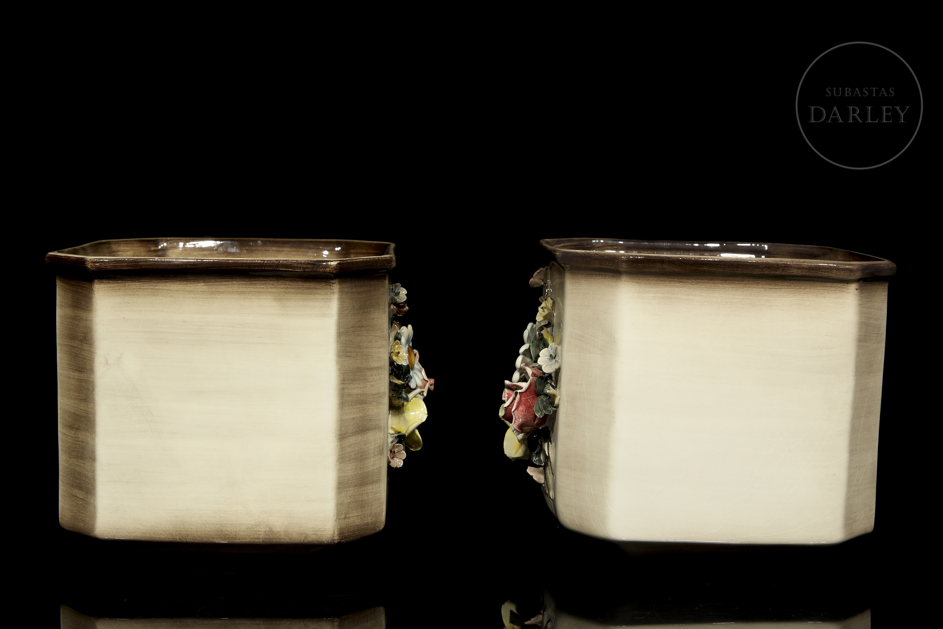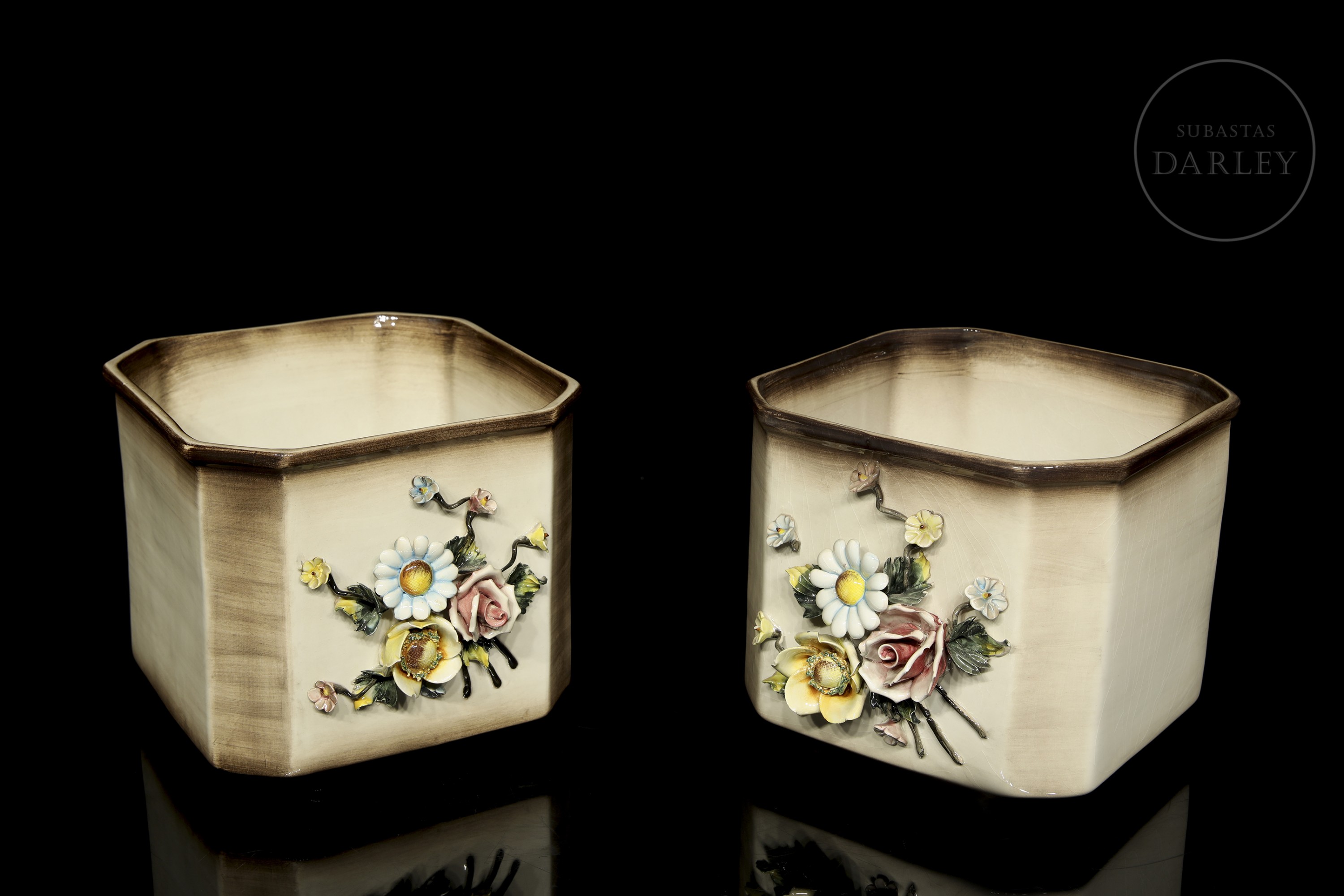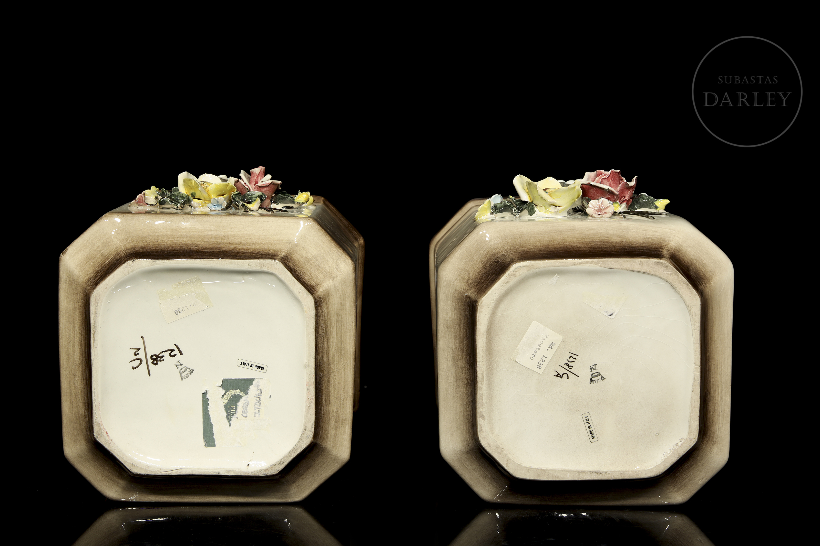 Pair of modelled and enamelled porcelain flowerpots, glossy finish with quadrangular shape and bouquet details. Slightly damaged. Sealed on the base and marked "Made in Italy/ Md. 1238".