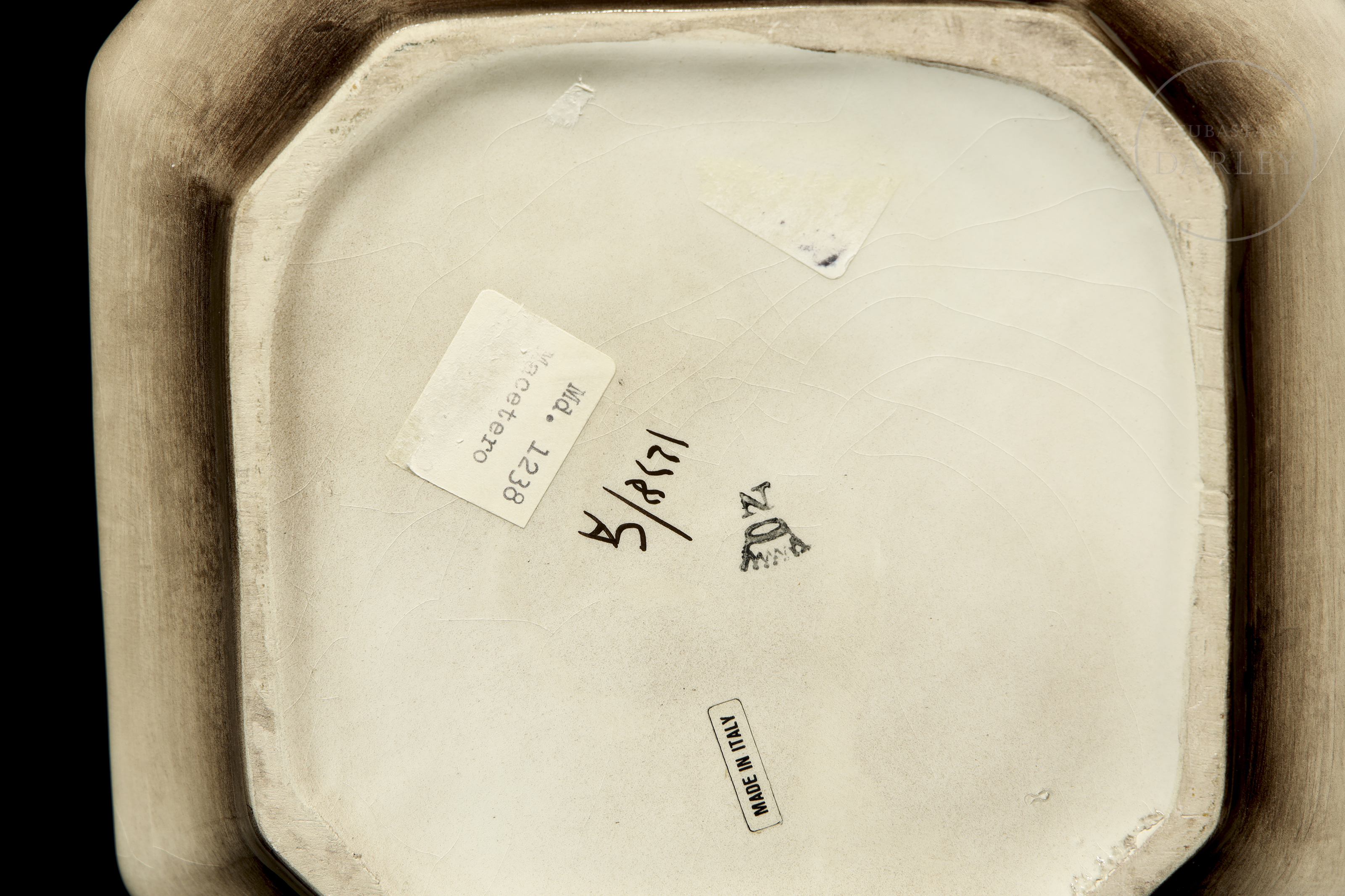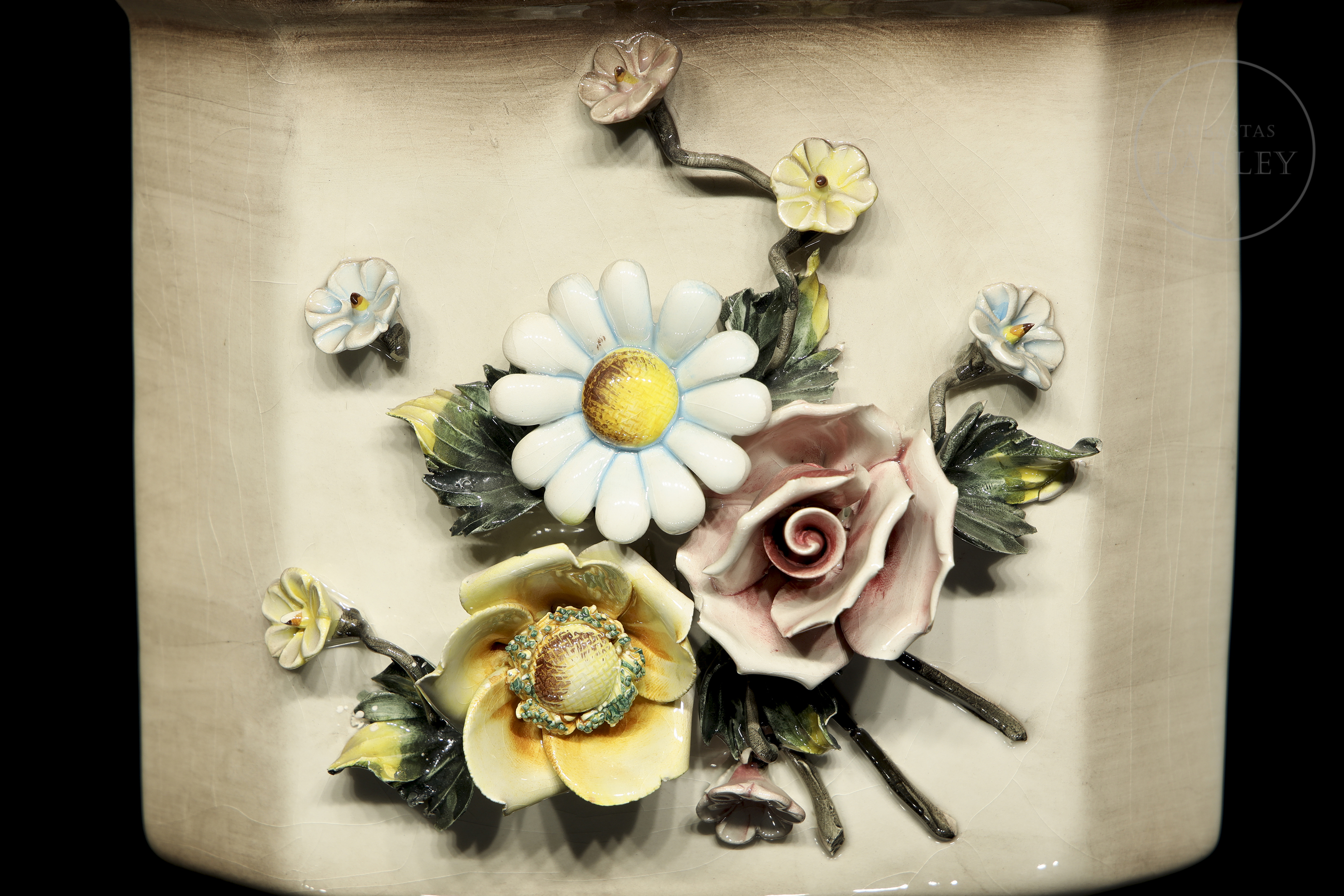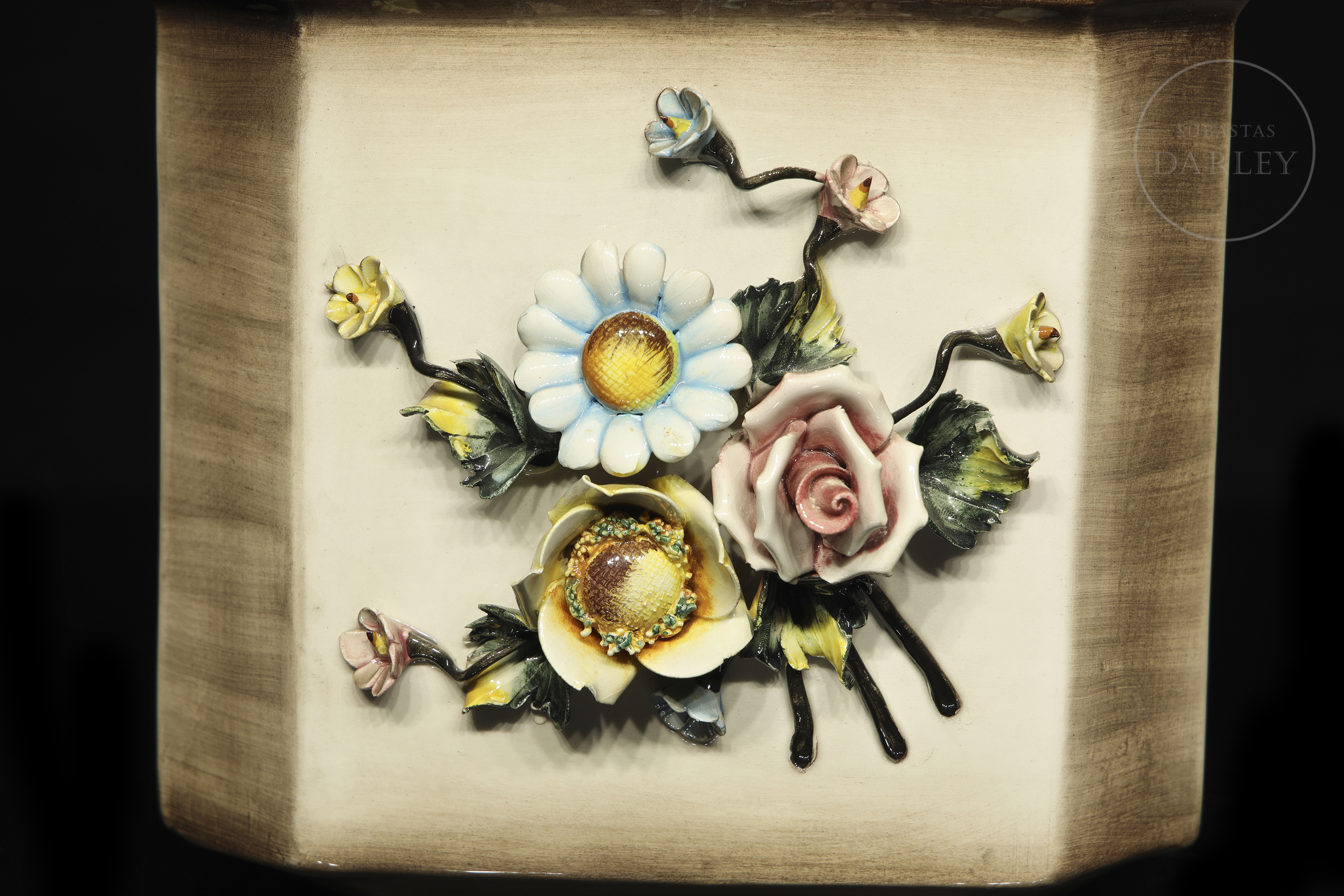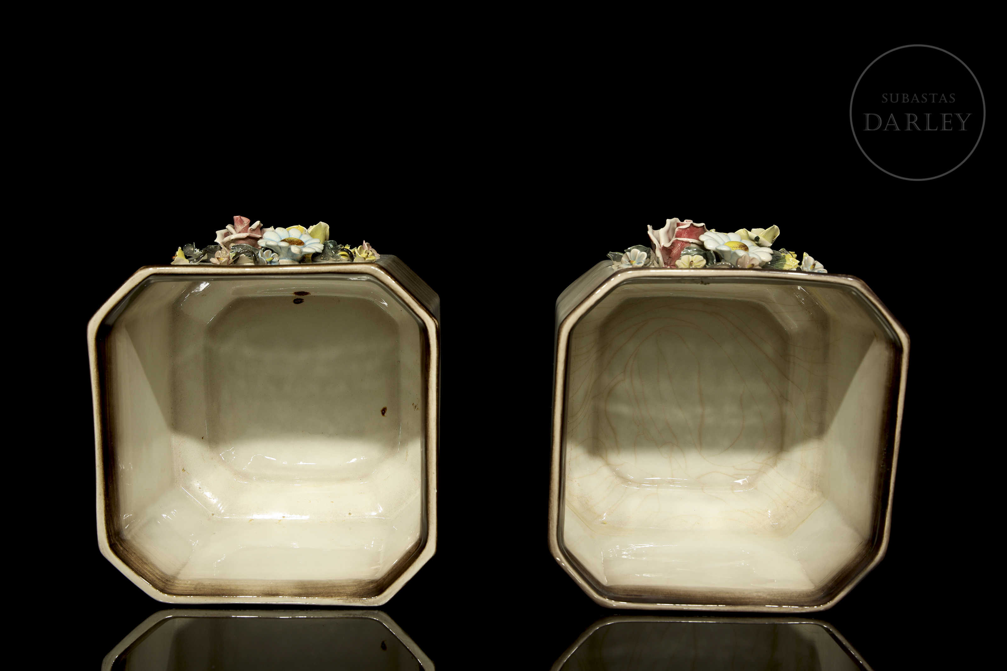 Pair of modelled and enamelled porcelain flowerpots, glossy finish with quadrangular shape and bouquet details. Slightly damaged. Sealed on the base and marked "Made in Italy/ Md. 1238".