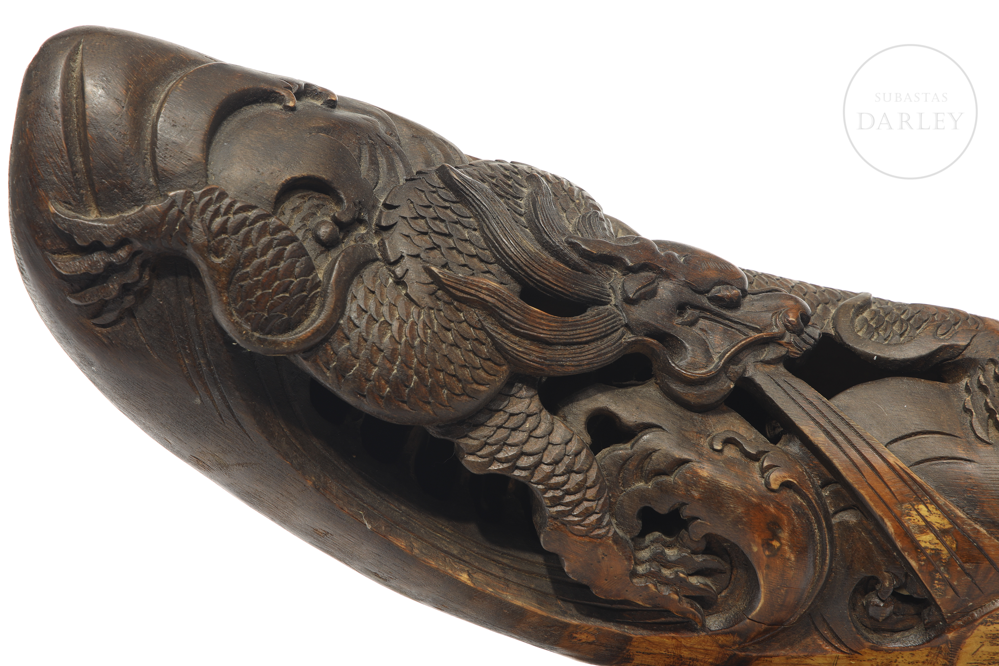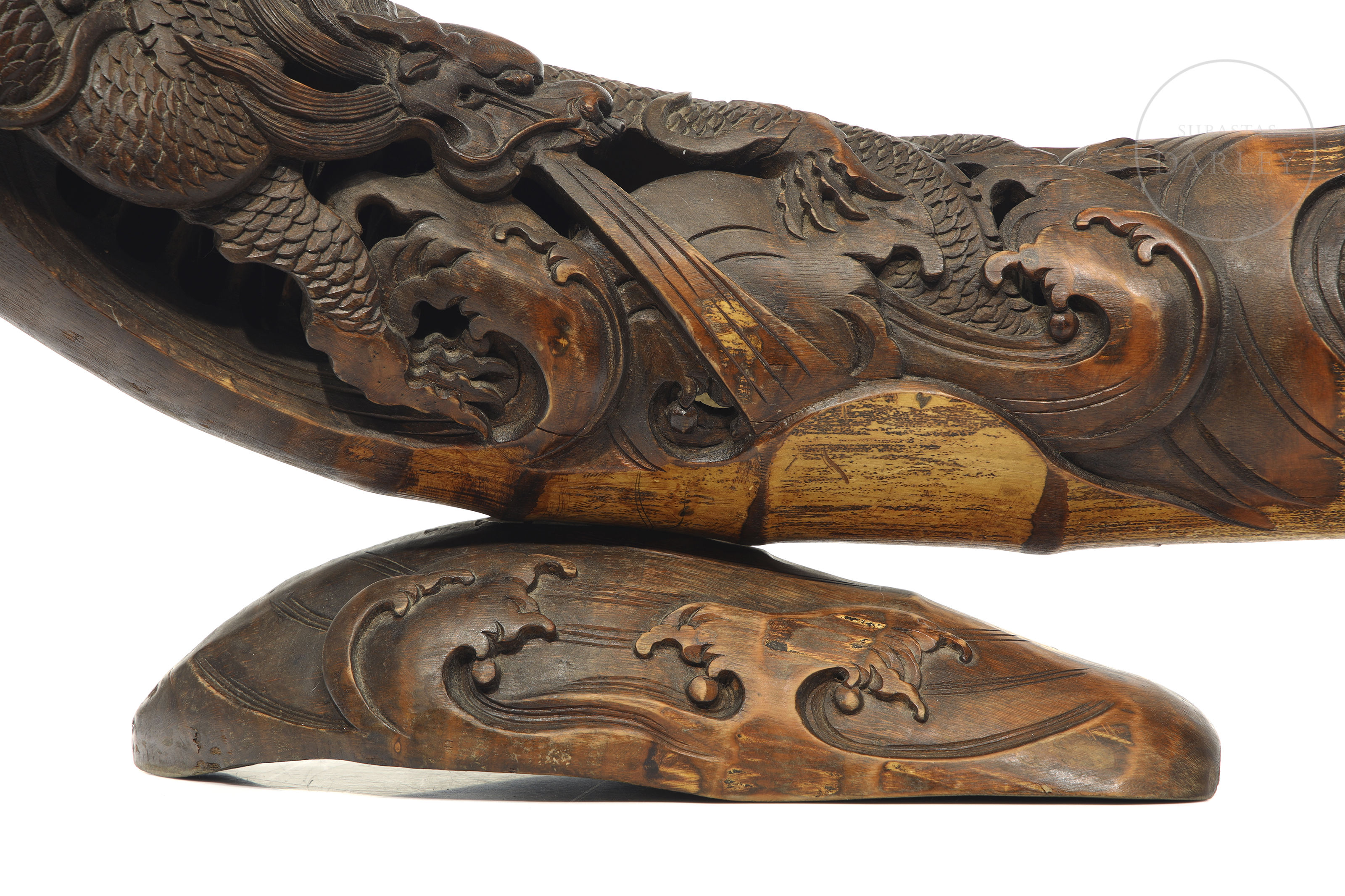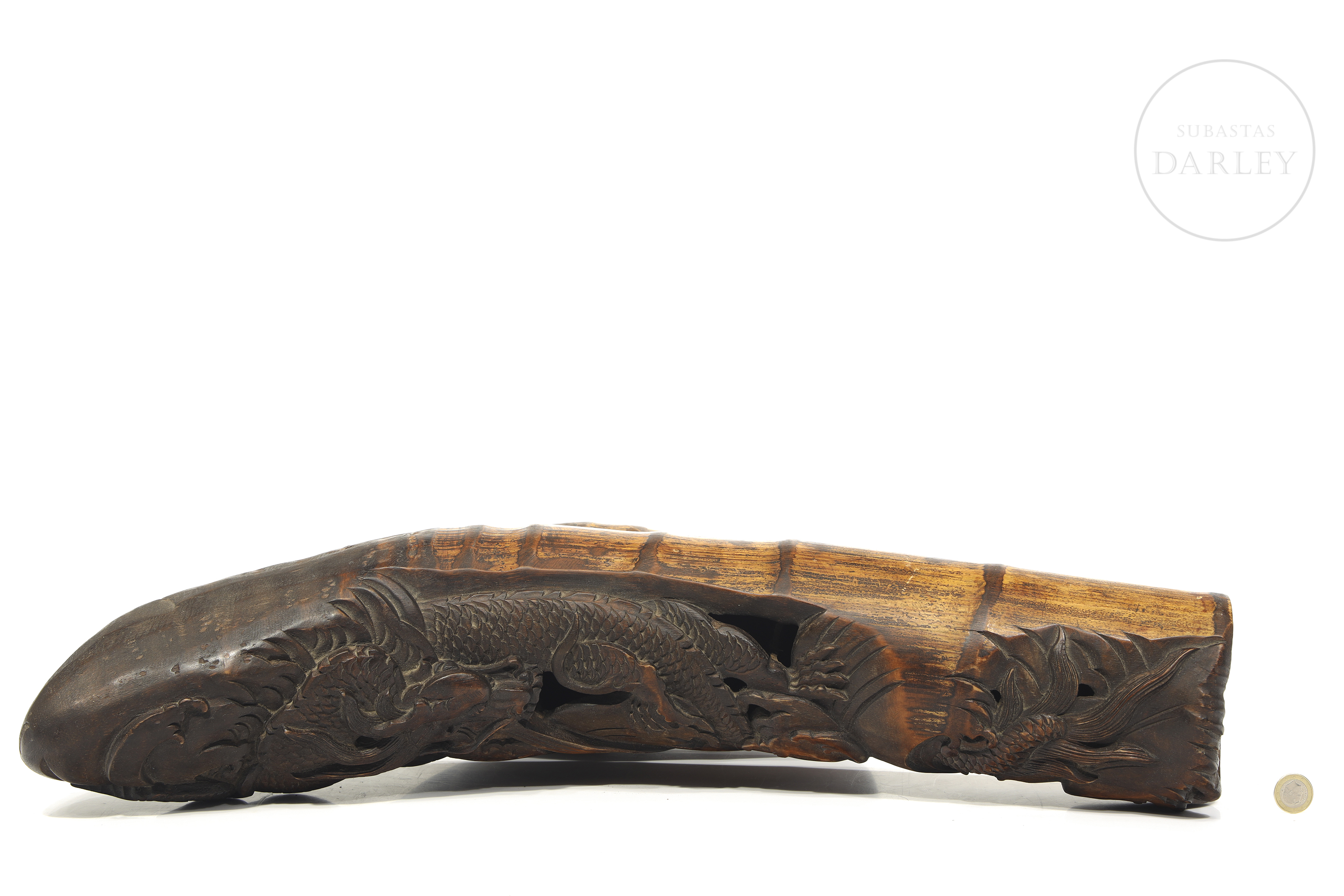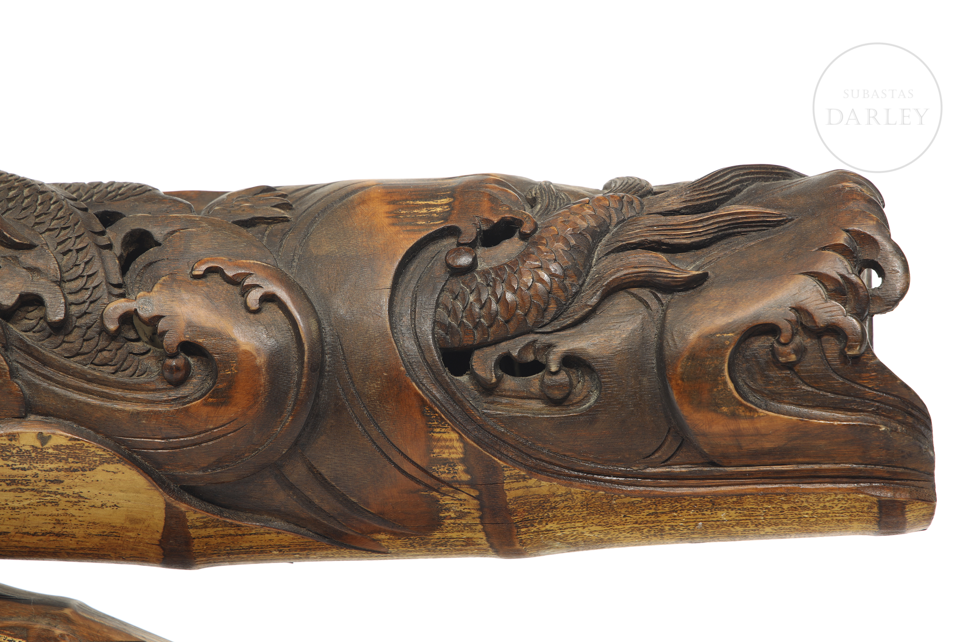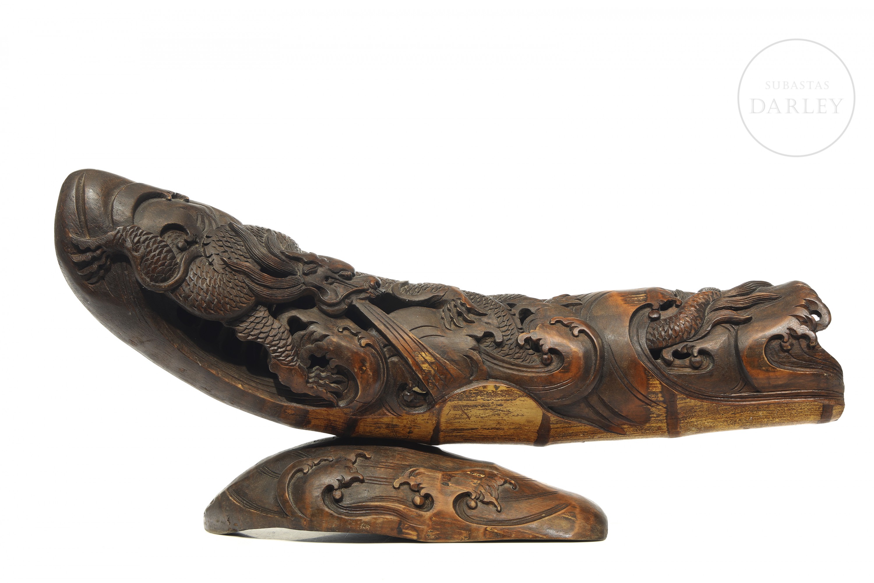 Carved bamboo branch, showing in certain areas the natural bamboo. It shows in bas-relief with openwork details the figure of a large dragon with a coiled body, covered by large waves. With an enraged expression and open jaws, it expels fire from its mouth.
