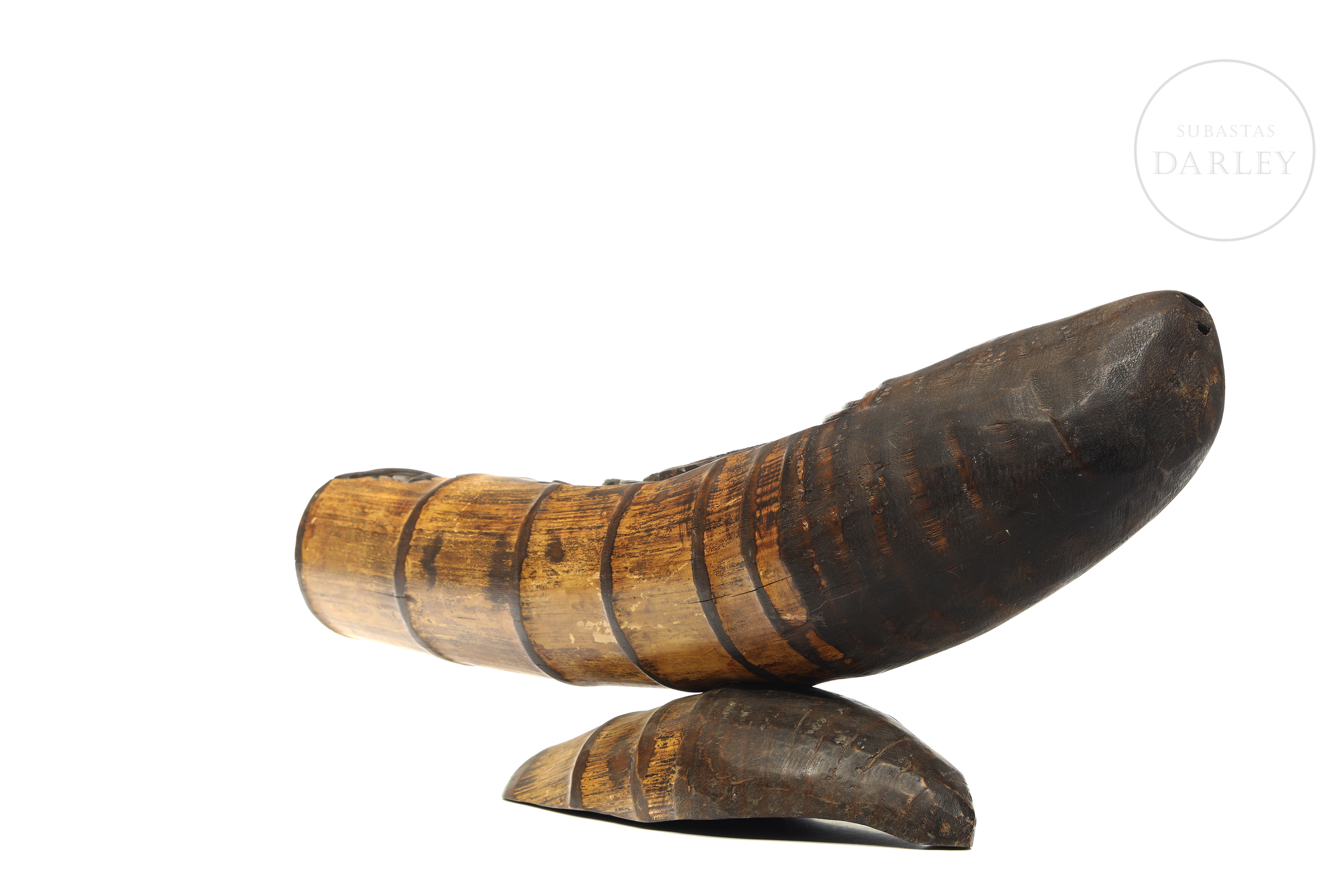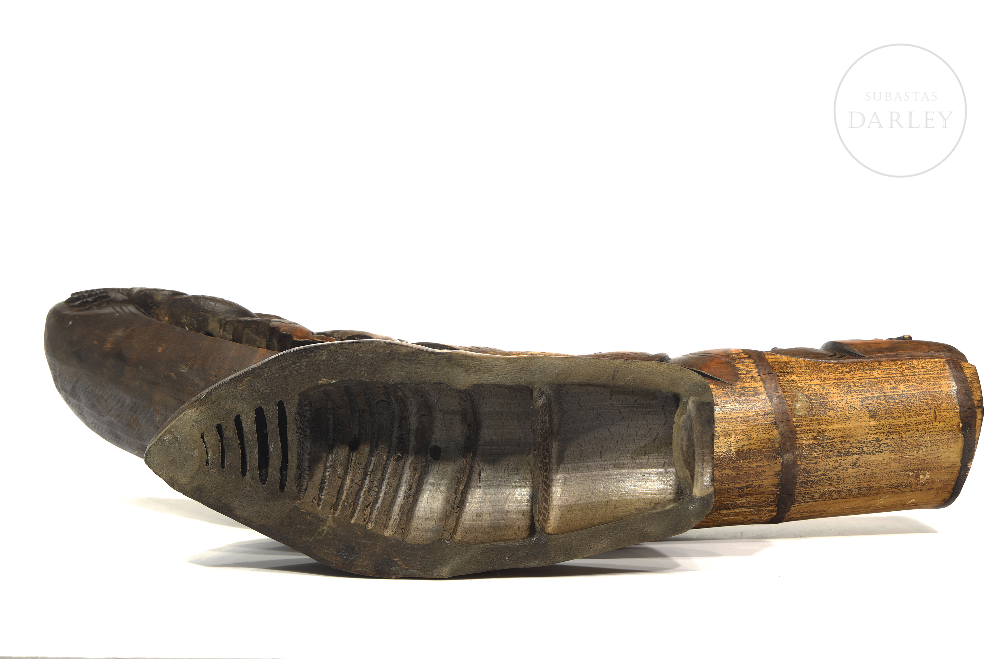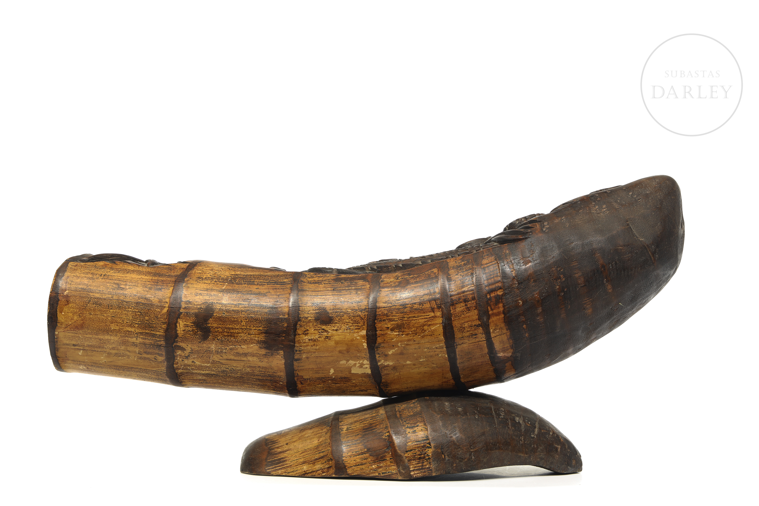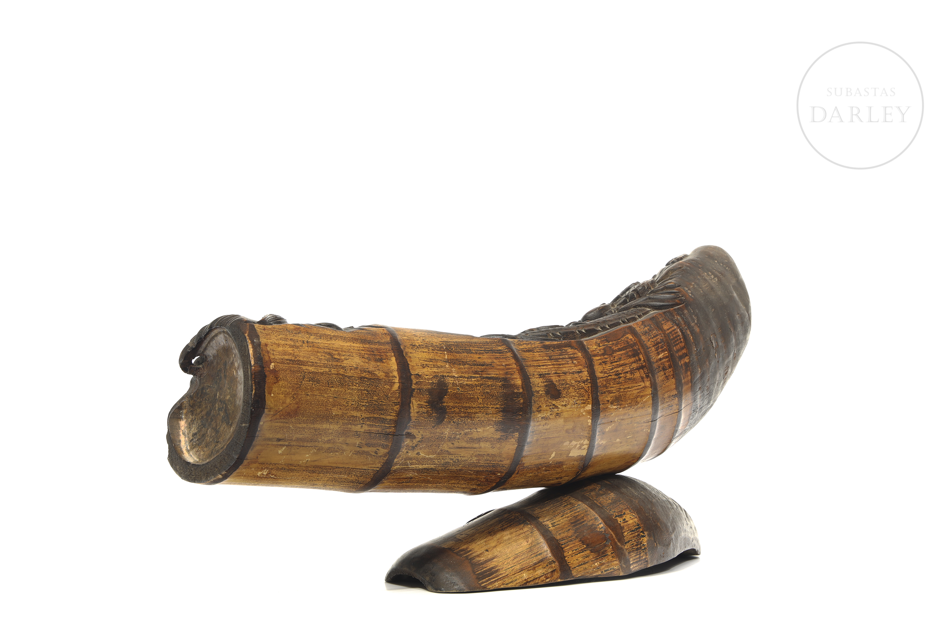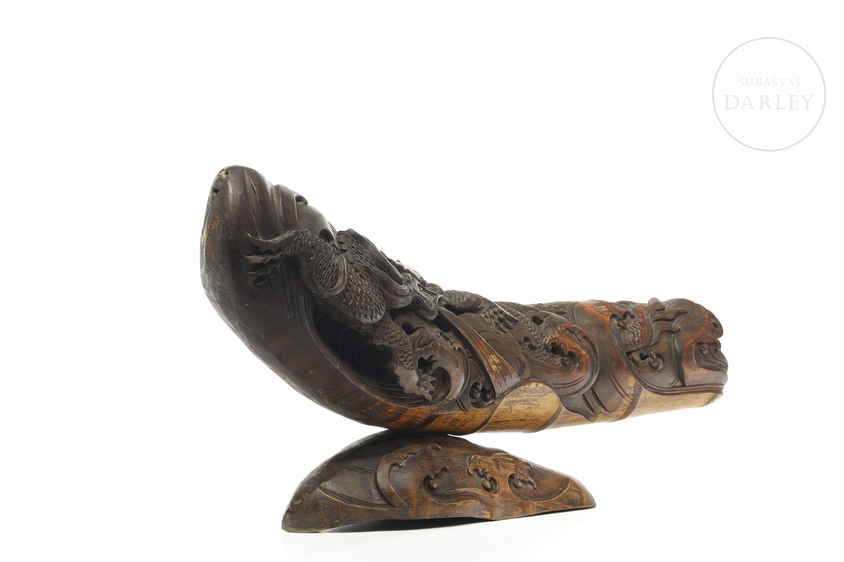 Carved bamboo branch, showing in certain areas the natural bamboo. It shows in bas-relief with openwork details the figure of a large dragon with a coiled body, covered by large waves. With an enraged expression and open jaws, it expels fire from its mouth.