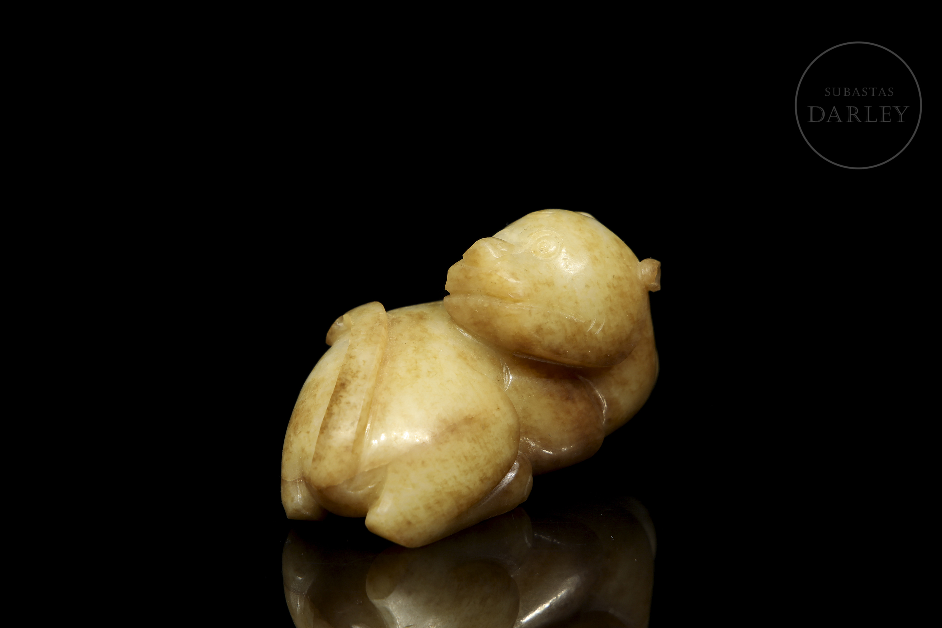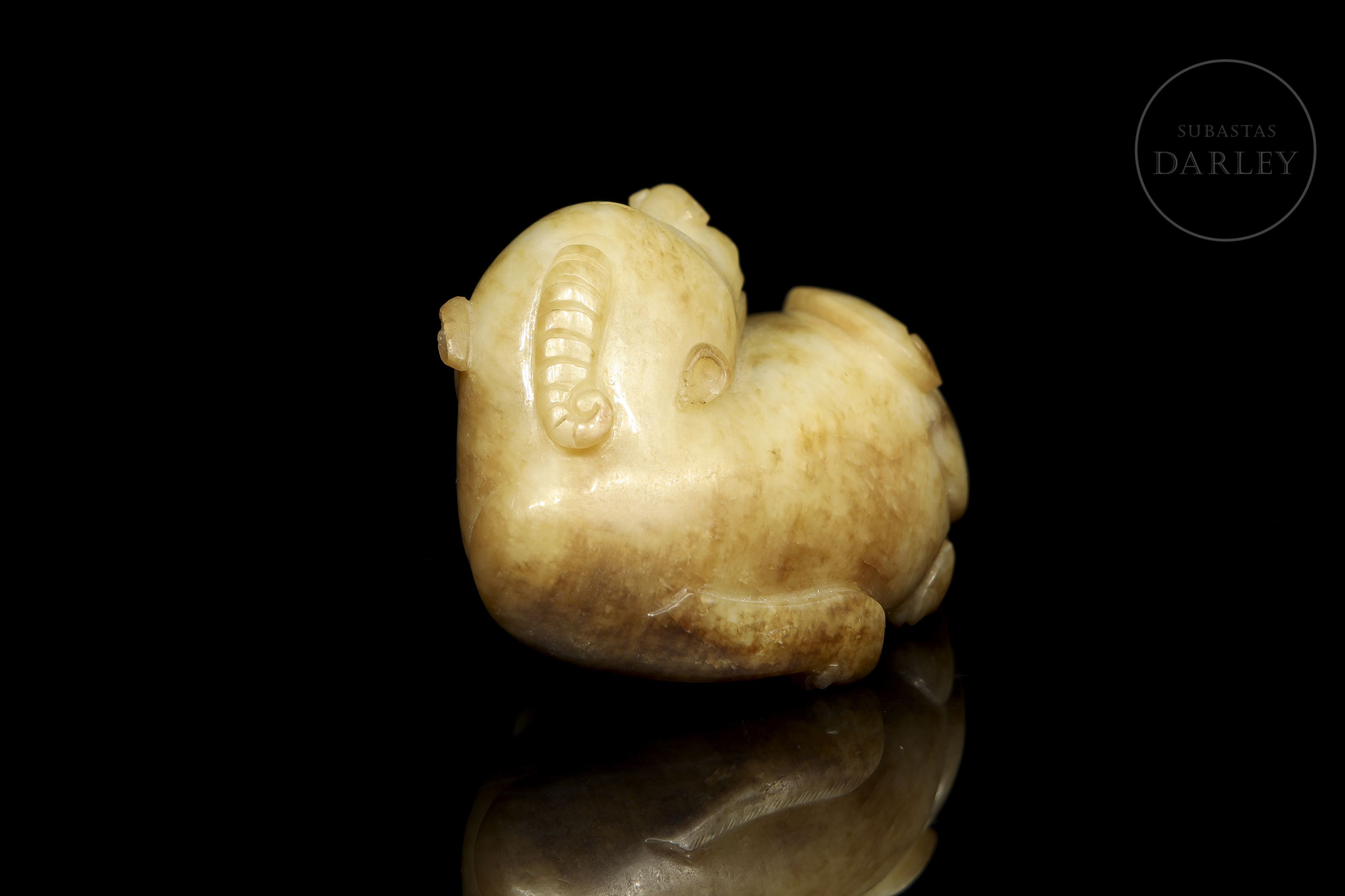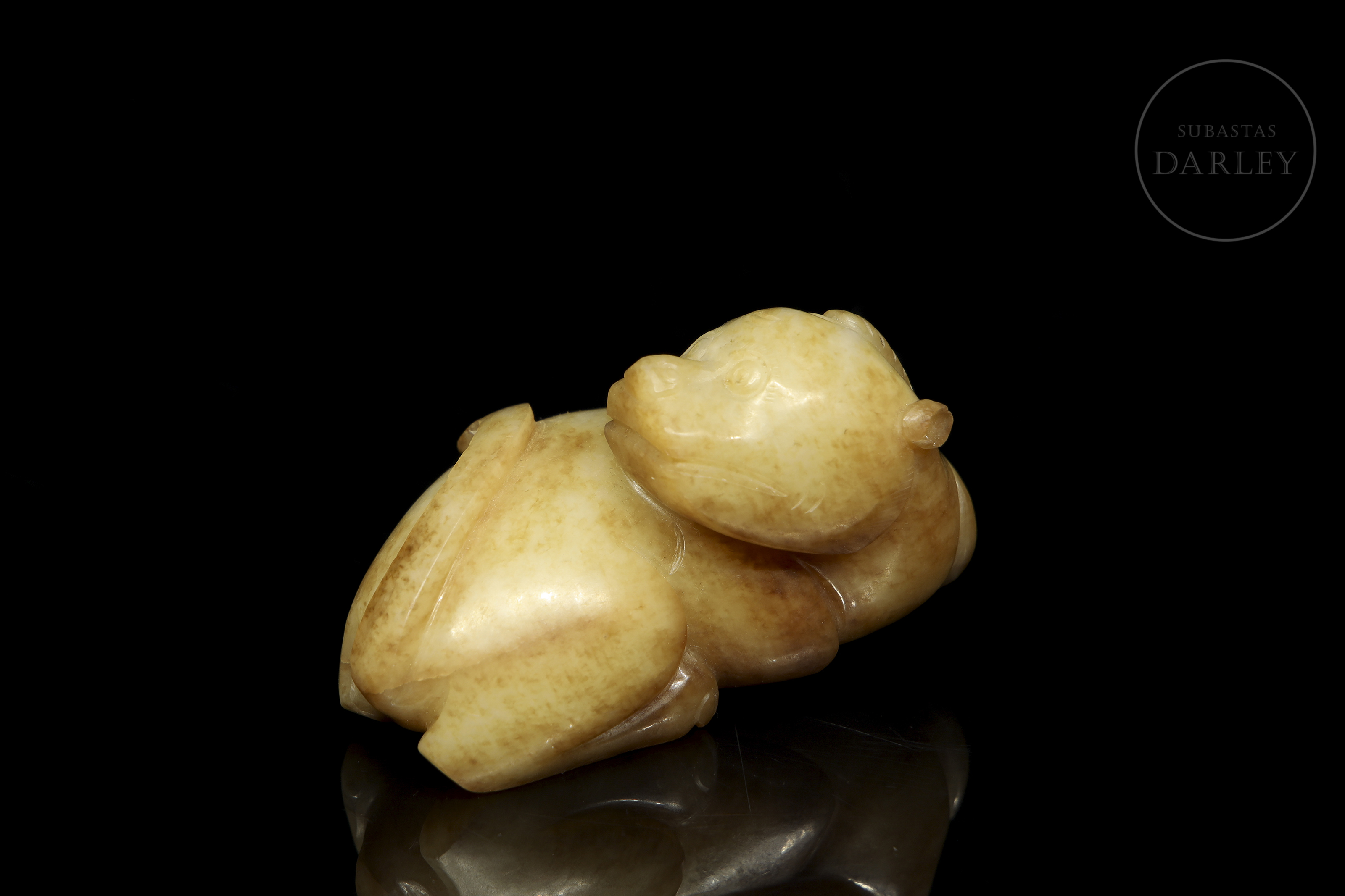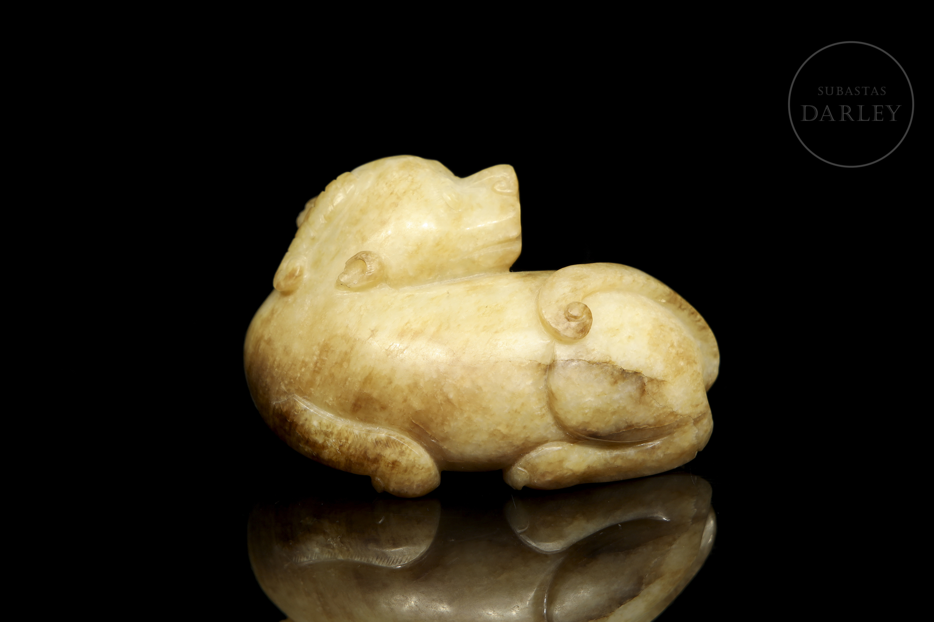Carved jade of ochre tone with brownish-golden spots. It shows a mythological animal with the body gathered on its four legs, the head turned towards the back and the tail curled. The expression is tense, with open eyes, wide snout and closed mouth.