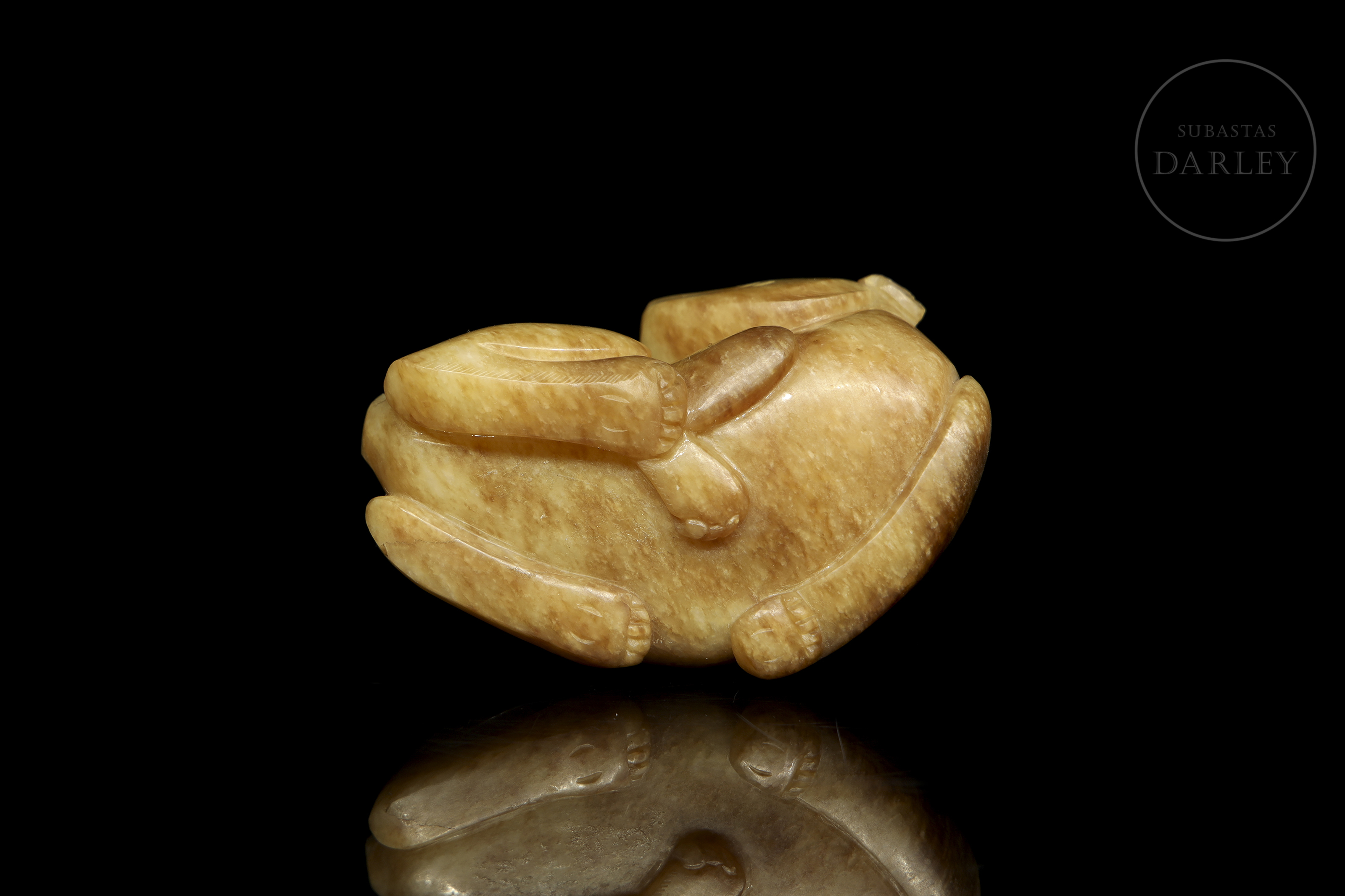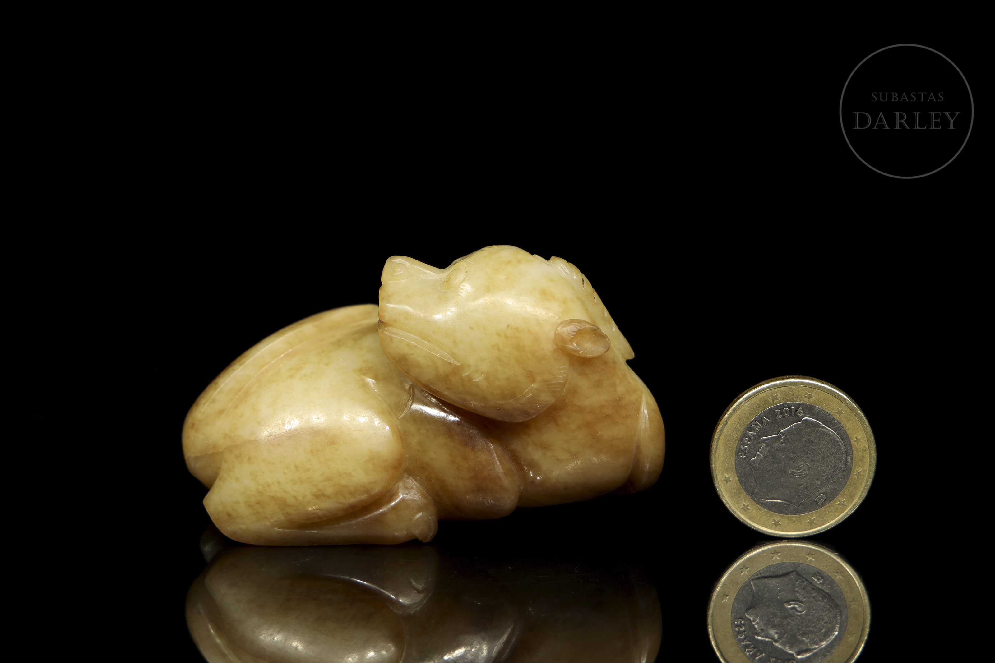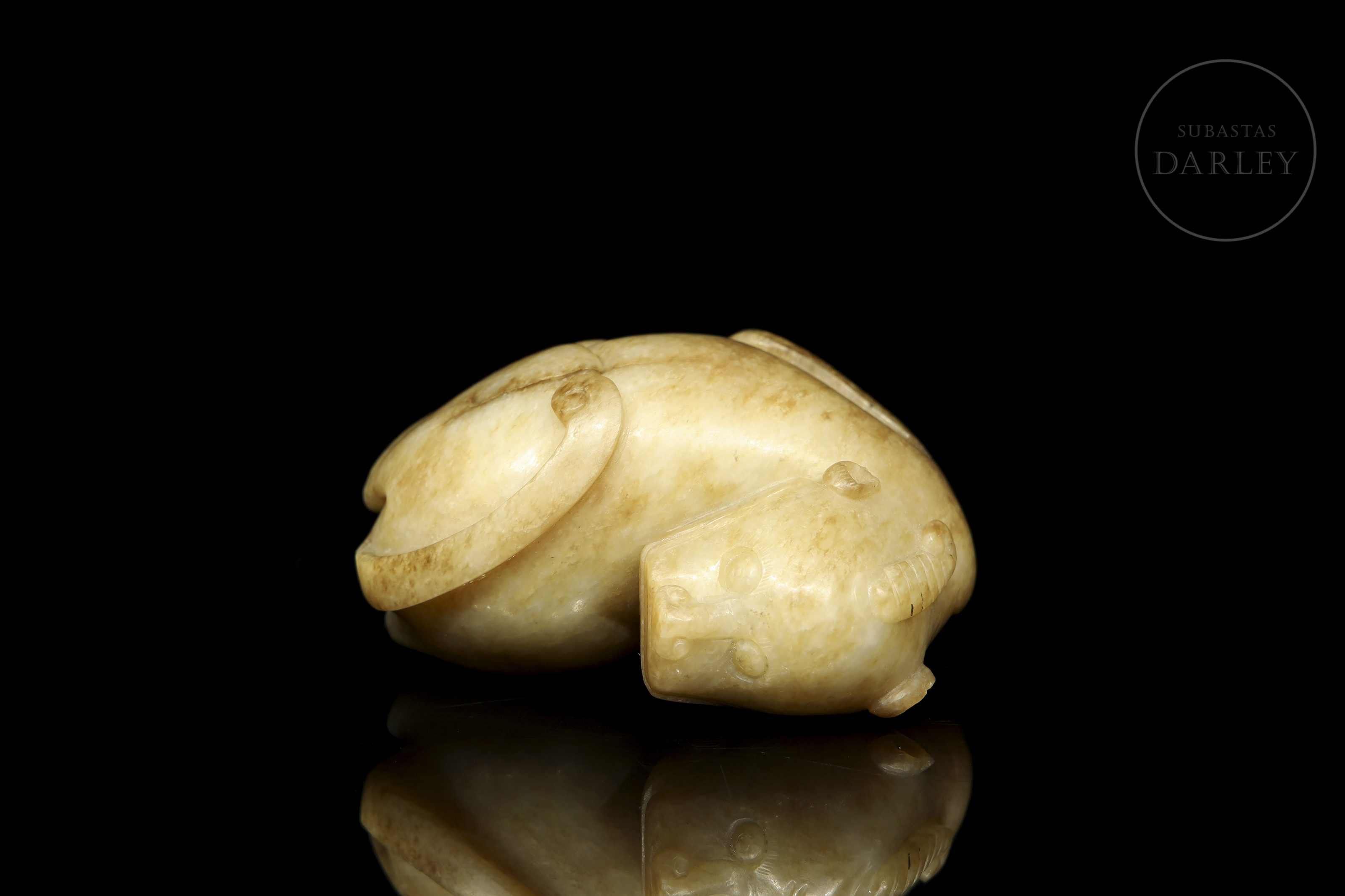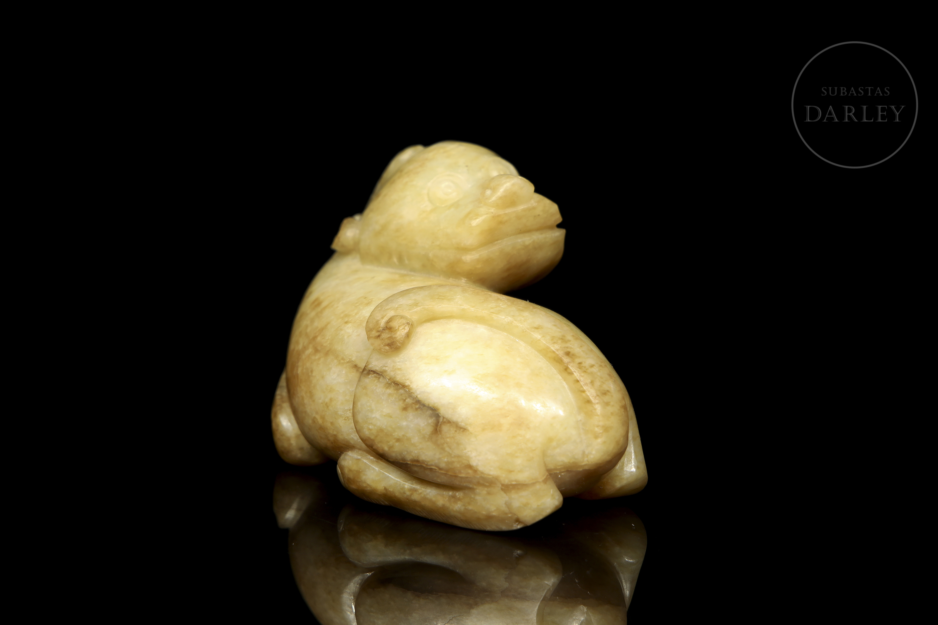 Carved jade of ochre tone with brownish-golden spots. It shows a mythological animal with the body gathered on its four legs, the head turned towards the back and the tail curled. The expression is tense, with open eyes, wide snout and closed mouth.