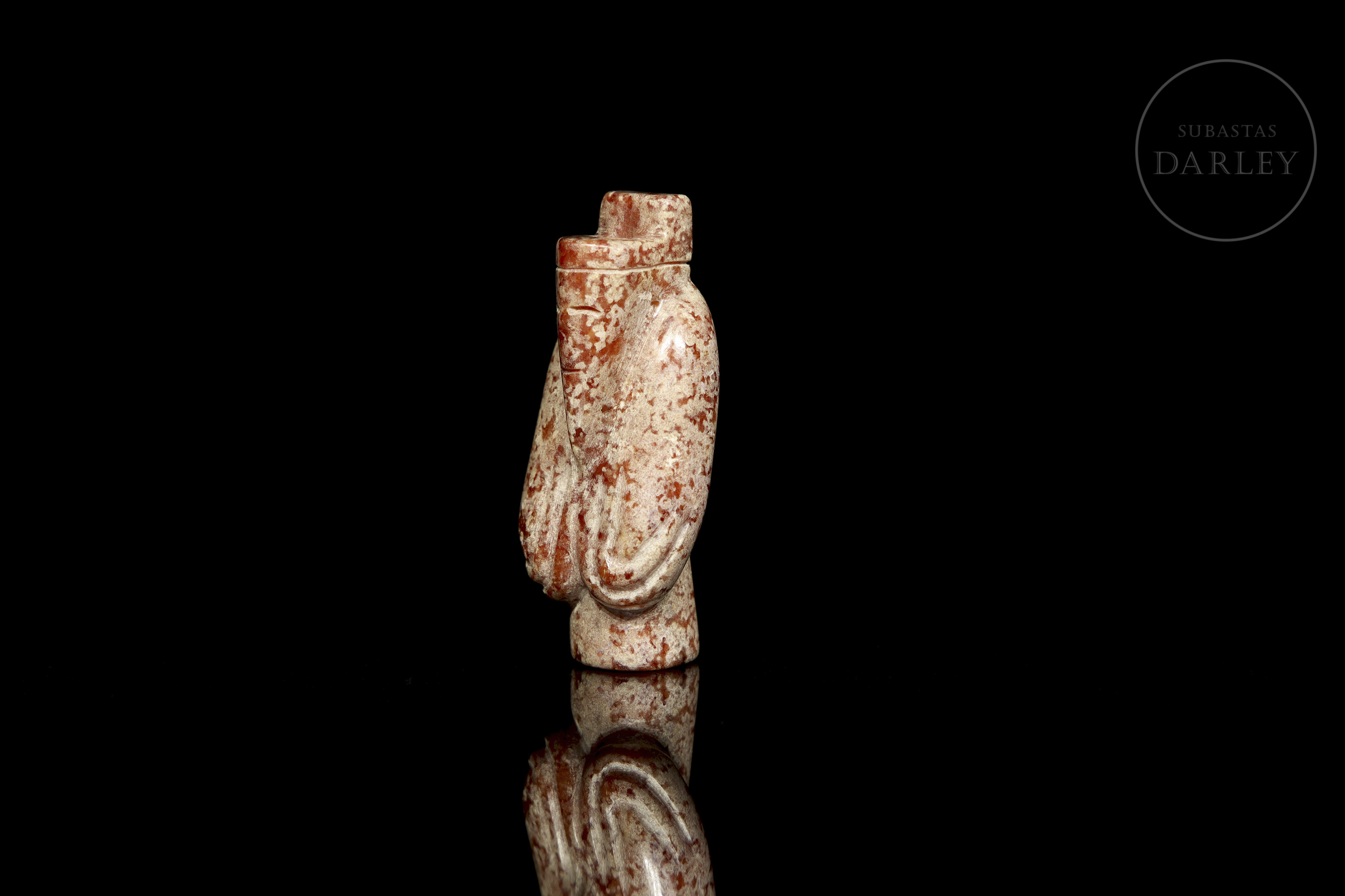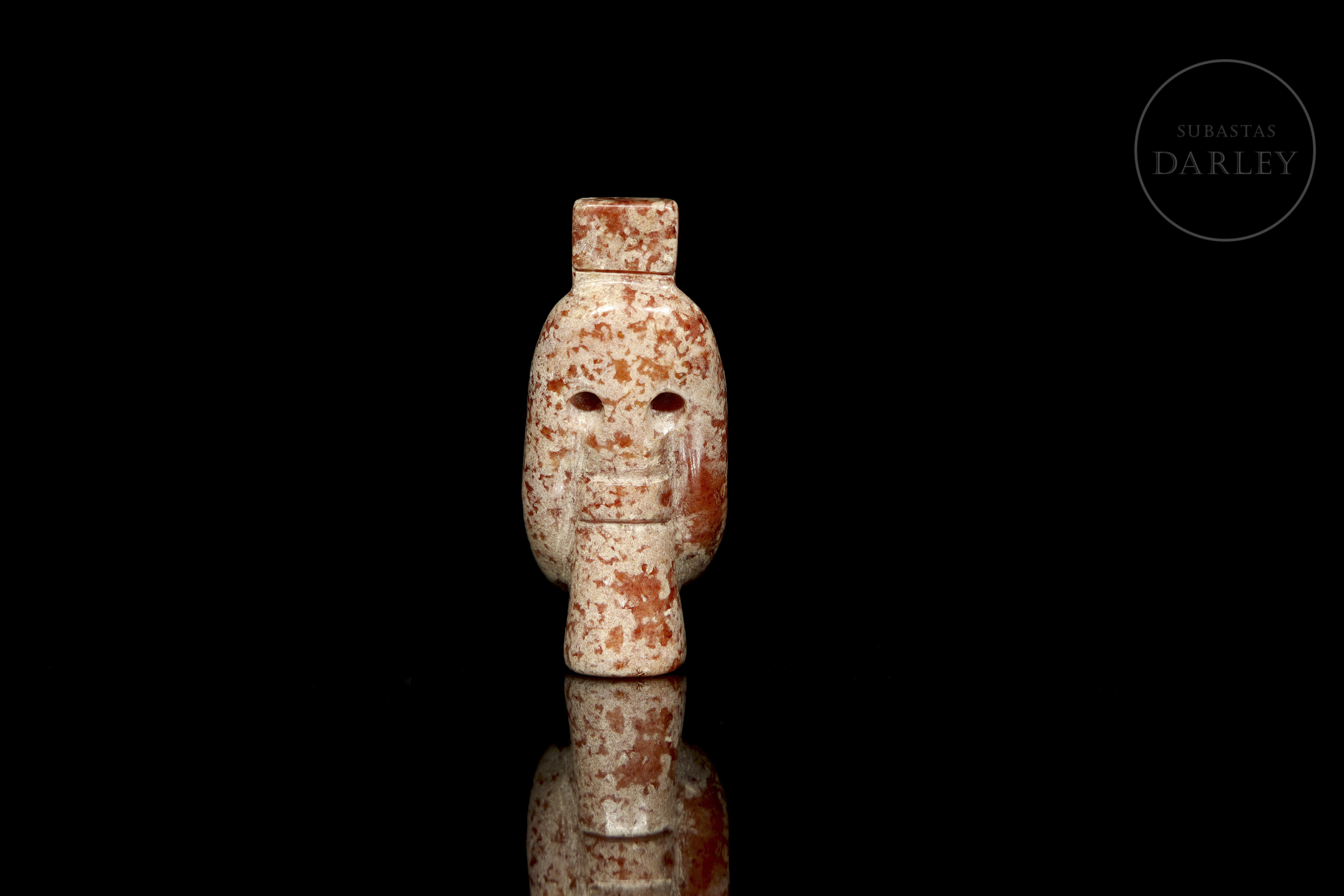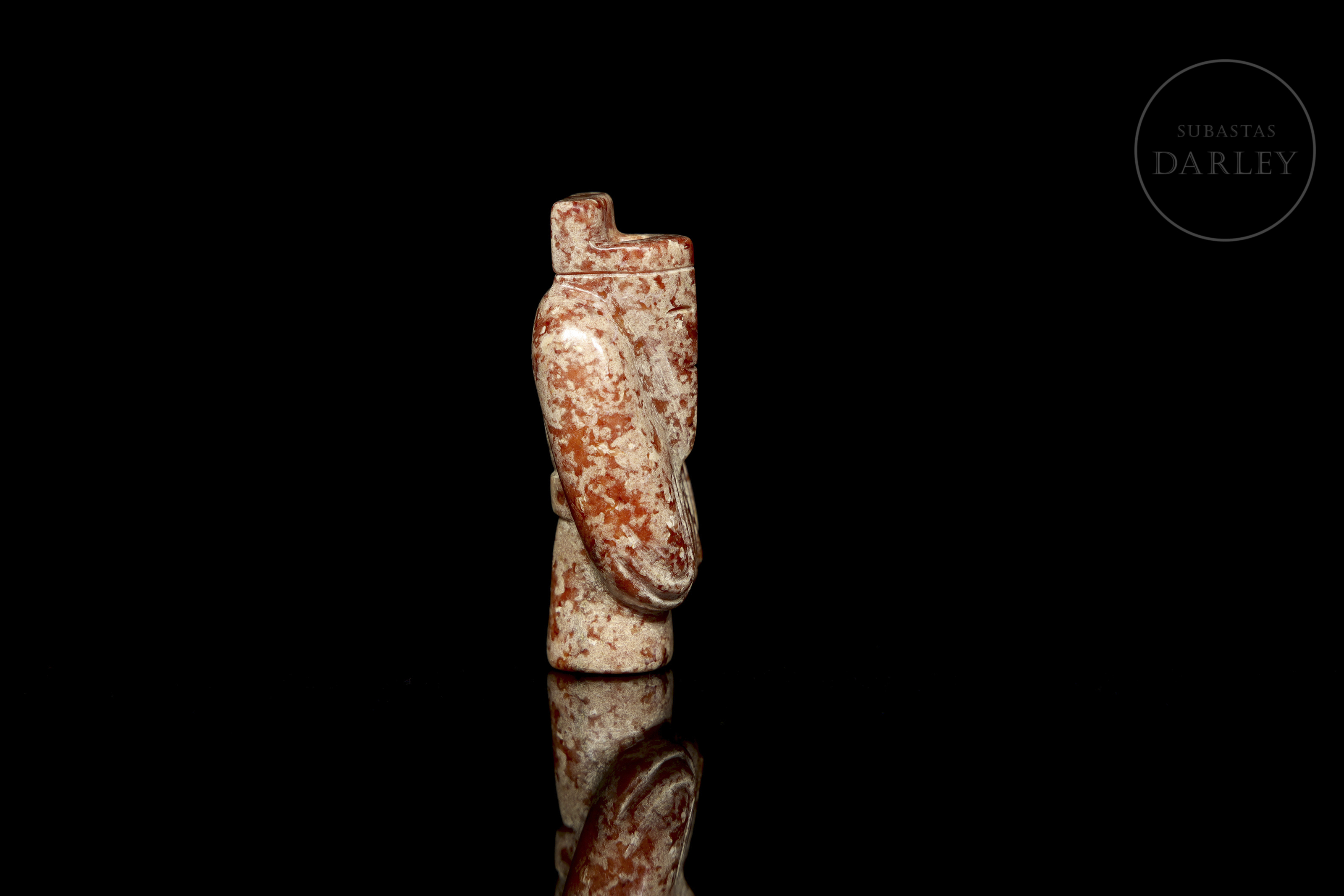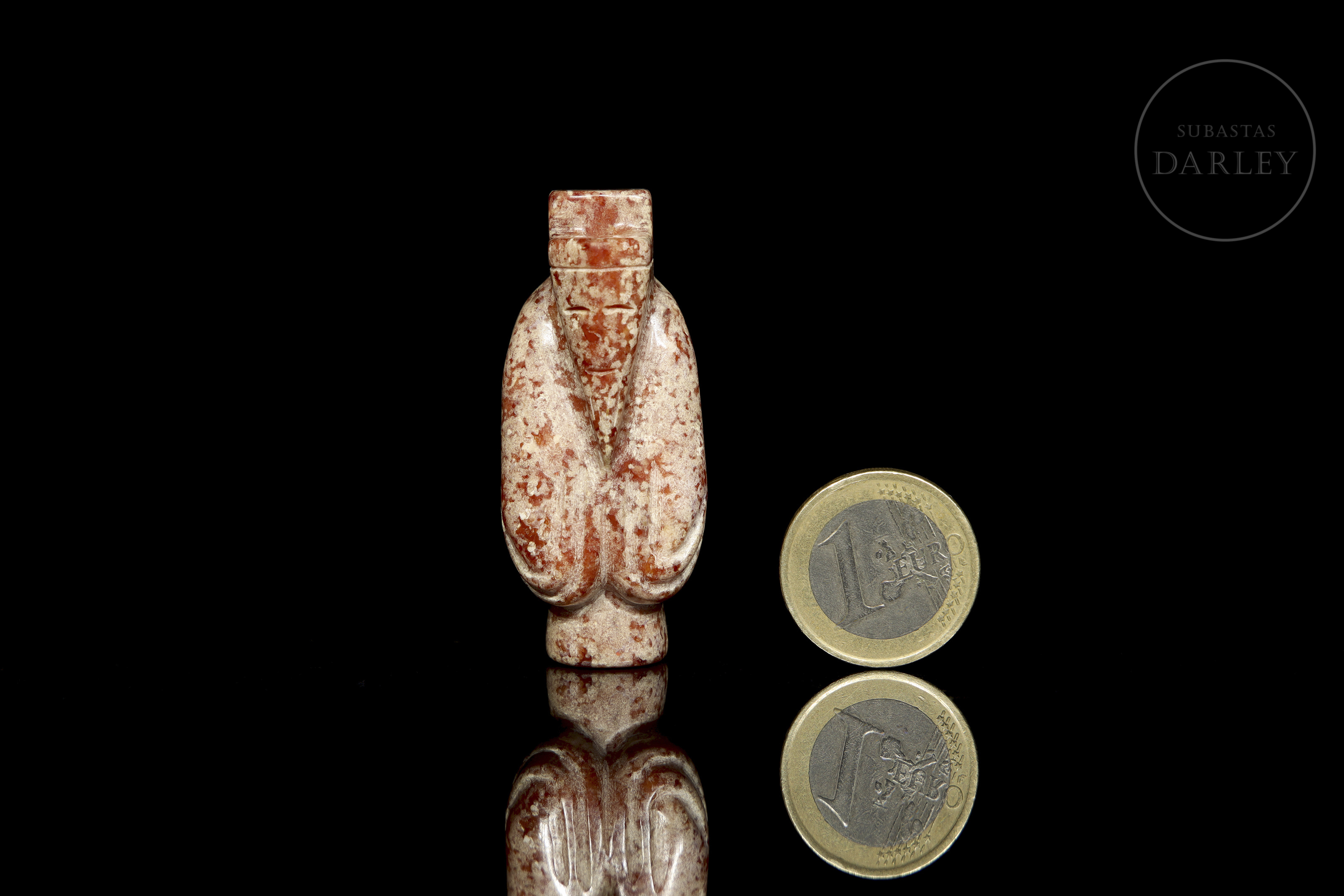 Pendant or talisman, carved from jade, with a whitish background dotted with intense veins and spots of rusty red/brown colour. It has a schematic, vertical shape, representing an ‘Elder’ standing with his hands together. The carving is simplified, with a triangular head and a tall headdress. With a longitudinal perforation. Han Dynasty (206 BC - 220 AD). or later. or later.