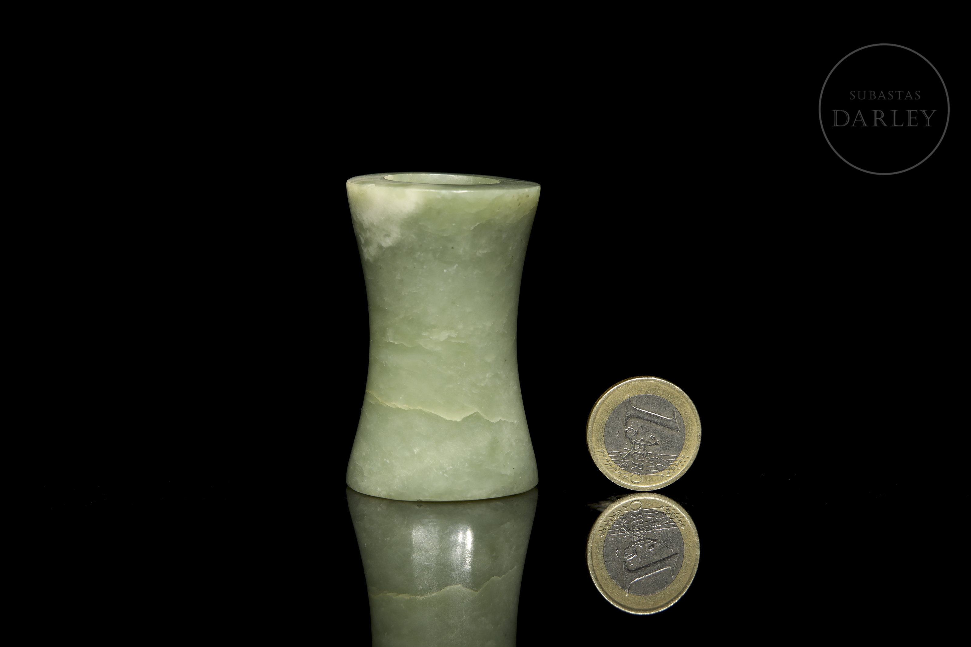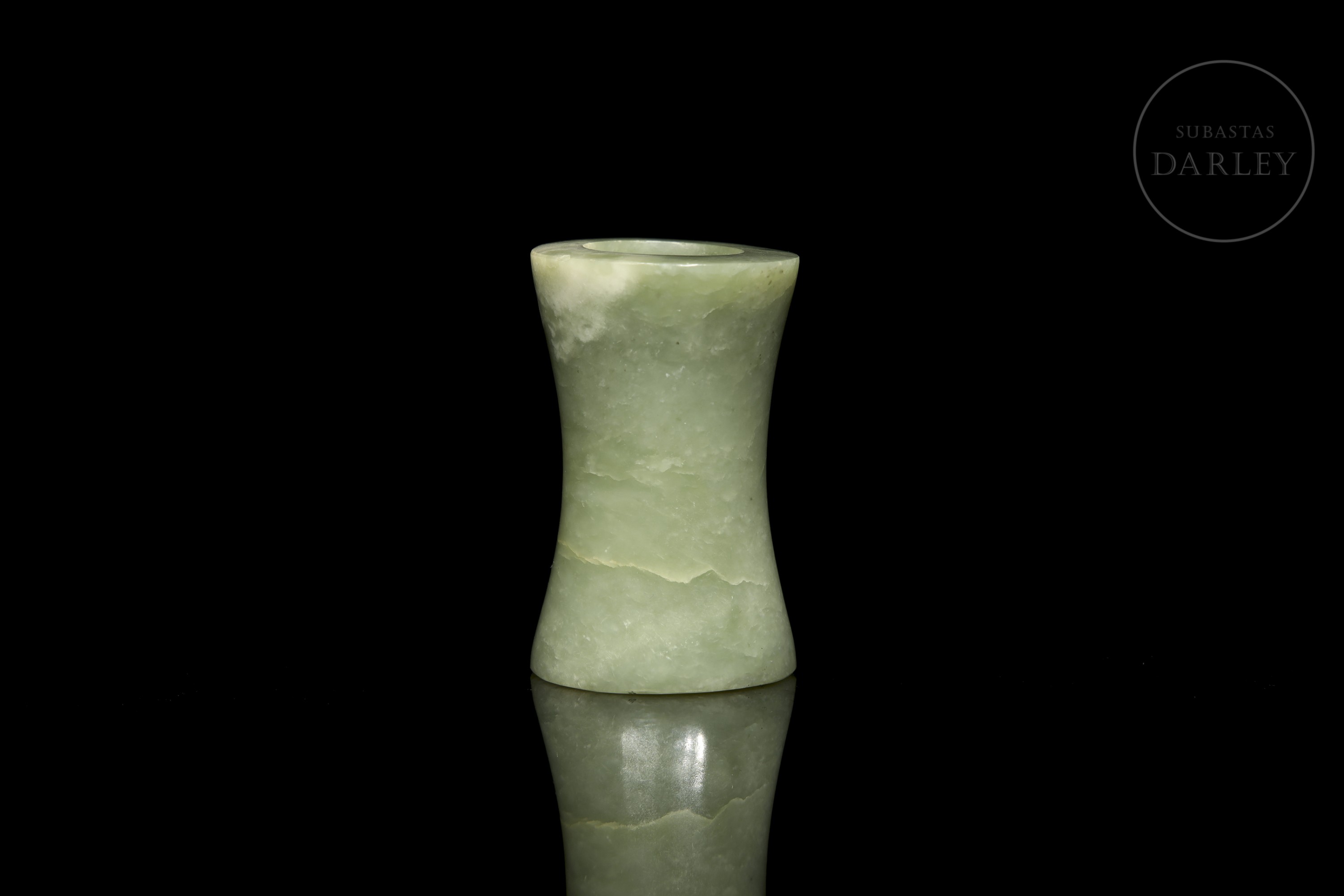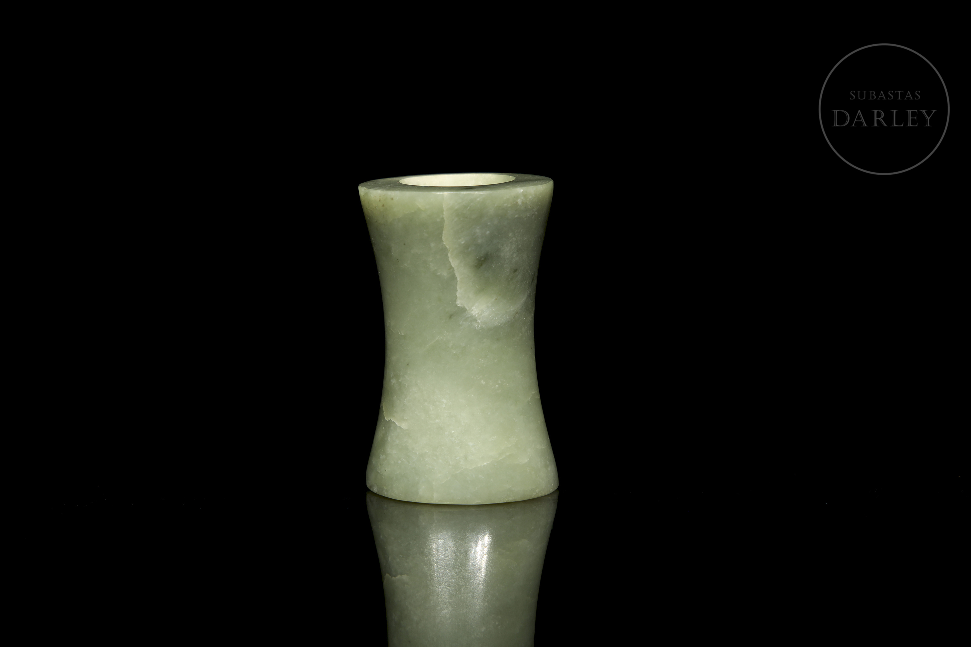 Carved jade in a pale green hue with white and brown veins. The piece has a stylised cylindrical shape that narrows in the centre, and a longitudinal perforation. It stands out for the elegance of its hourglass silhouette and the quality of the material. Qijia culture (approx. 2200–1600 BC) or later.