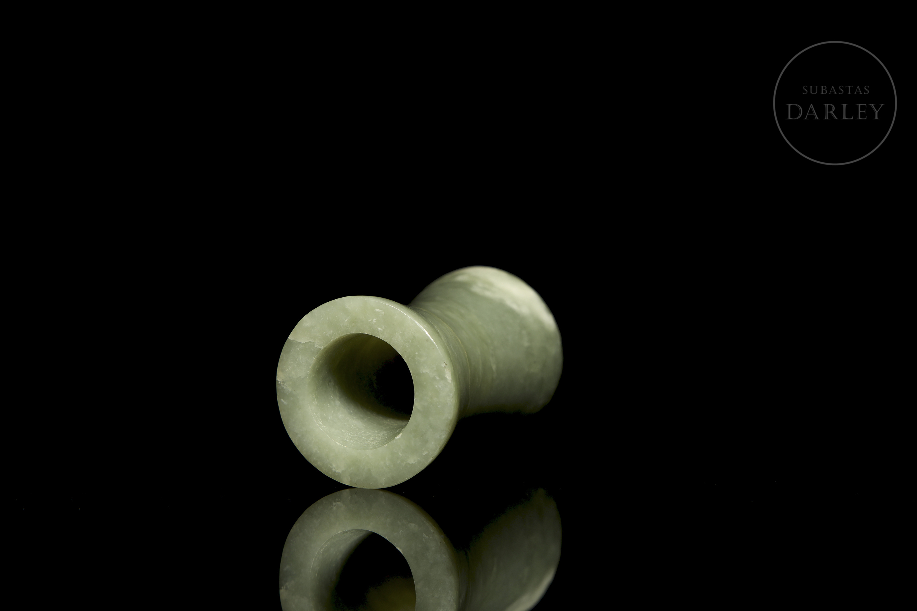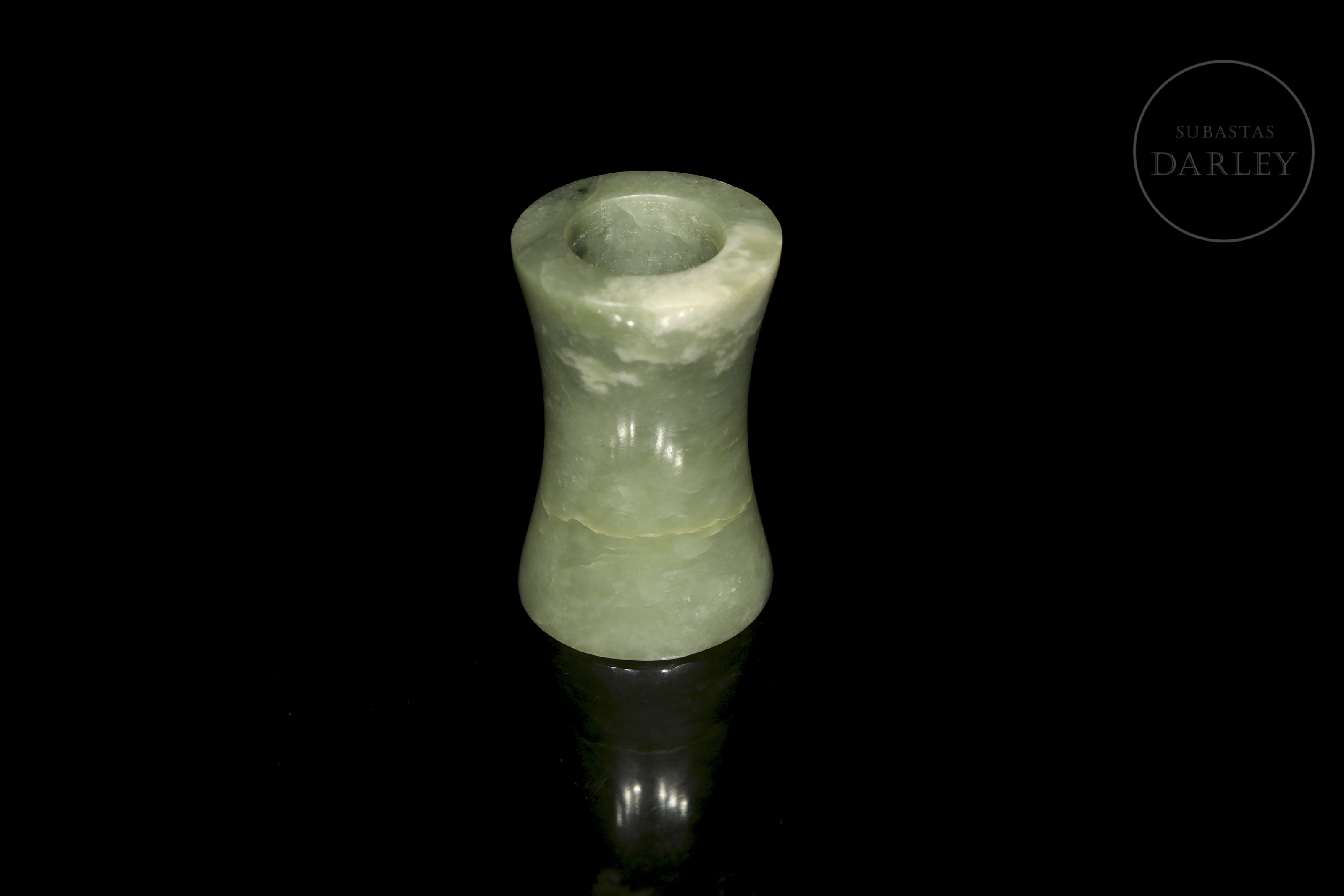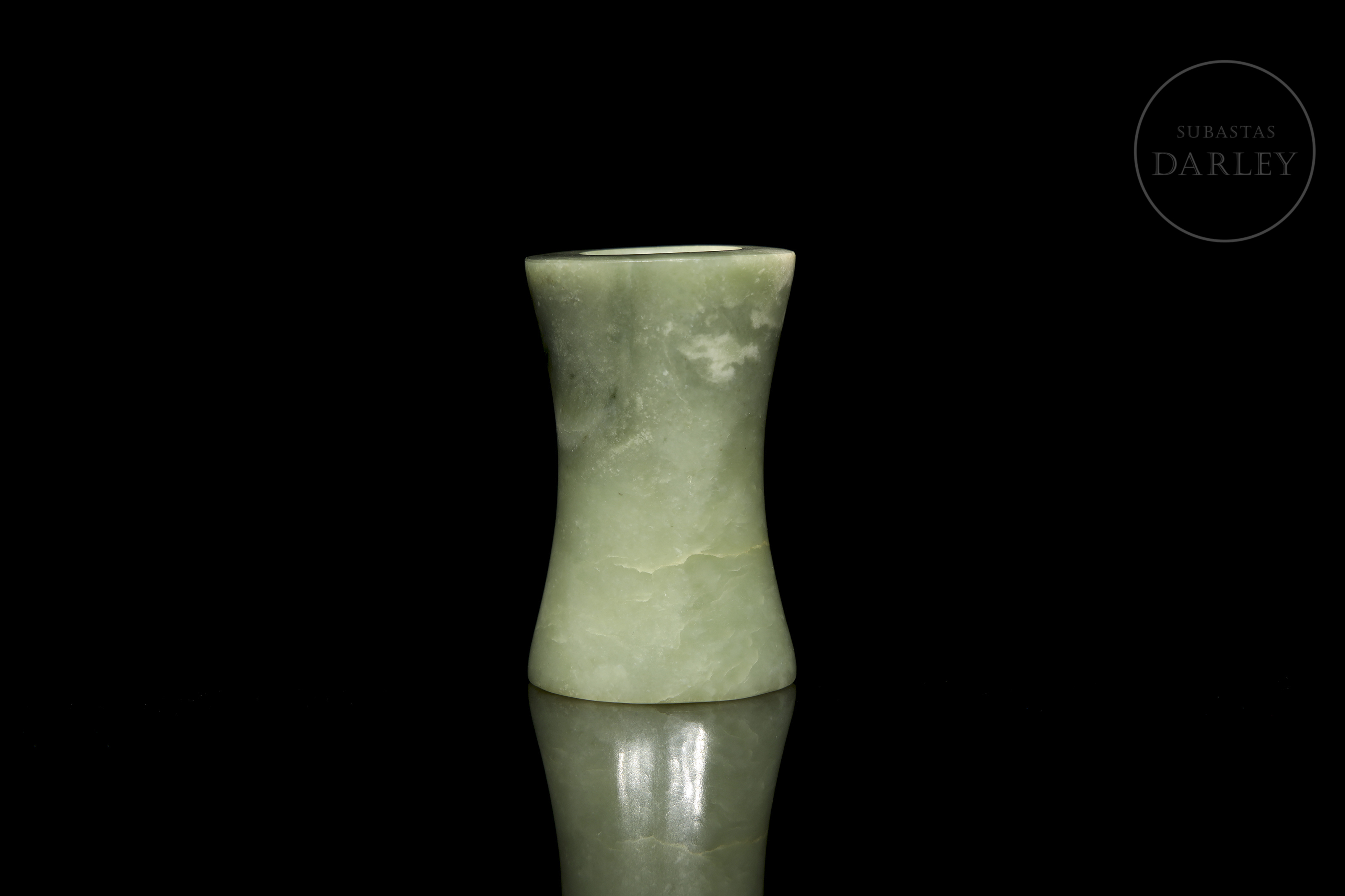 Carved jade in a pale green hue with white and brown veins. The piece has a stylised cylindrical shape that narrows in the centre, and a longitudinal perforation. It stands out for the elegance of its hourglass silhouette and the quality of the material. Qijia culture (approx. 2200–1600 BC) or later.