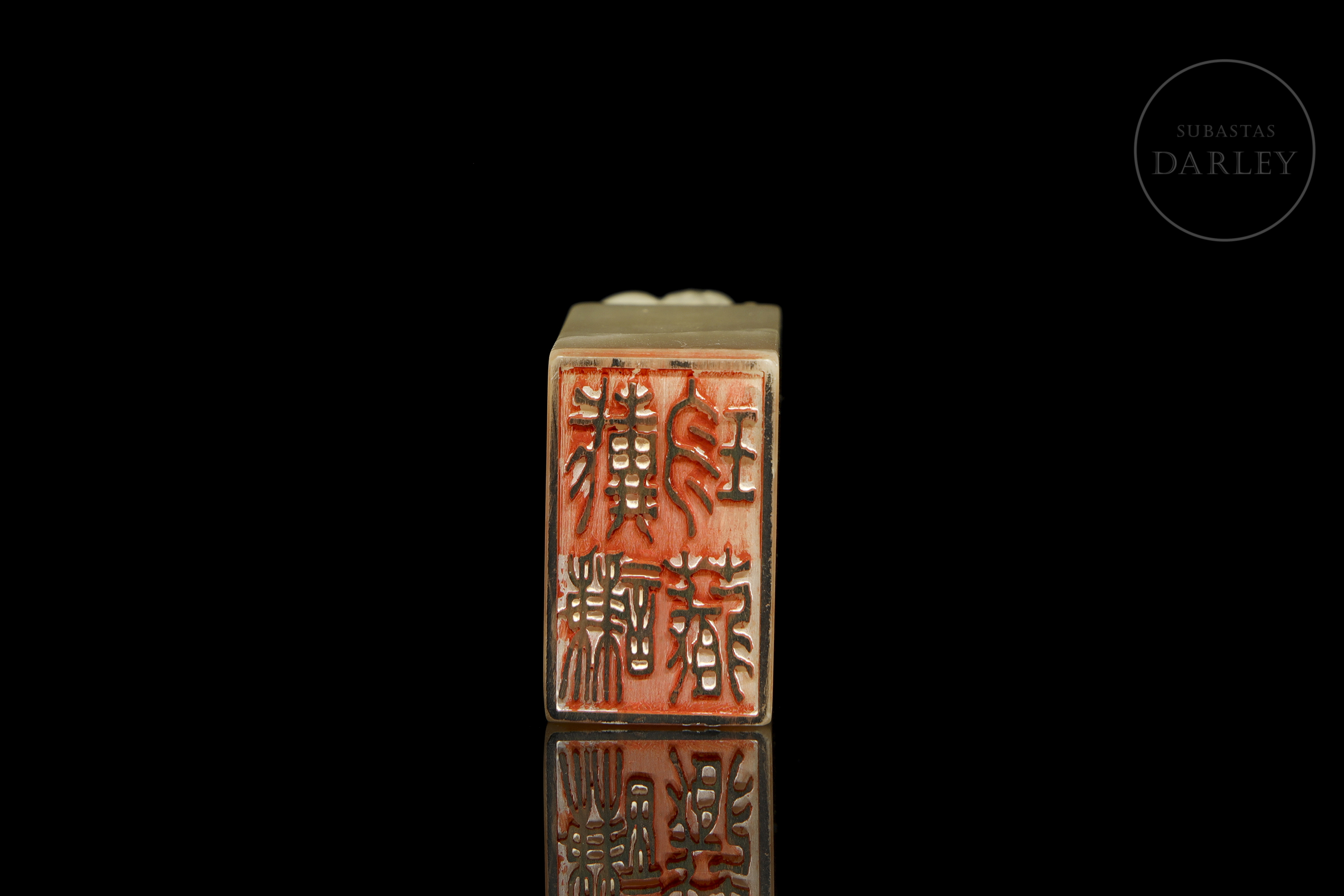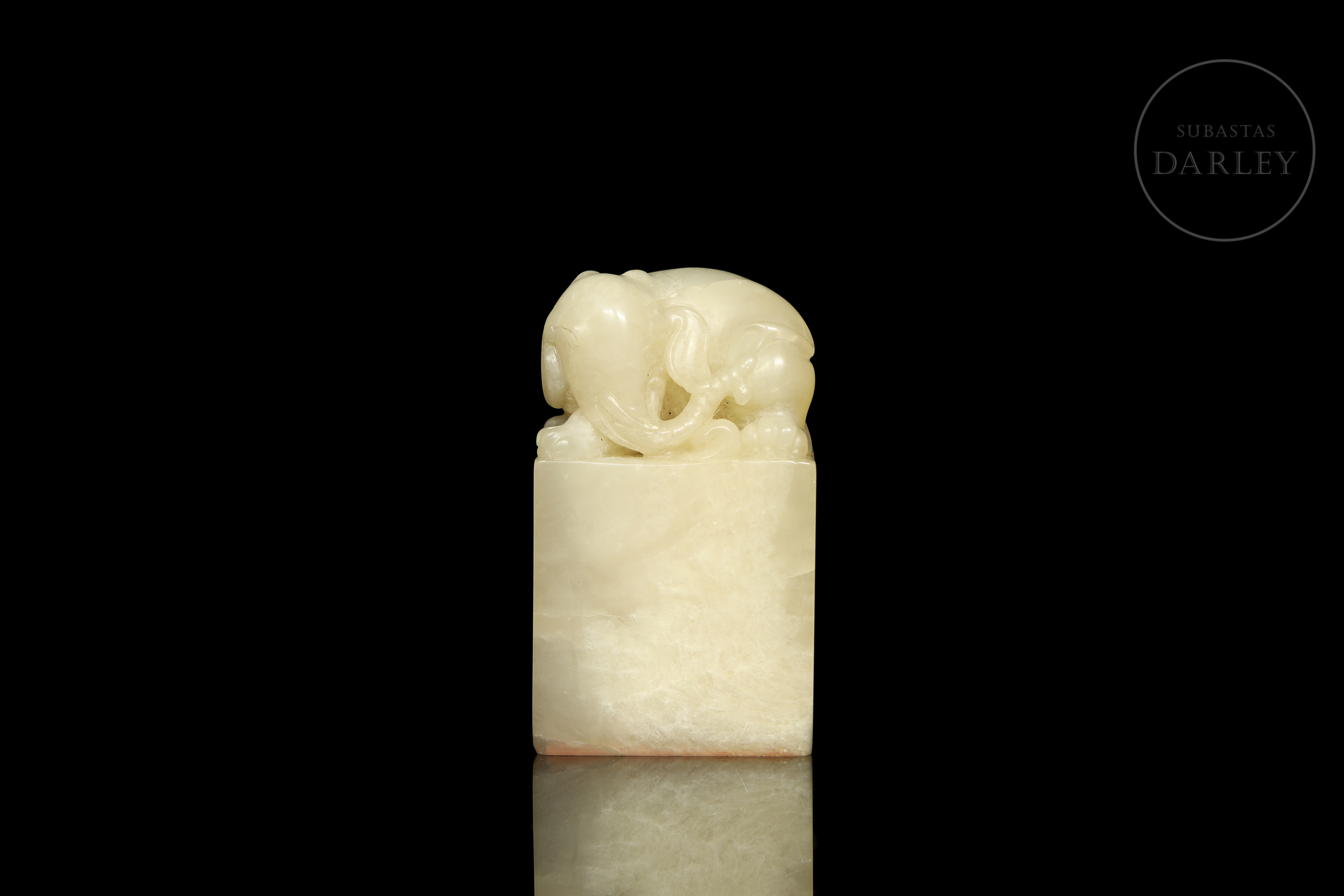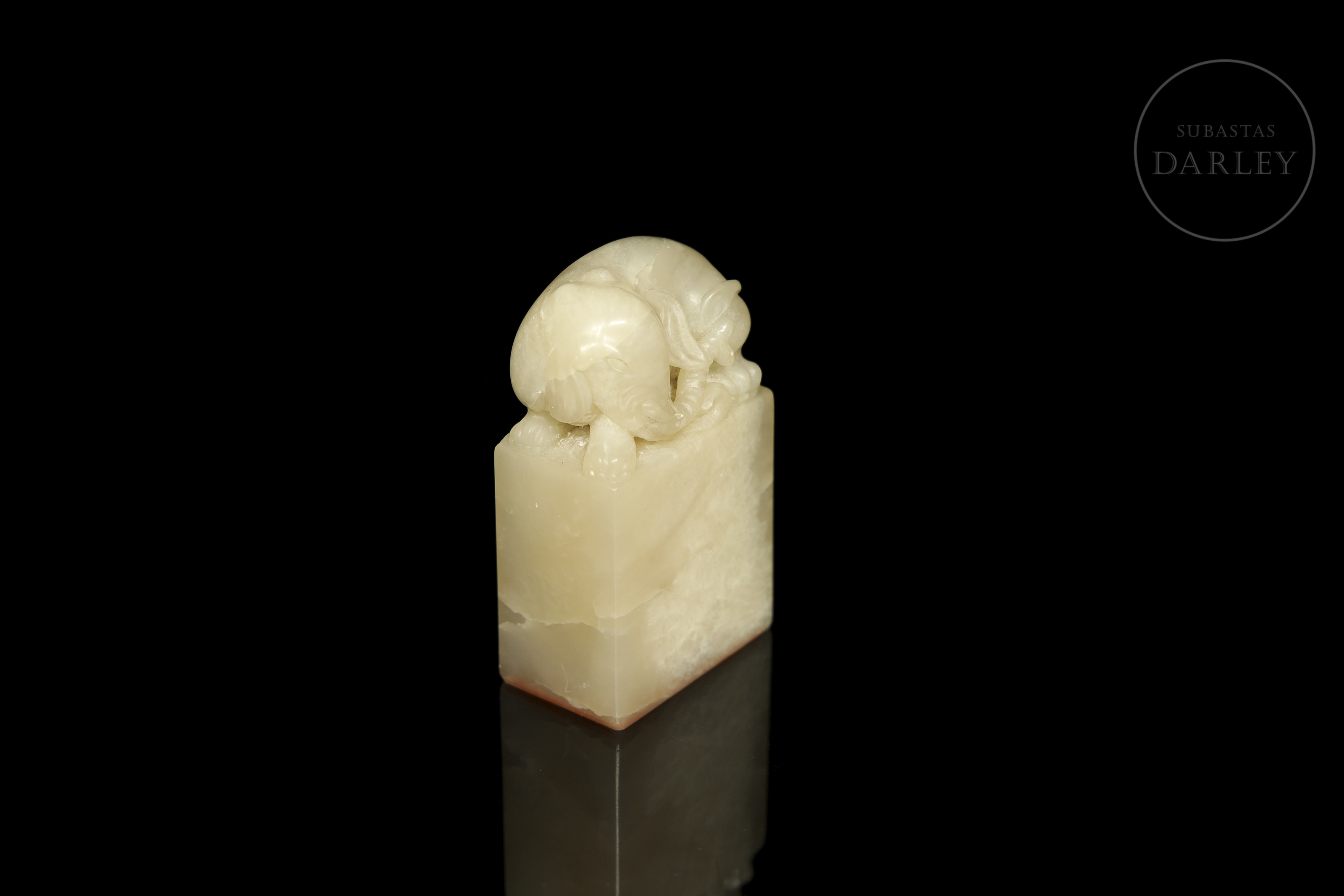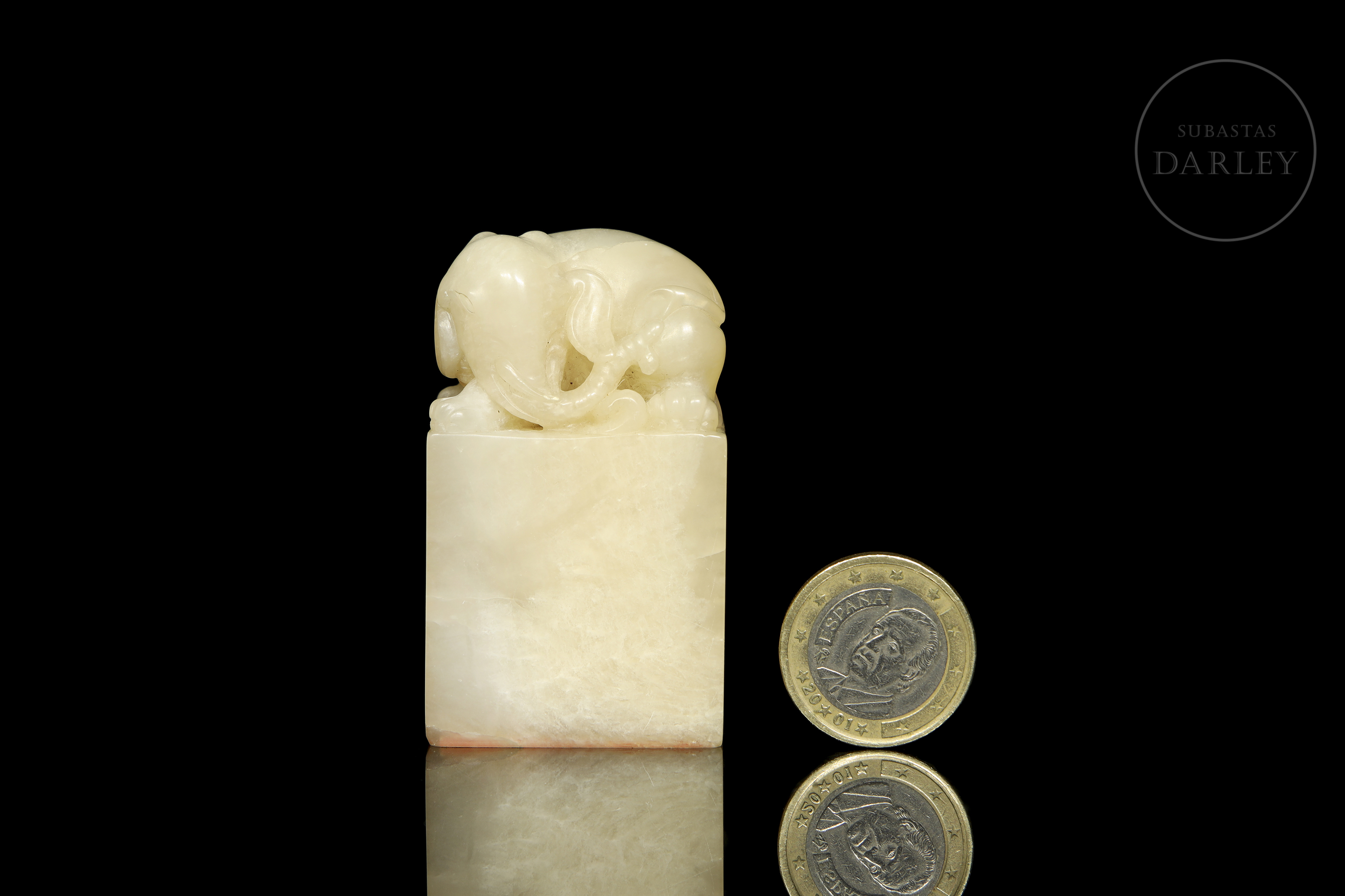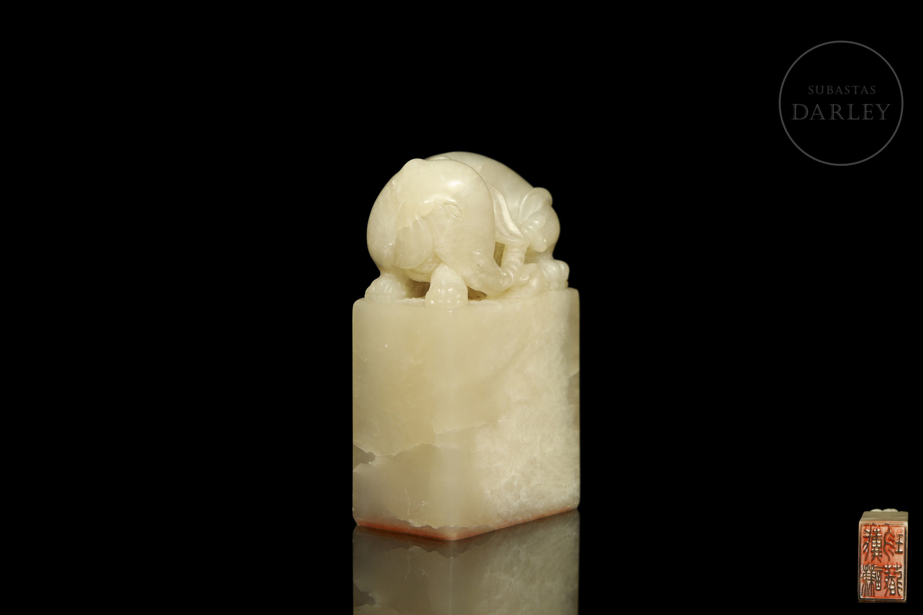 White jade with subtle areas of ochre toning. It has a tall rectangular base, crowned by the figure of a reclining elephant, with its head turned to one side and its trunk folded back, in a resting position. Anatomical details, such as the broad ears and skin, are defined by fine incised lines. The base of the seal has incised characters in sigil style. Qing dynasty (1644–1911).
