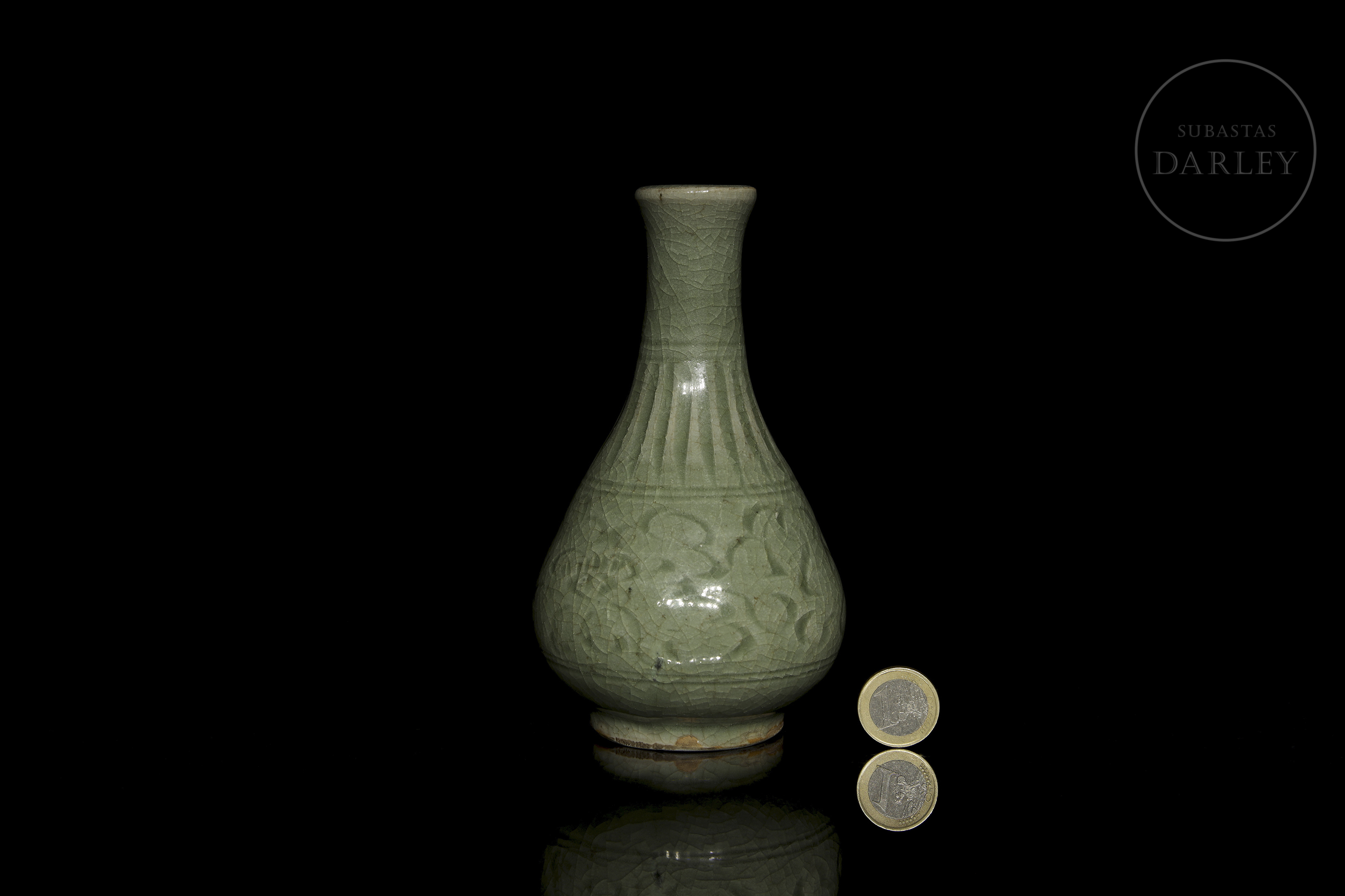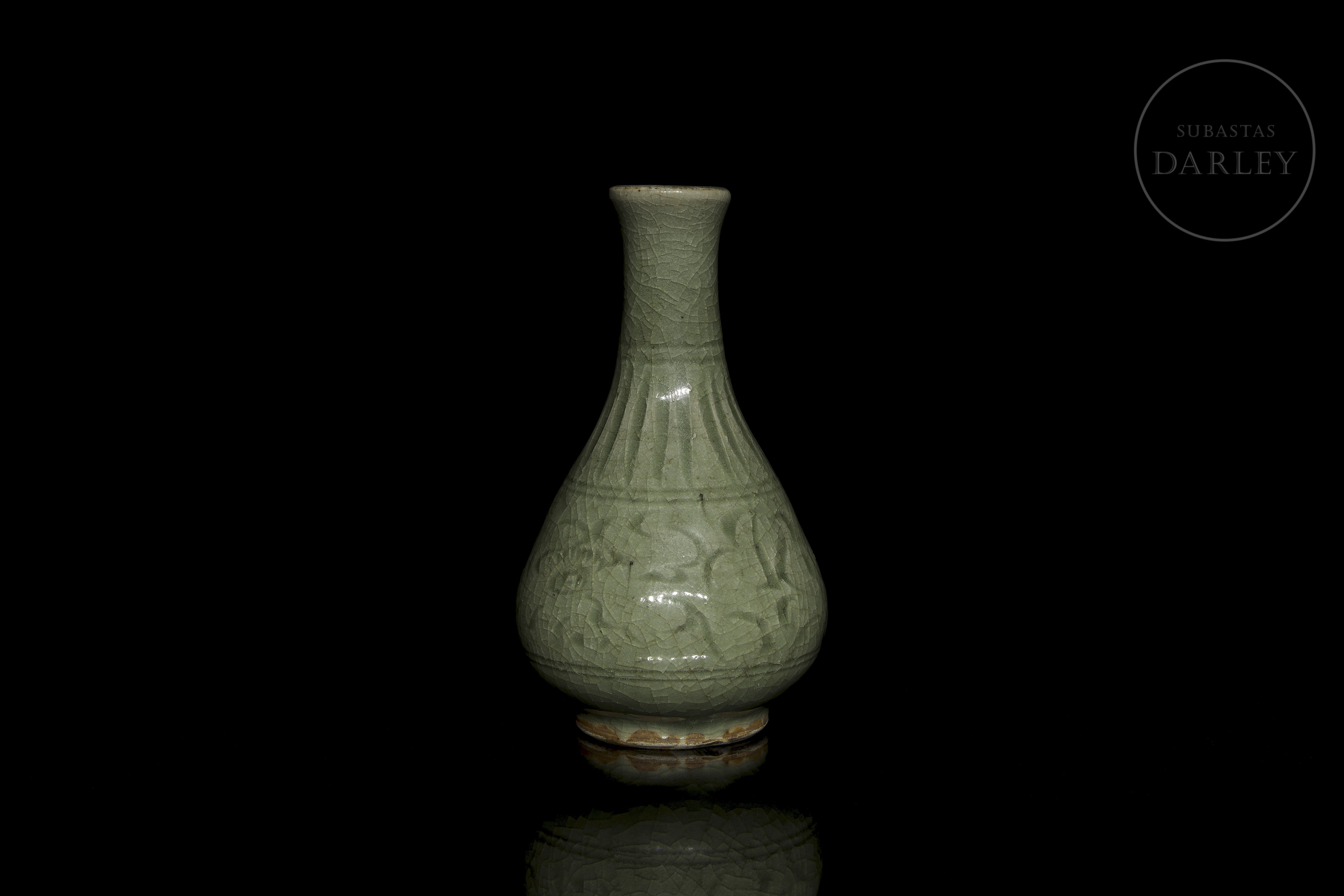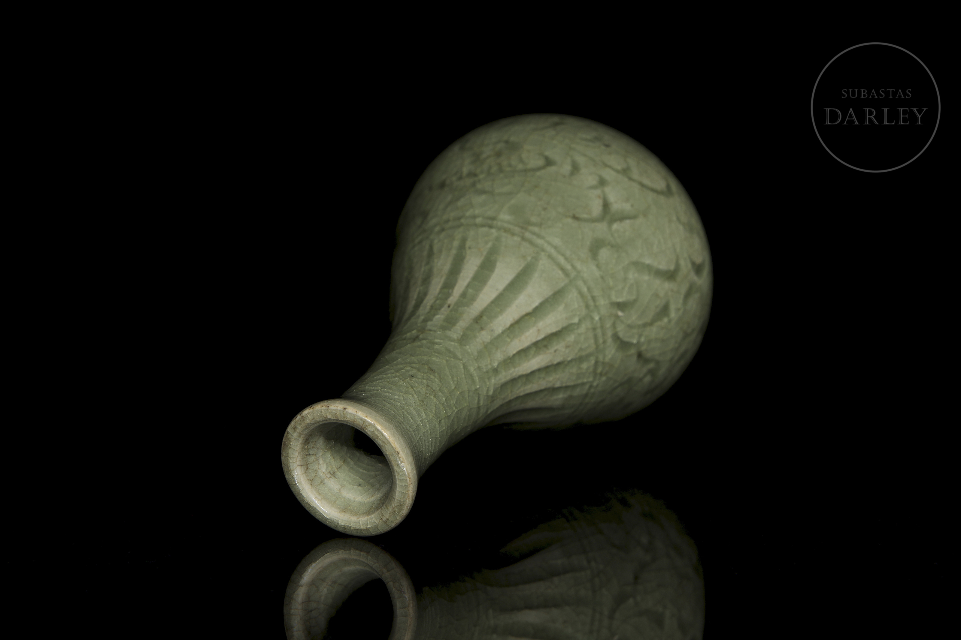 Modelled porcelain covered with a thick celadon glaze, greenish in colour with a crackled finish. It has a pear shape, crowned by an elongated neck and finished with a flared mouth. Decorated with incised floral motifs and vertical grooves under the glaze.