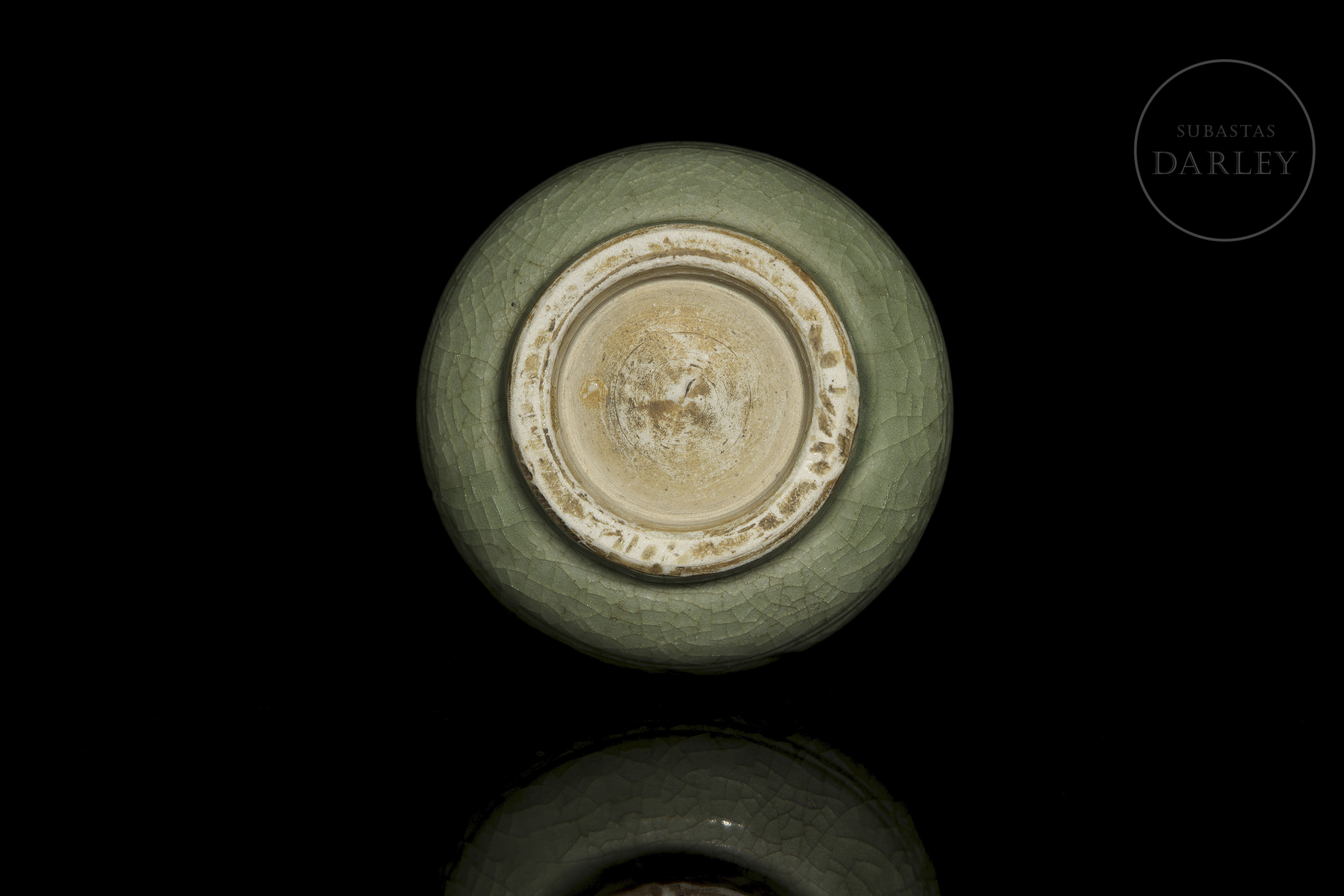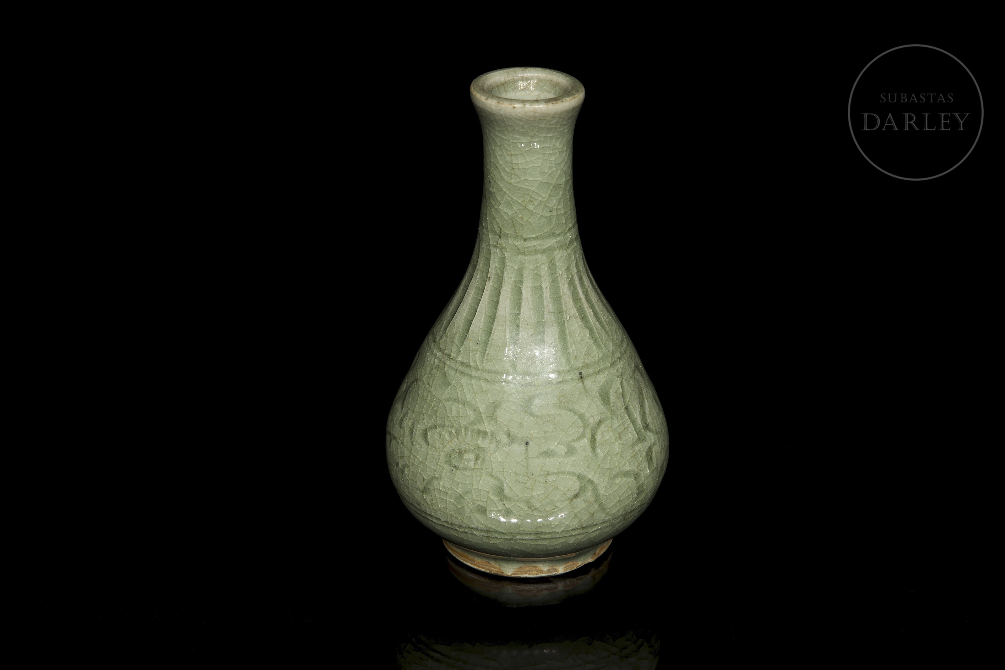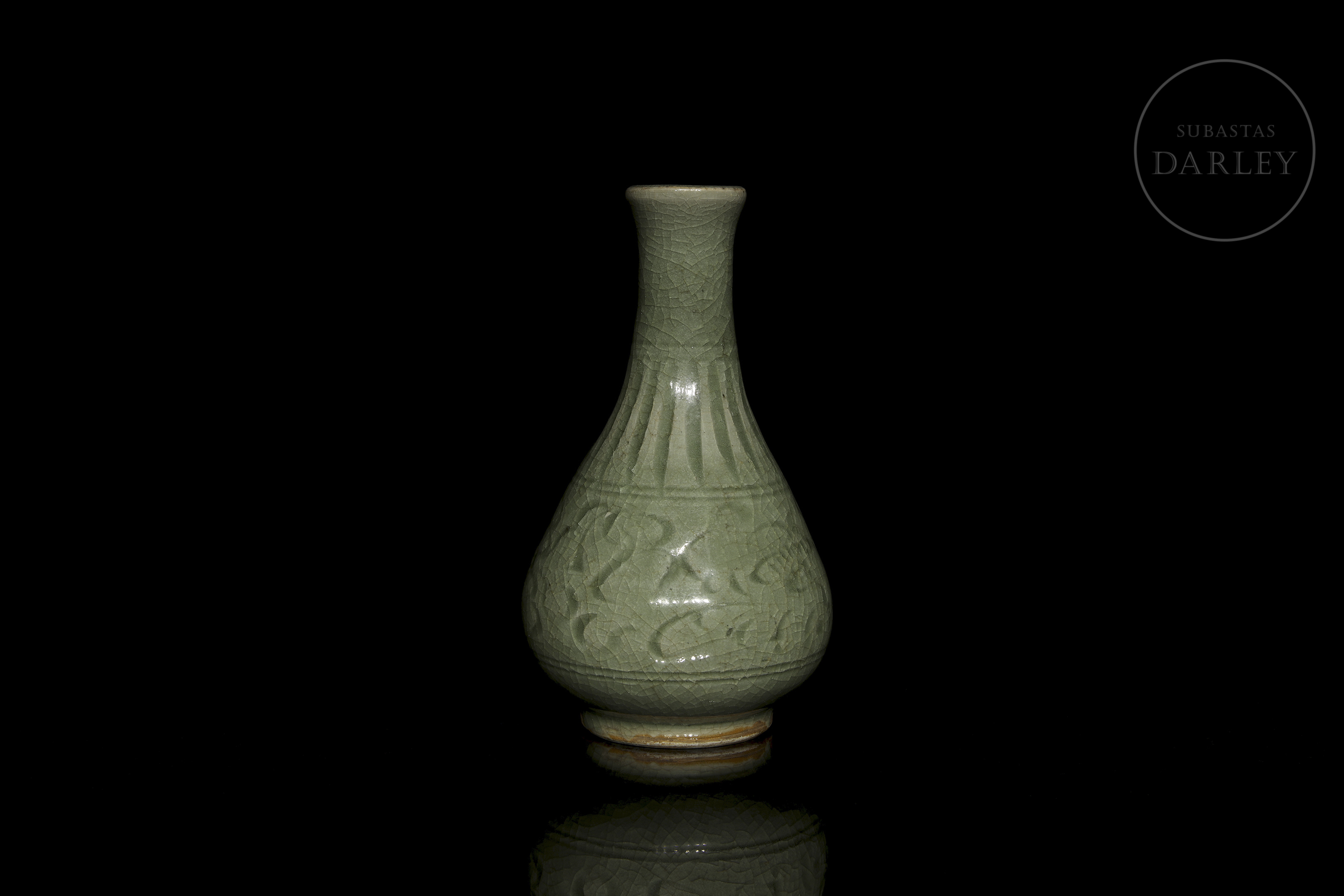 Modelled porcelain covered with a thick celadon glaze, greenish in colour with a crackled finish. It has a pear shape, crowned by an elongated neck and finished with a flared mouth. Decorated with incised floral motifs and vertical grooves under the glaze.