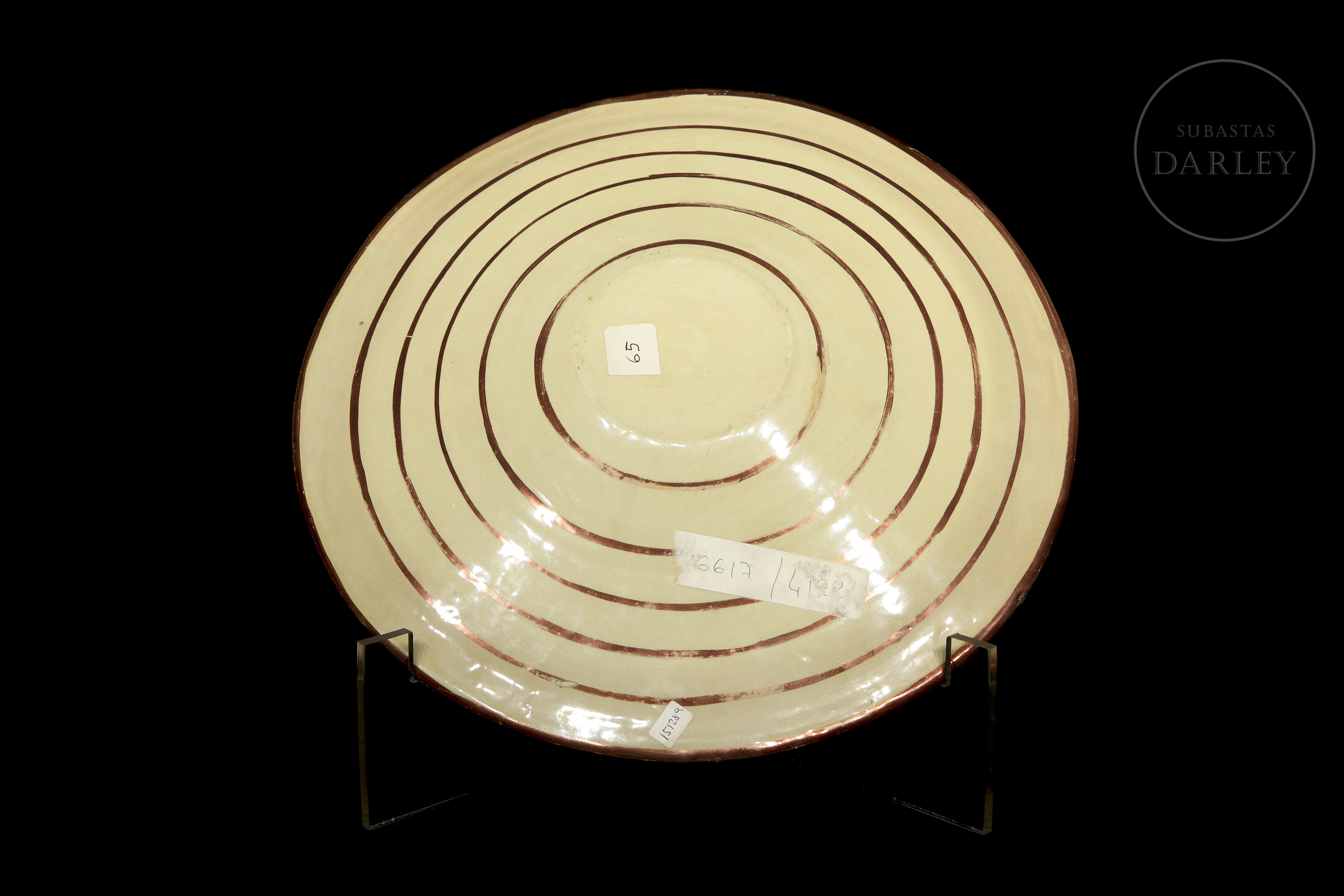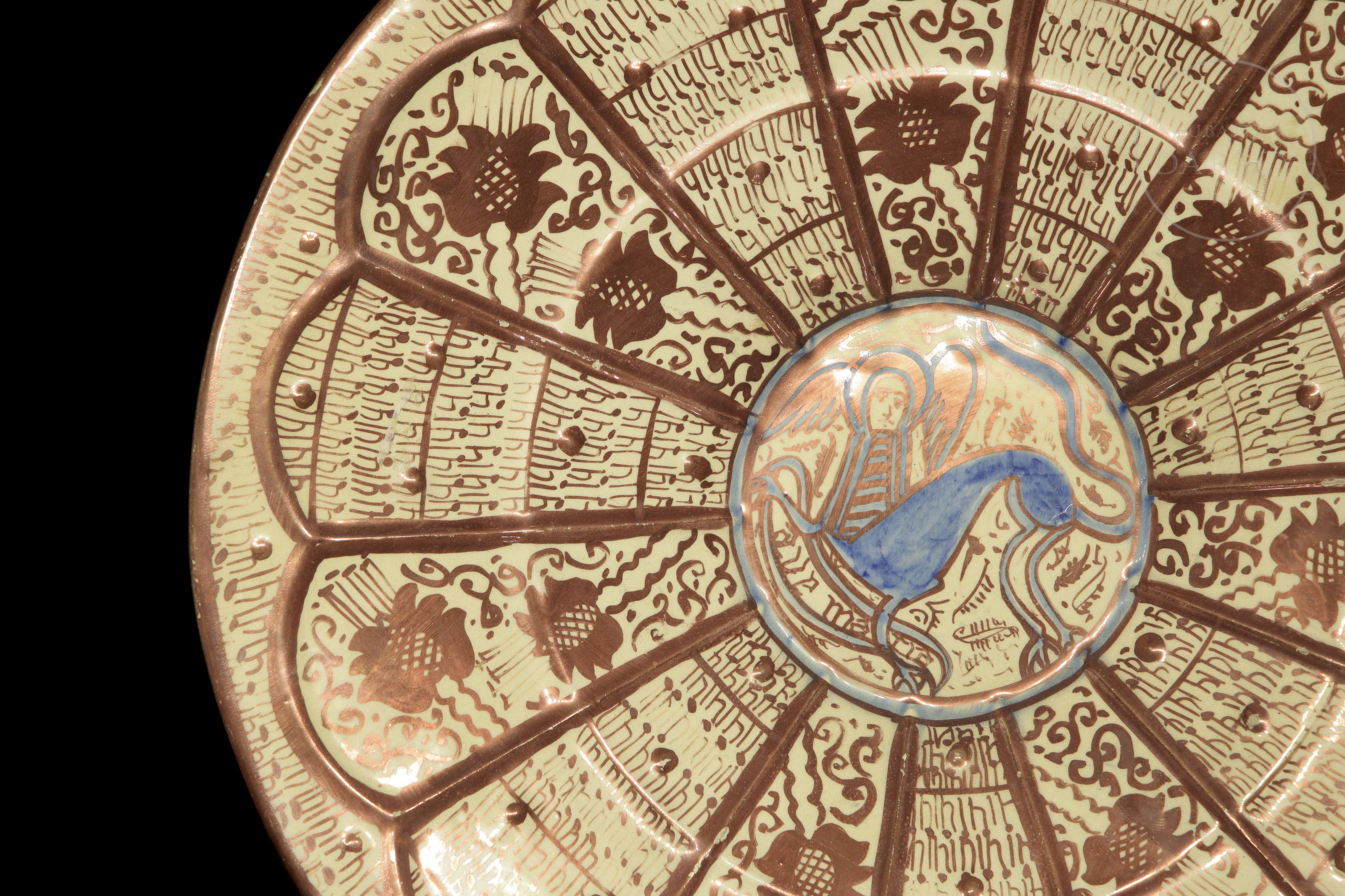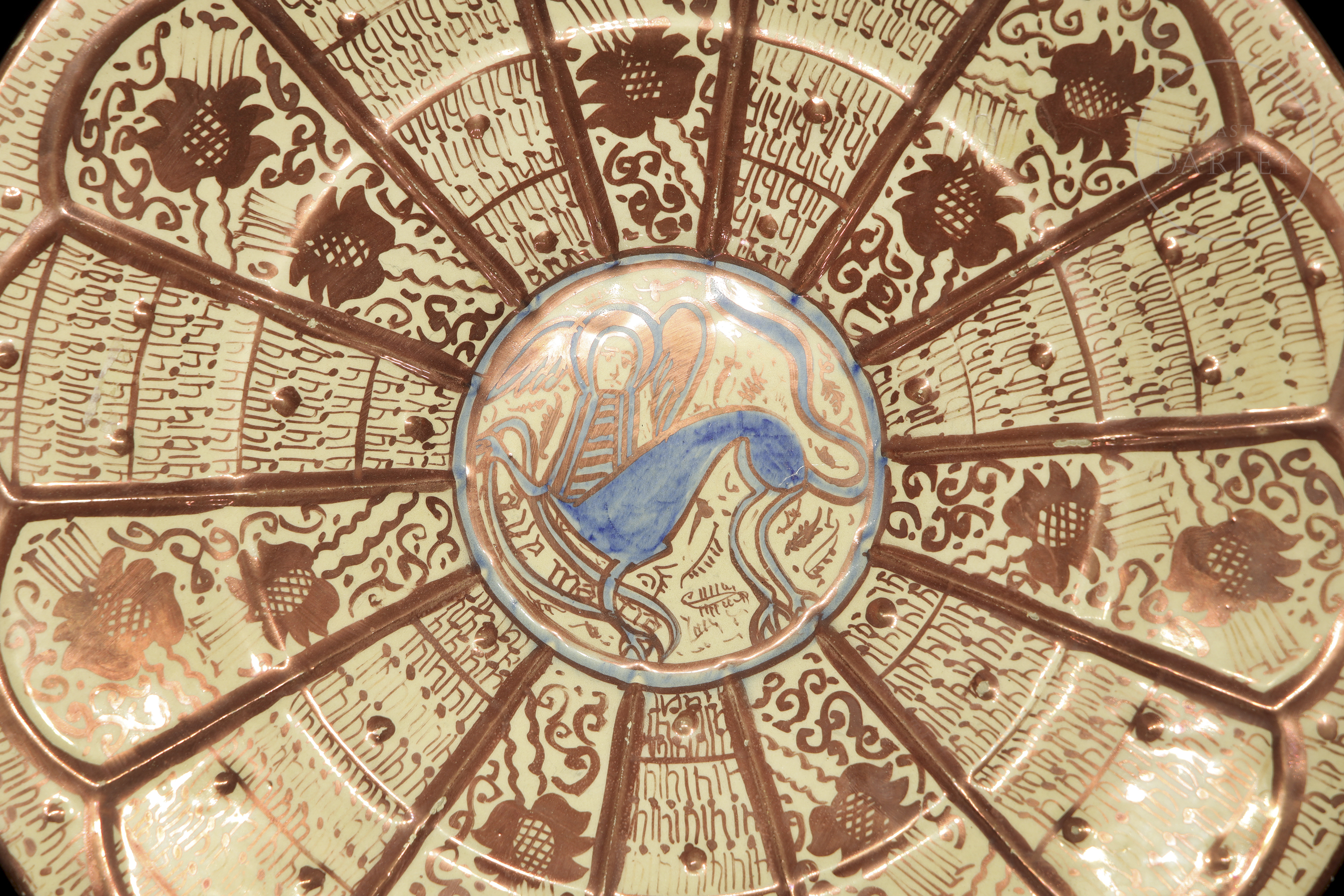 A Spanish ceramic dish (Manises), with a metallic lustre-painted glaze in relief. In the central part of the dish is a figure with a fantastic iconography, surrounded by plant forms and decorative elements in the Mudéjar style. It has concentric circles on the back. Inspired by 15th-16th century models.