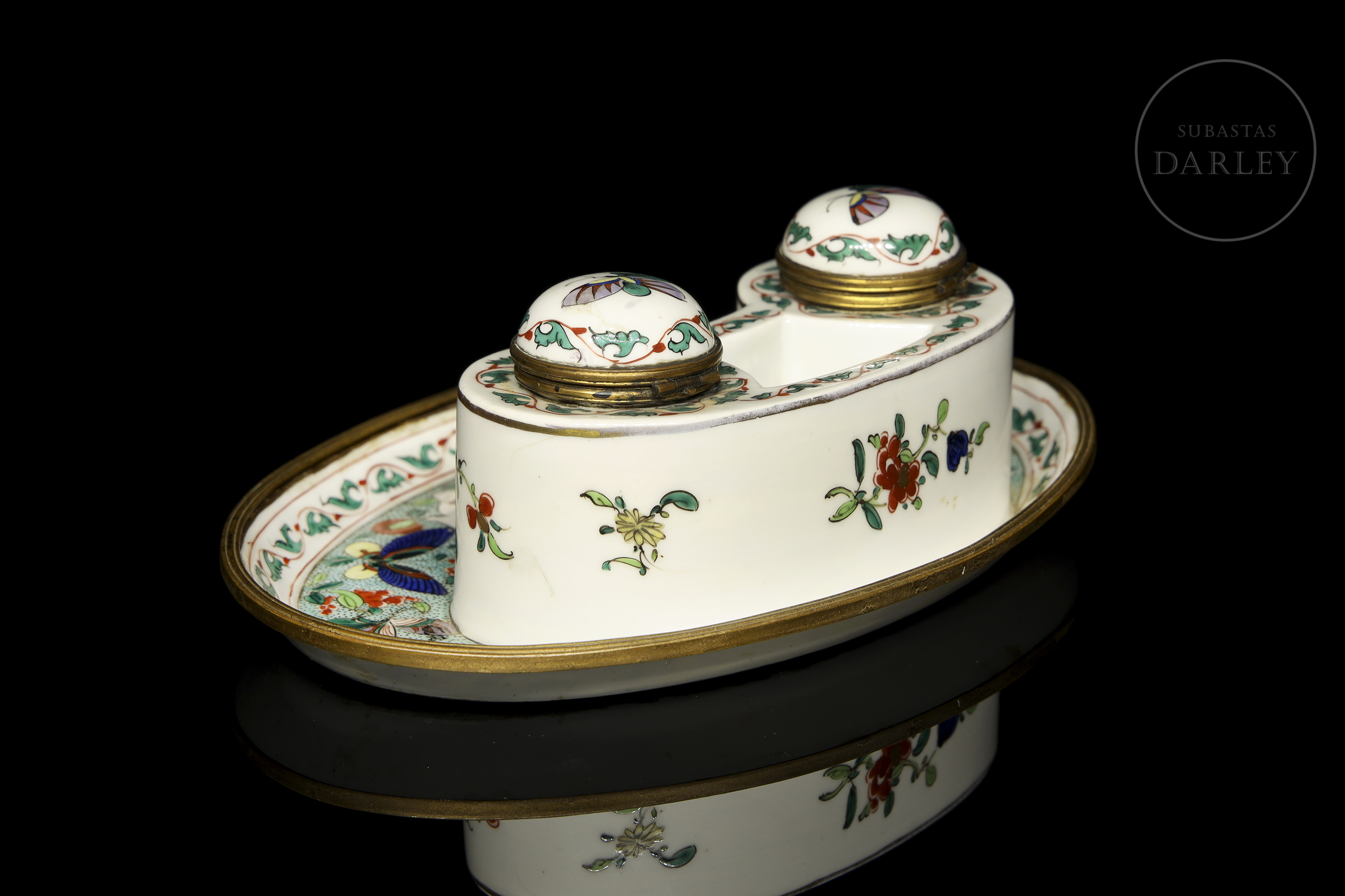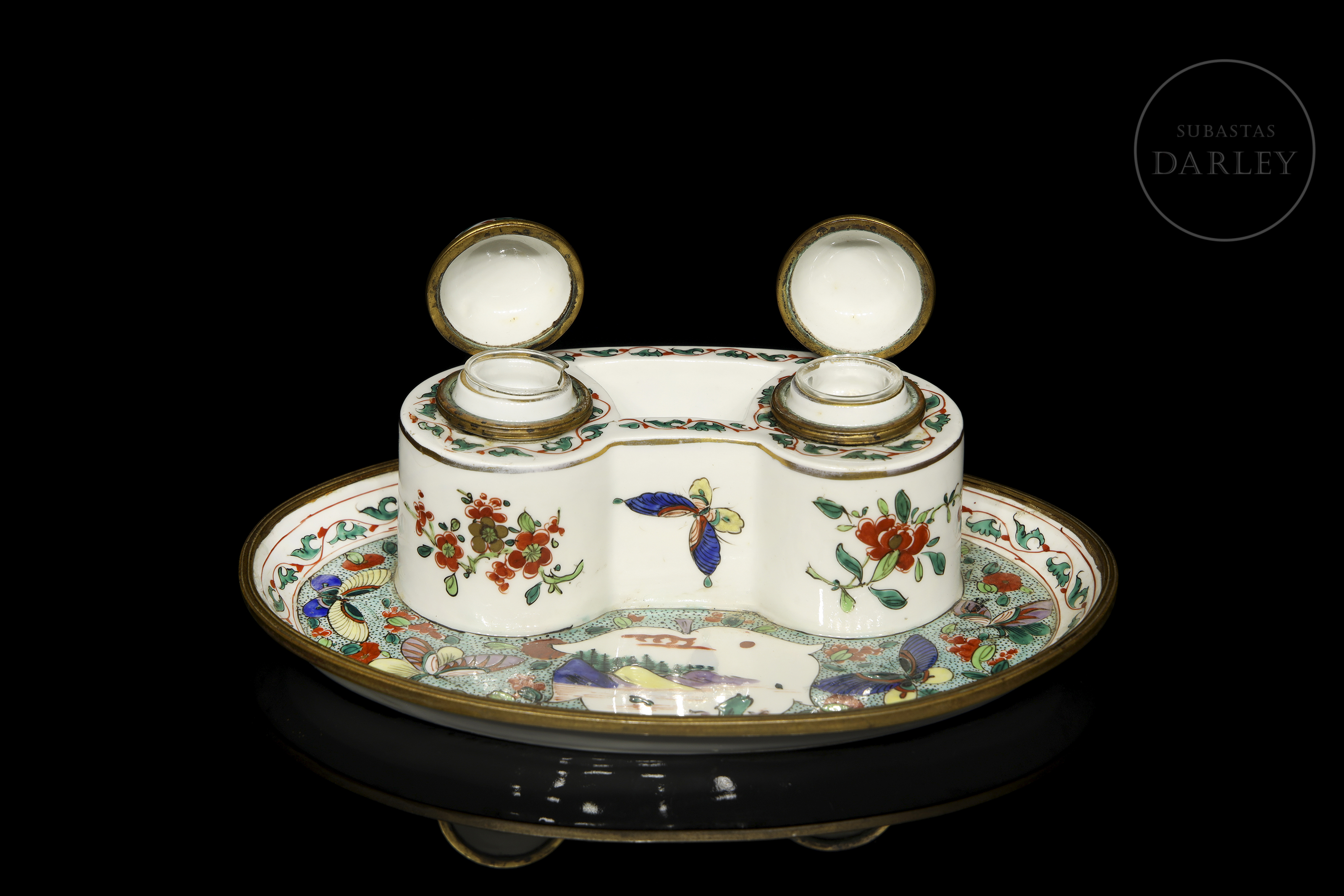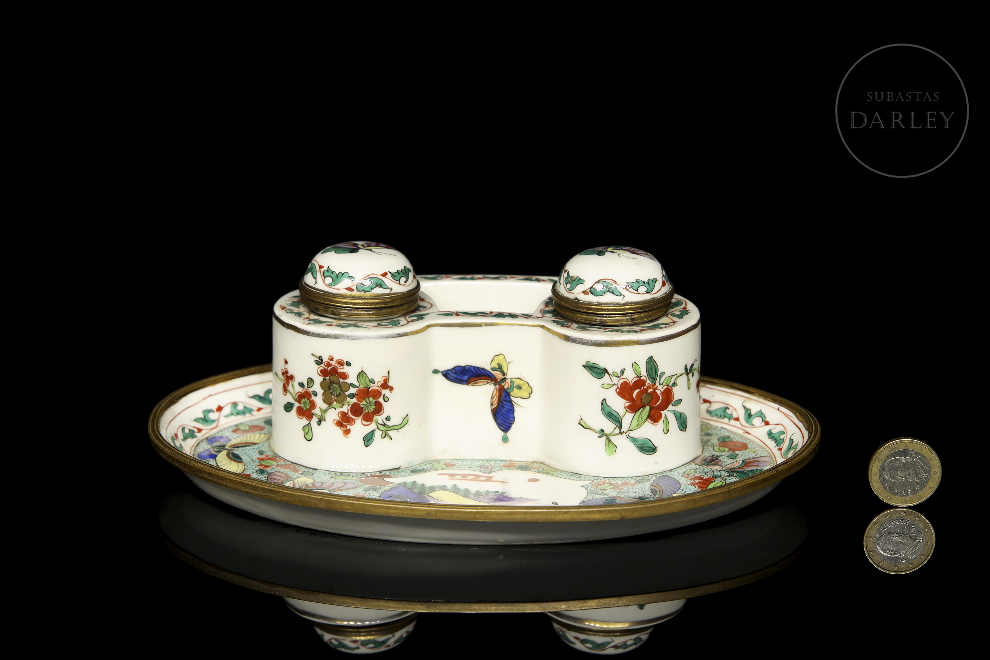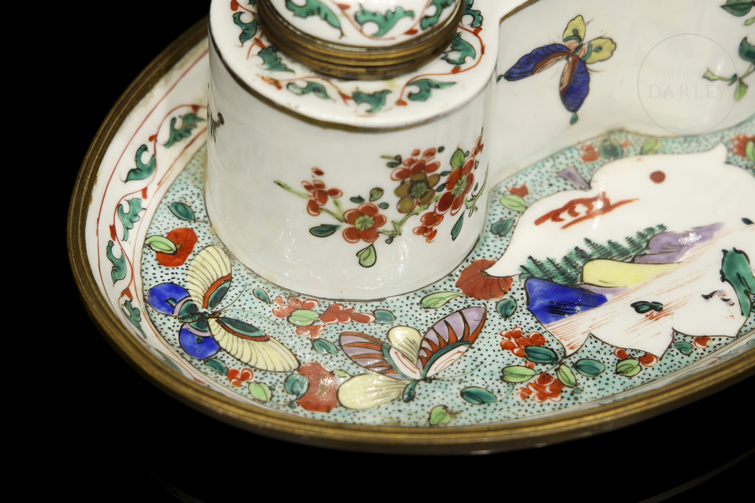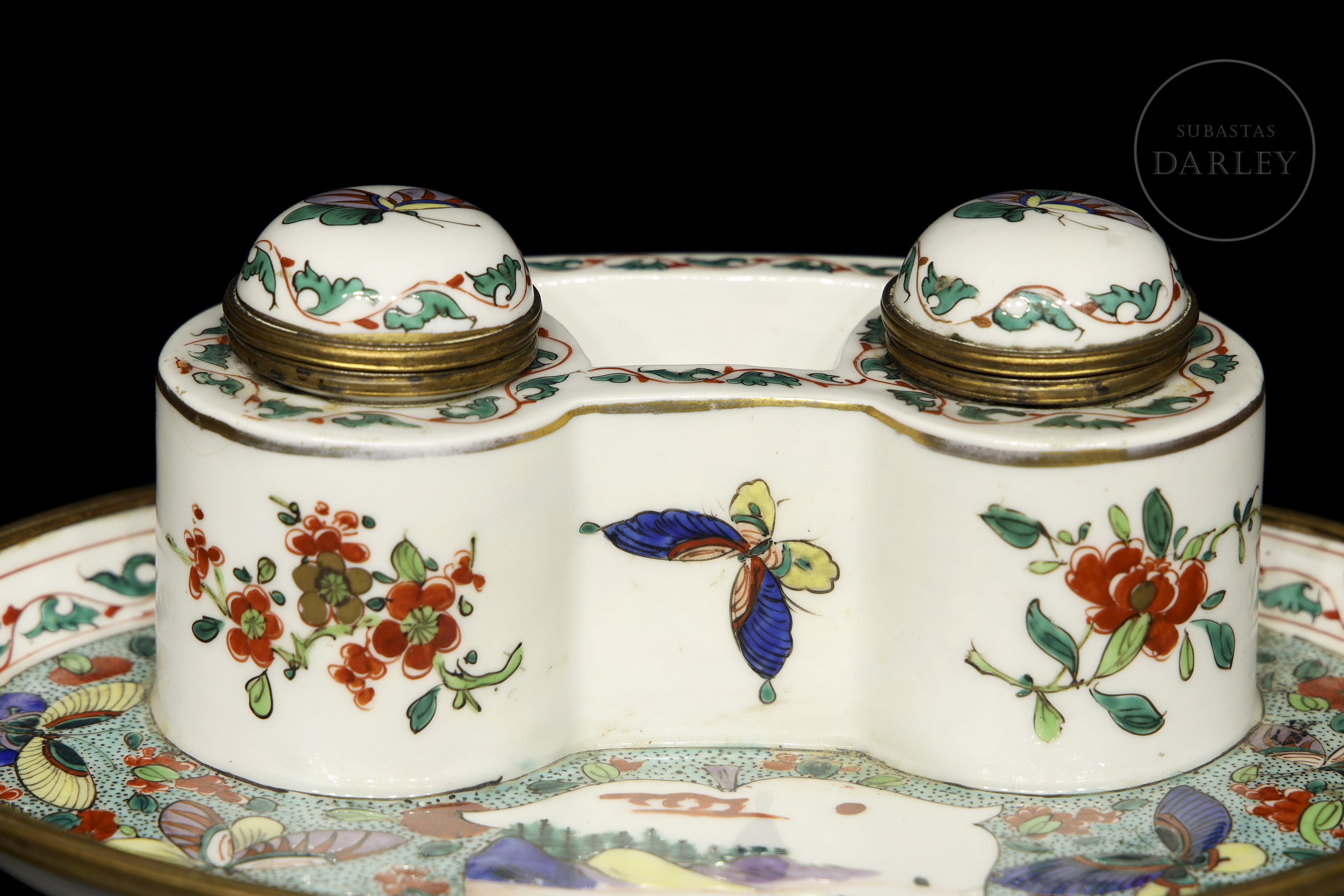 Glazed ceramic writing desk with double inkwell and central blotter. Asian-style decoration with vegetal and animal motifs on a white background. With factory stamp on the base.
