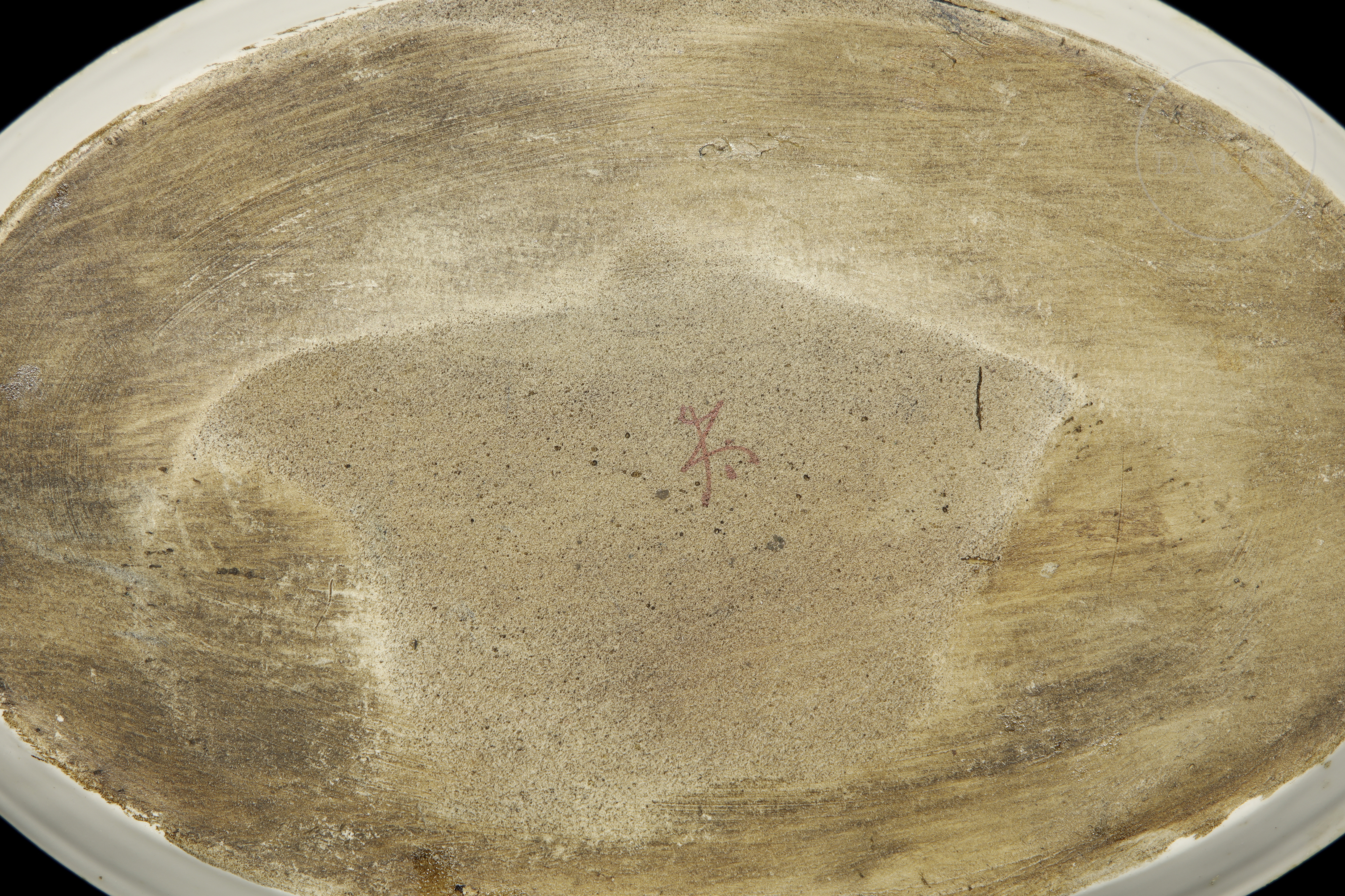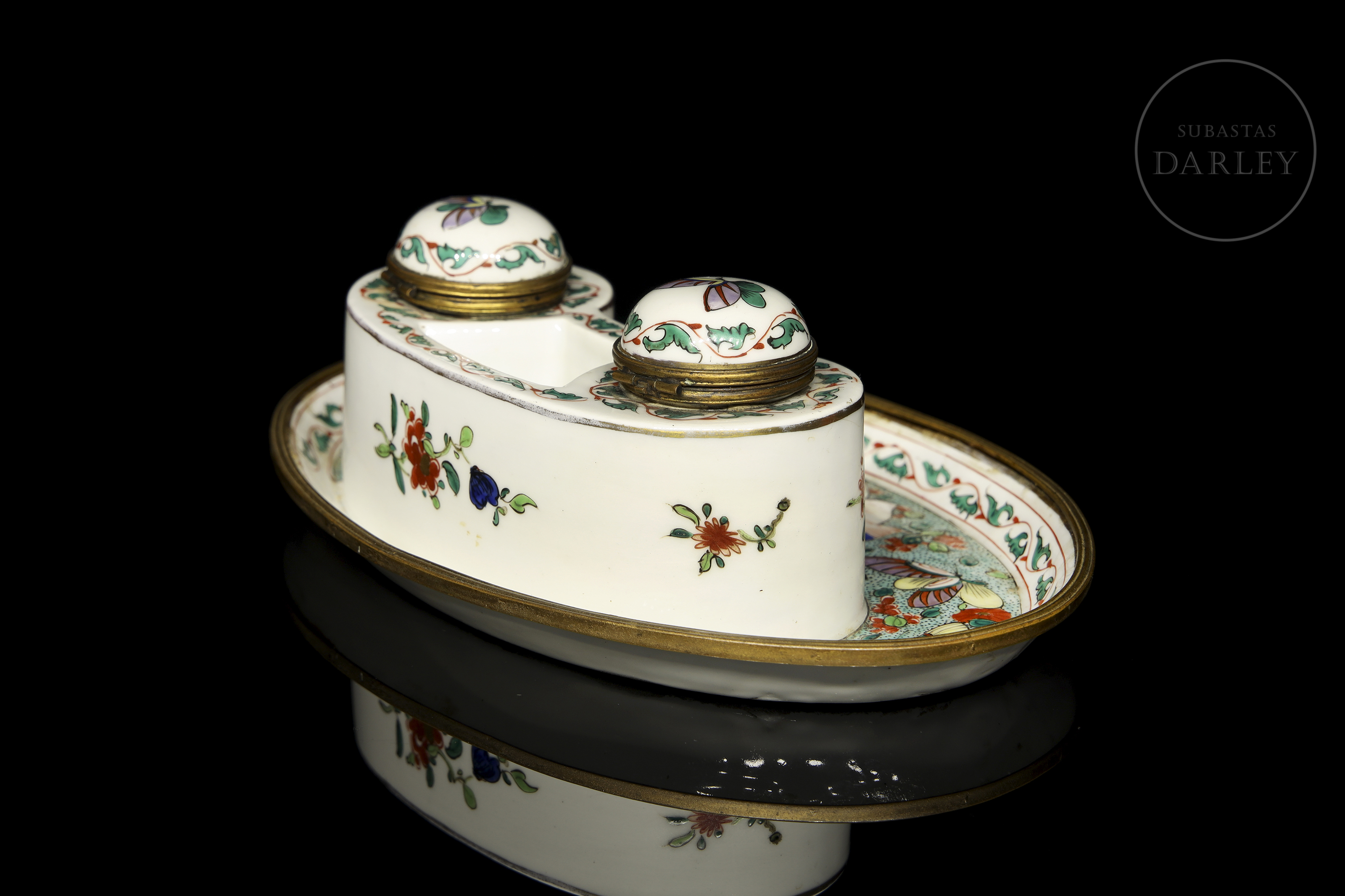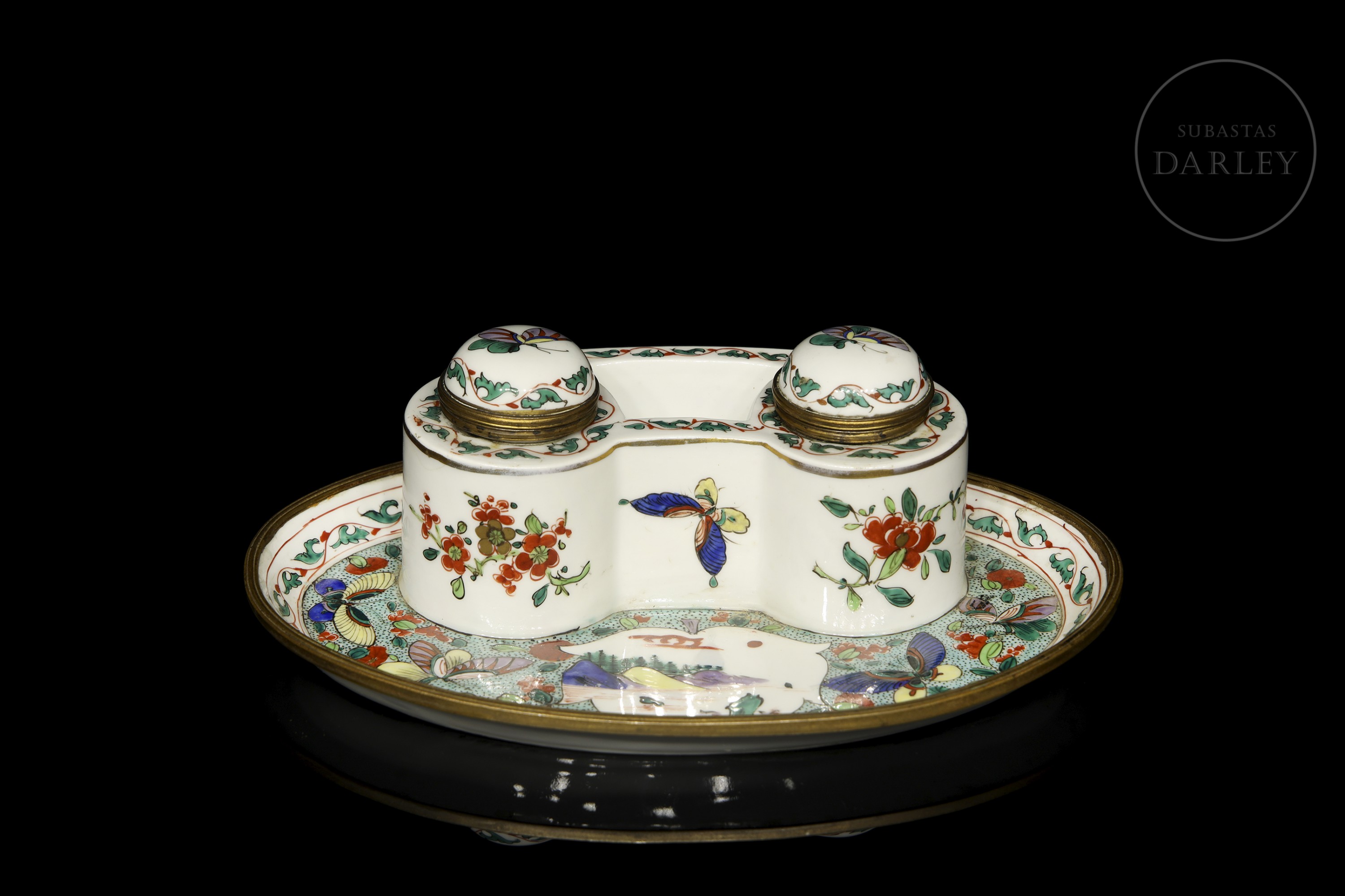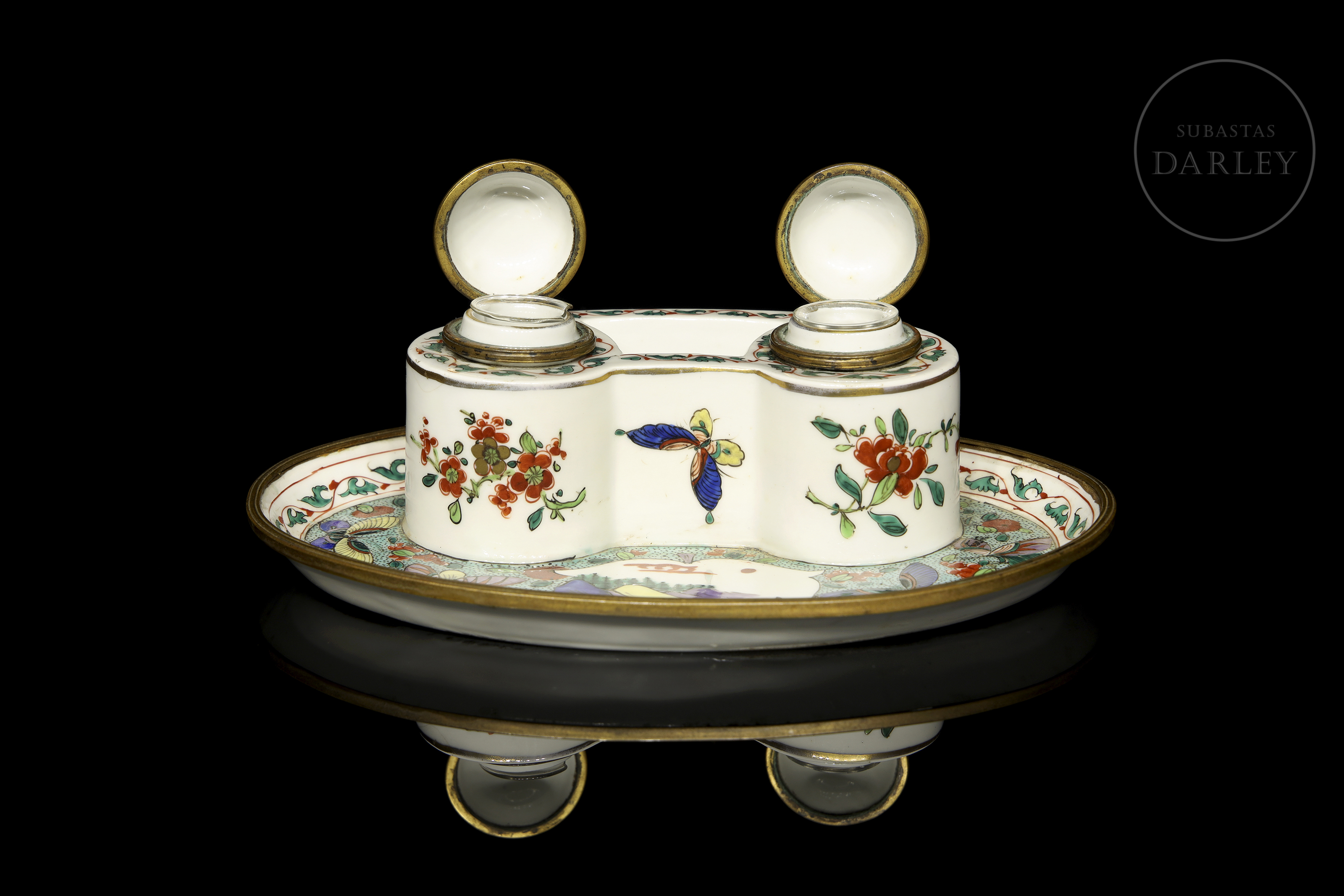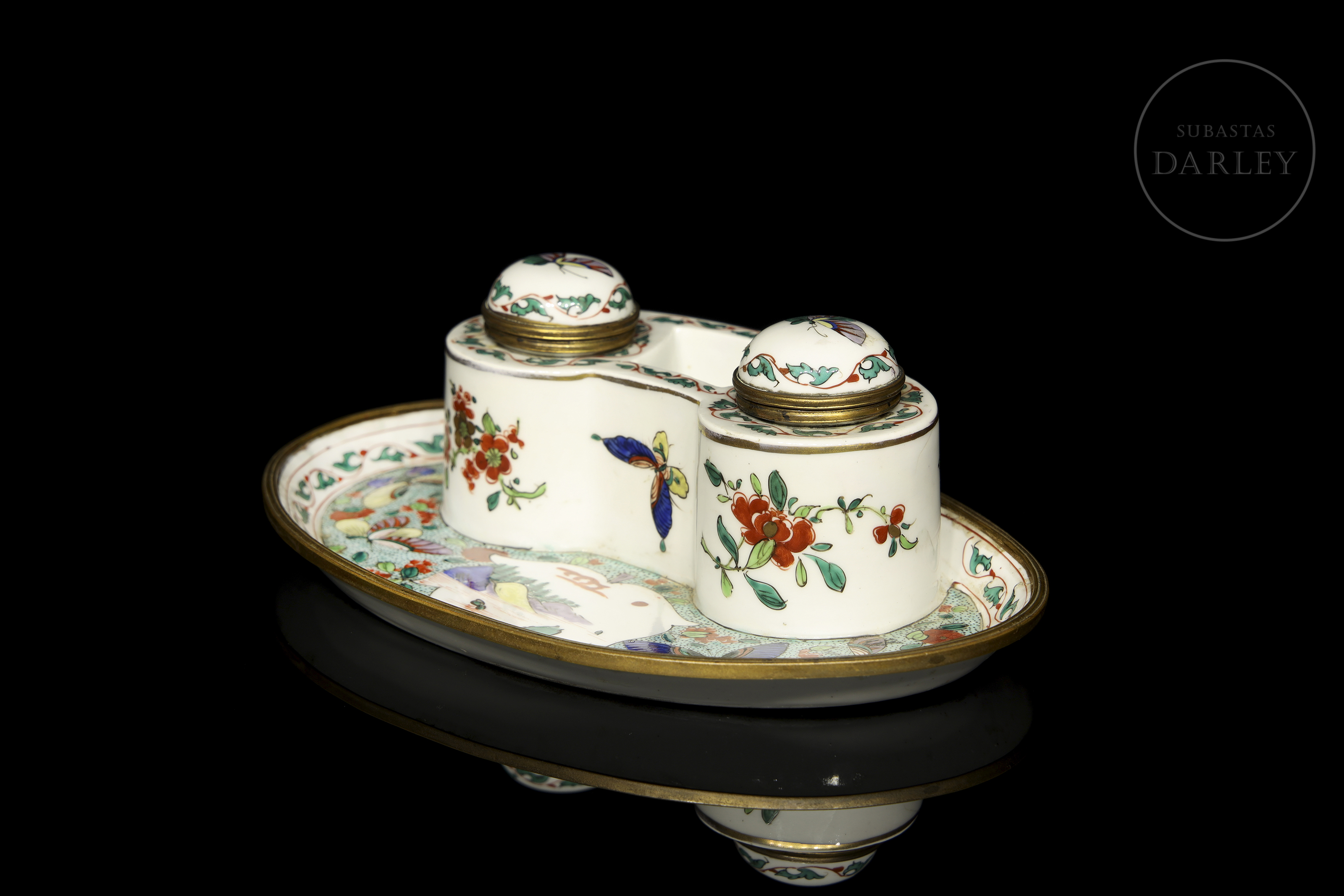 Glazed ceramic writing desk with double inkwell and central blotter. Asian-style decoration with vegetal and animal motifs on a white background. With factory stamp on the base.