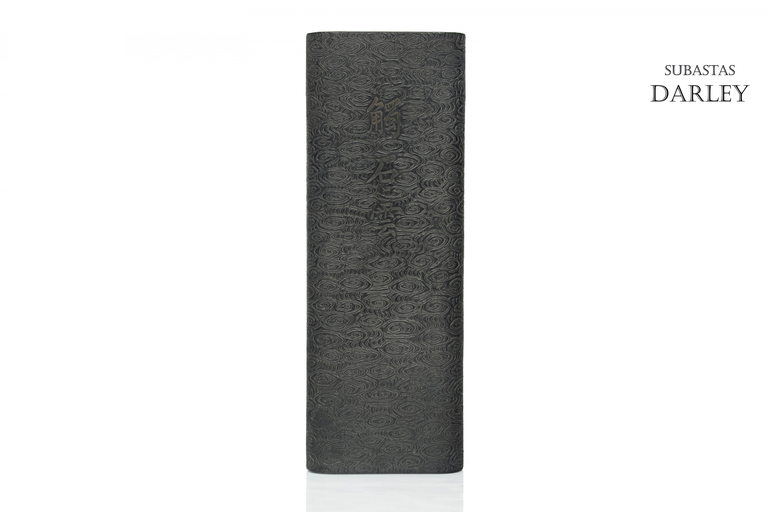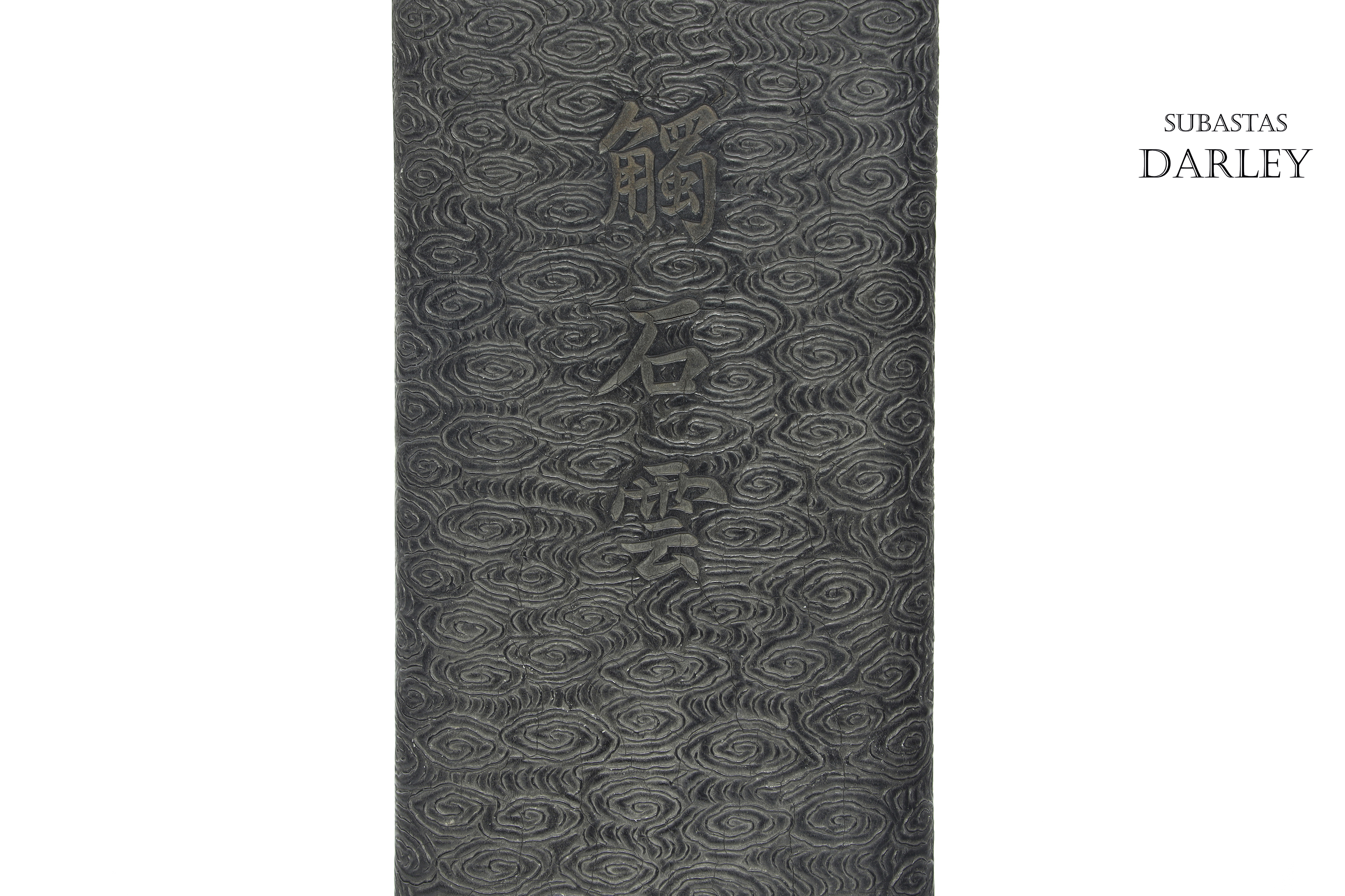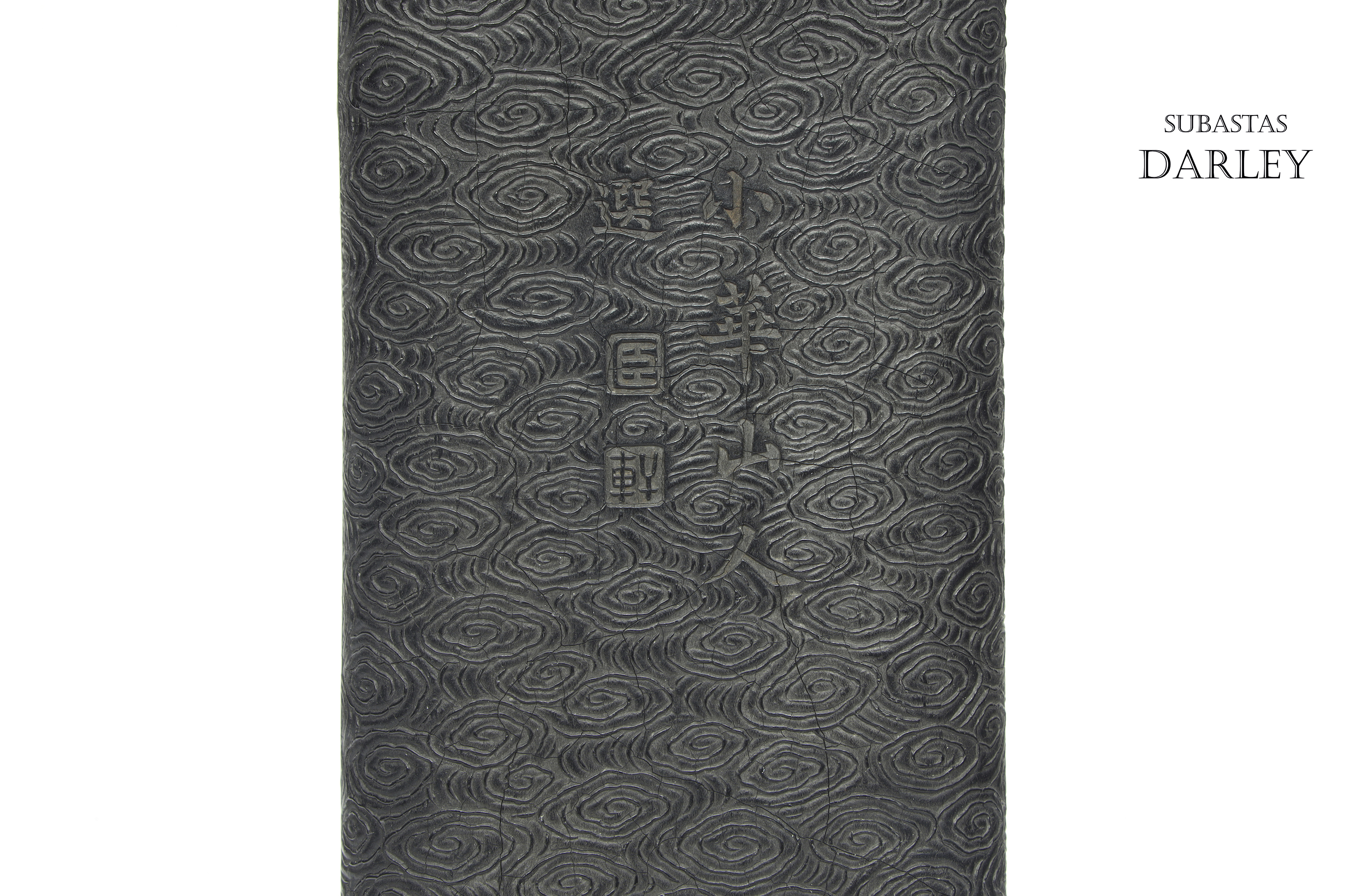 Black ink decorated with cloud patterns and inscriptions. On the obverse is written 触石云 indicating an ancient expression meaning 'Touch the stone and the cloud'. On the reverse is a signature "小华山人 臣轩". At the top it indicates a provenance: "徽城鉴古斋选烟".