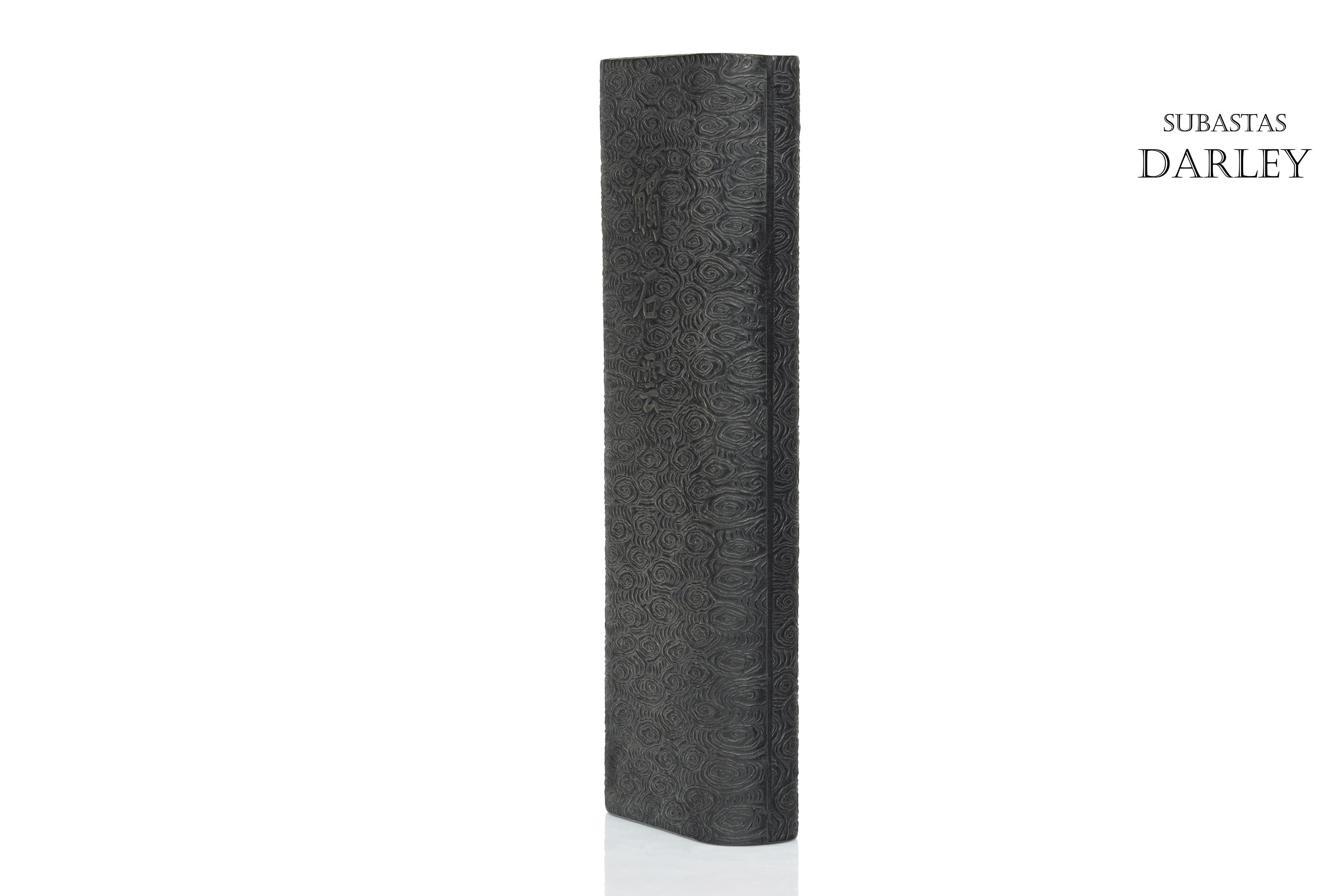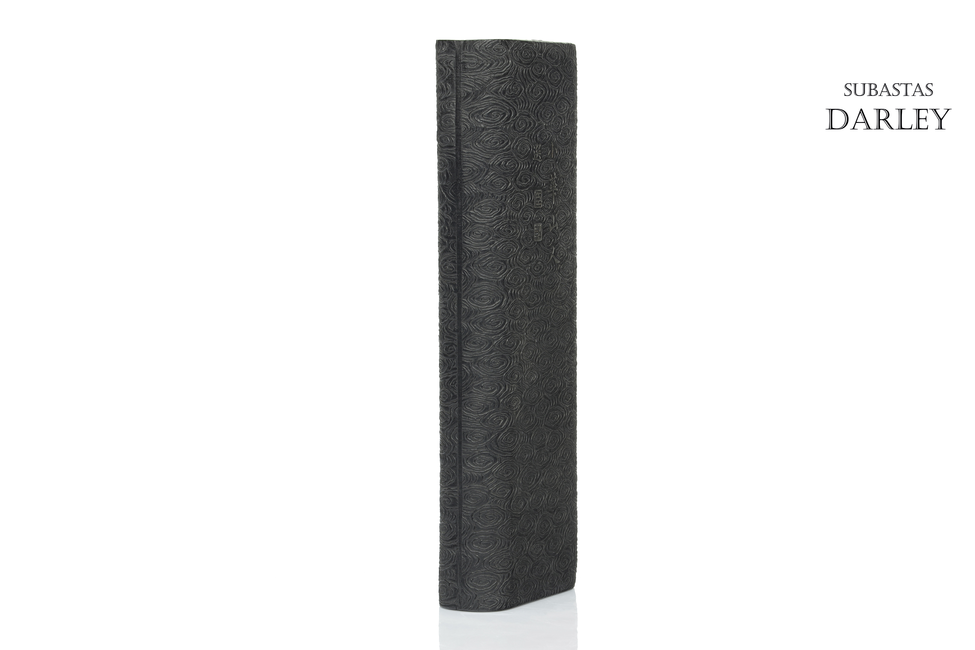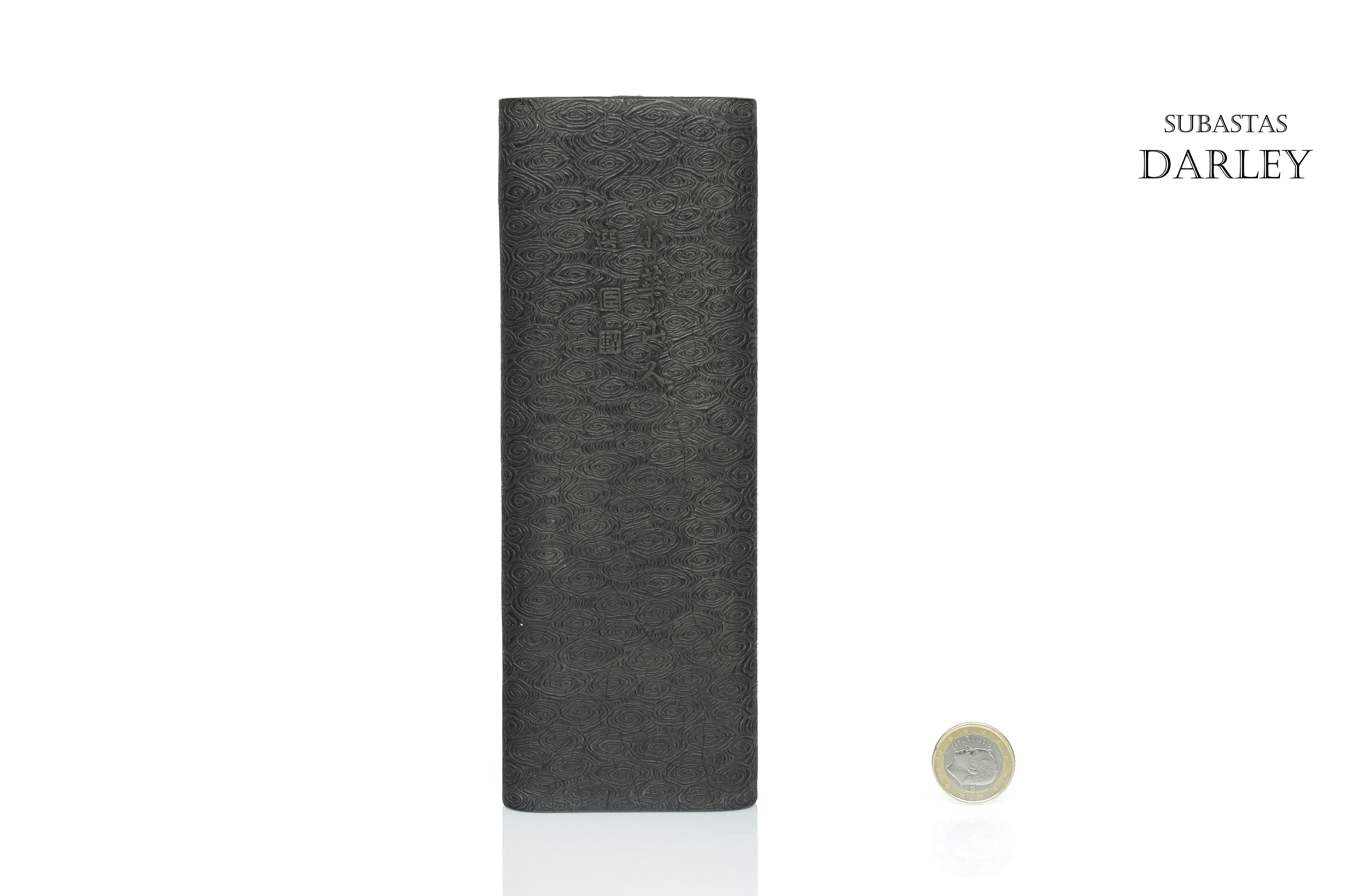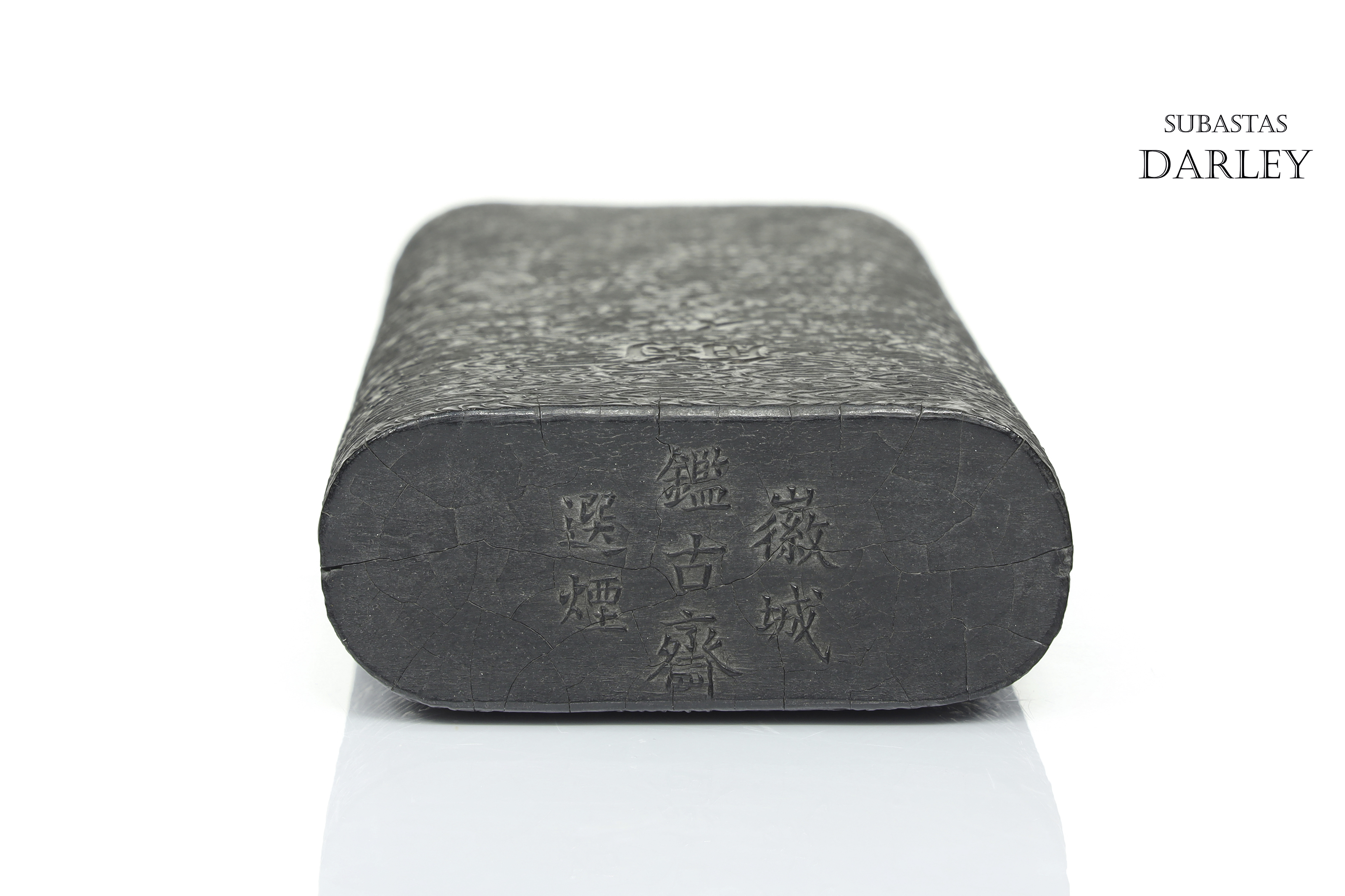 Black ink decorated with cloud patterns and inscriptions. On the obverse is written 触石云 indicating an ancient expression meaning 'Touch the stone and the cloud'. On the reverse is a signature "小华山人 臣轩". At the top it indicates a provenance: "徽城鉴古斋选烟".
