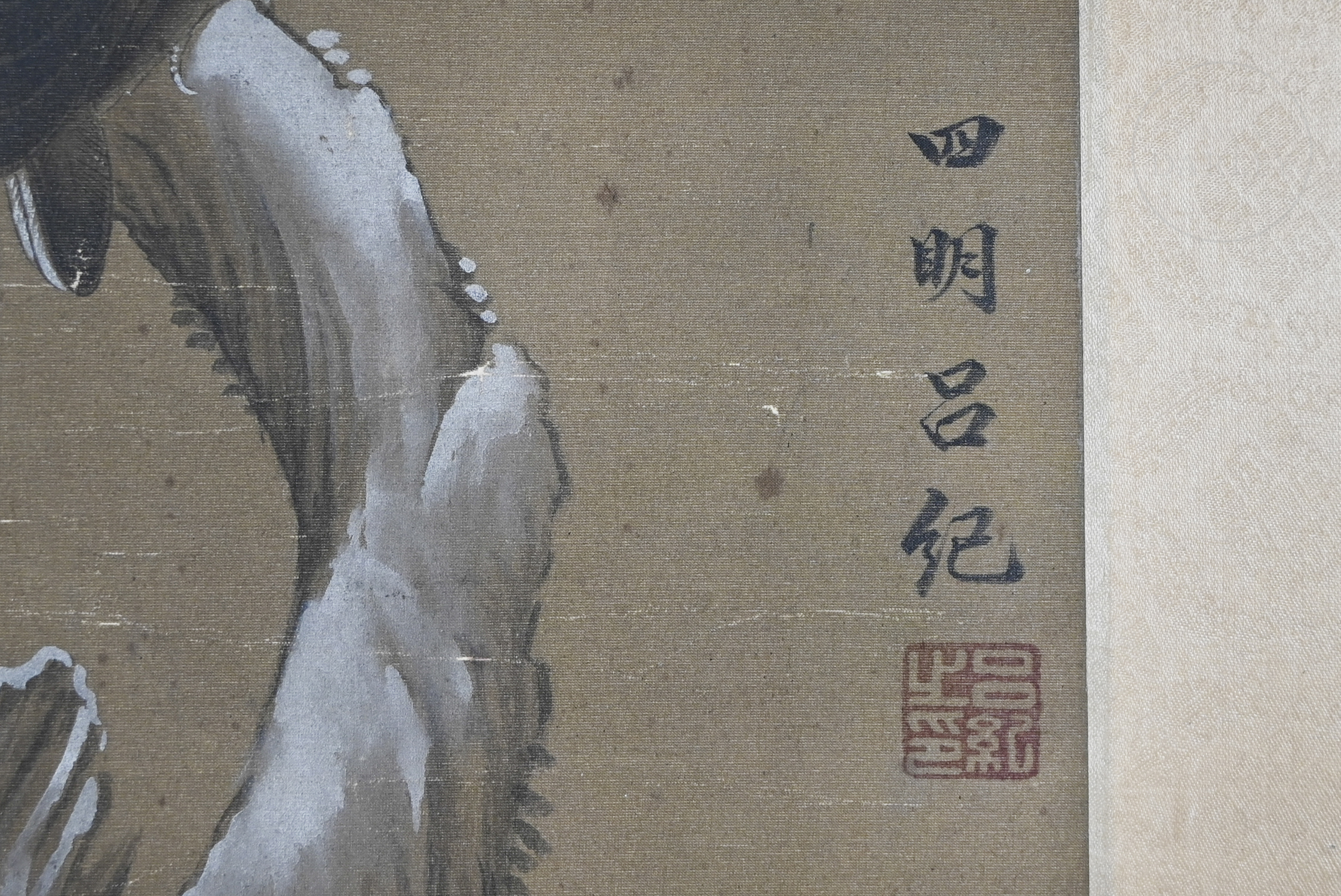 Pigments and ink on silk, framed in brocade silk. The scene depicts a willow tree with curved branches covered in snow, on which two dark-feathered birds are perched. At the bottom, camellias in bloom with red petals are arranged. On the right is the inscription ‘四明吕纪’, next to a red seal ‘吕纪之印’ (Lü Ji, 1465-1505).