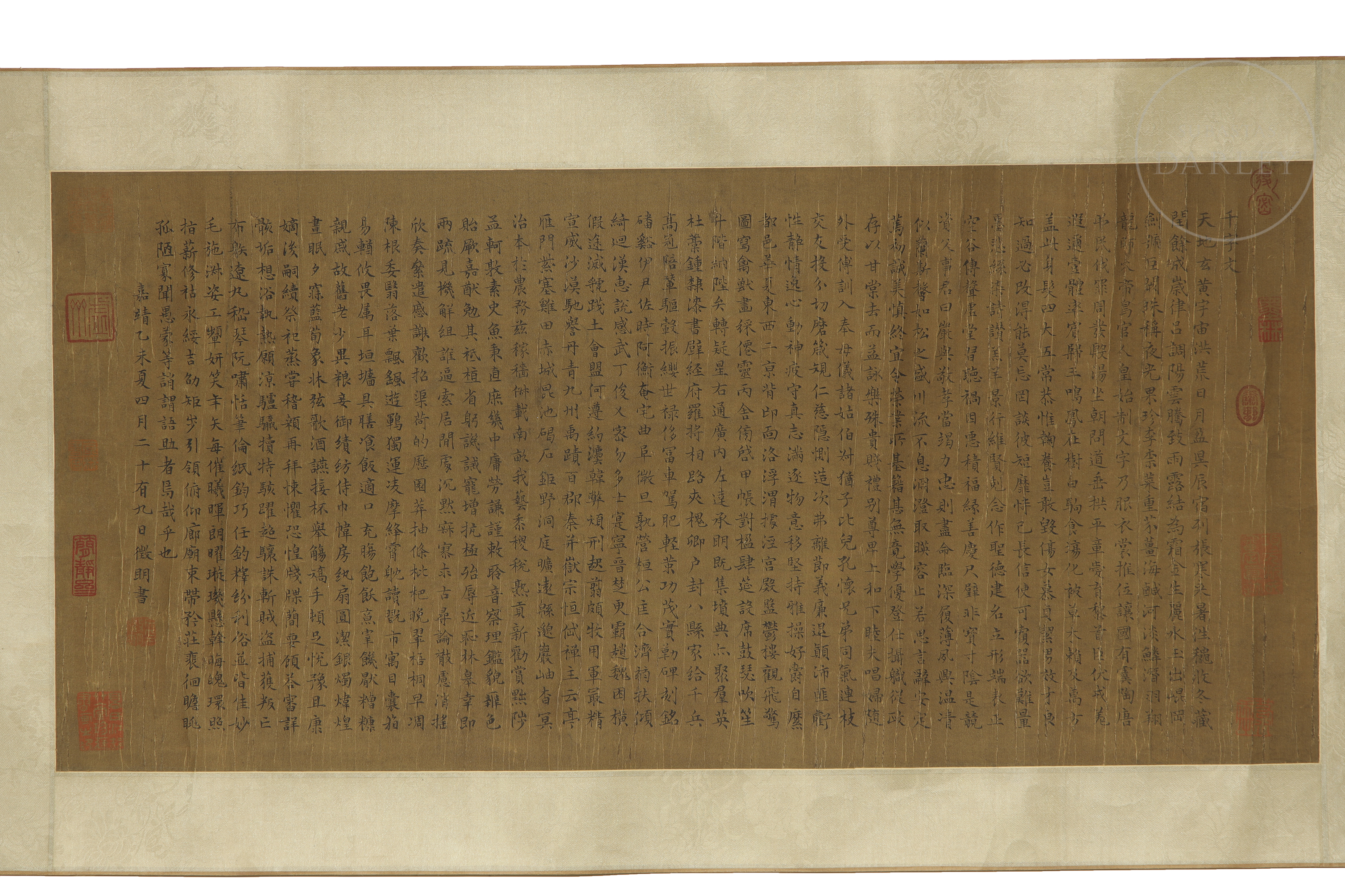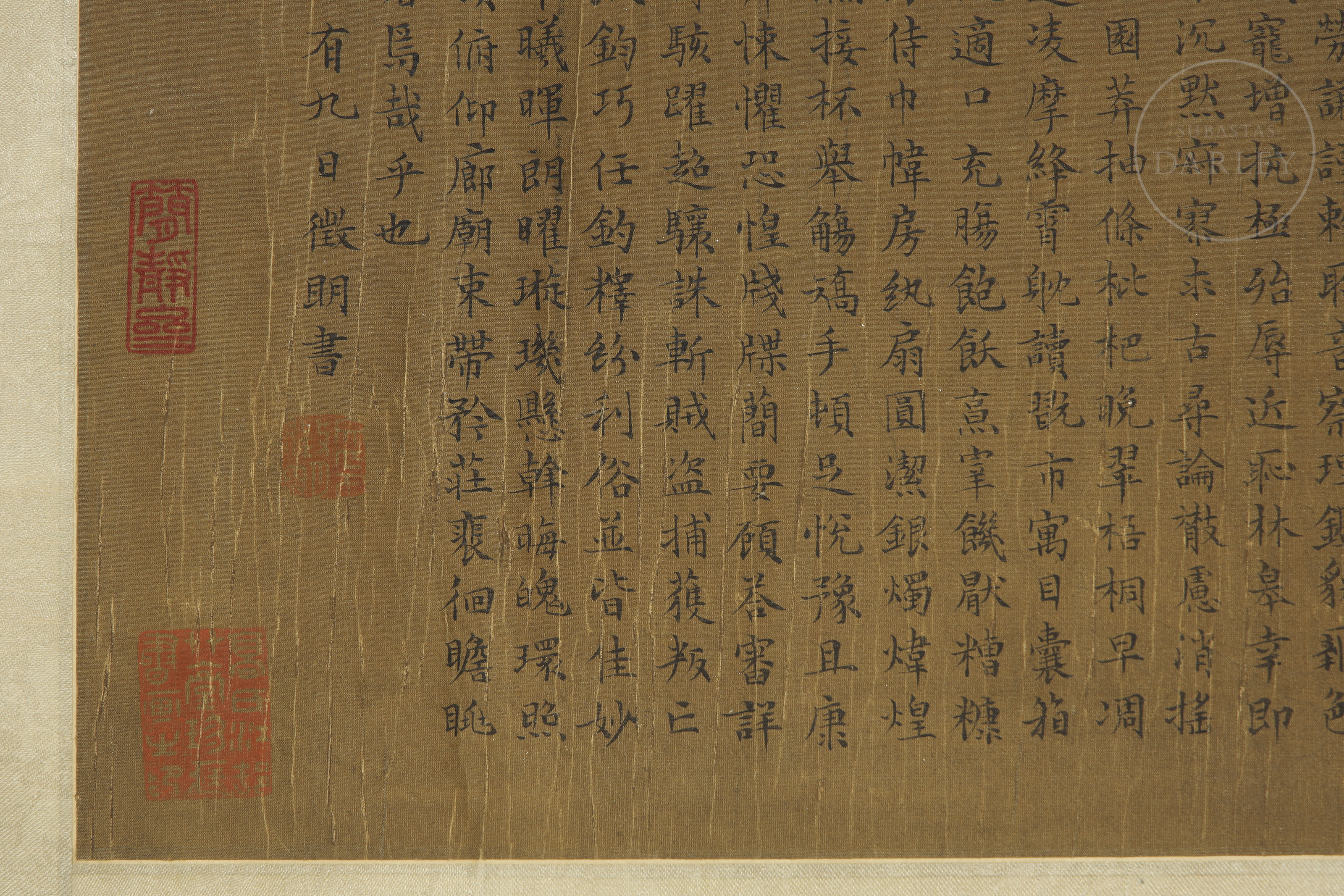 Chinese ink on paper, with a carved silk frame. It shows a total of eleven stamps and indicates on the left side ‘嘉靖乙未夏月四二十有九日 徵明書’.
