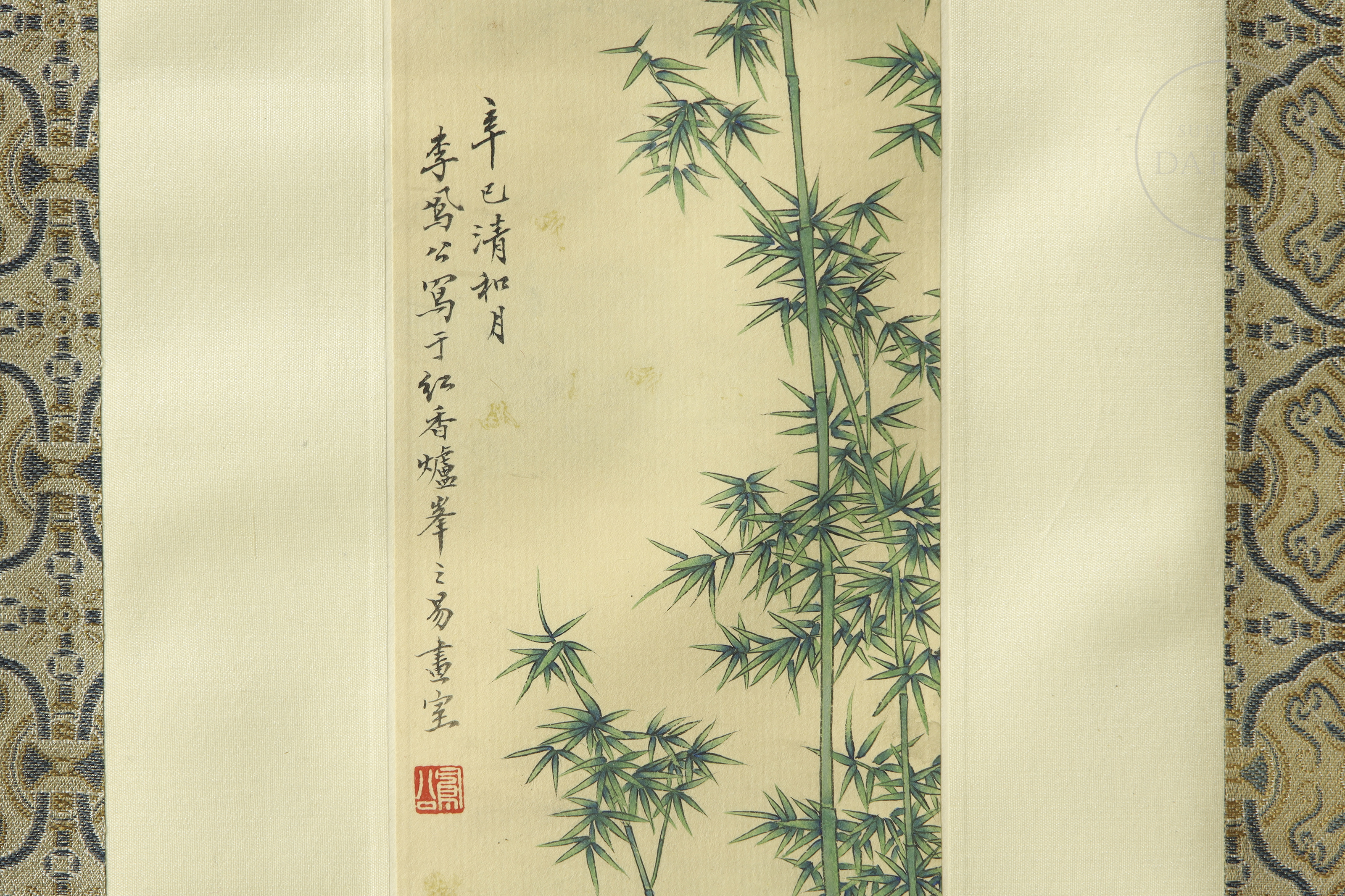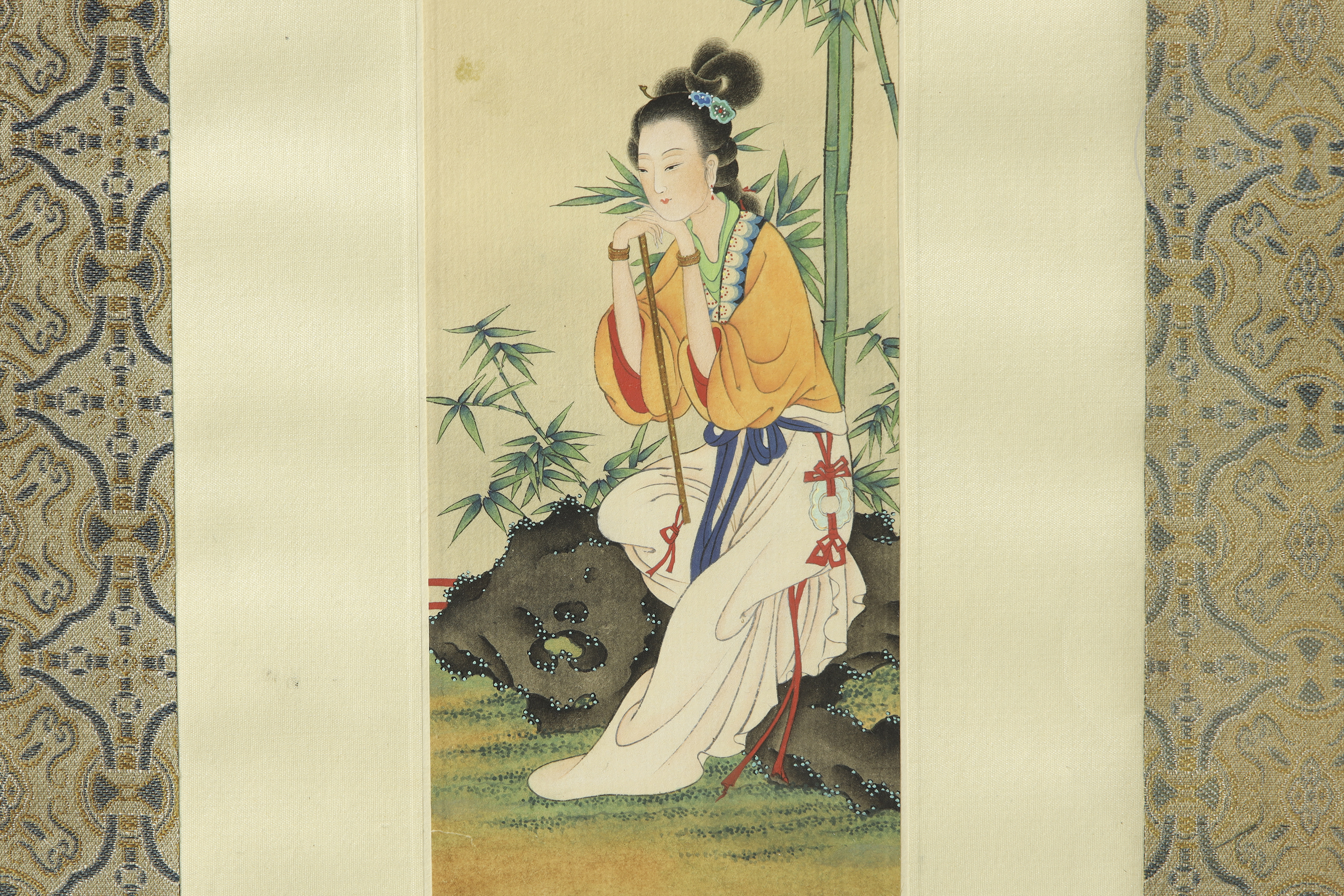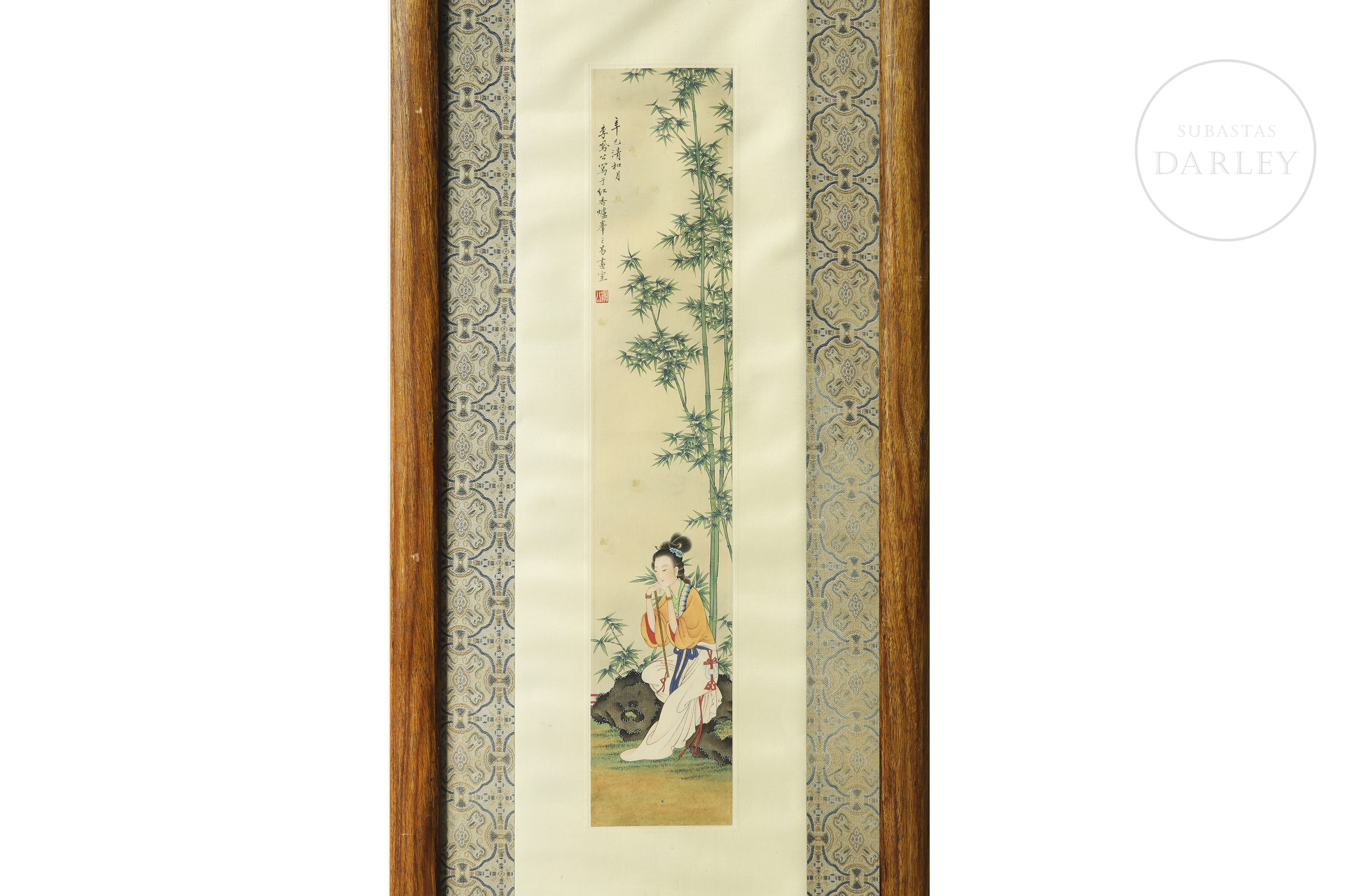 Beautiful Chinese painting made with ink and pigments on paper. It has a vertical and elongated form, which hosts a beautiful scene where a young lady sits next to high bamboo branches, on a steep rock, in a pensive position. The woman is dressed in a beautiful traditional dress, knotted by a belt at the hips from which hangs a jade ornament. Between her hands and resting on her legs, she holds a thin wooden staff on which her chin rests.