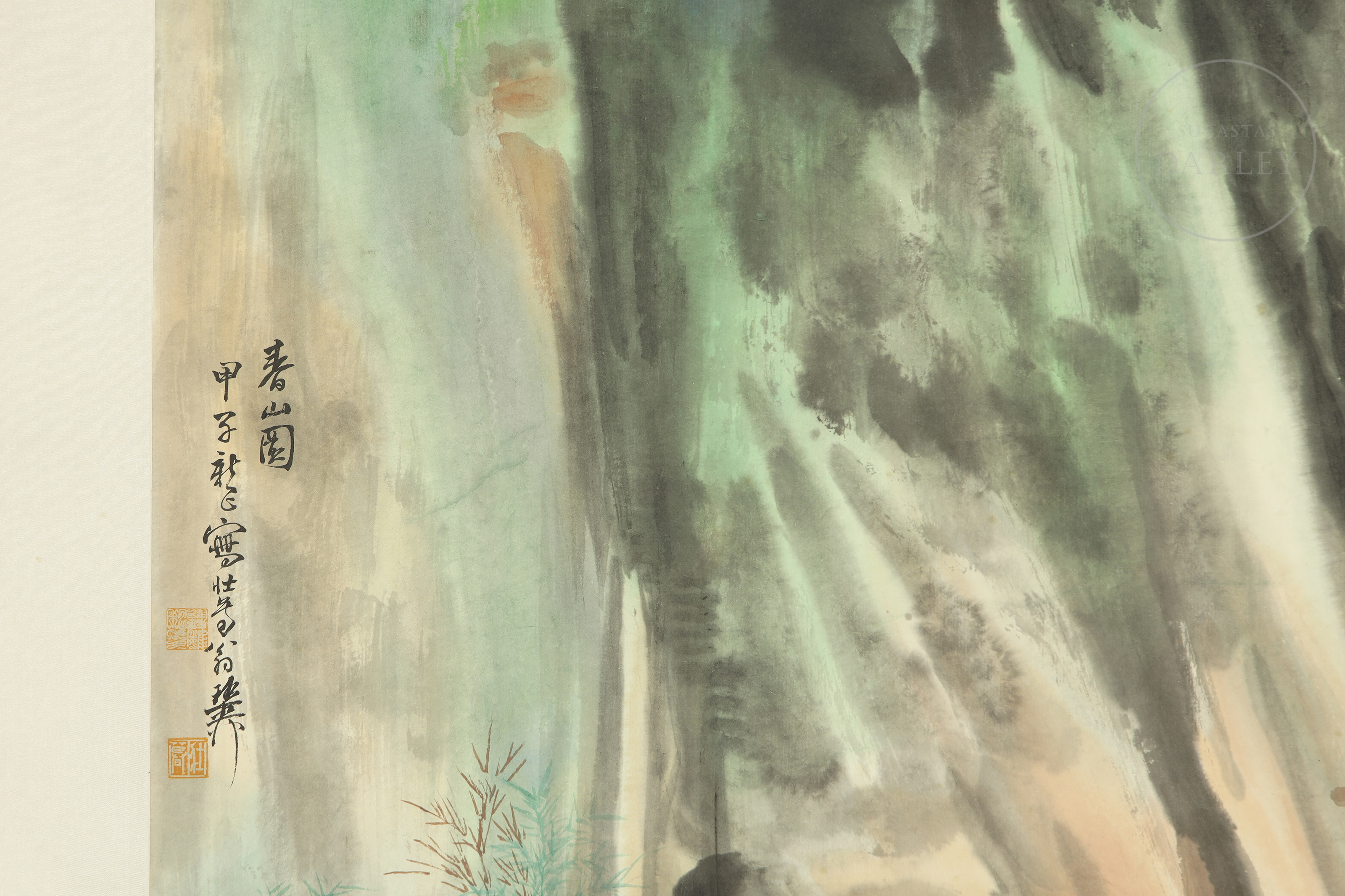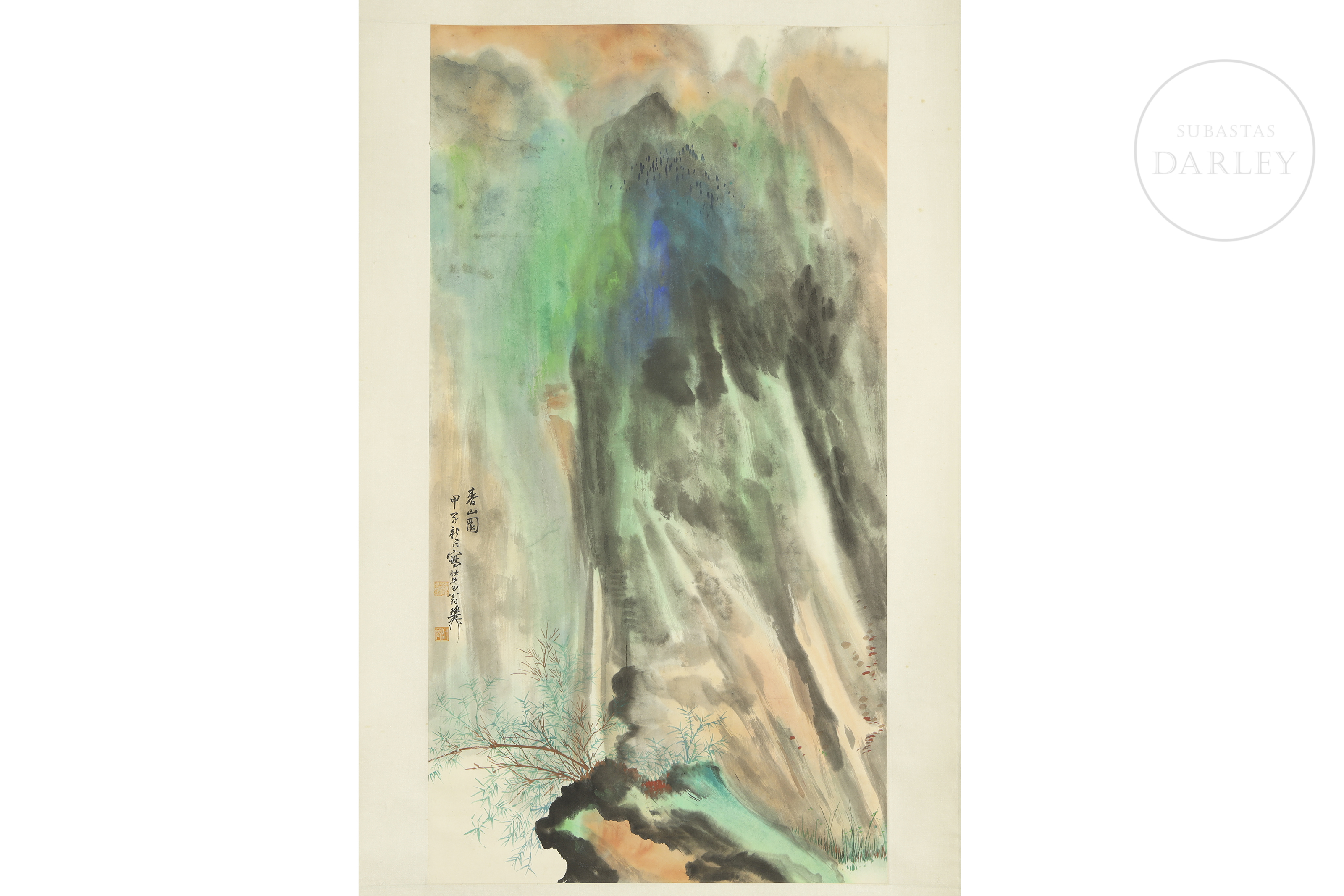 Ink on paper. Abstract composition in green, blue and red tones symbolizing a high mountain inspired by traditional Chinese painting. It shows, on the side, an inscription together with two seals made in red.