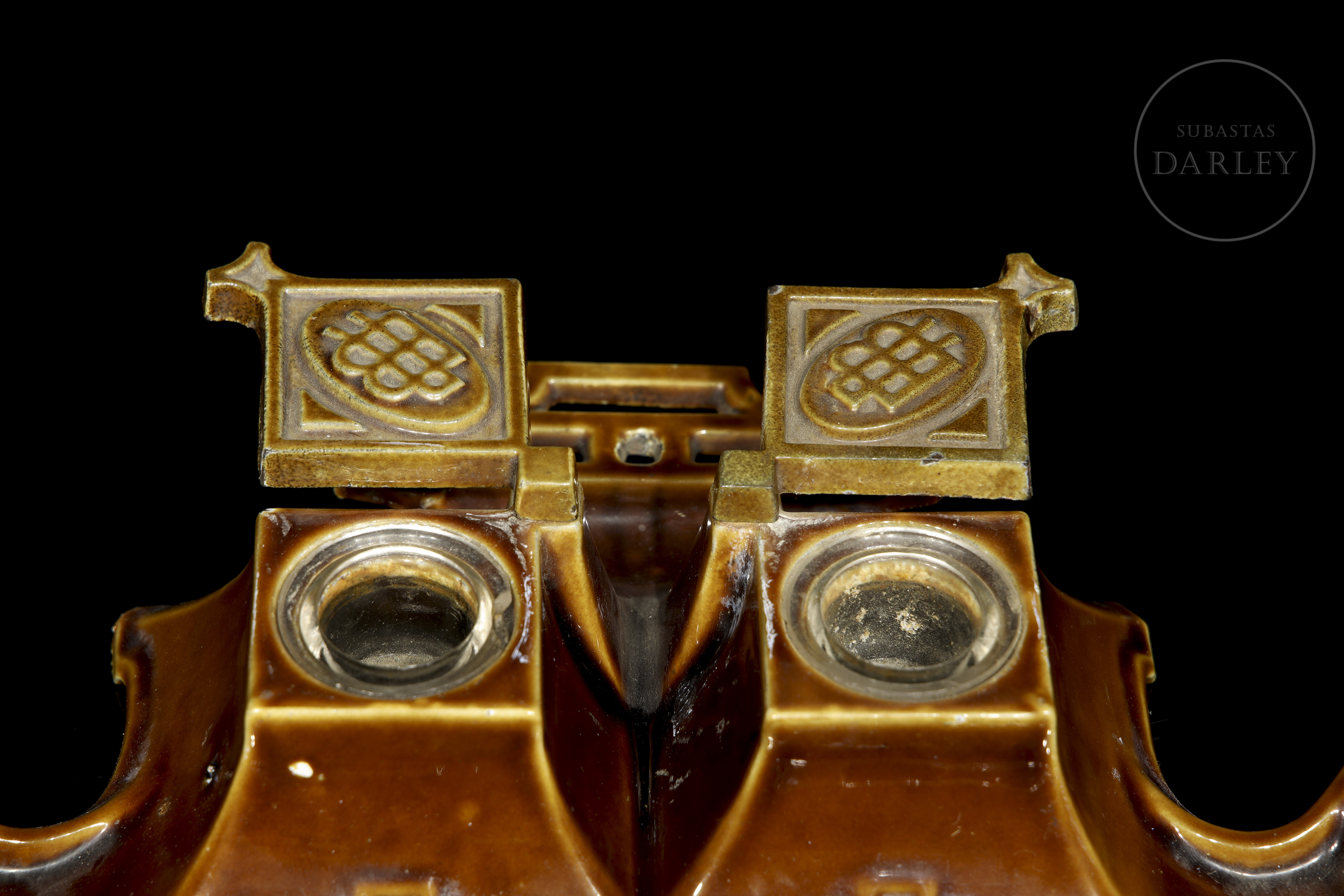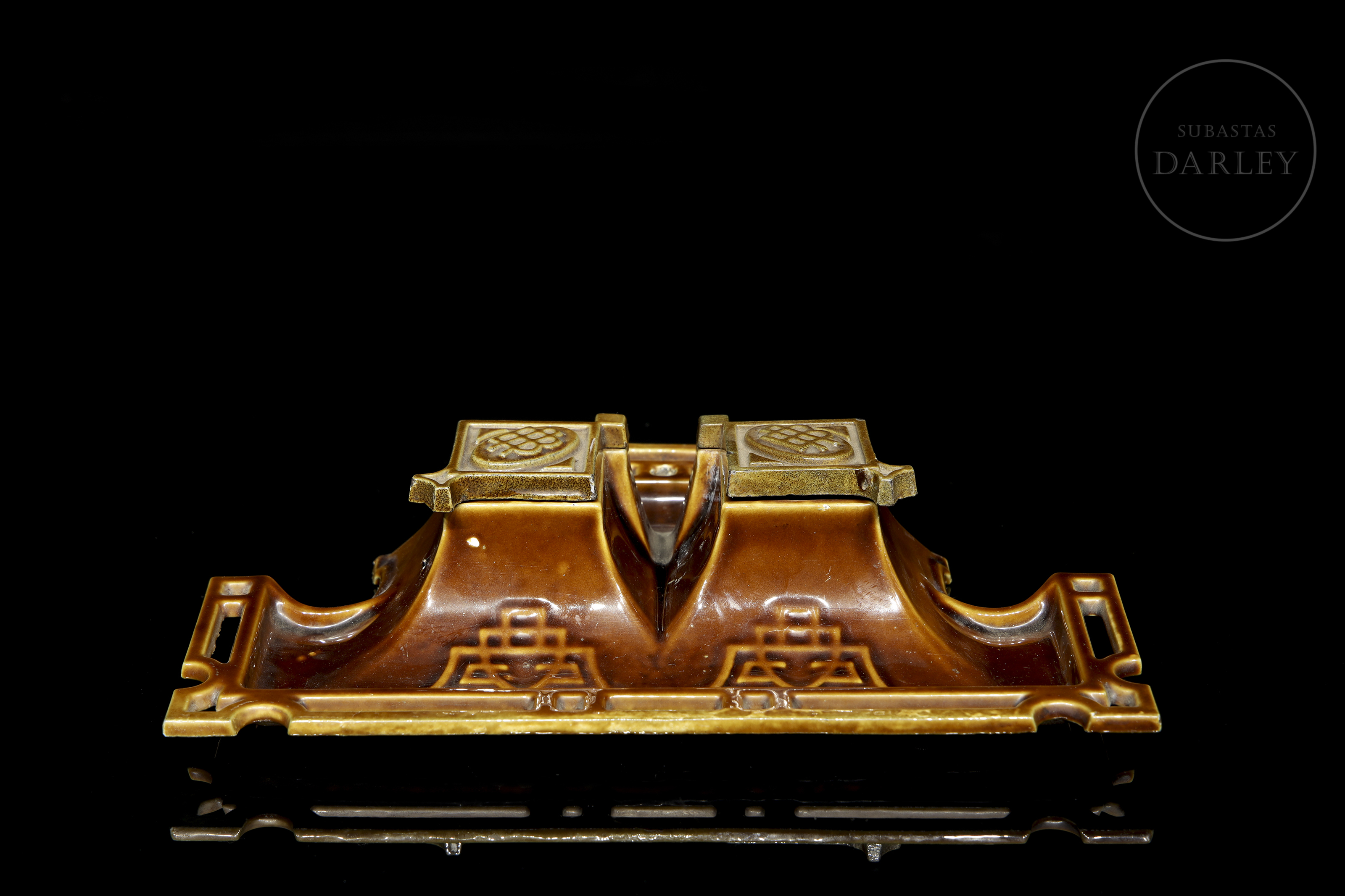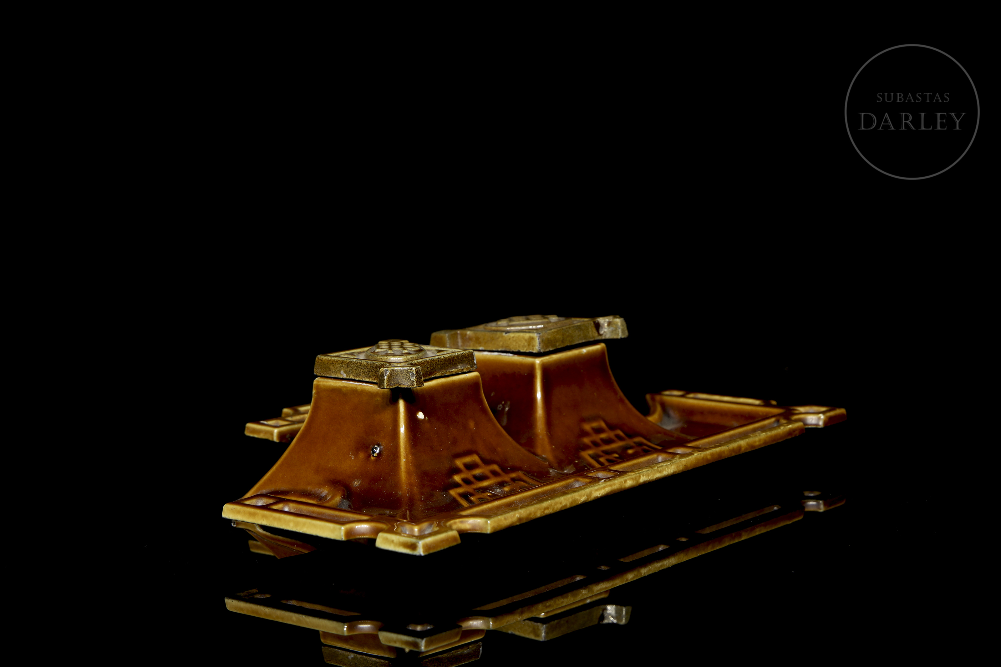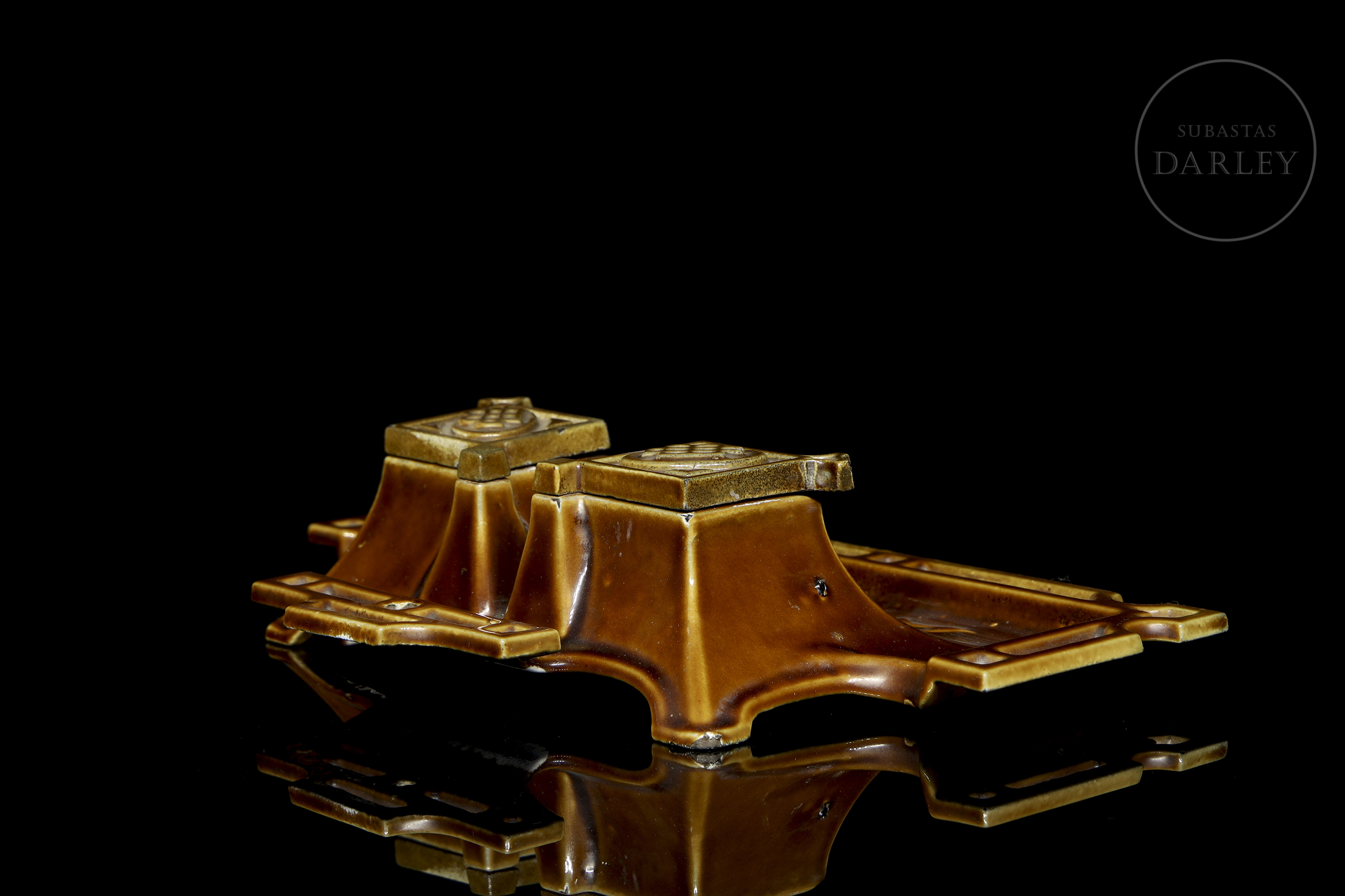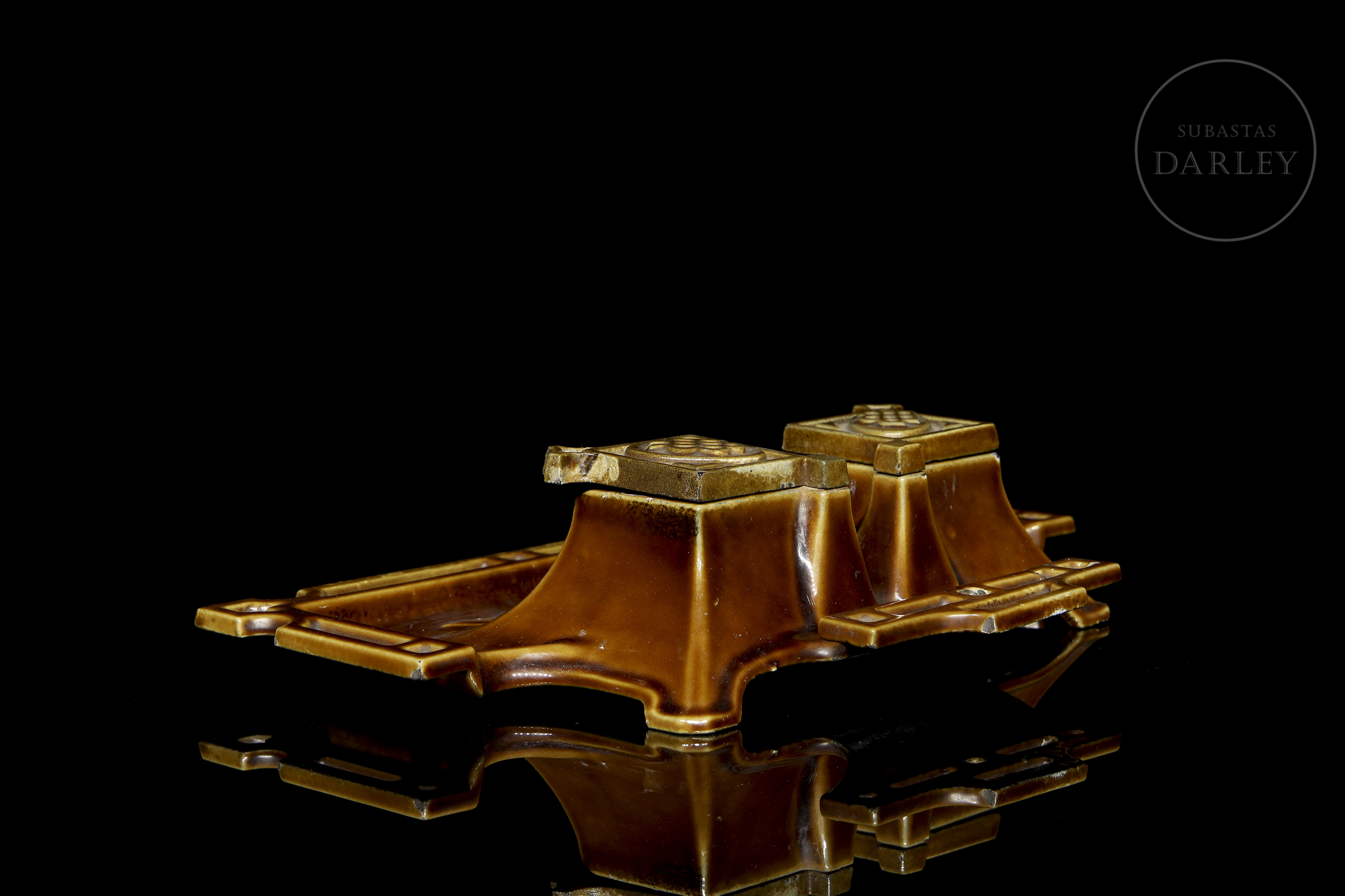 An antique brown-glazed porcelain double inkwell. The lids of the inkwells open horizontally, sliding to the sides. Decorative lettering on the base and lid. With glass ink cups. In good condition, with wear due to age.