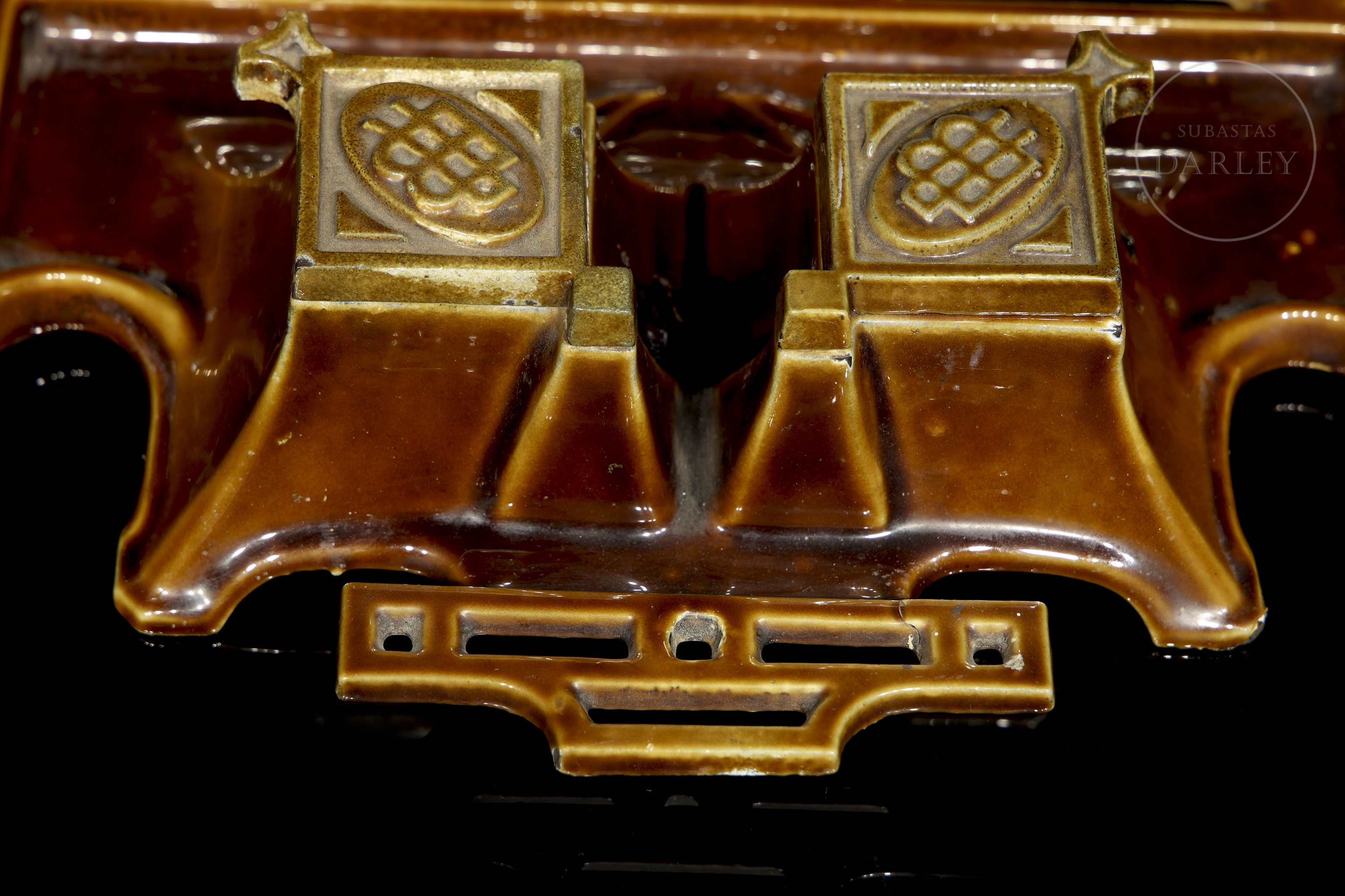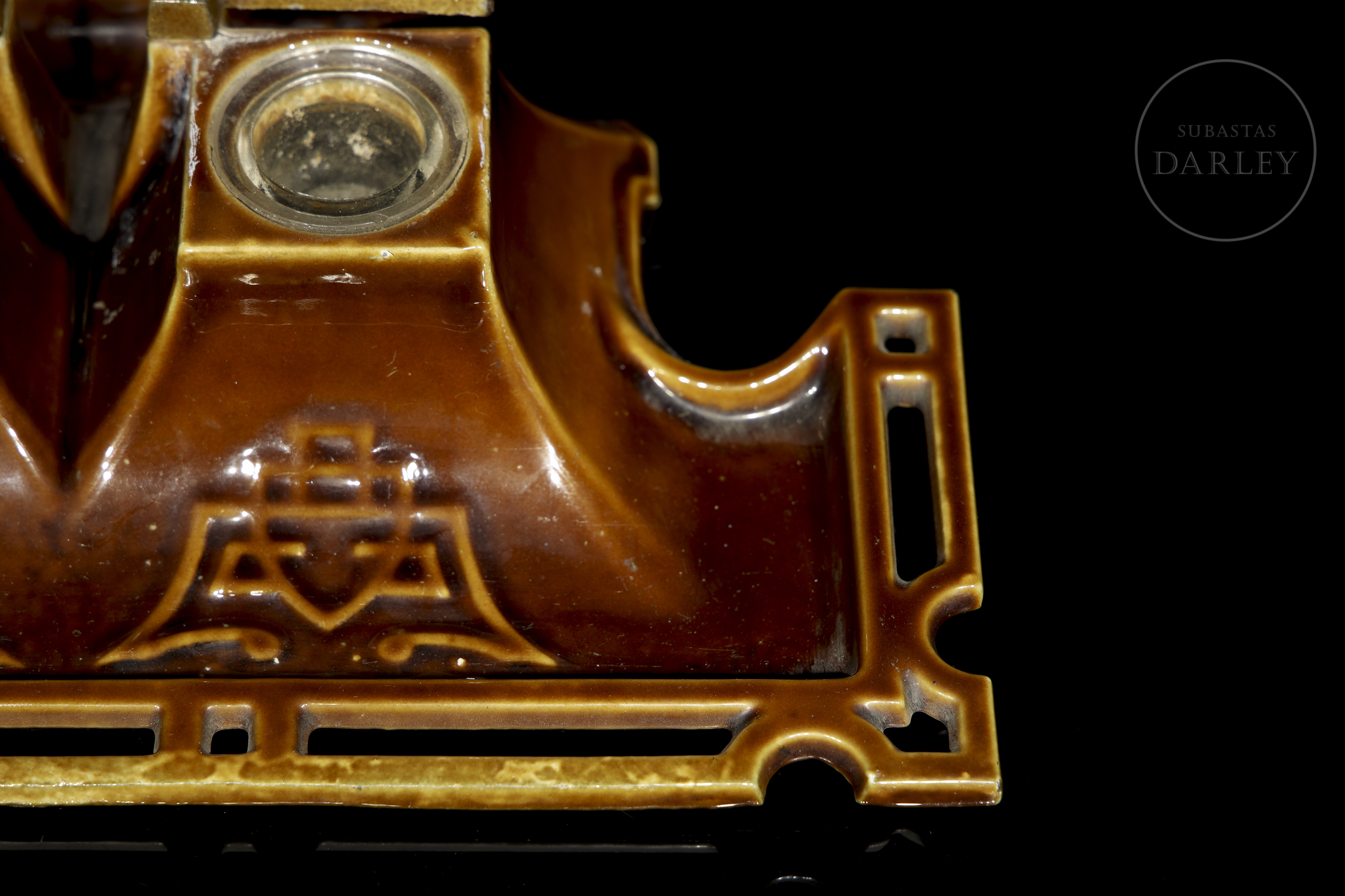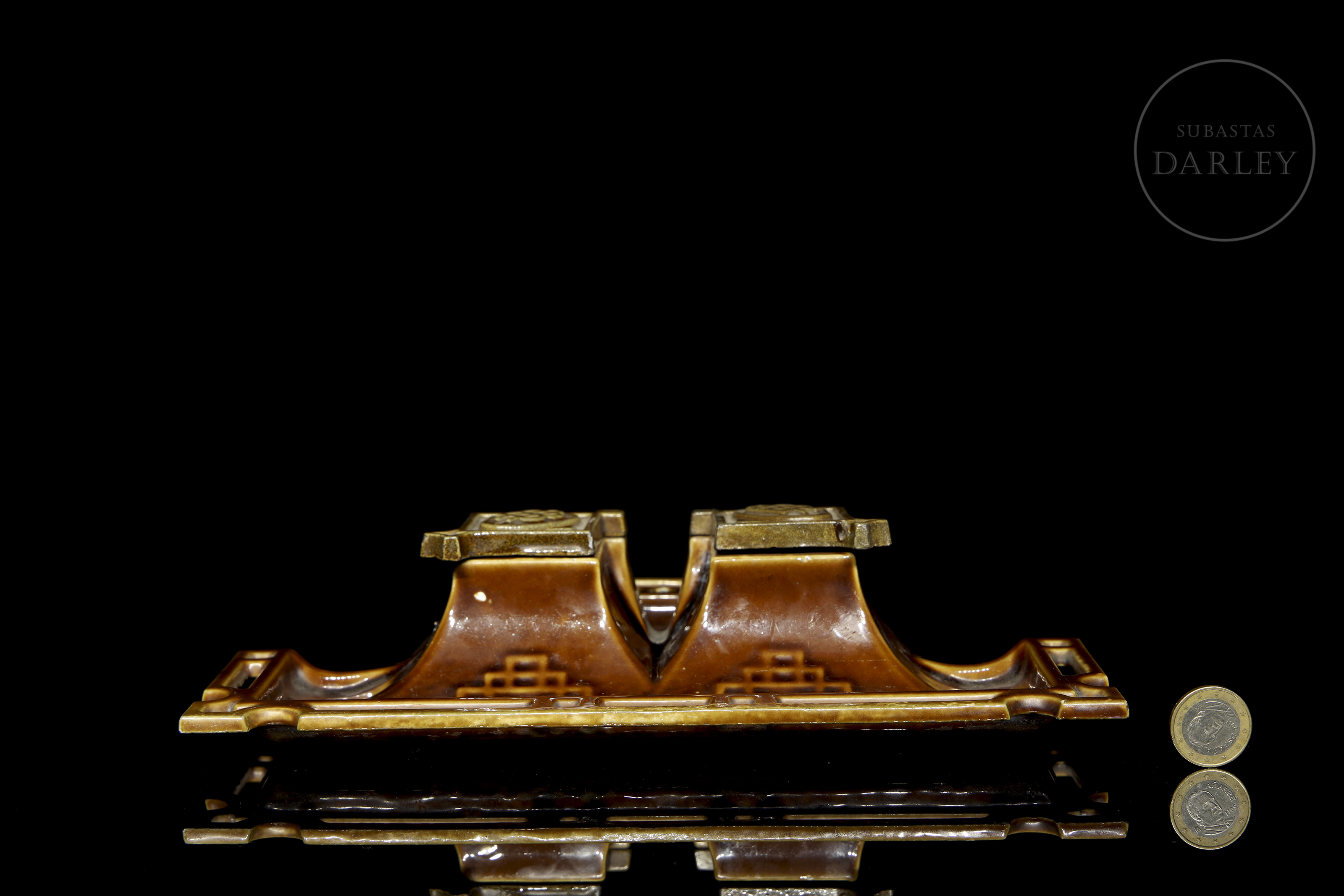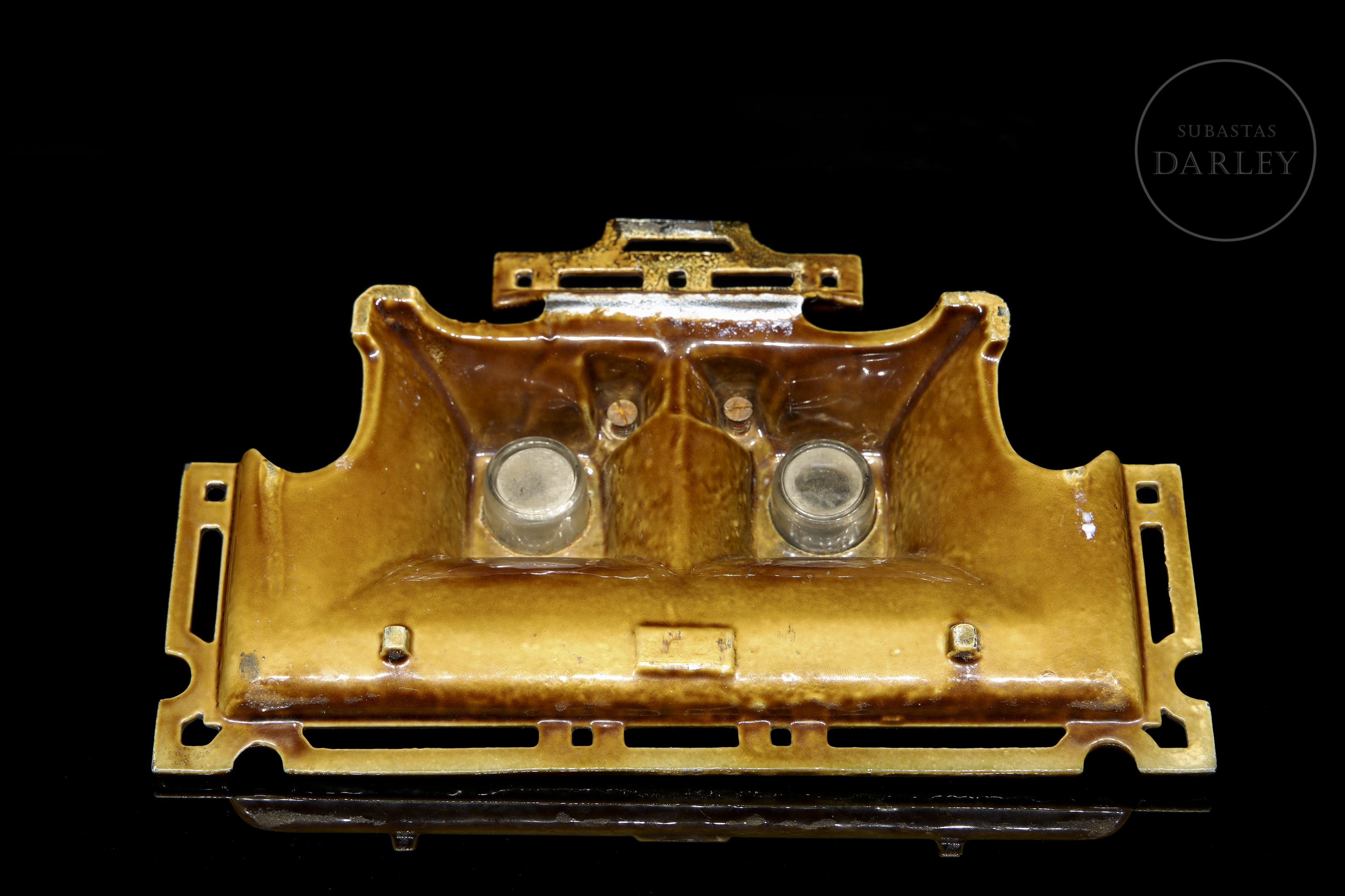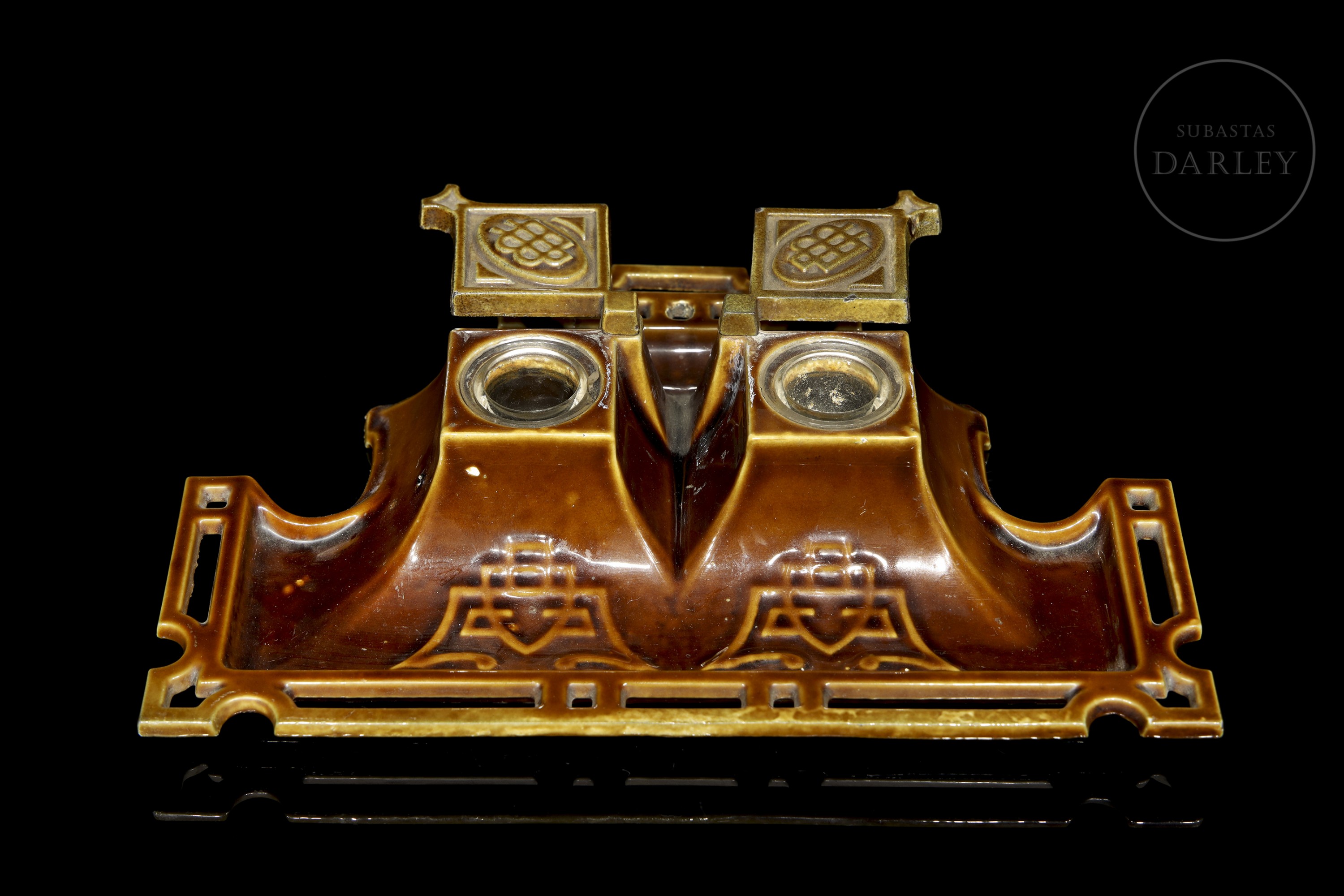 An antique brown-glazed porcelain double inkwell. The lids of the inkwells open horizontally, sliding to the sides. Decorative lettering on the base and lid. With glass ink cups. In good condition, with wear due to age.