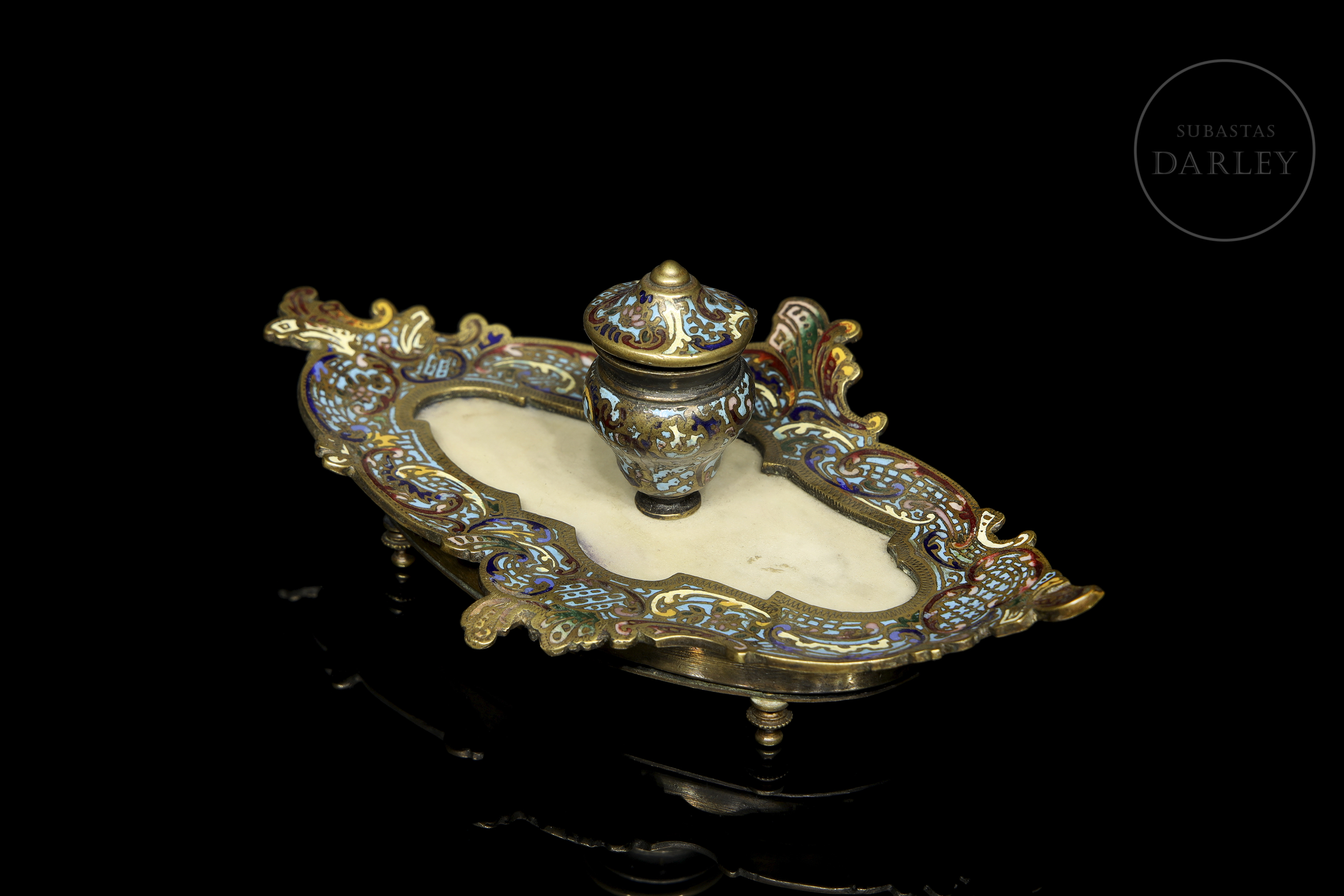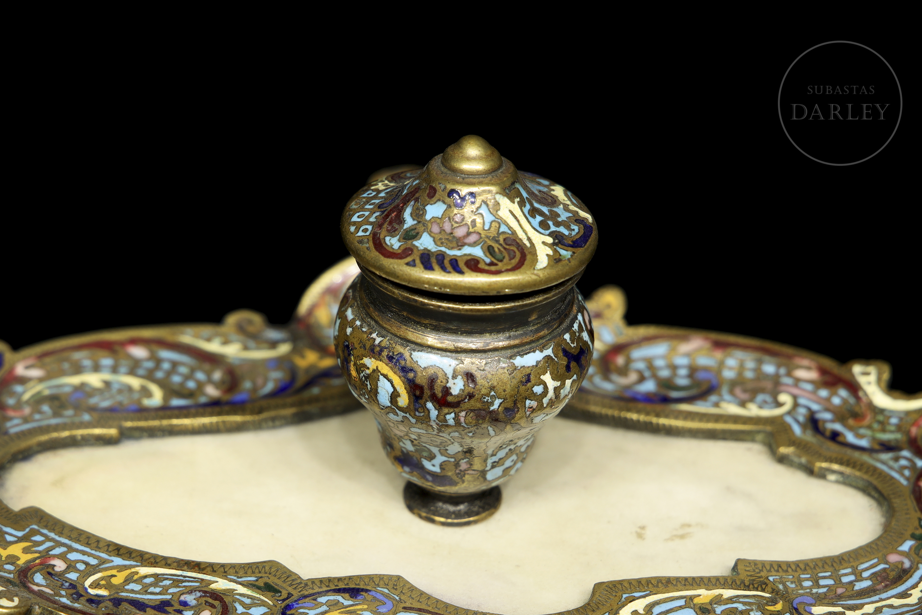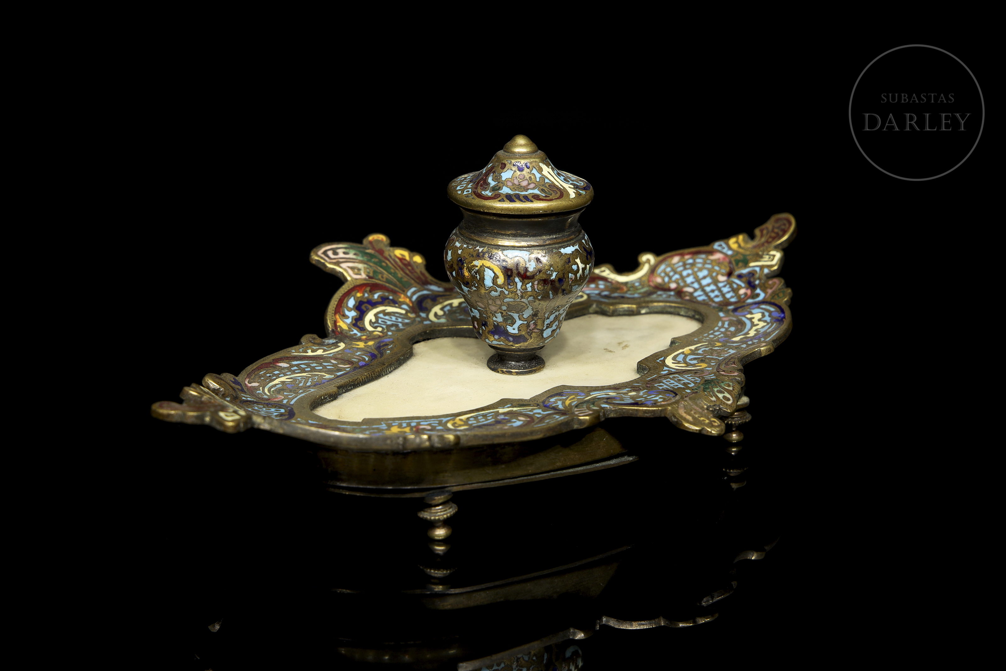 Small inkwell on a ceramic base. Decorated using the cloisonné technique with polychrome enamels and floral reliefs. It shows wear due to age and use.