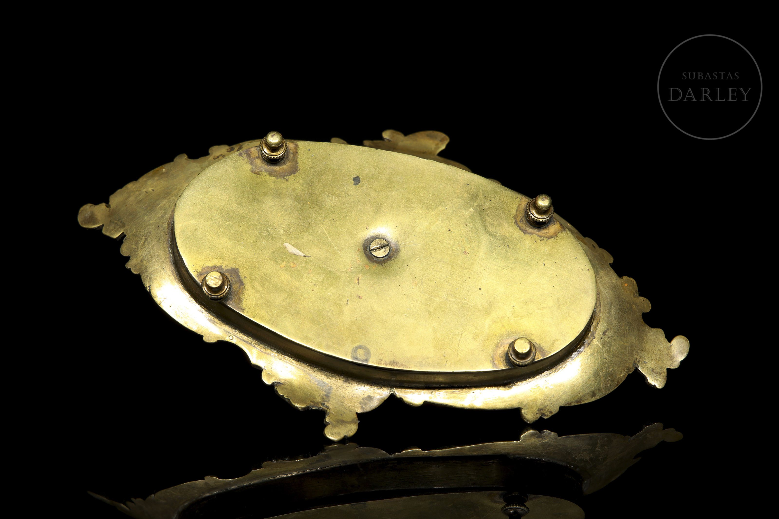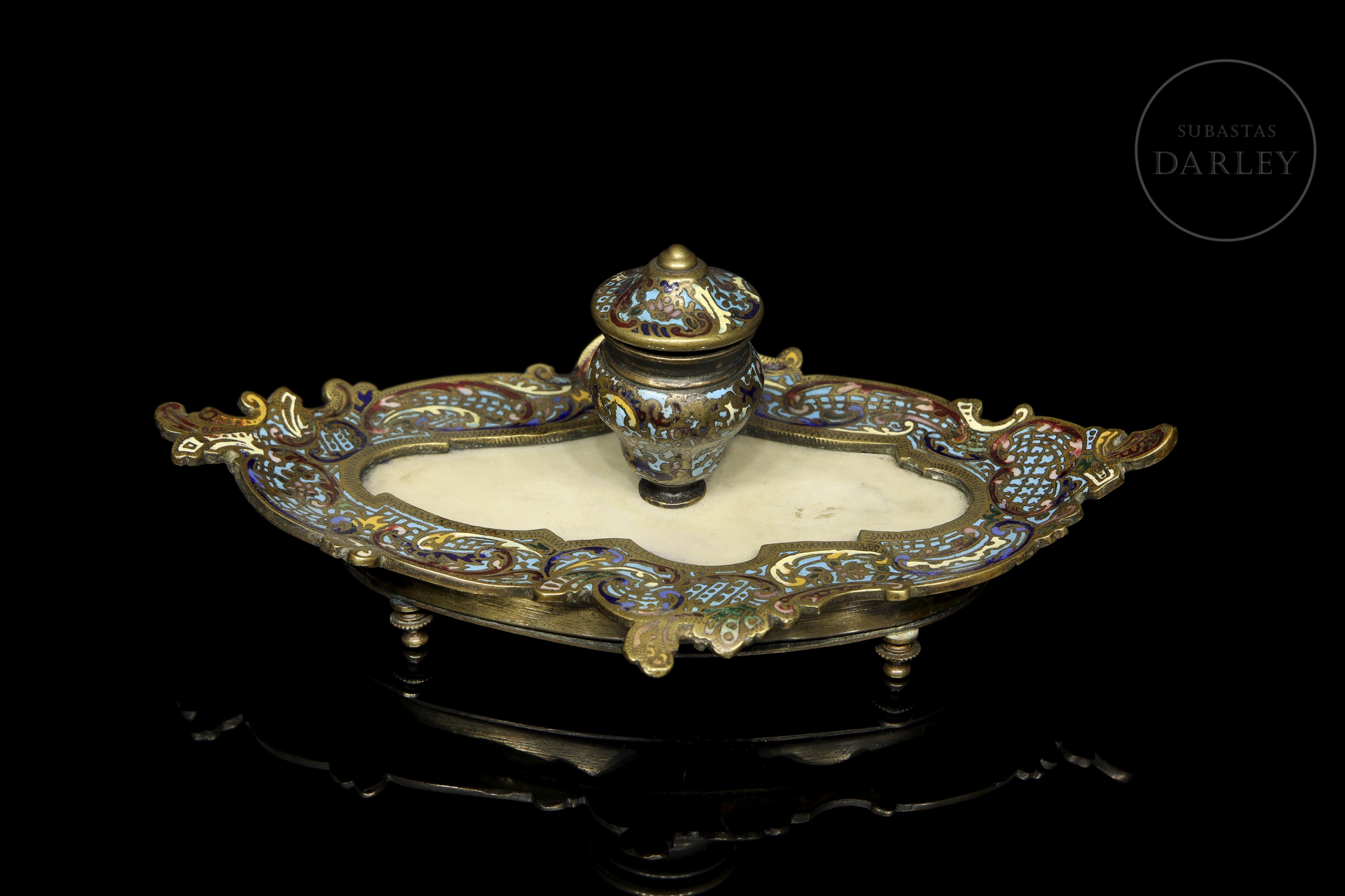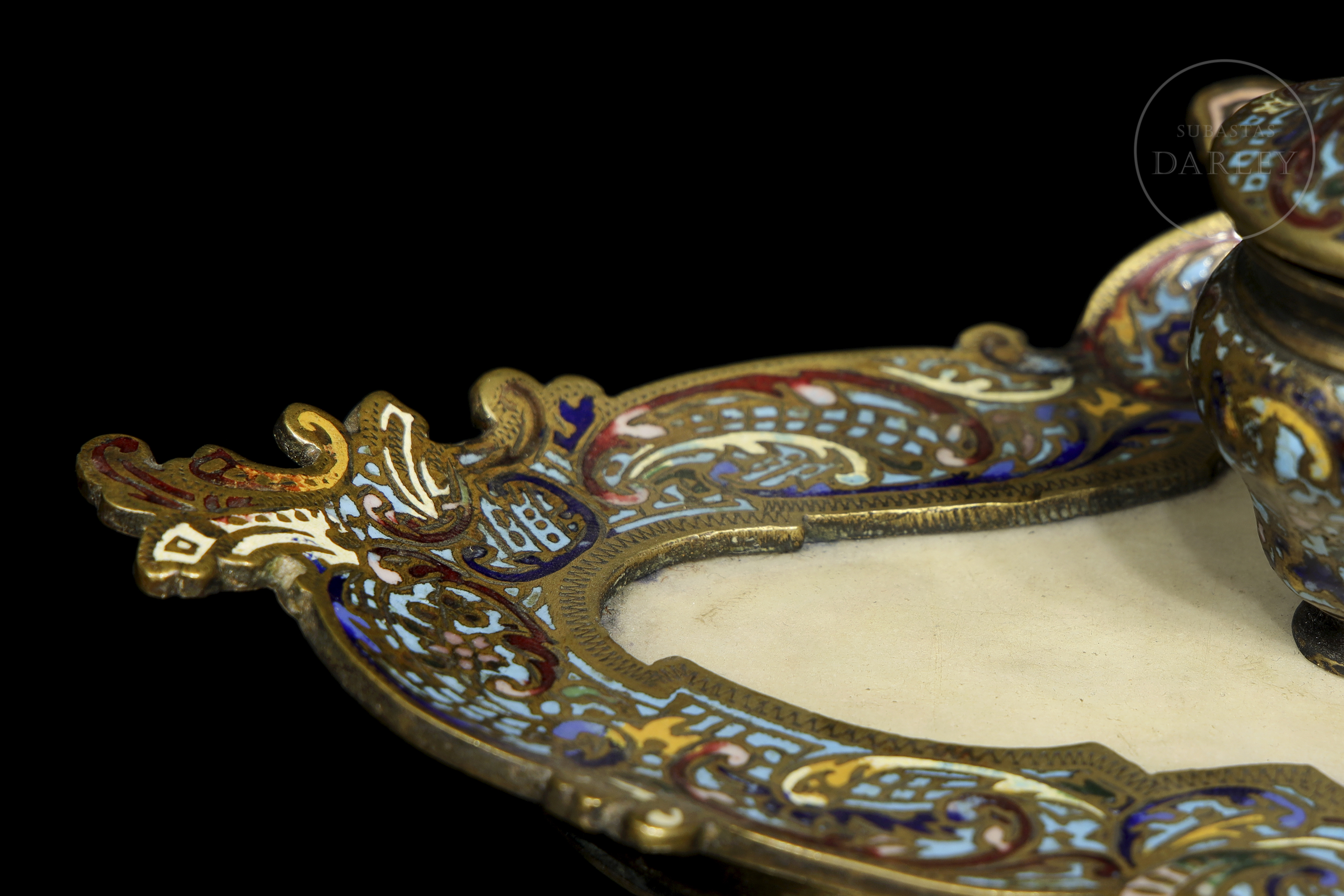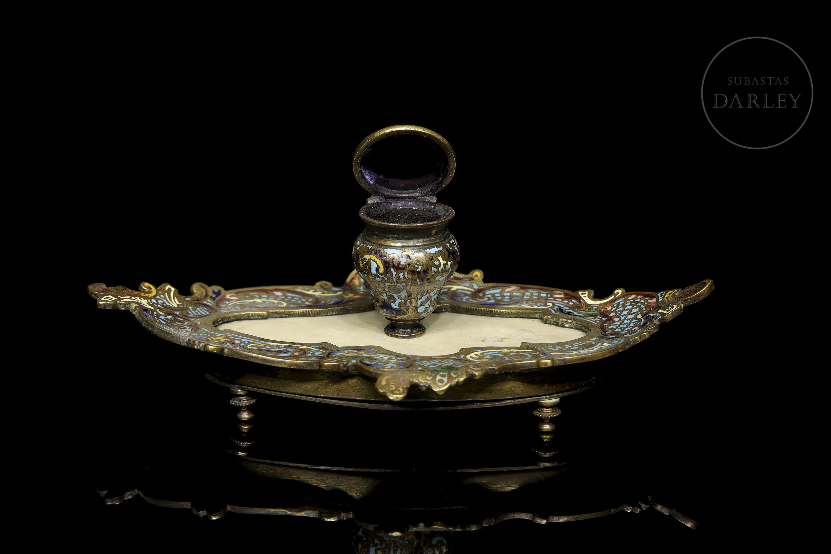 Small inkwell on a ceramic base. Decorated using the cloisonné technique with polychrome enamels and floral reliefs. It shows wear due to age and use.