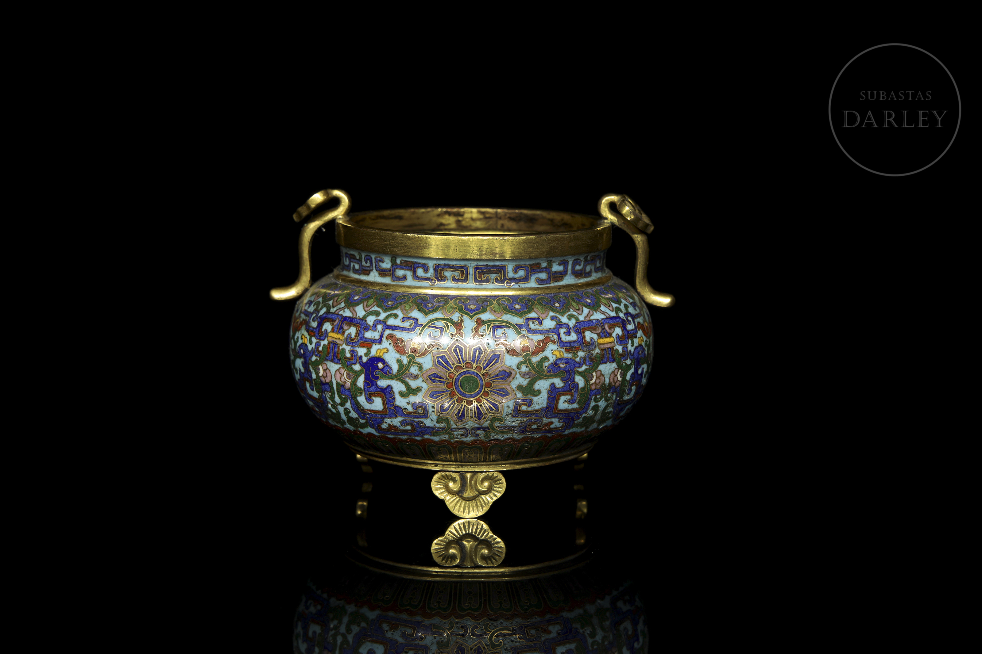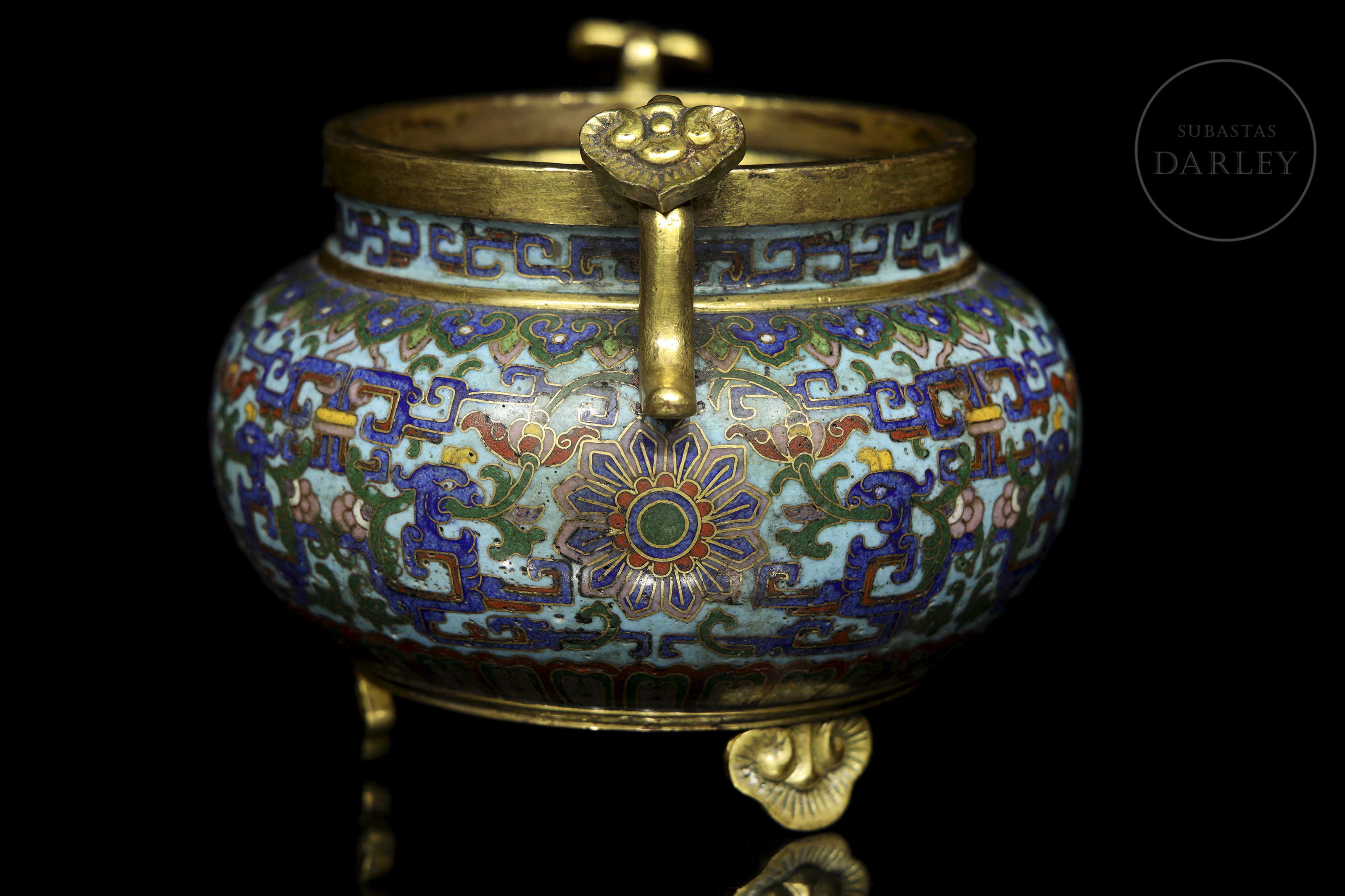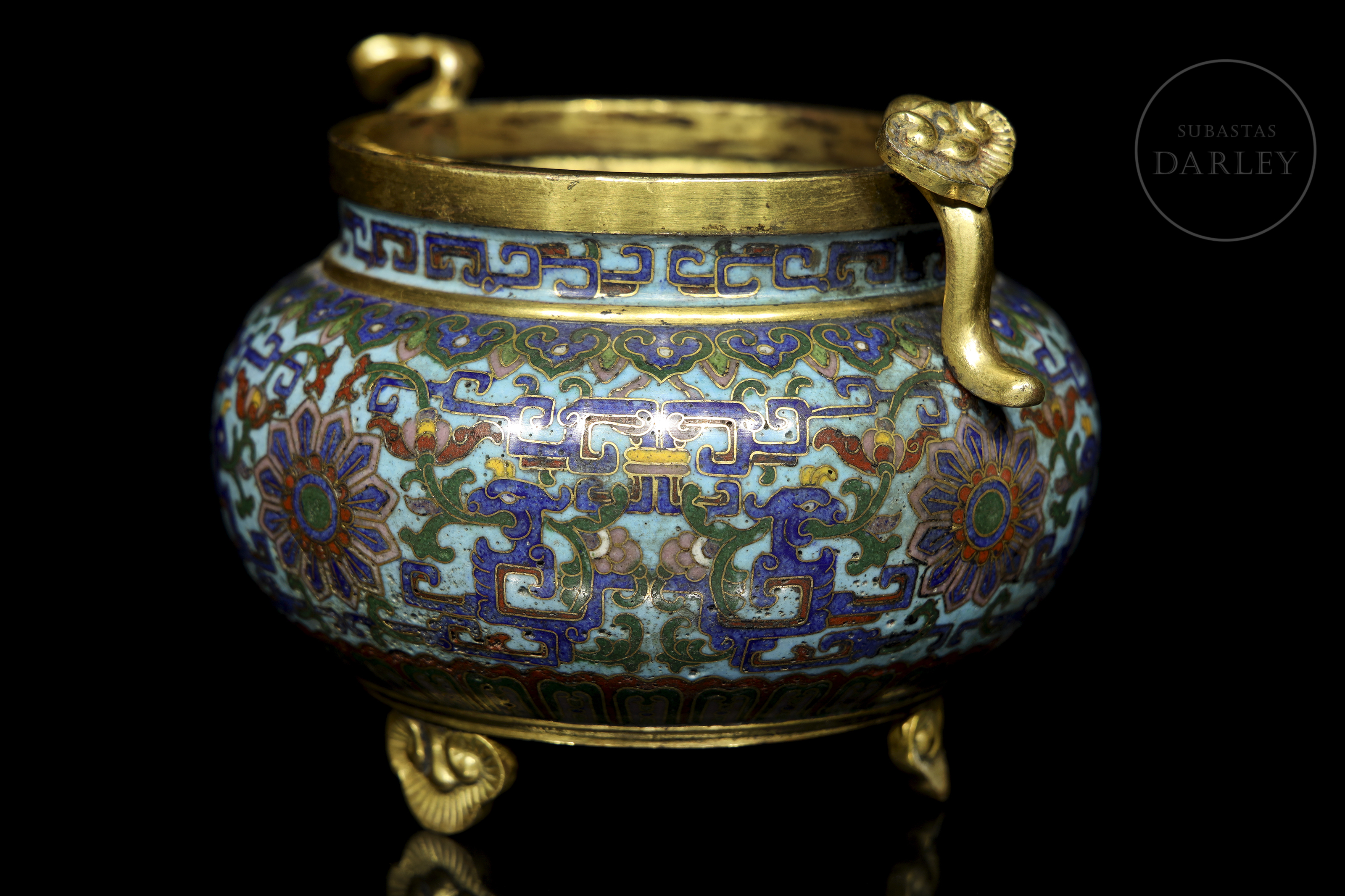 A gilded bronze censer decorated with cloisonné enamel. It has a flat, globular body set on three small ruyi-shaped feet, above which stands a short neck and circular mouth, adorned with two beautiful handles in the form of a flattened and curved ruyi sceptre that connect the mouth and body.