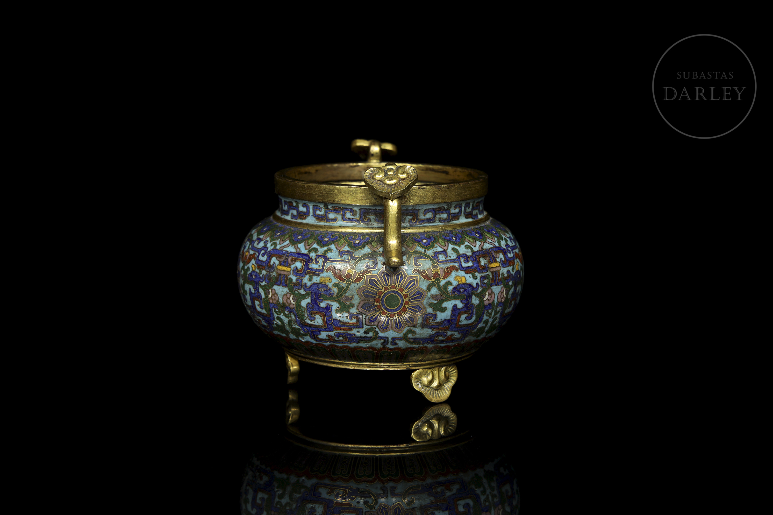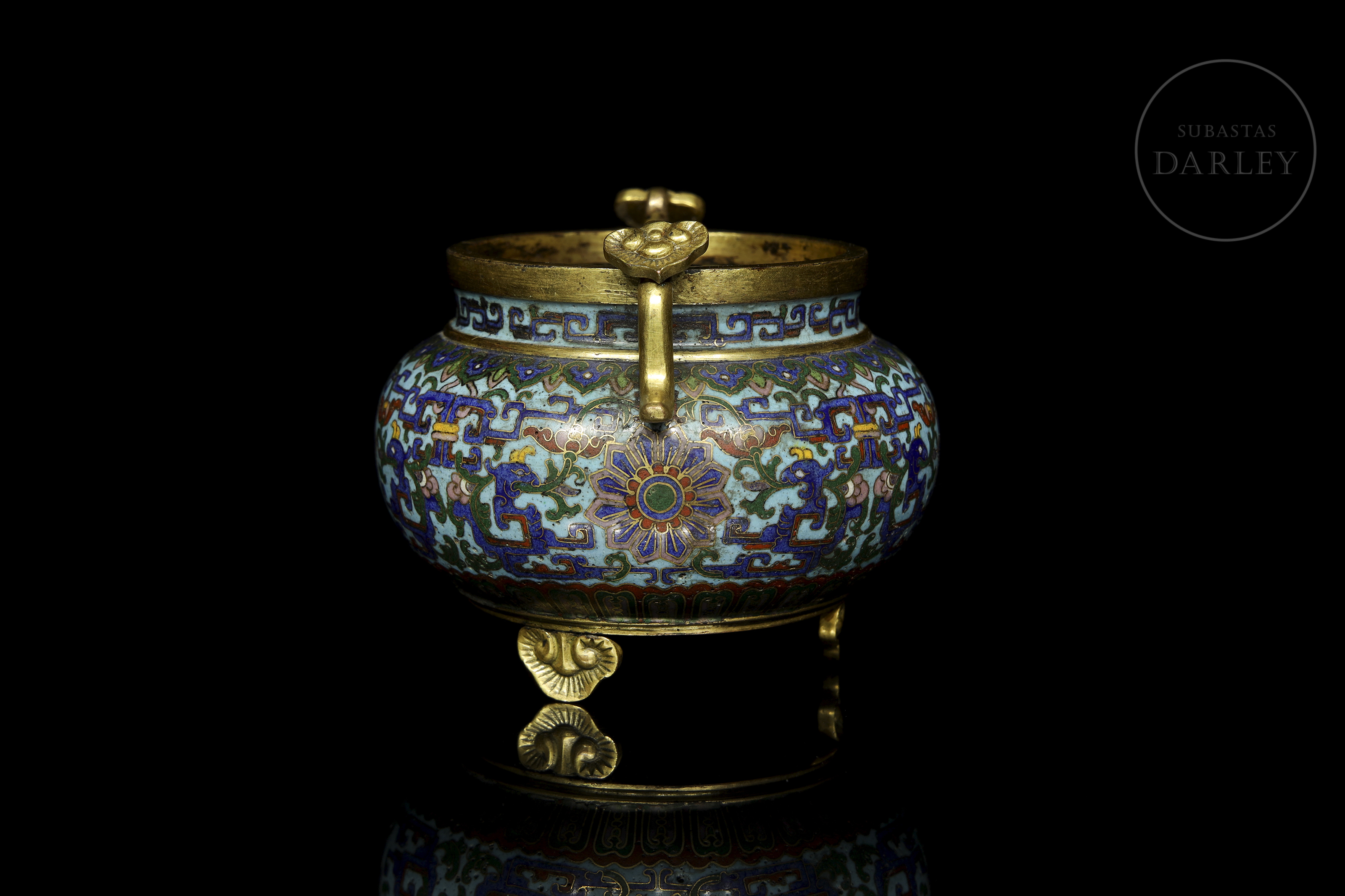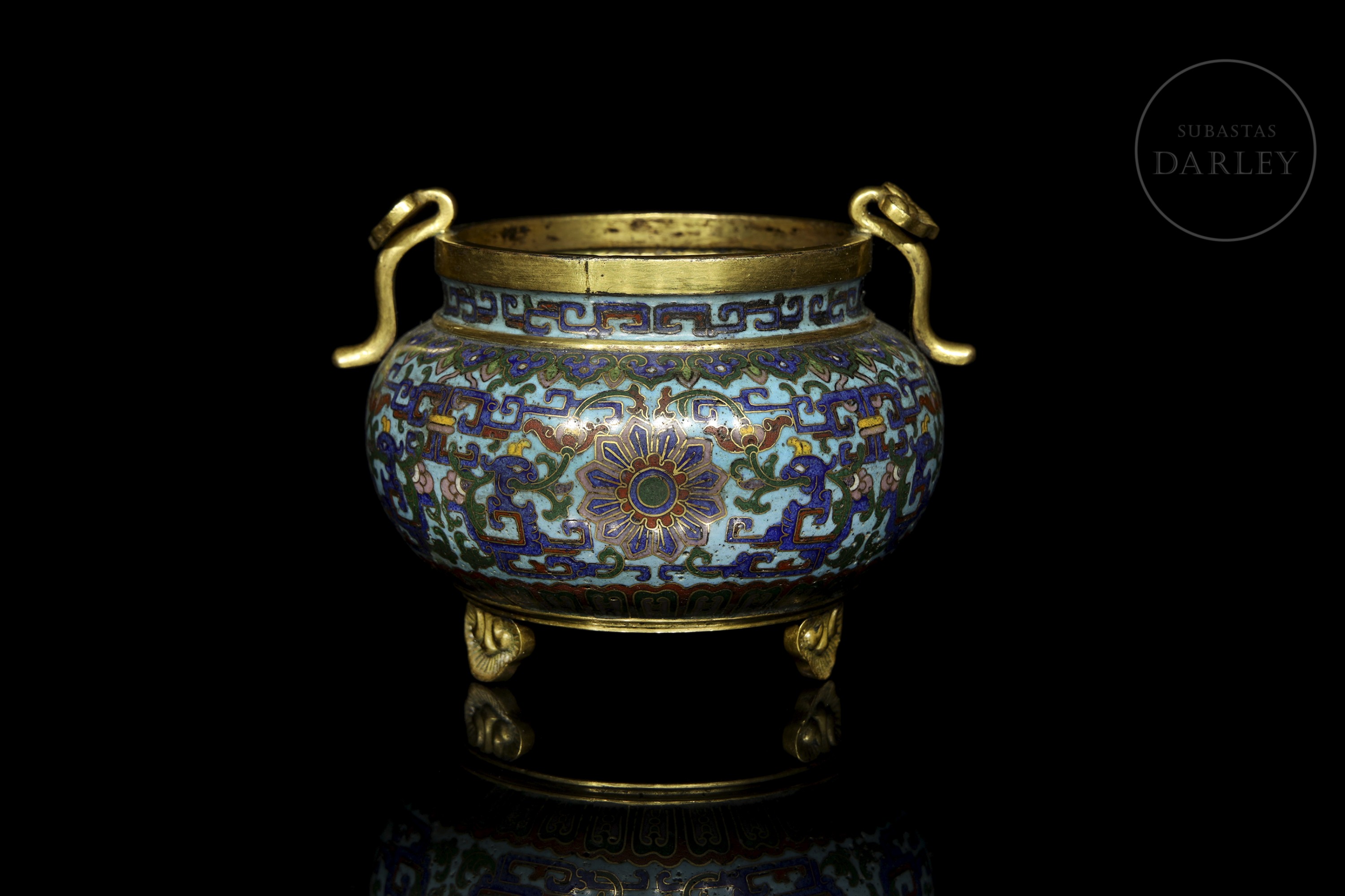 A gilded bronze censer decorated with cloisonné enamel. It has a flat, globular body set on three small ruyi-shaped feet, above which stands a short neck and circular mouth, adorned with two beautiful handles in the form of a flattened and curved ruyi sceptre that connect the mouth and body.
