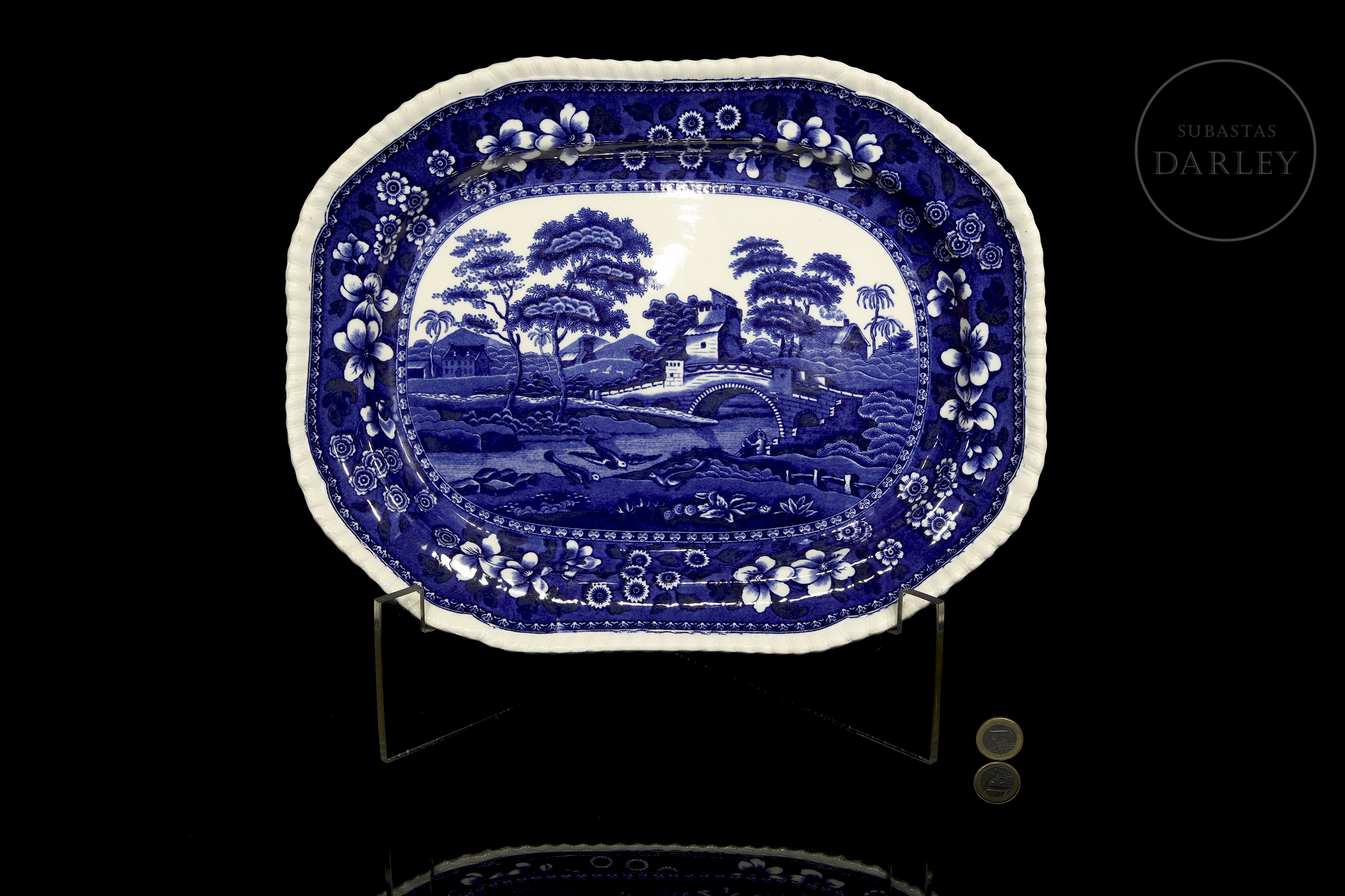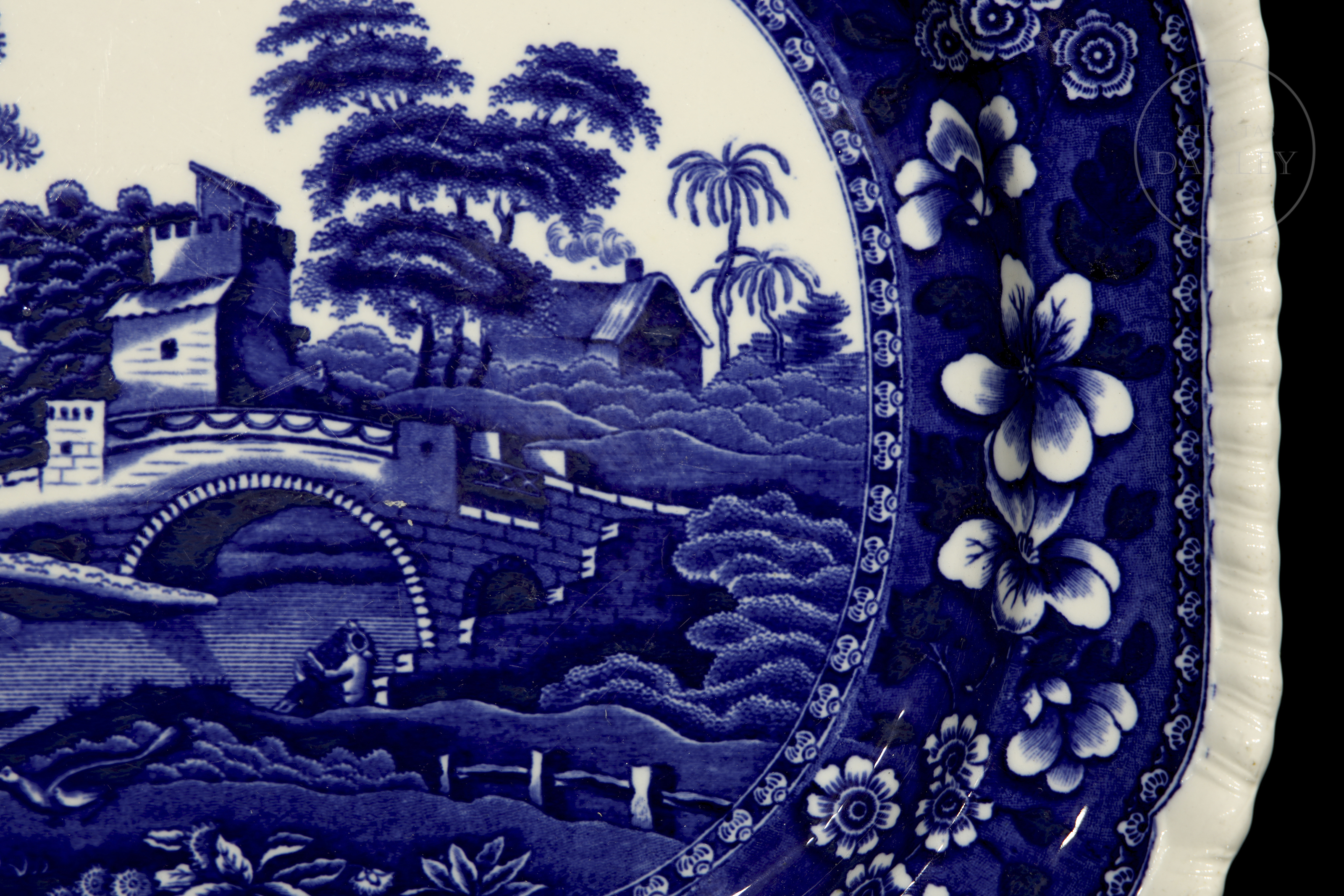 The tray shown is an oval plate or tray with a scalloped edge (known as a gadroon edge) from Copeland Spode's popular ‘Tower’ pattern. This iconic blue and white design, depicting the Salaro Bridge near Rome, was introduced by Spode around 1814.