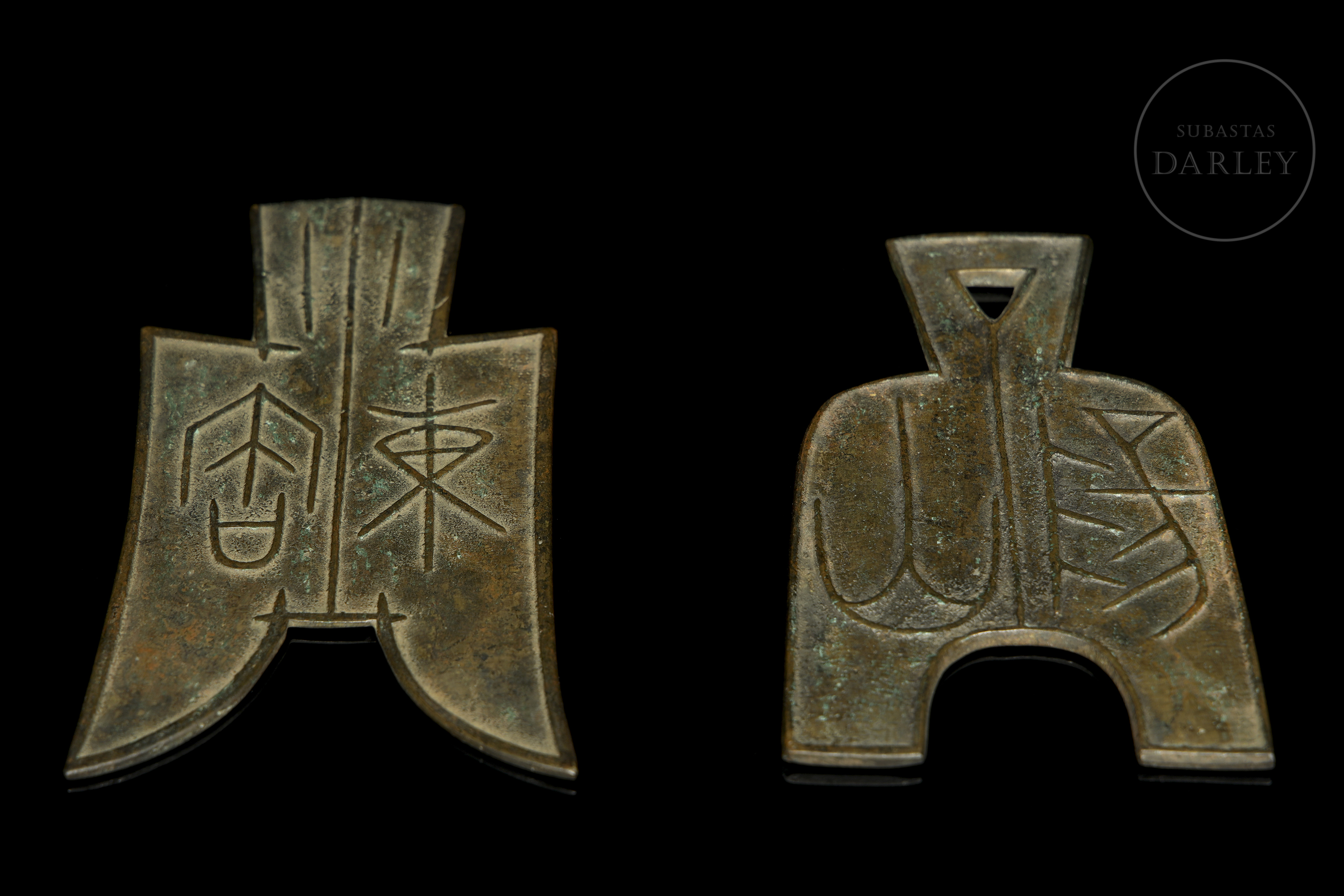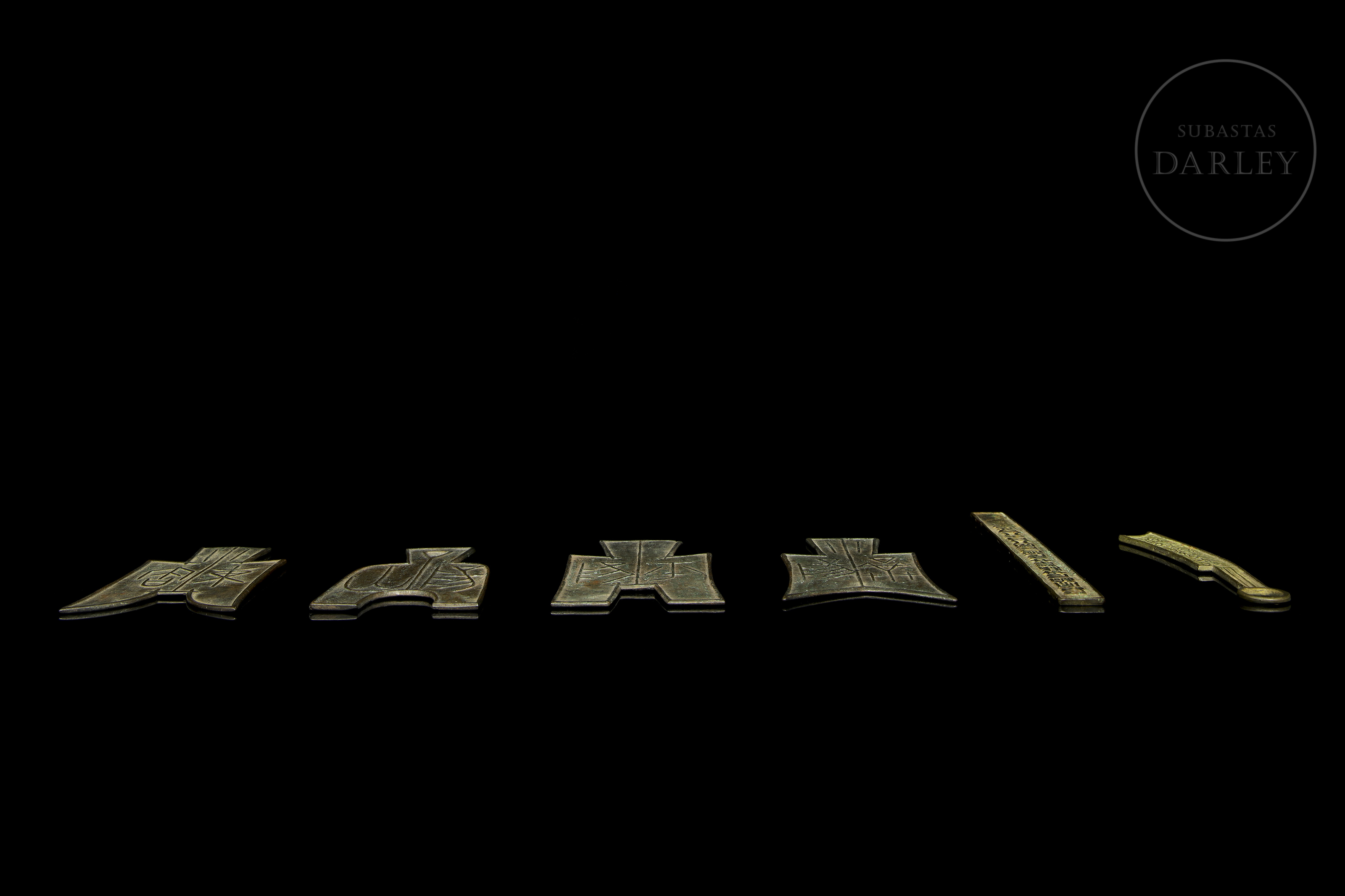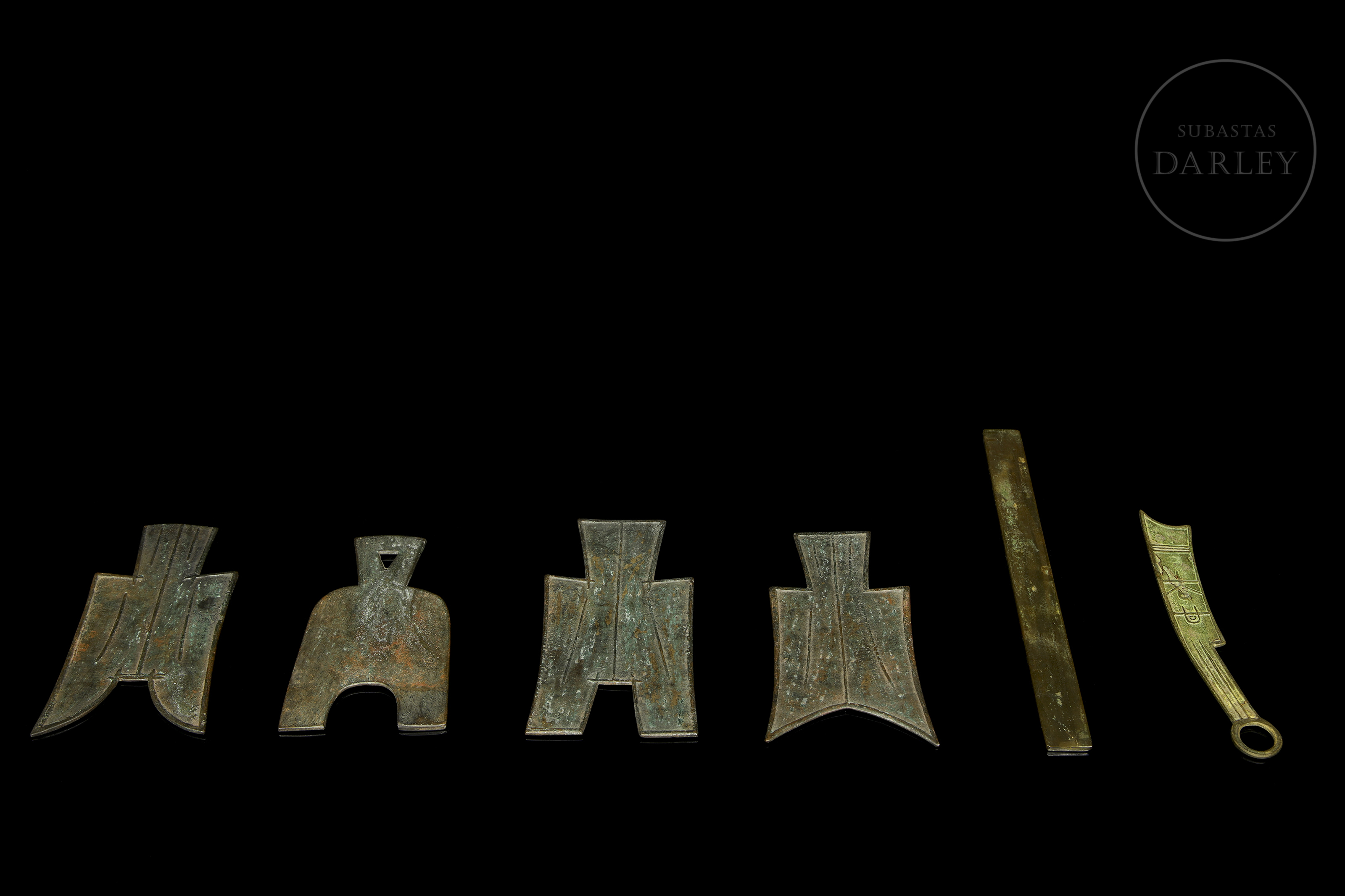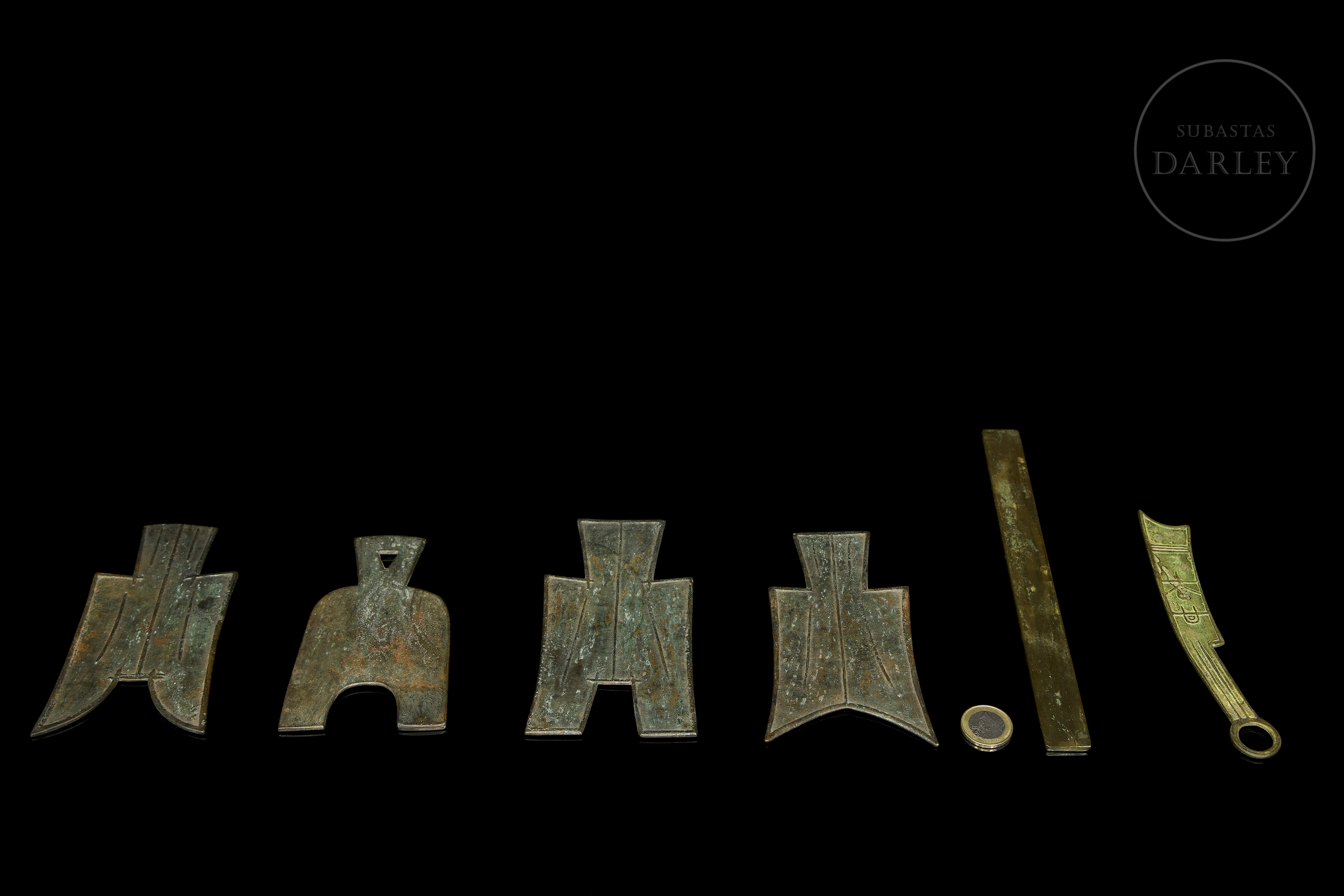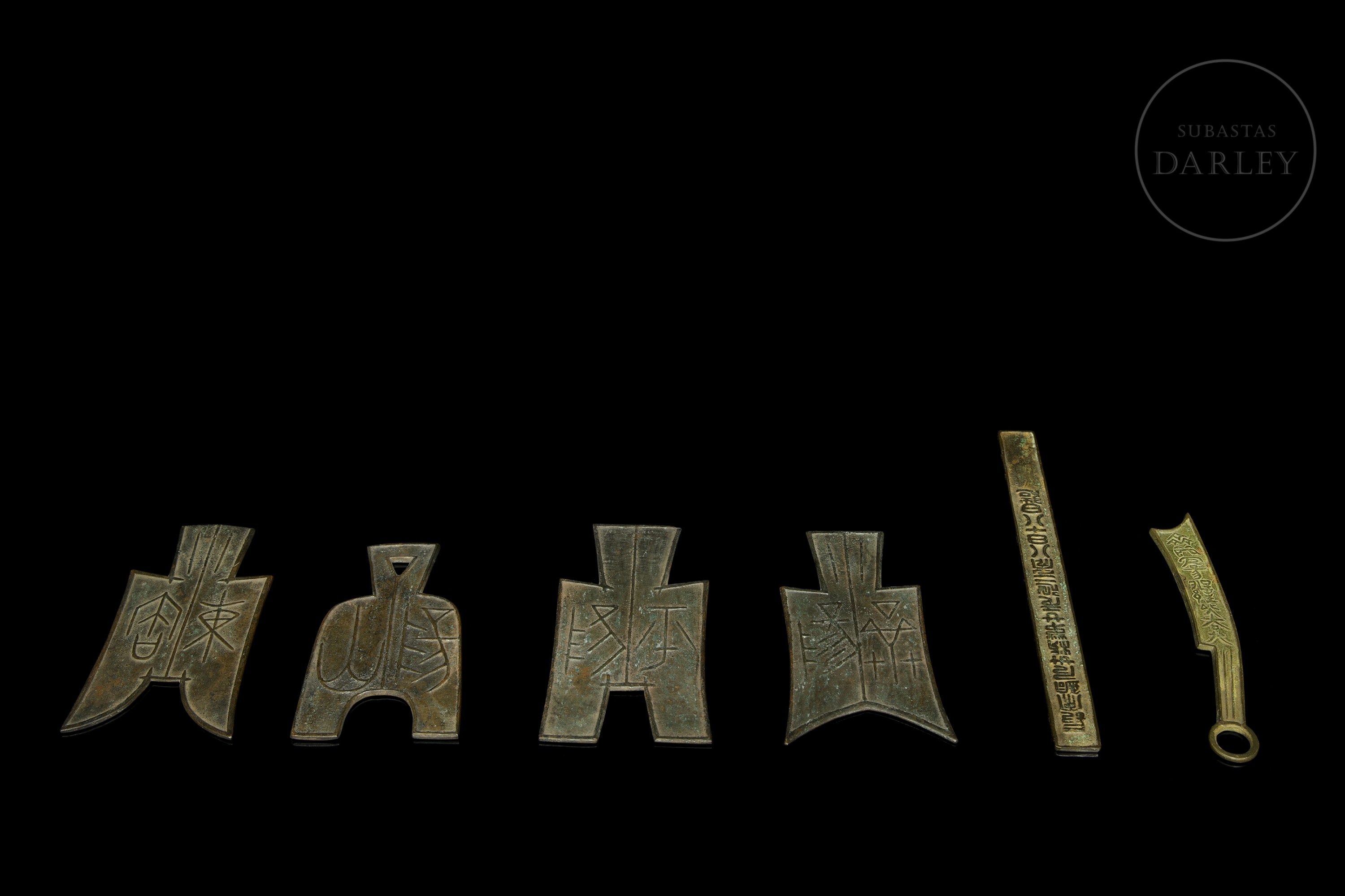 Set of six large Chinese metal “hoe” and “sword” style coins of different period, decorated with raised characters.