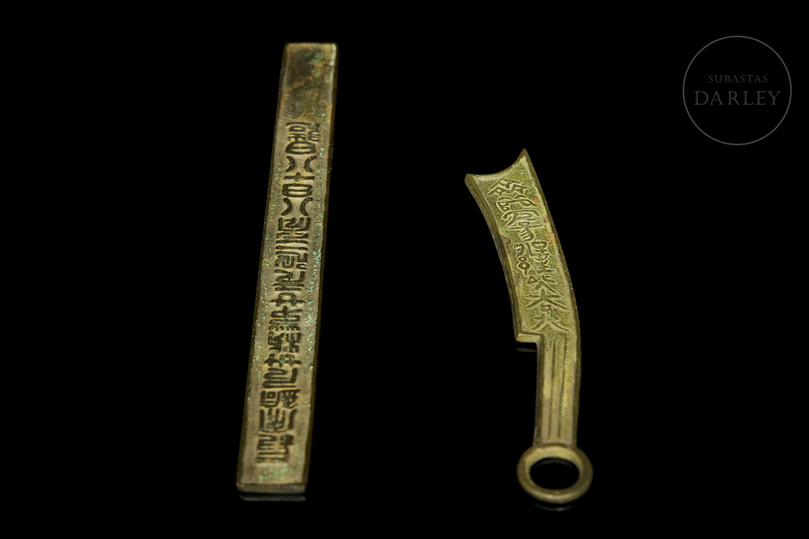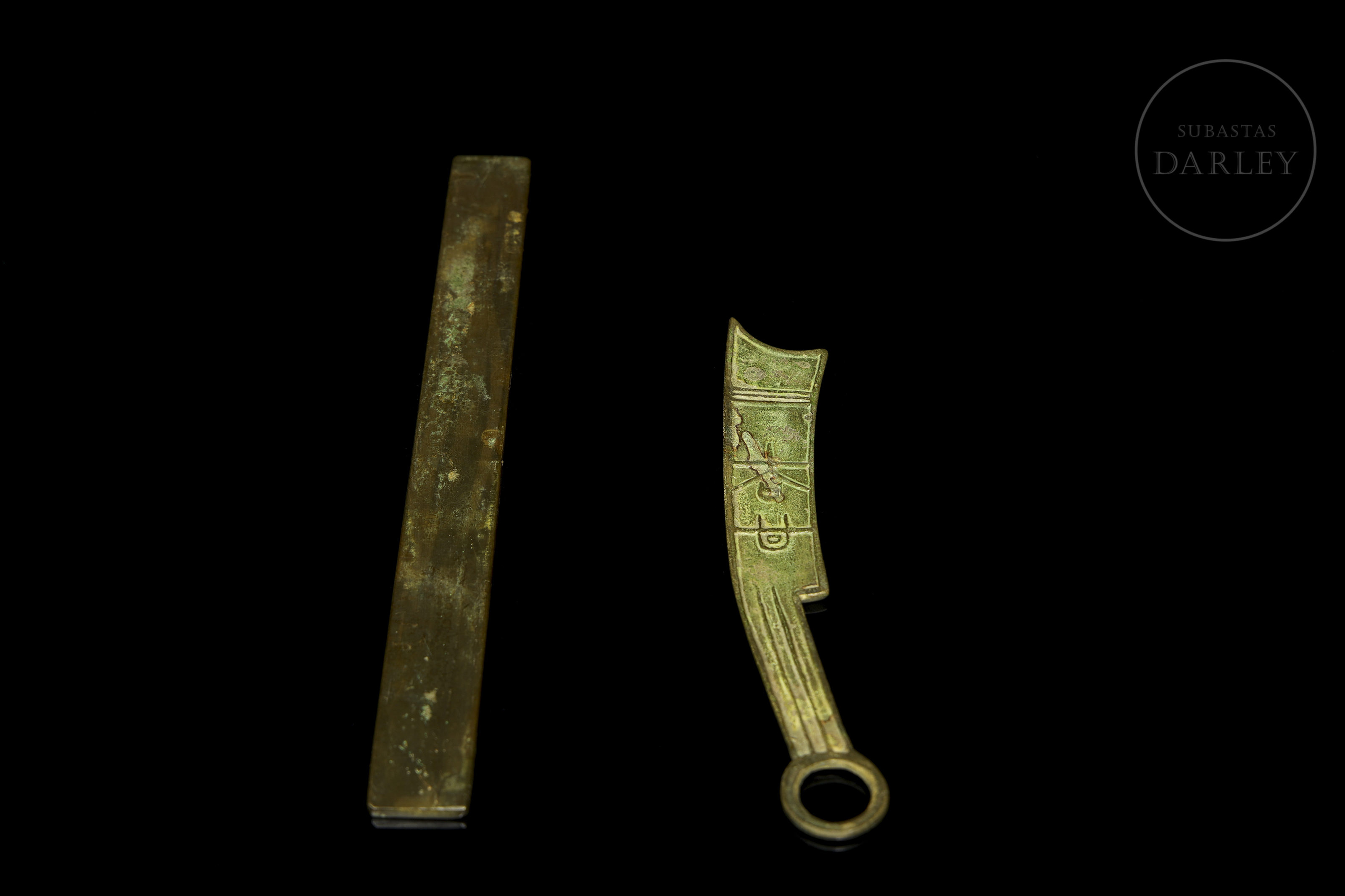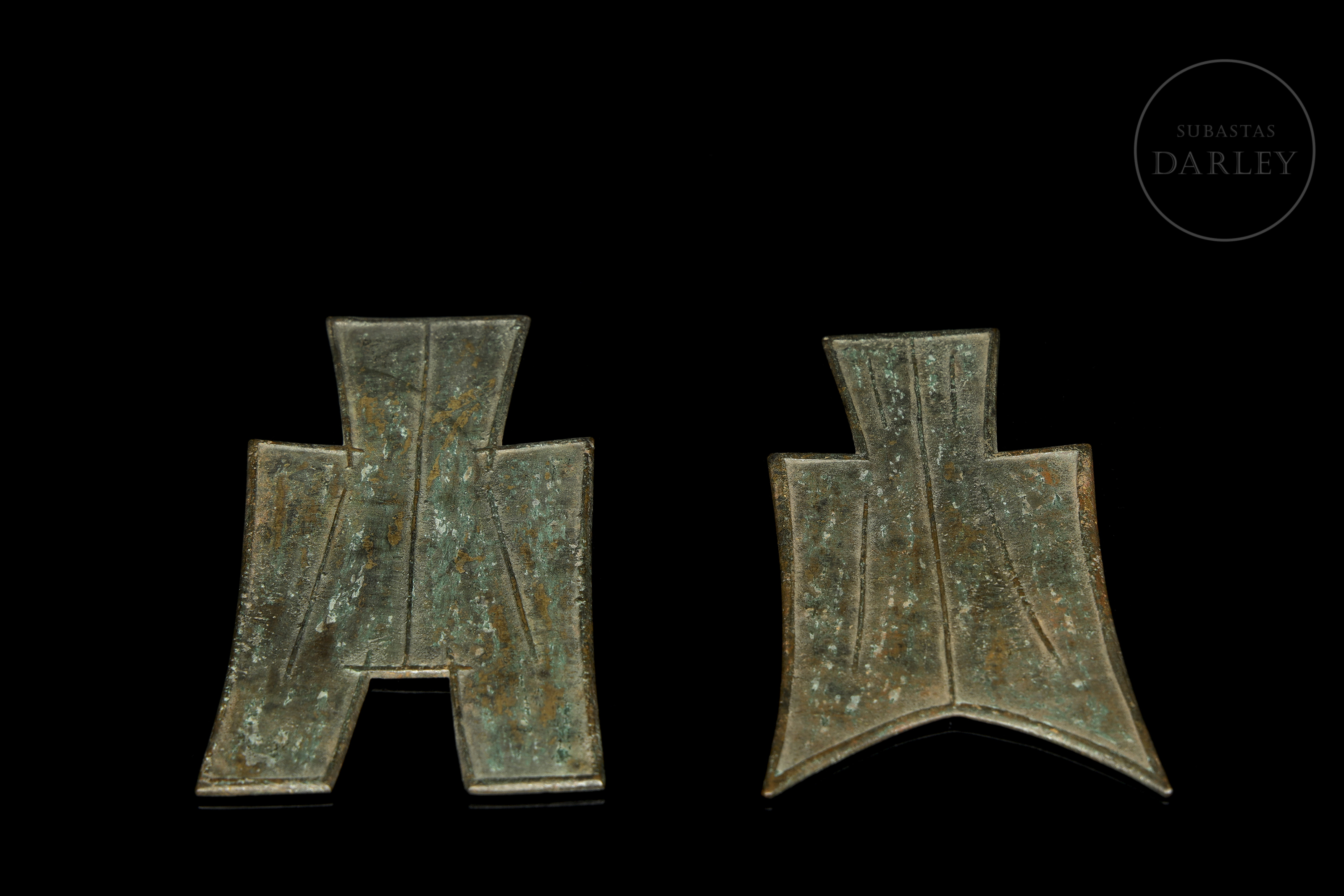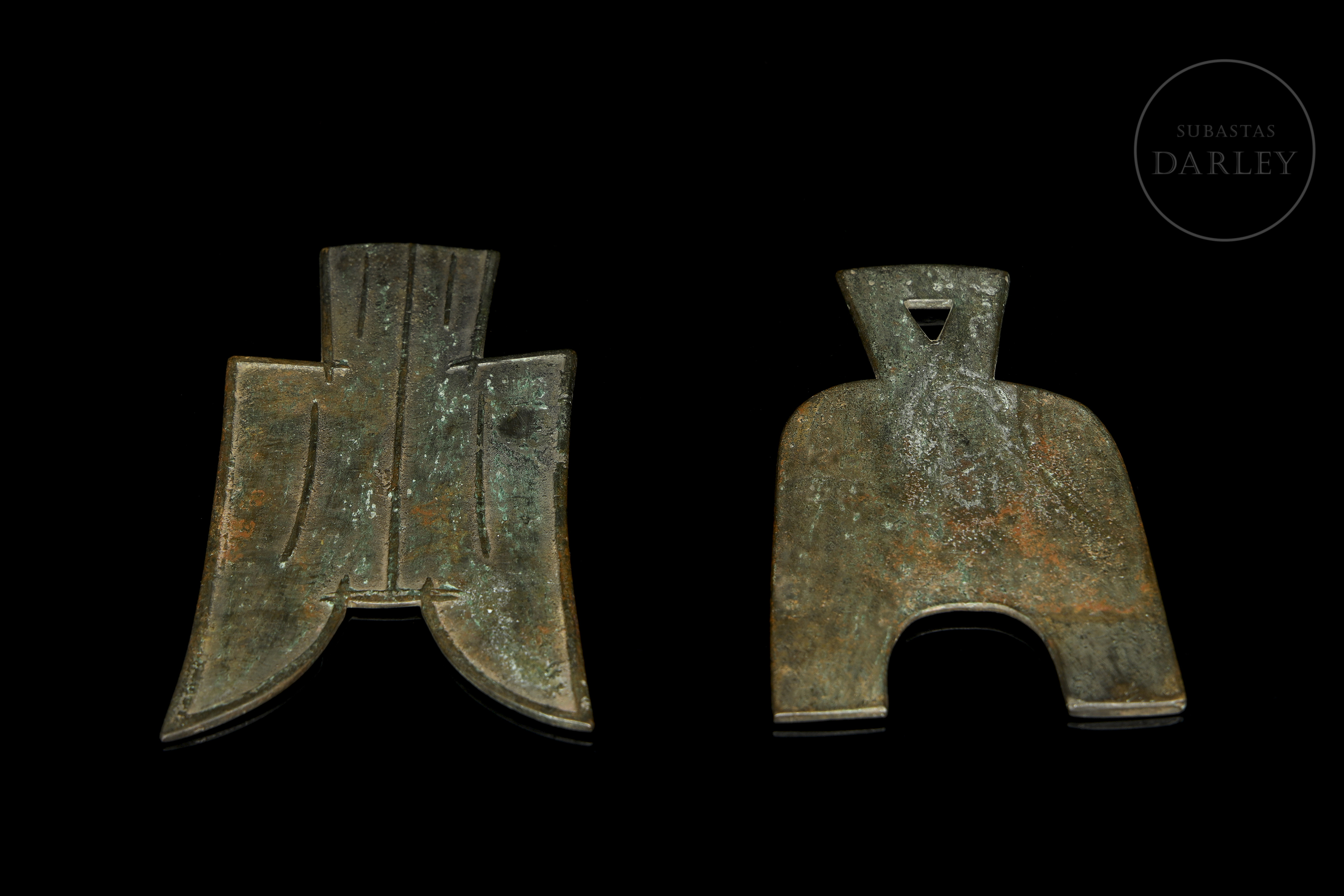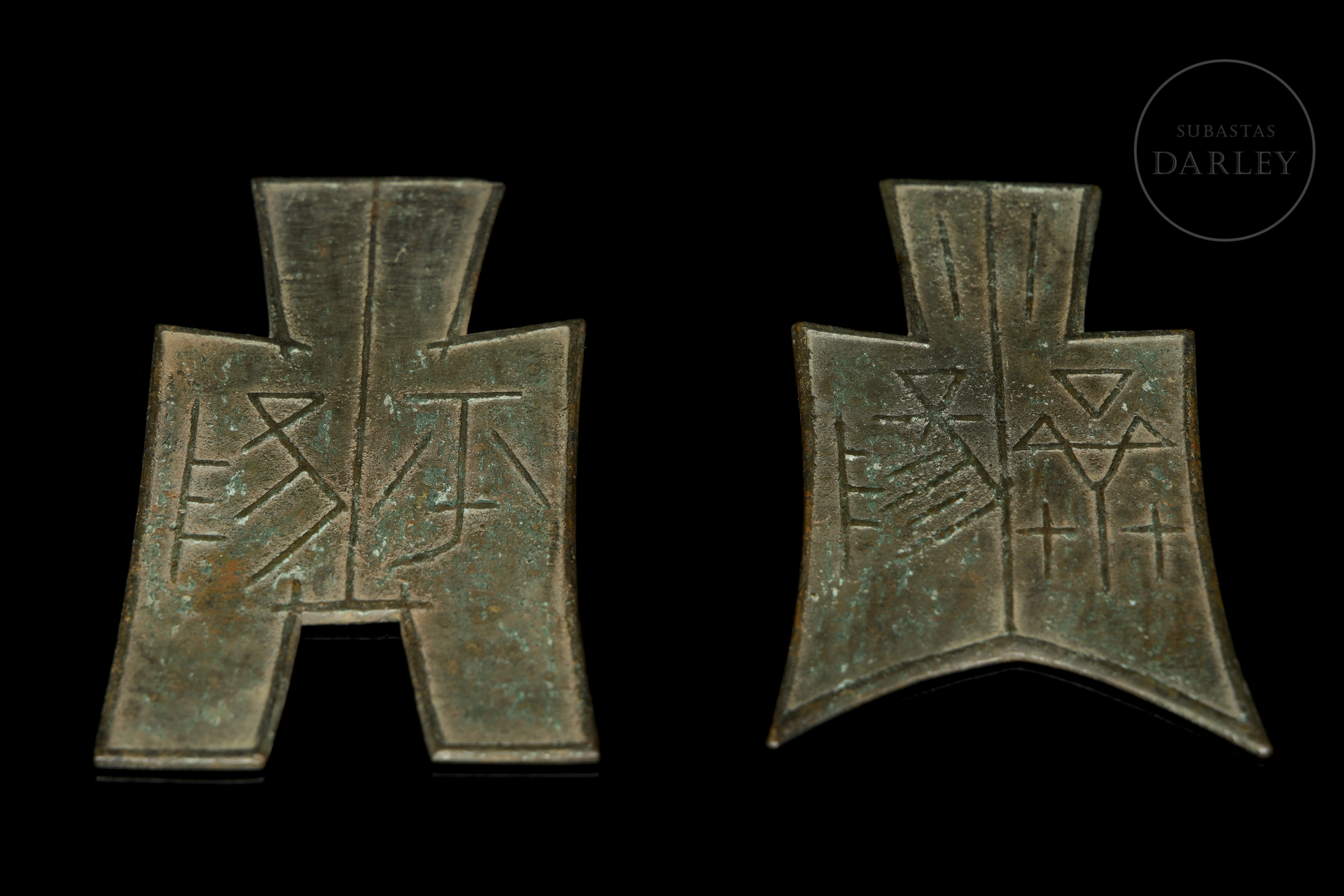 Set of six large Chinese metal “hoe” and “sword” style coins of different period, decorated with raised characters.