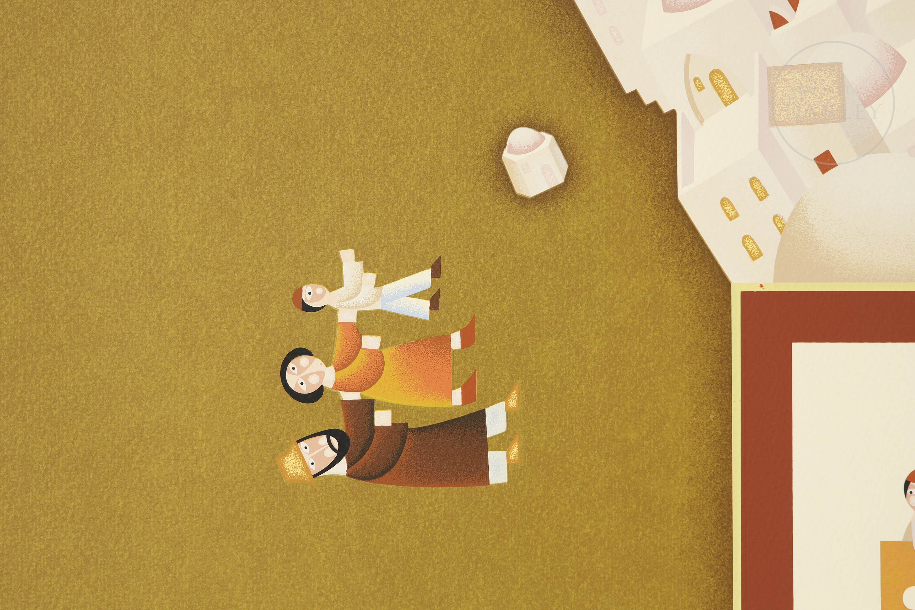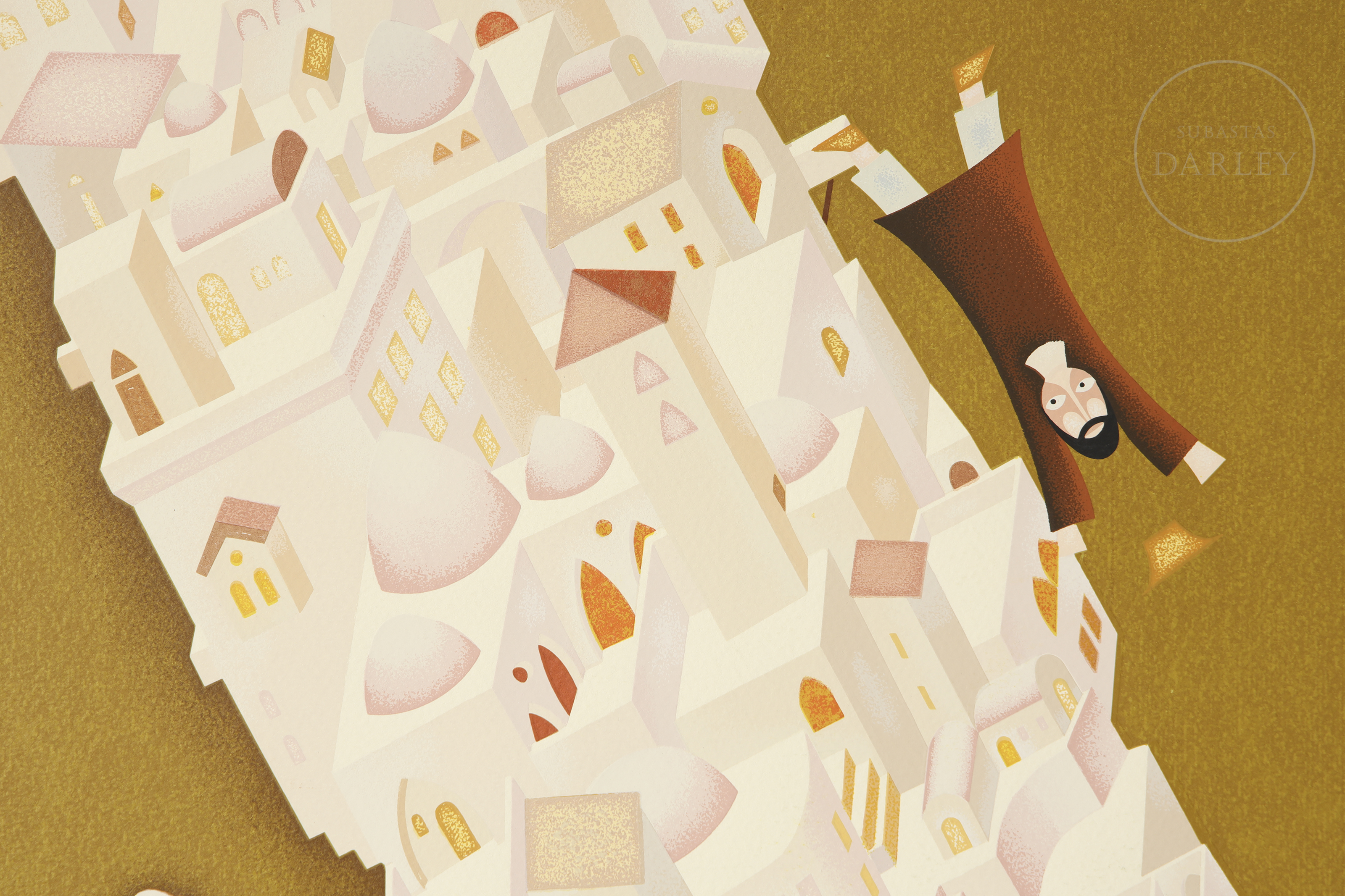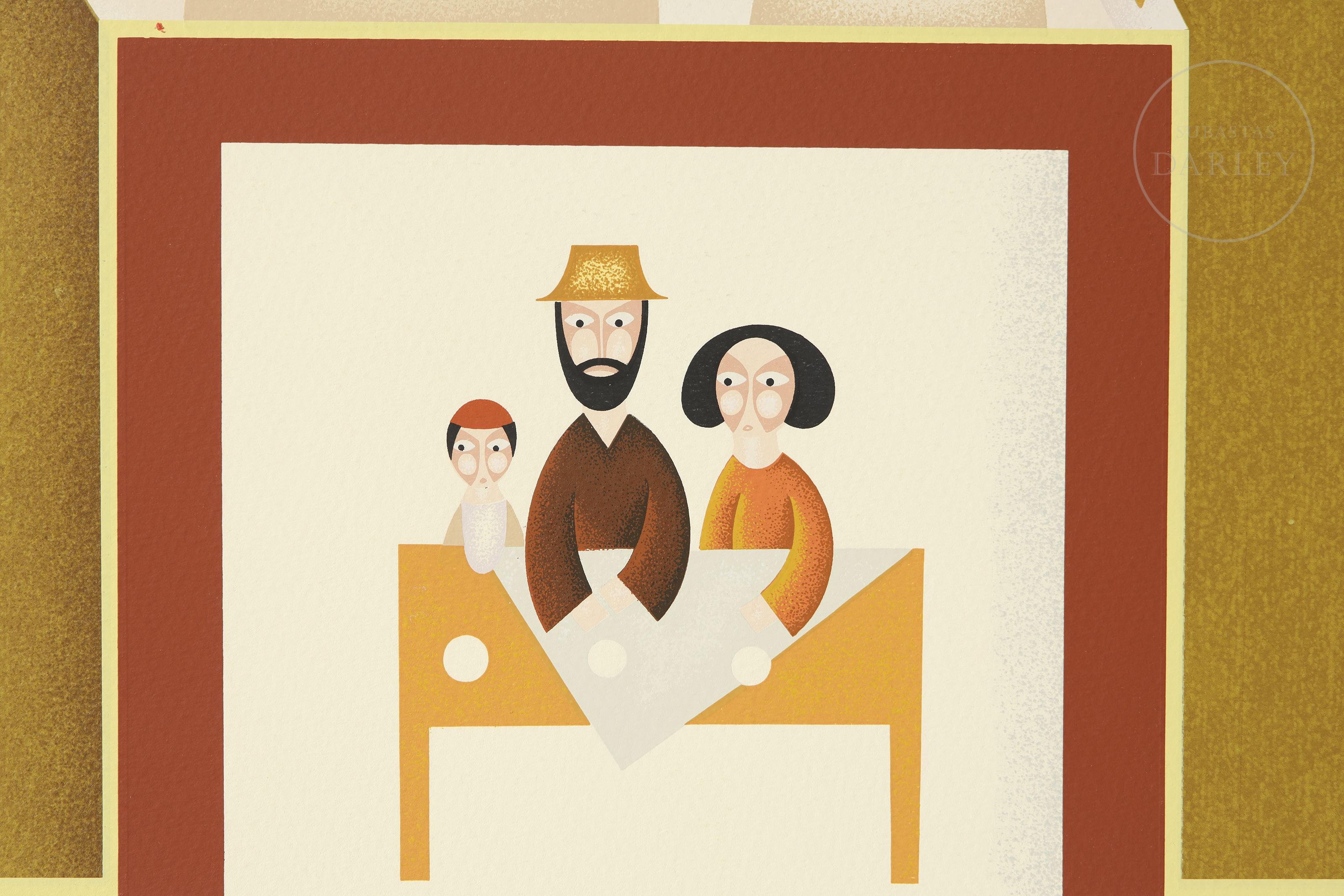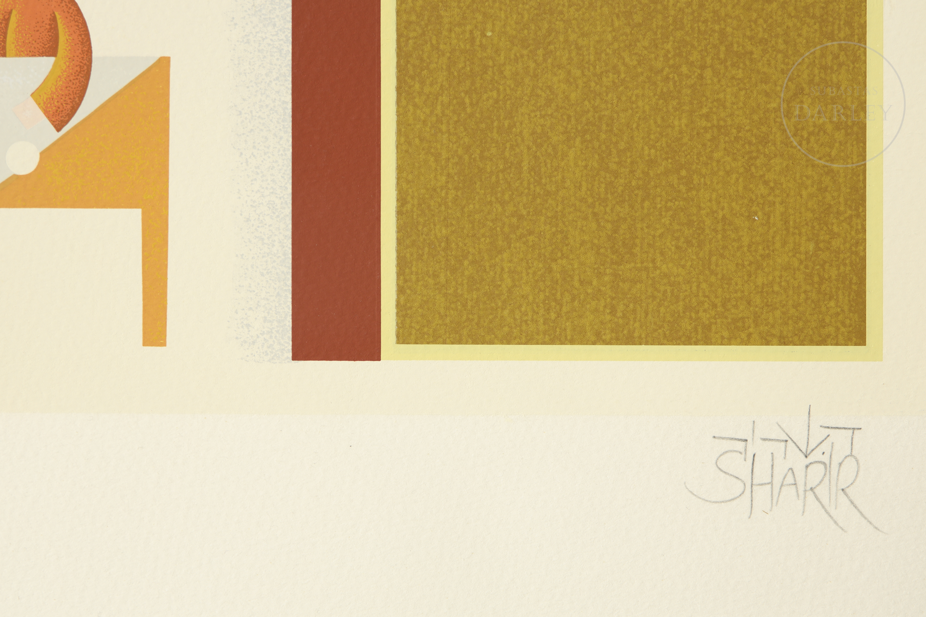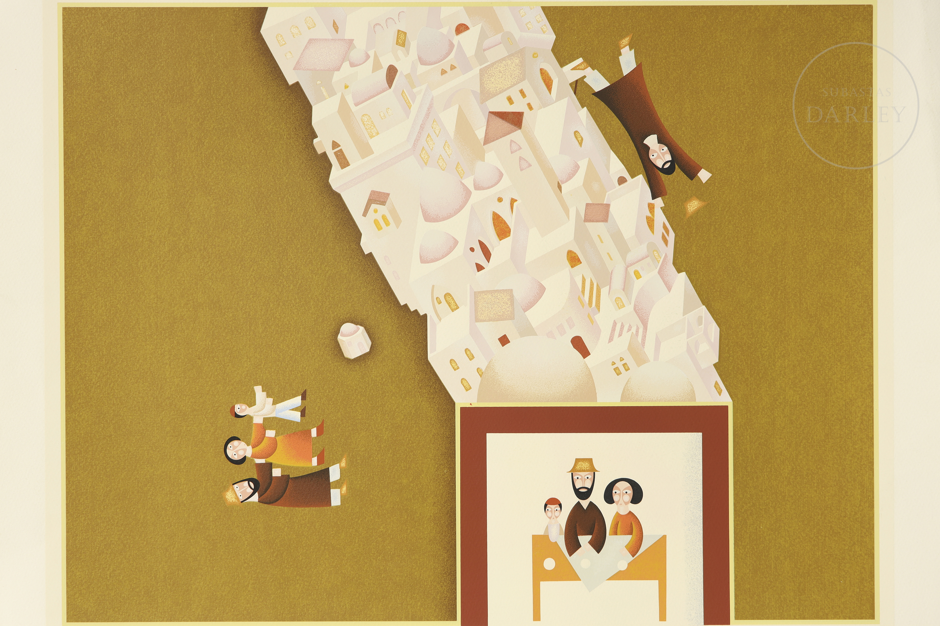 Silkscreen print on paper. Figurative and symbolic composition depicting various members of a family in an idealised architectural setting. Signed ‘SHARIR’ in the lower right corner, numbered ‘143/250’ in the lower left margin.