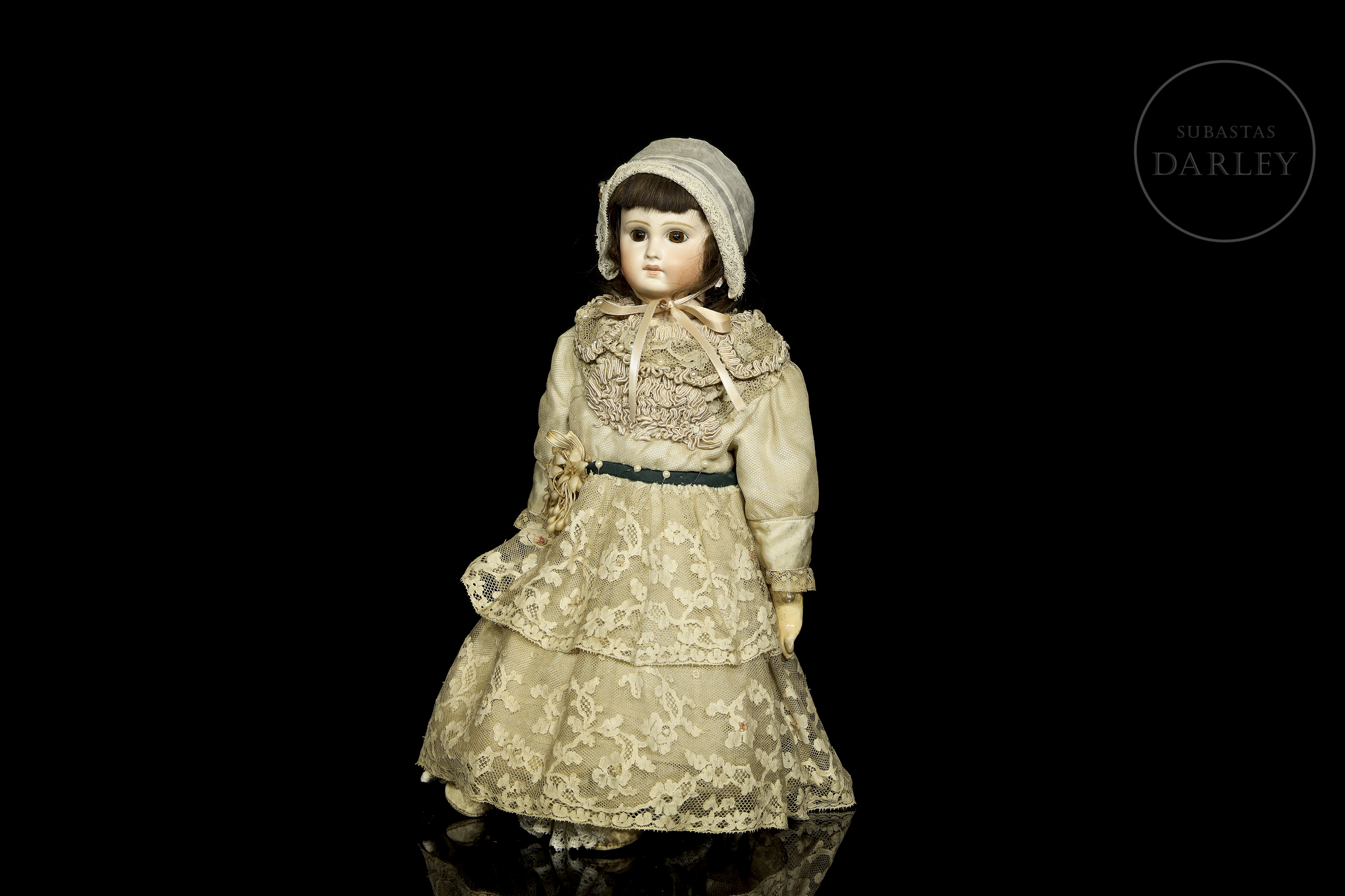 Biscuit porcelain and composition paste Antique character doll, manufactured in Germany in the early 20th century. It has an expressive face with a half-open mouth, fixed glass eyes and a natural hair wig. It is dressed in a period costume with overlapping lace and a matching bonnet. No visible markings.