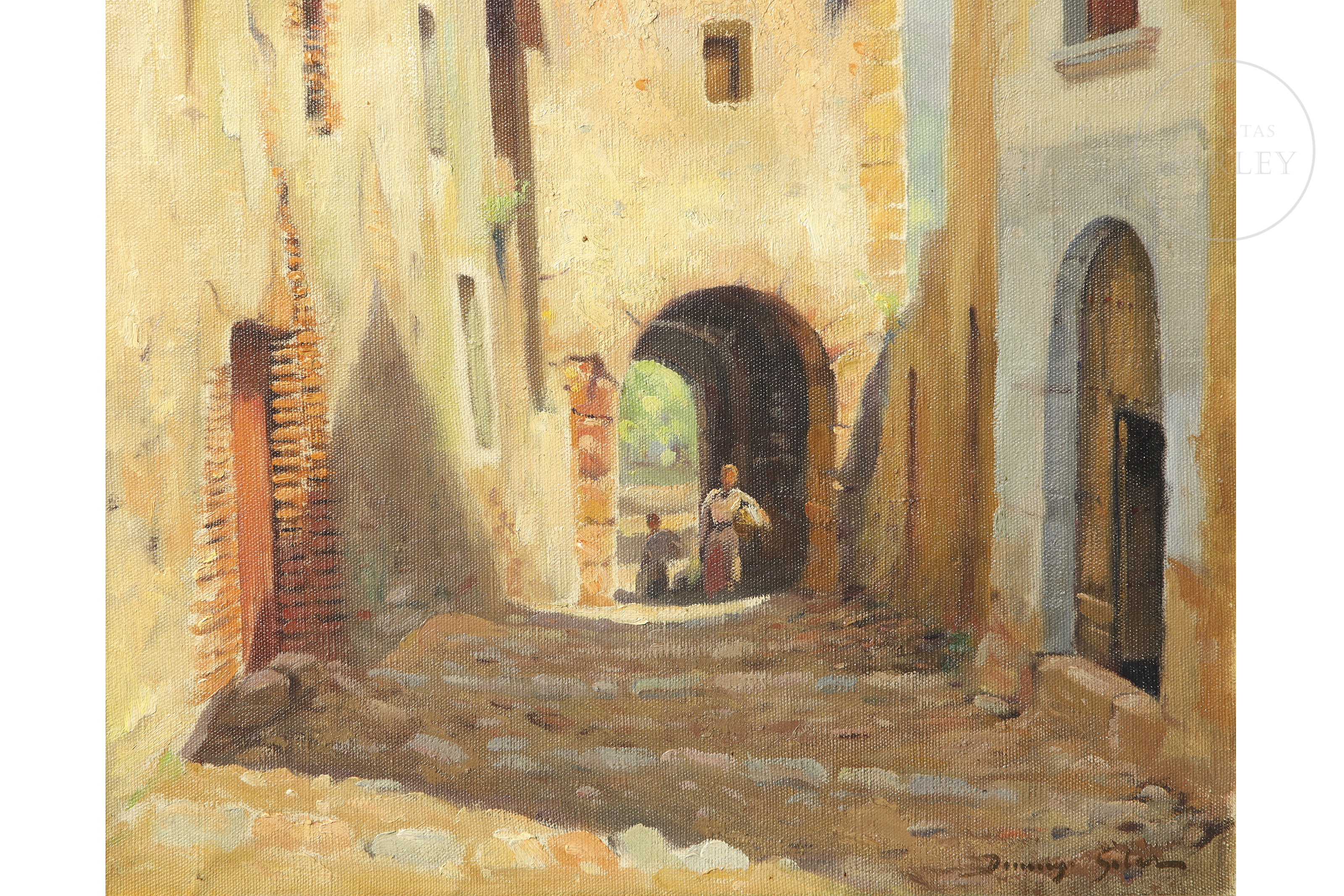 Oil on canvas. Urban landscape depicting a narrow street between two ochre and yellow façades. Signed ‘Domingo Soler’ in the lower right corner.