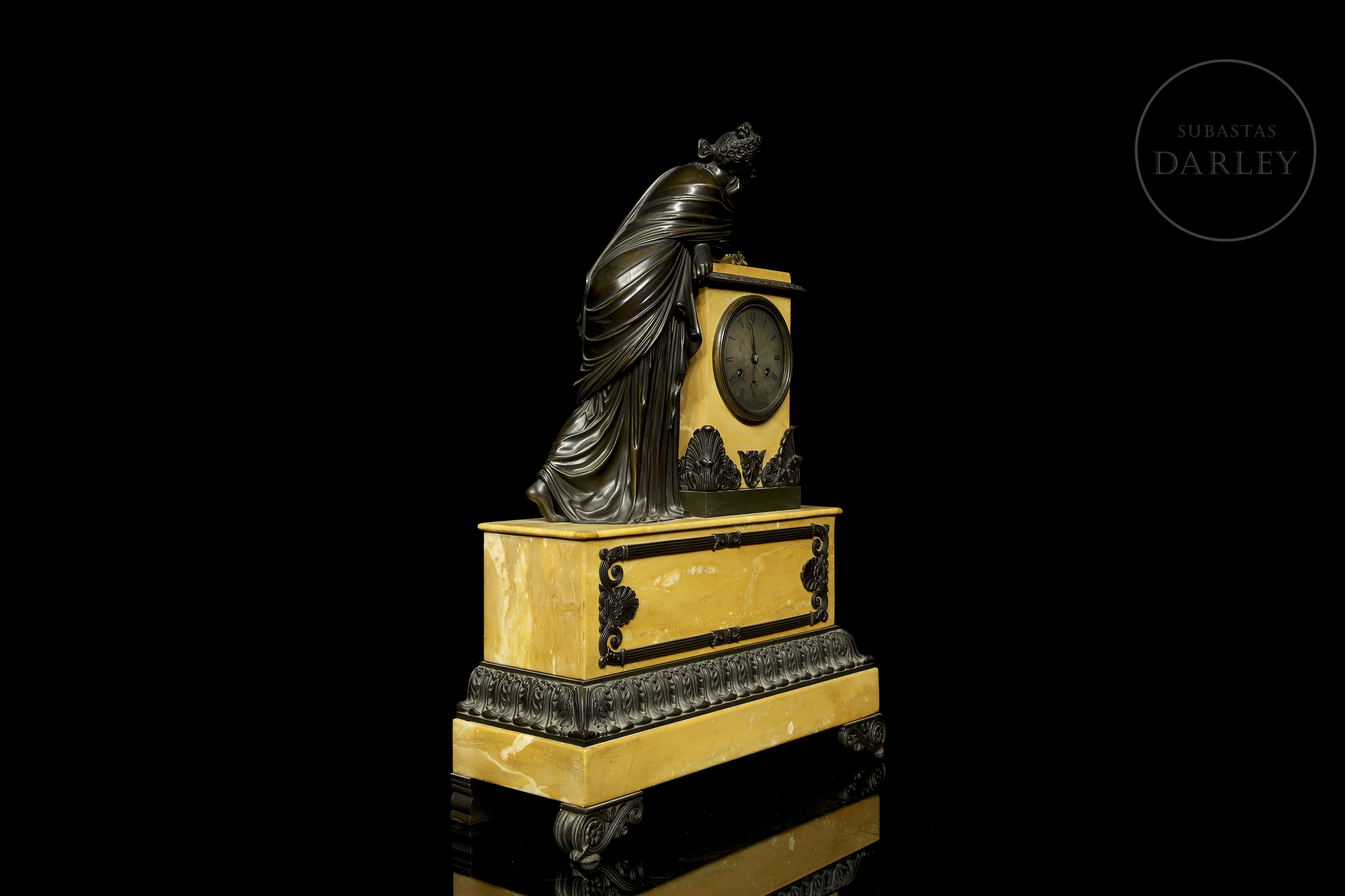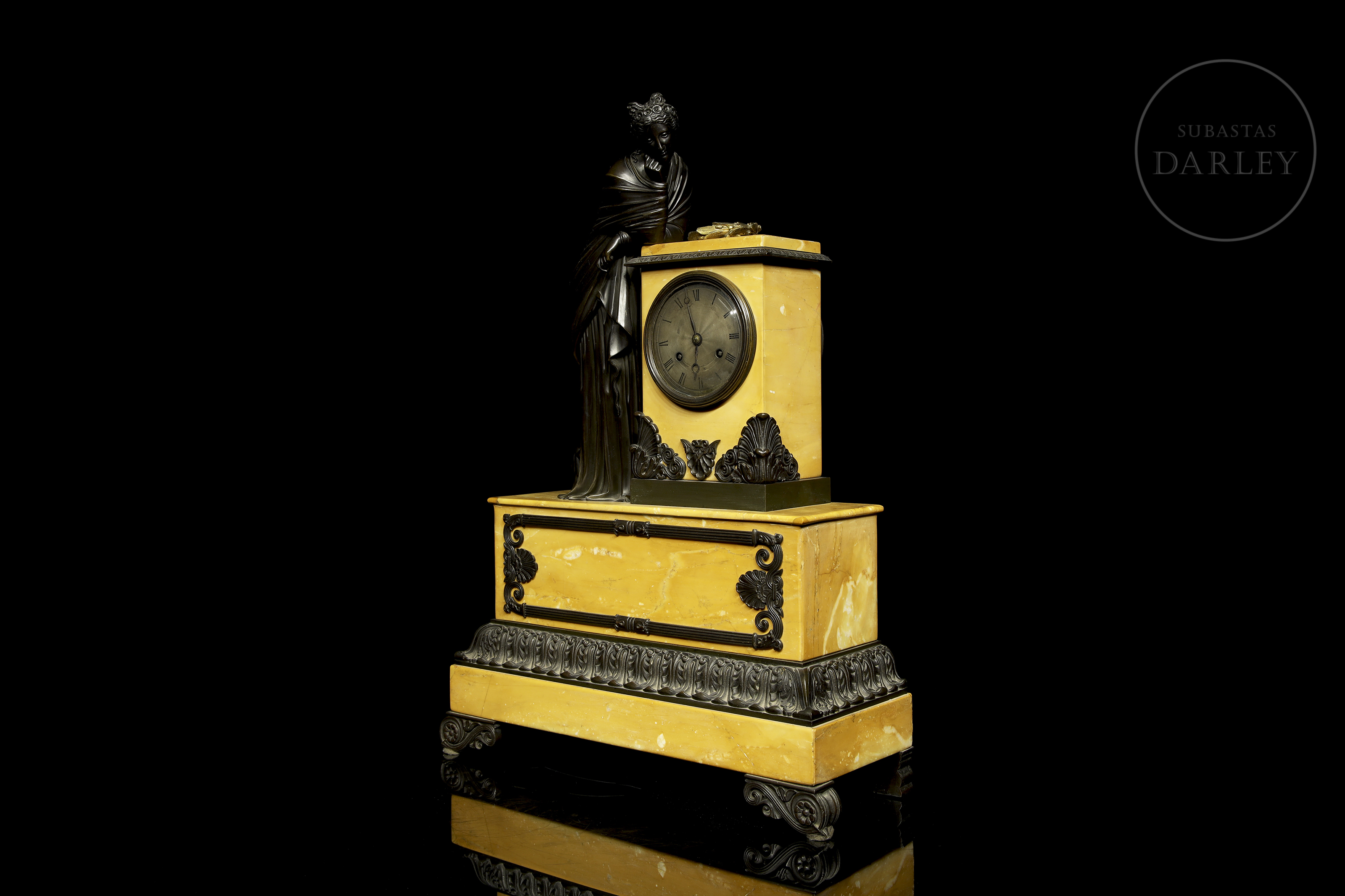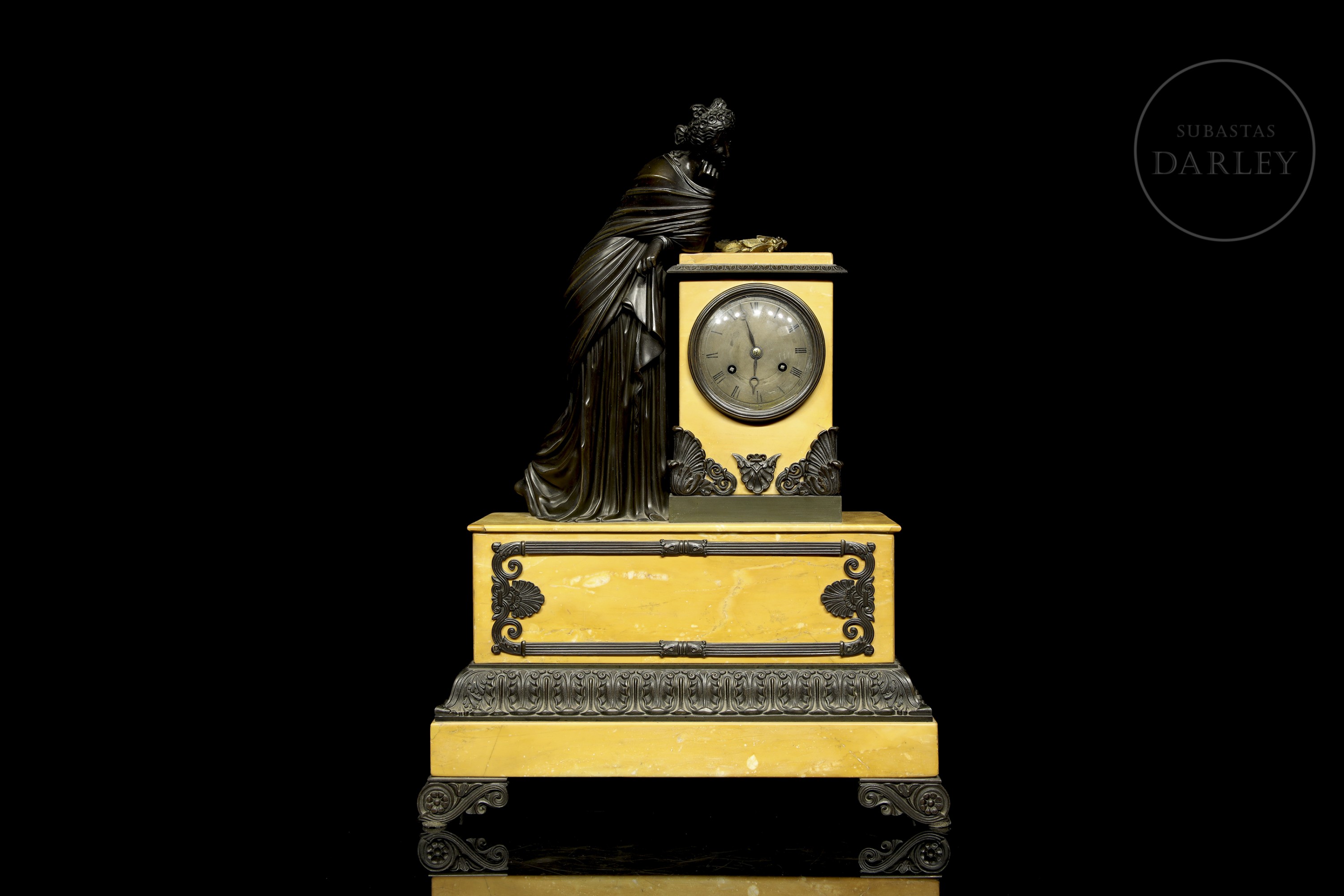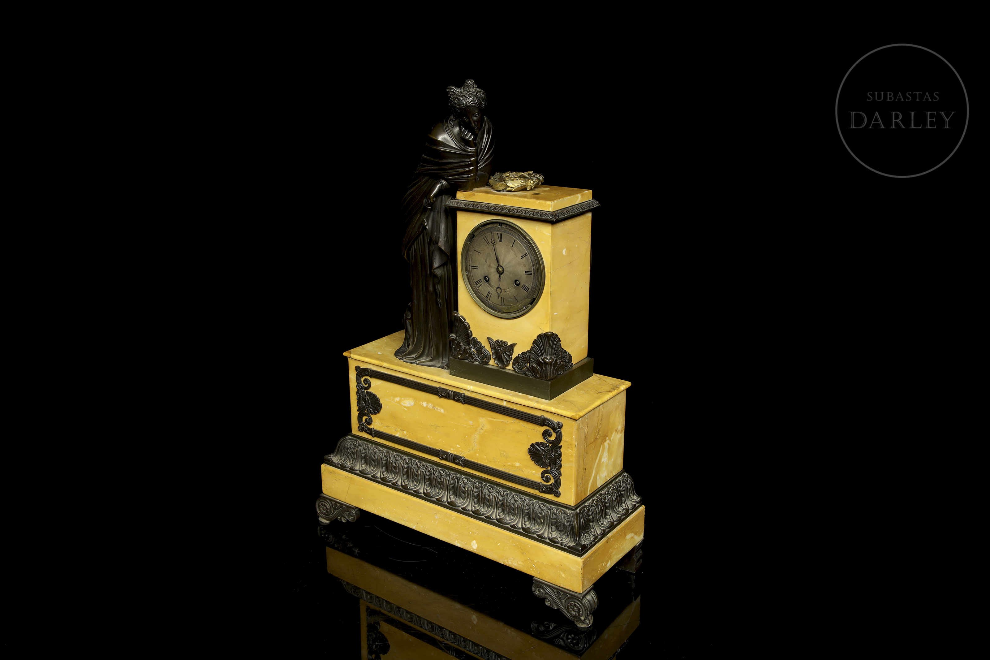 Clock with a yellow Aleppo marble case and base and a patinated bronze sculpture of a lady resting on it. The dial is made of enamelled metal. With restorations.