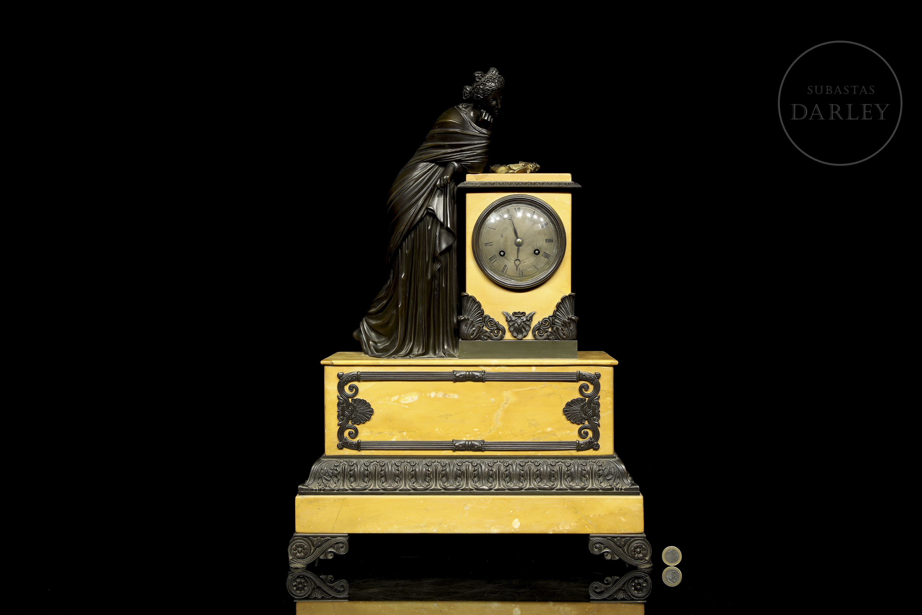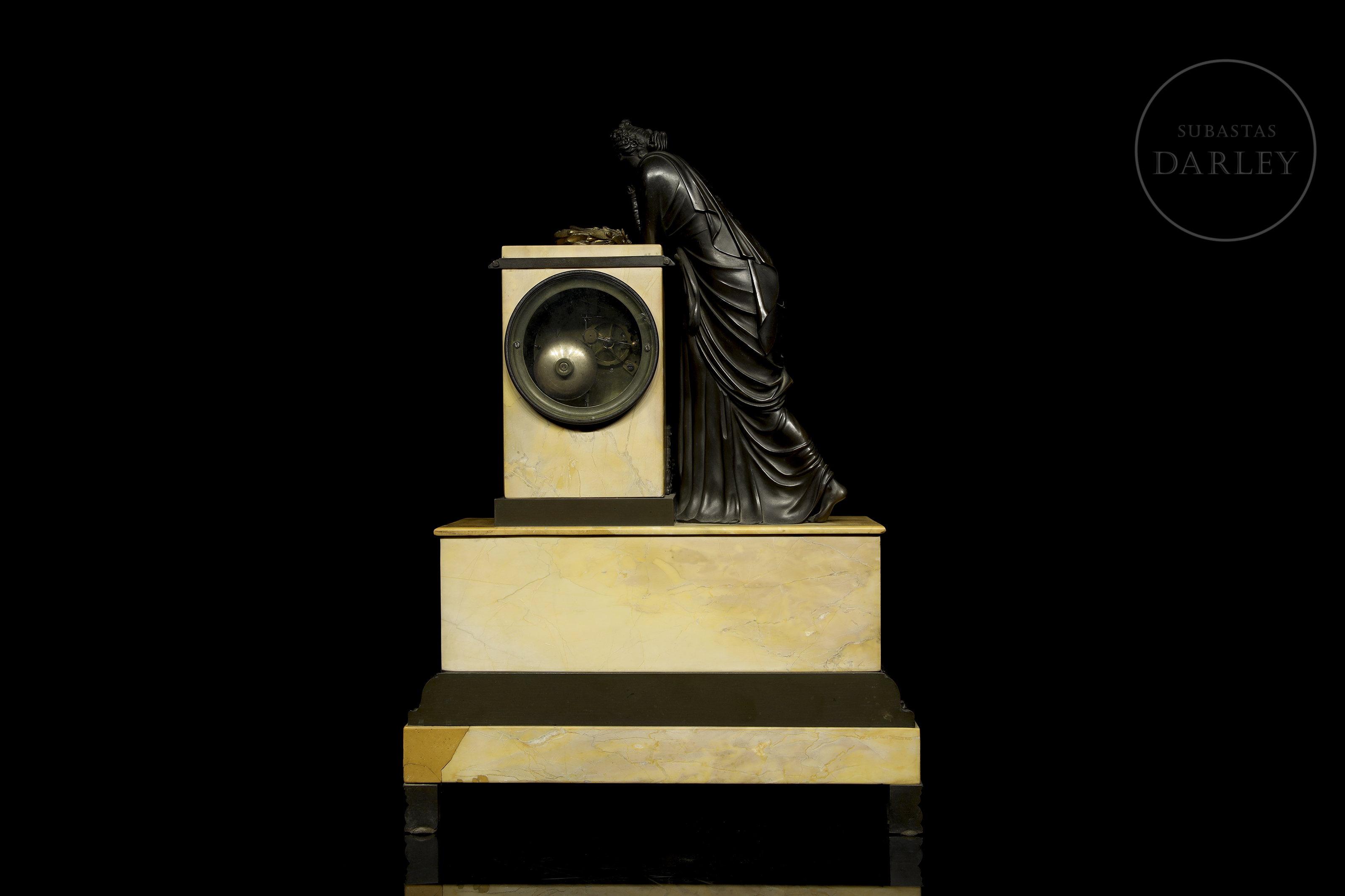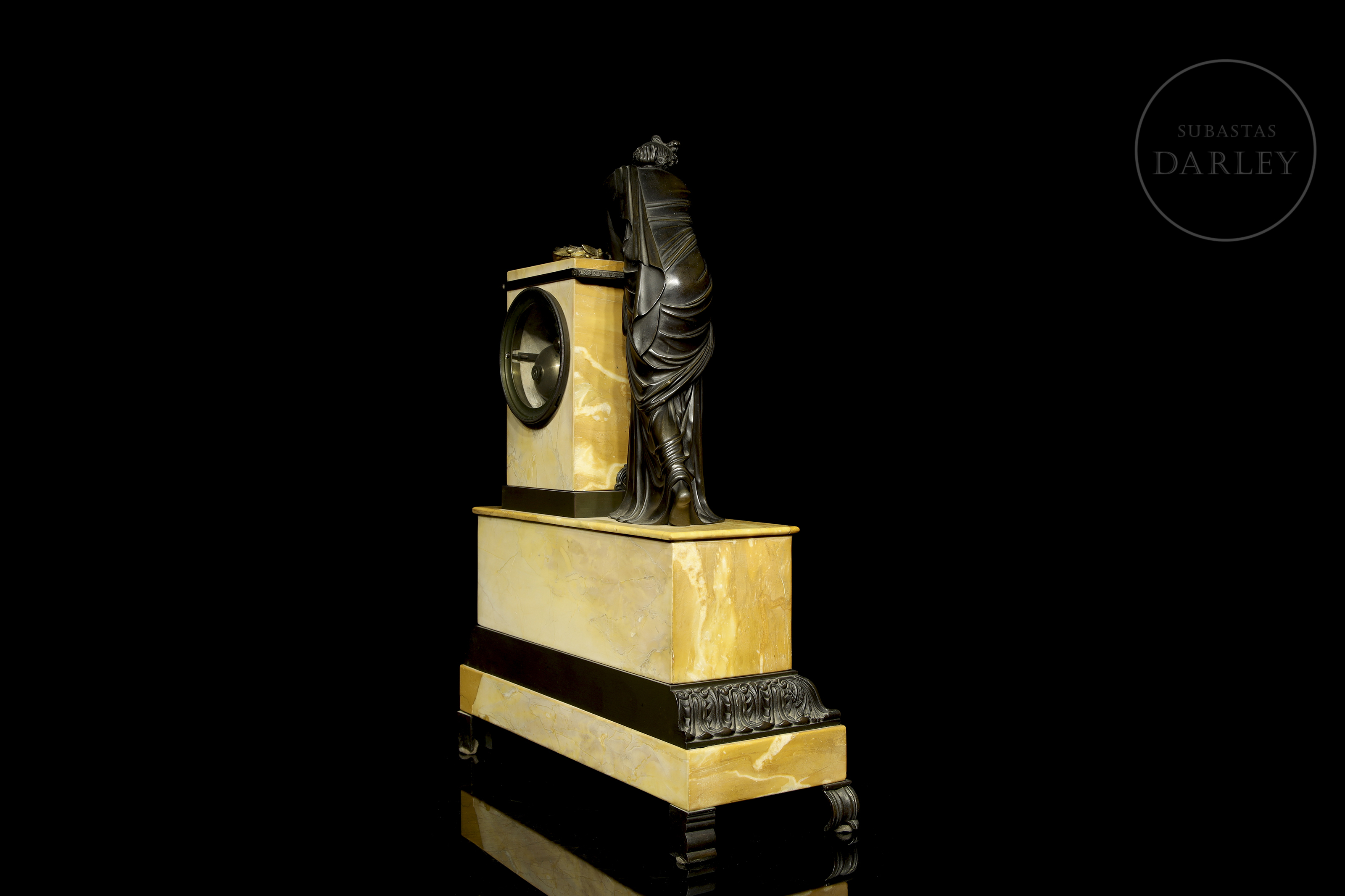 Clock with a yellow Aleppo marble case and base and a patinated bronze sculpture of a lady resting on it. The dial is made of enamelled metal. With restorations.