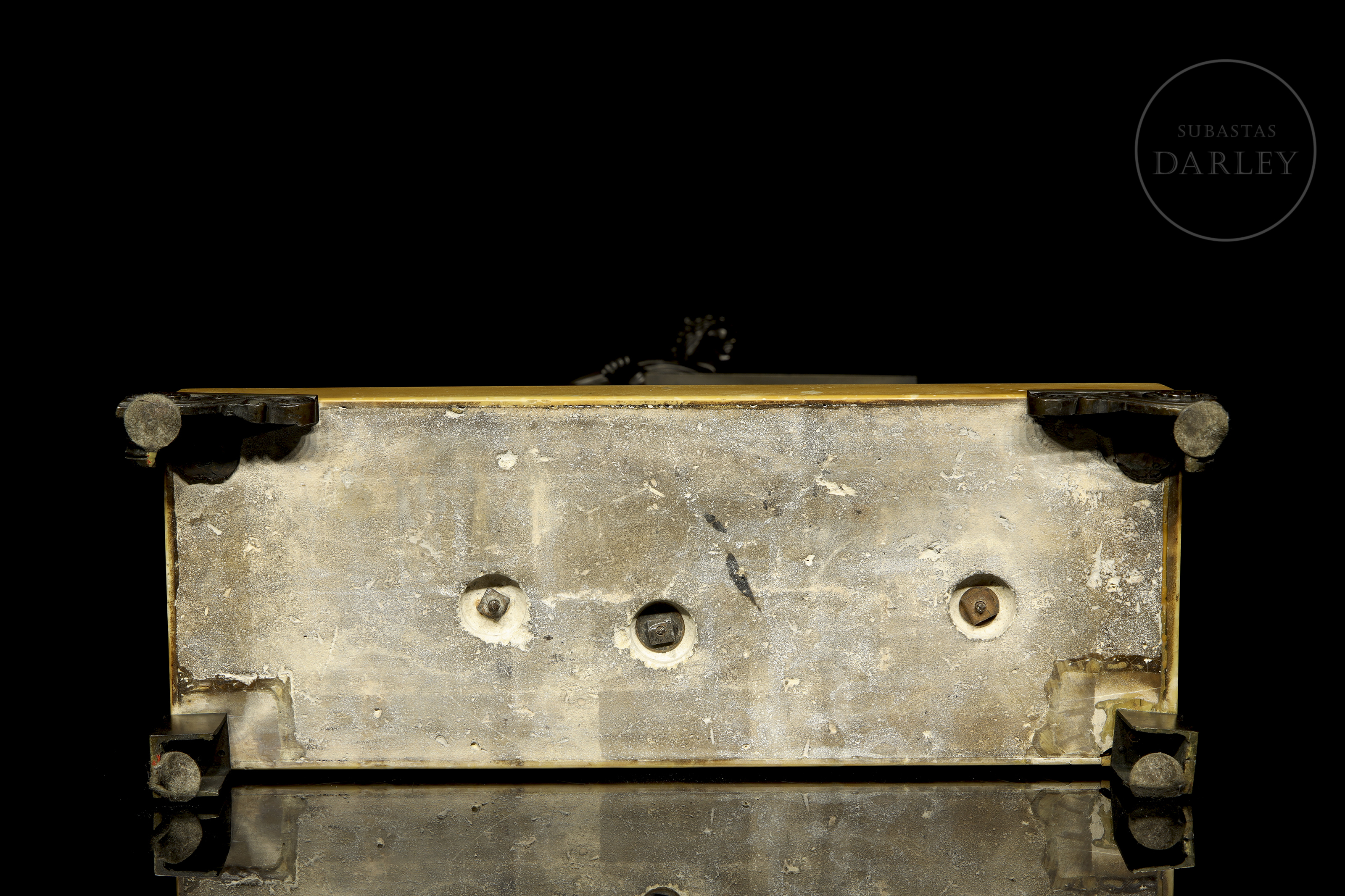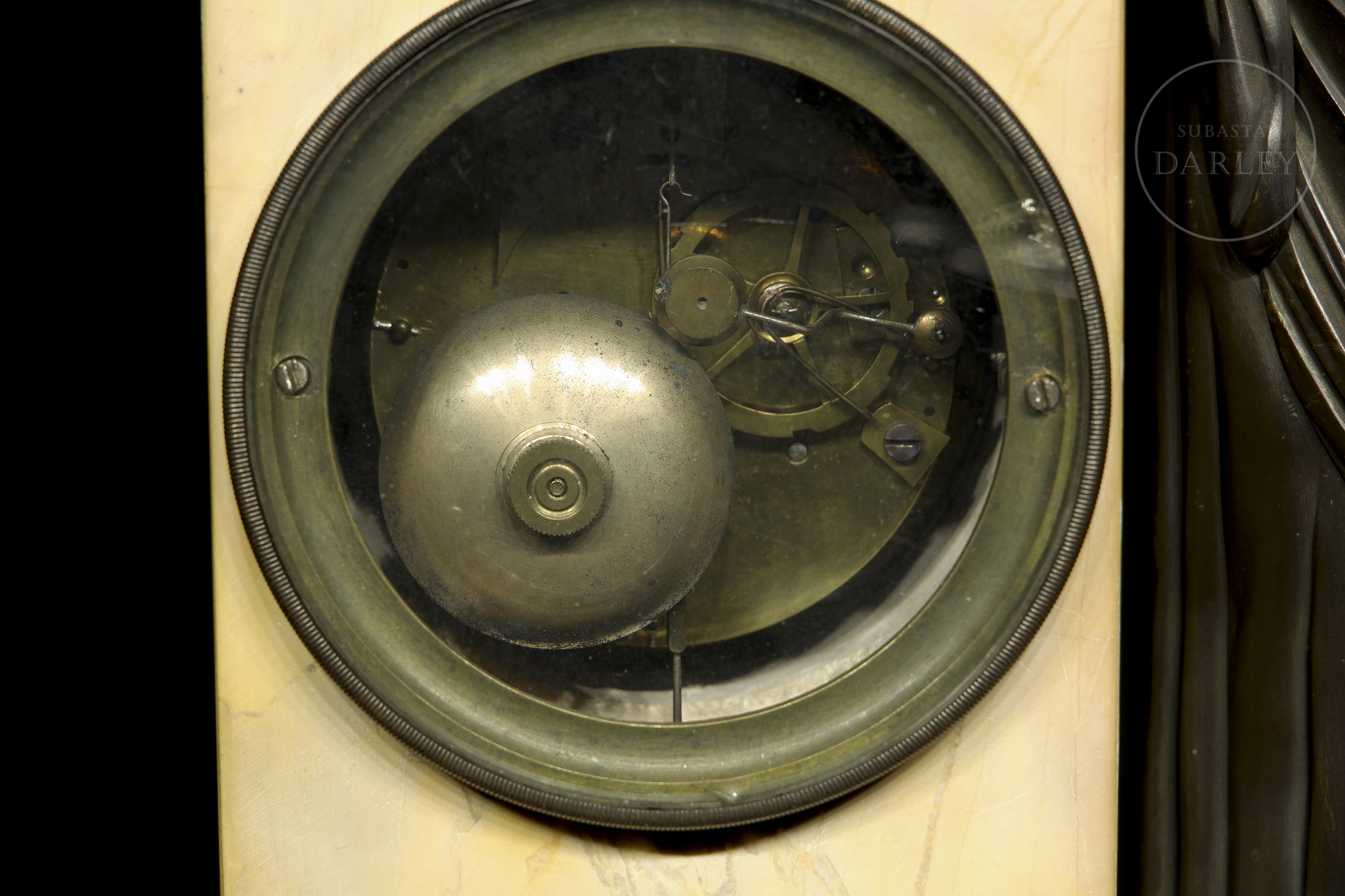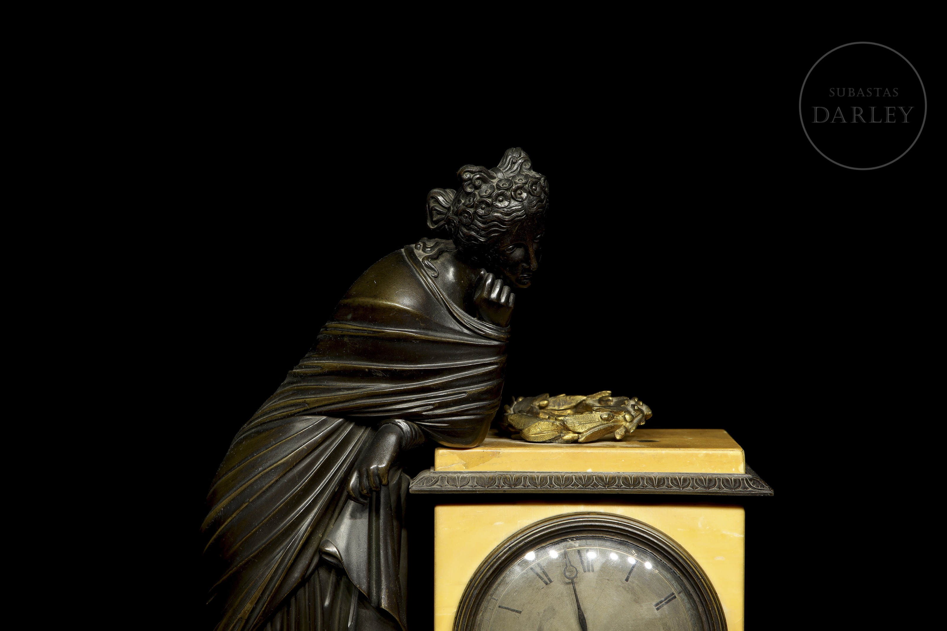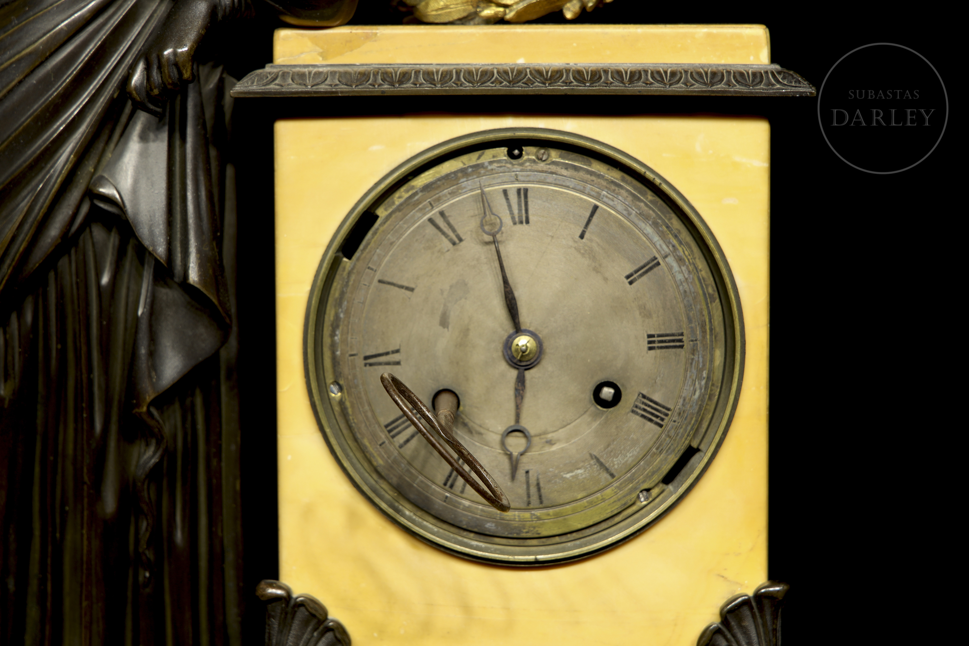 Clock with a yellow Aleppo marble case and base and a patinated bronze sculpture of a lady resting on it. The dial is made of enamelled metal. With restorations.