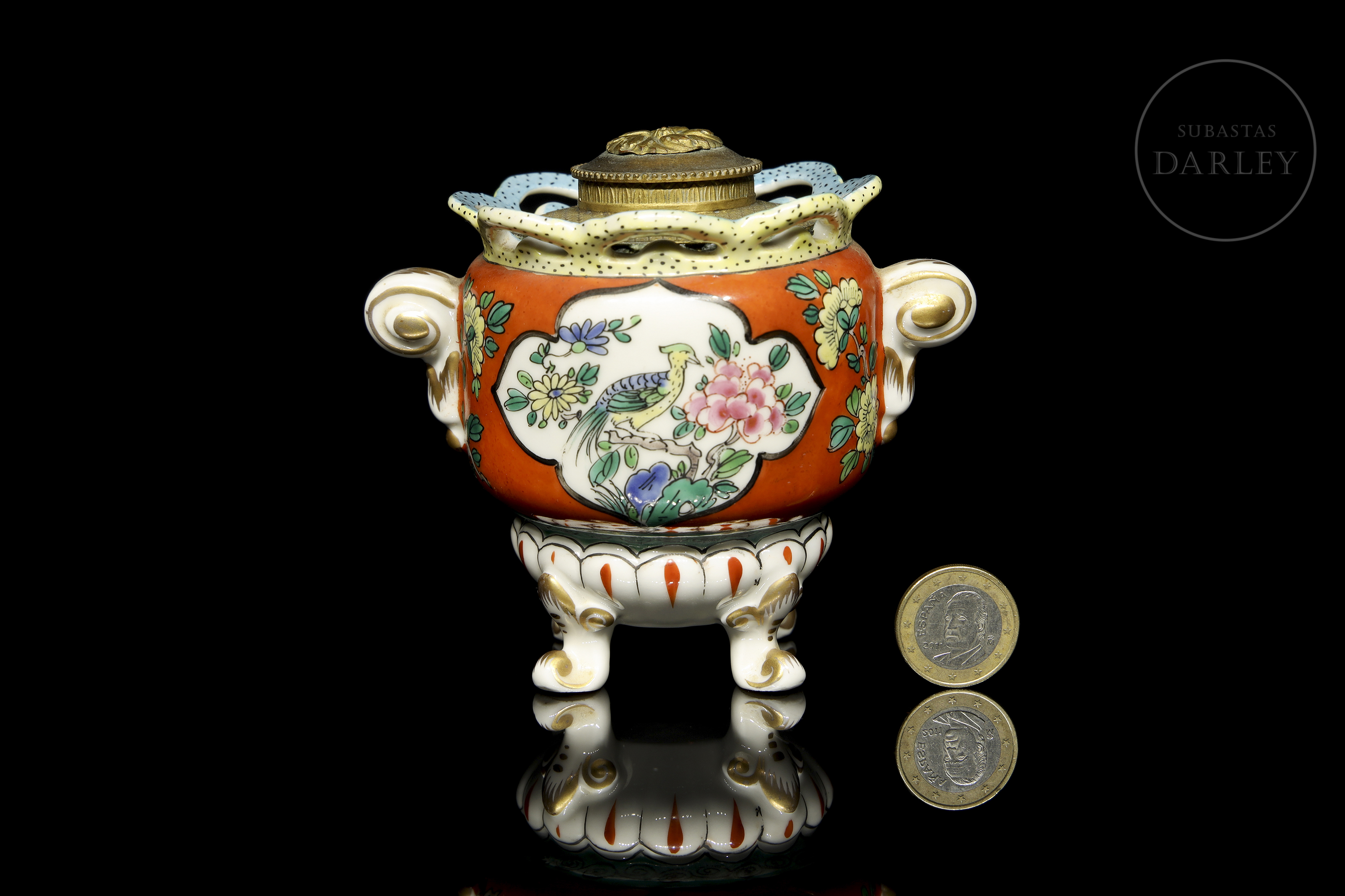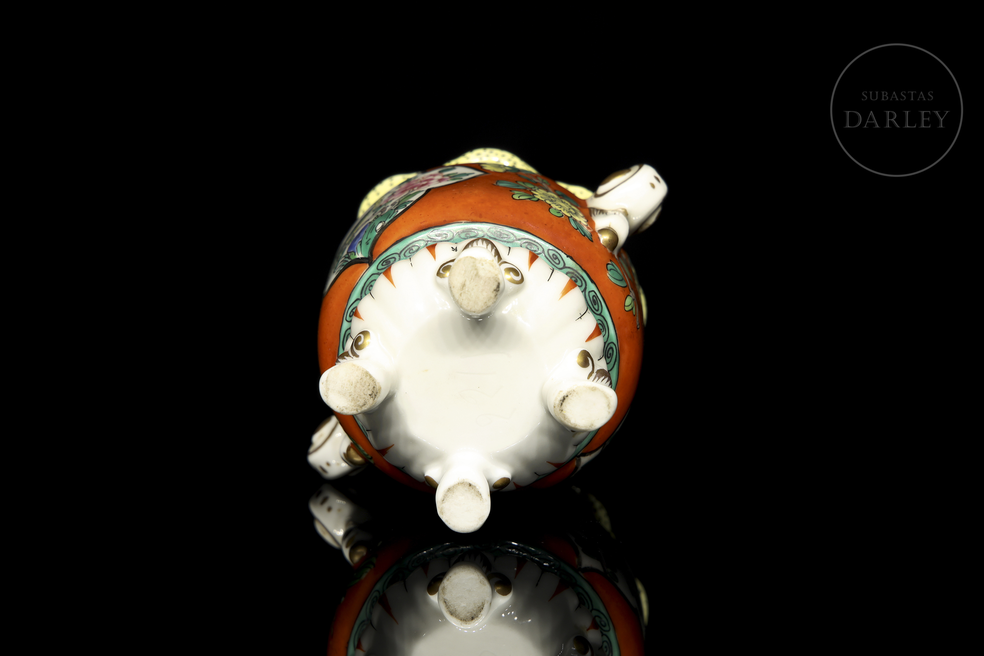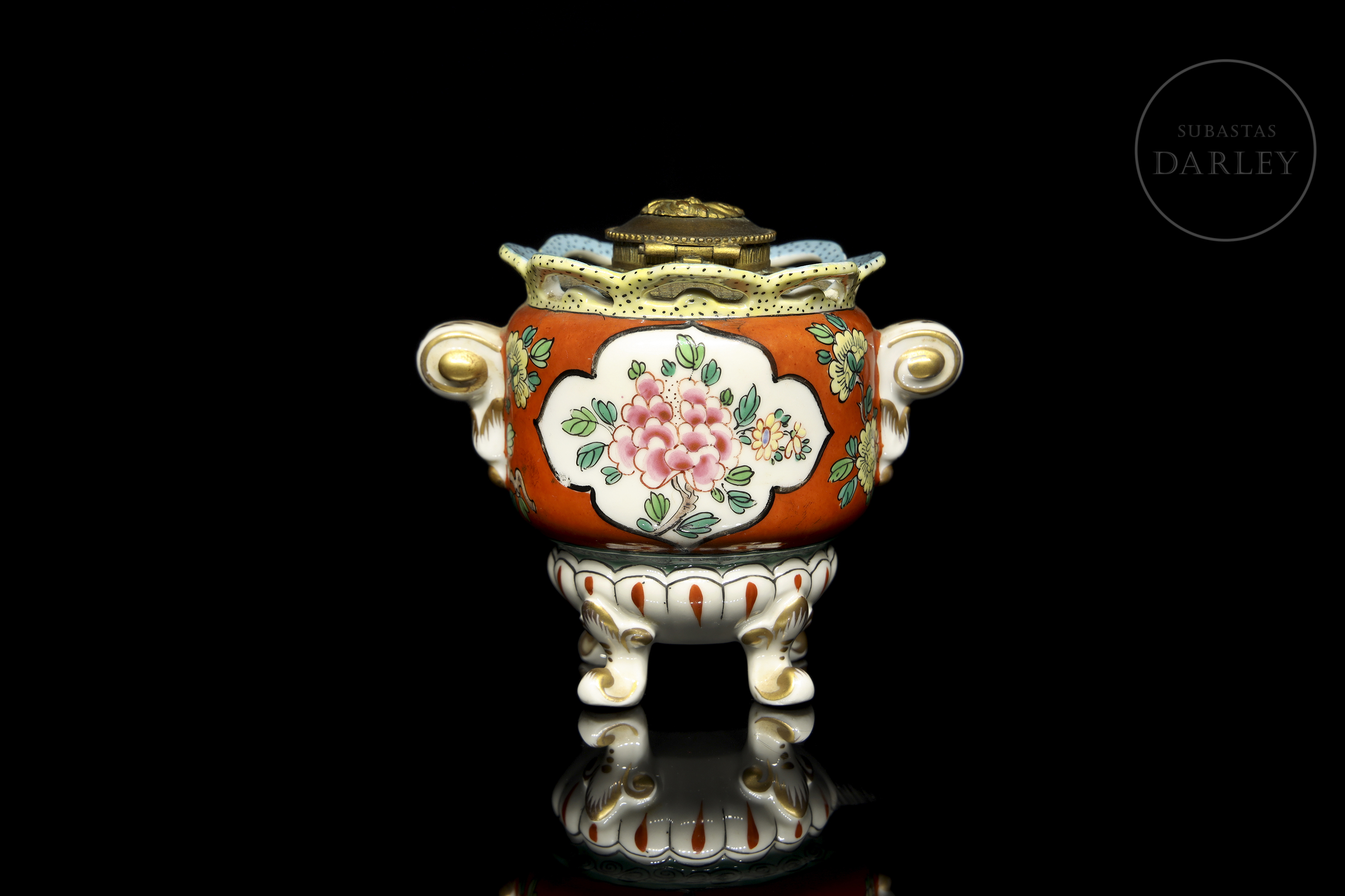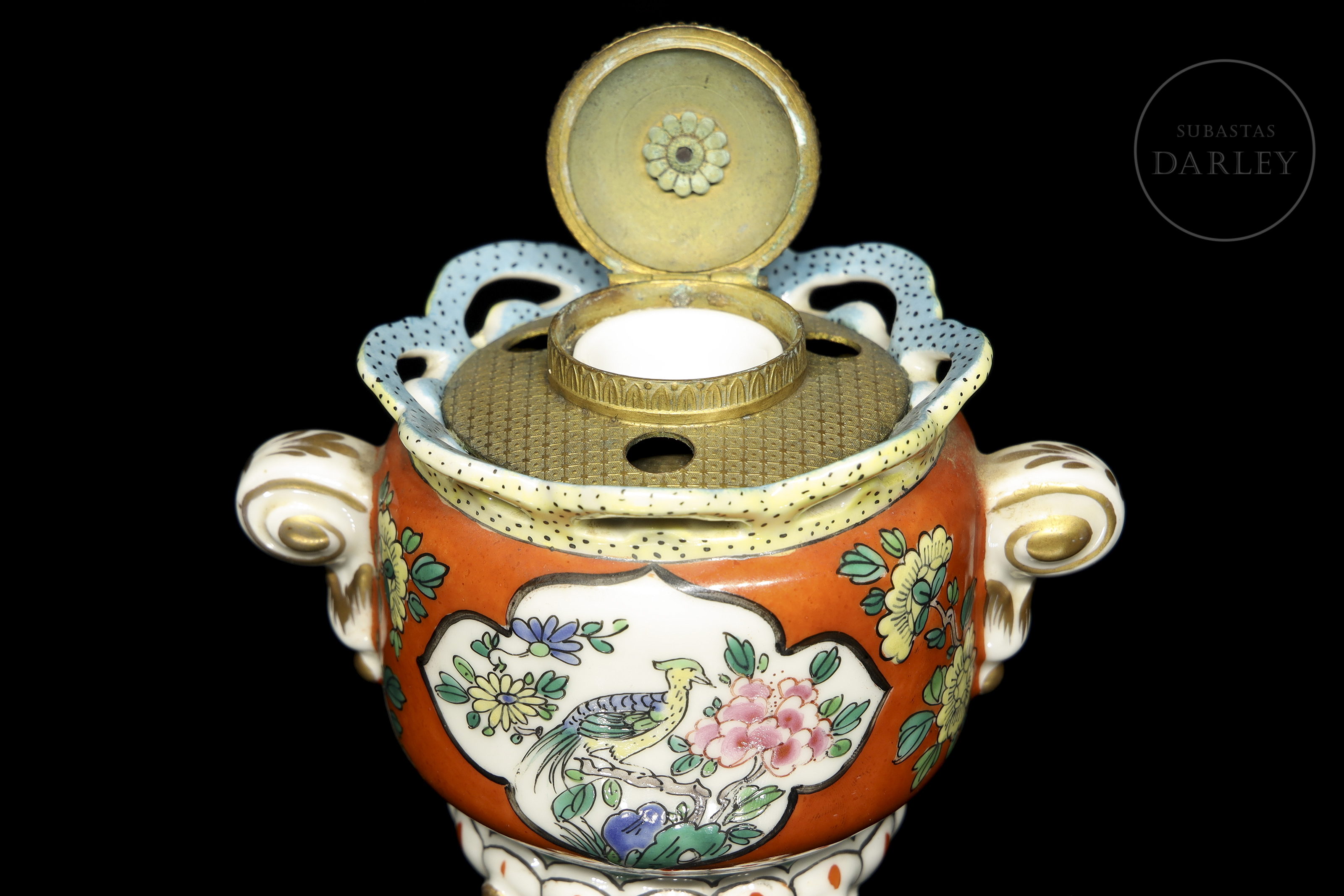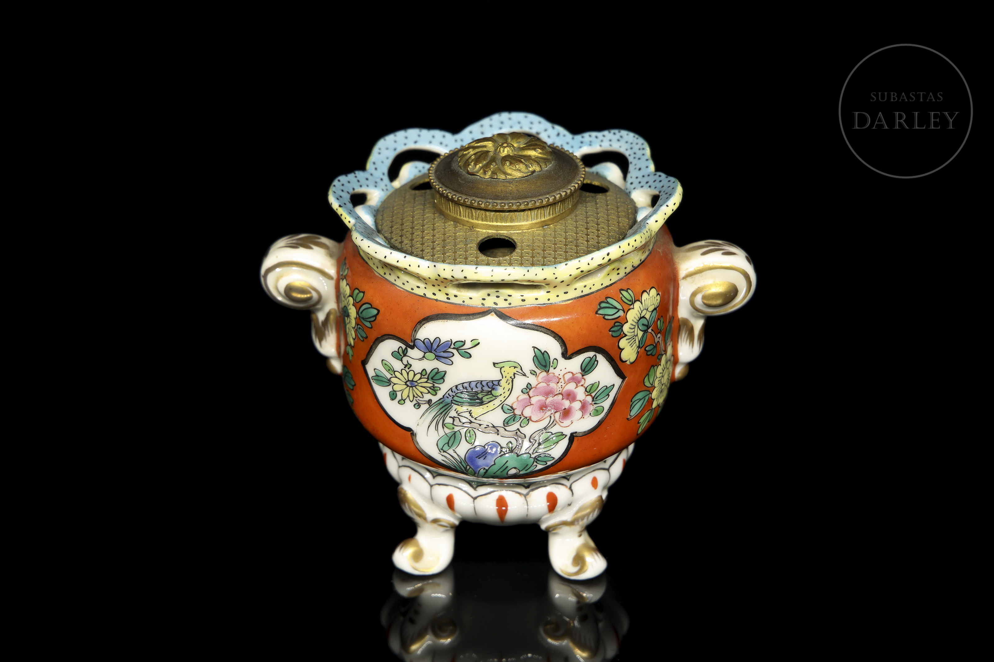 Porcelain enamelled inkwell with stands. Decorated in red with plant and animal motifs. The body depicts two scenes in reserve, a bird and pink flowers. The base of the piece has four legs to support the figure and two small handles on the sides, also in ceramic. It shows minor wear due to age.
