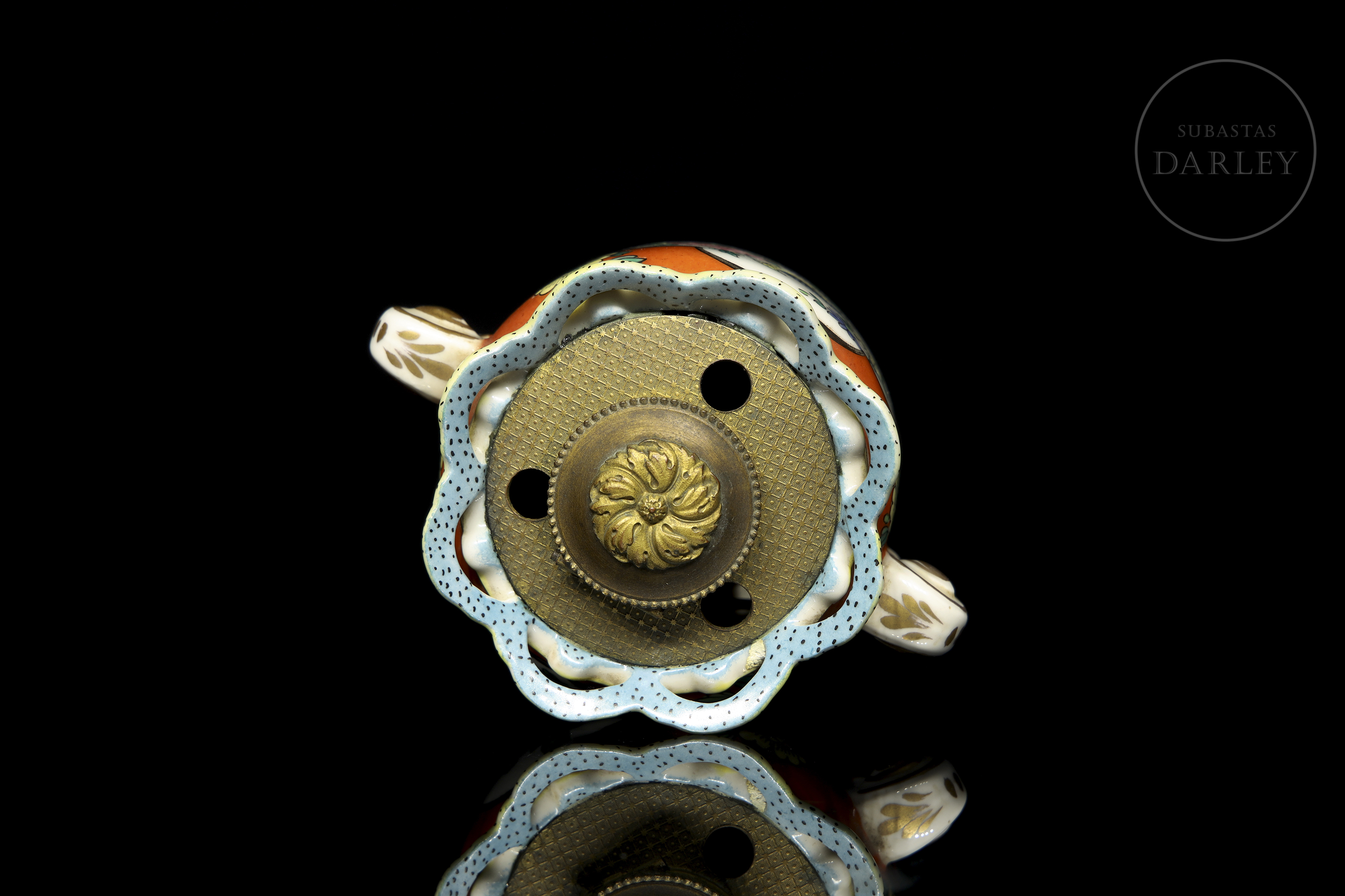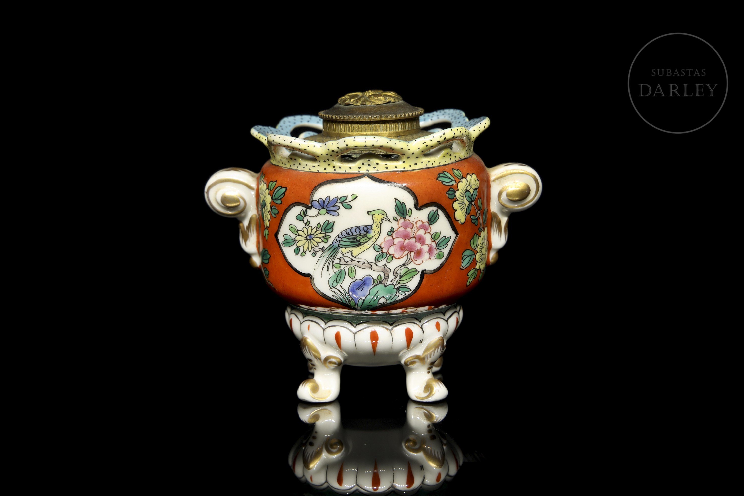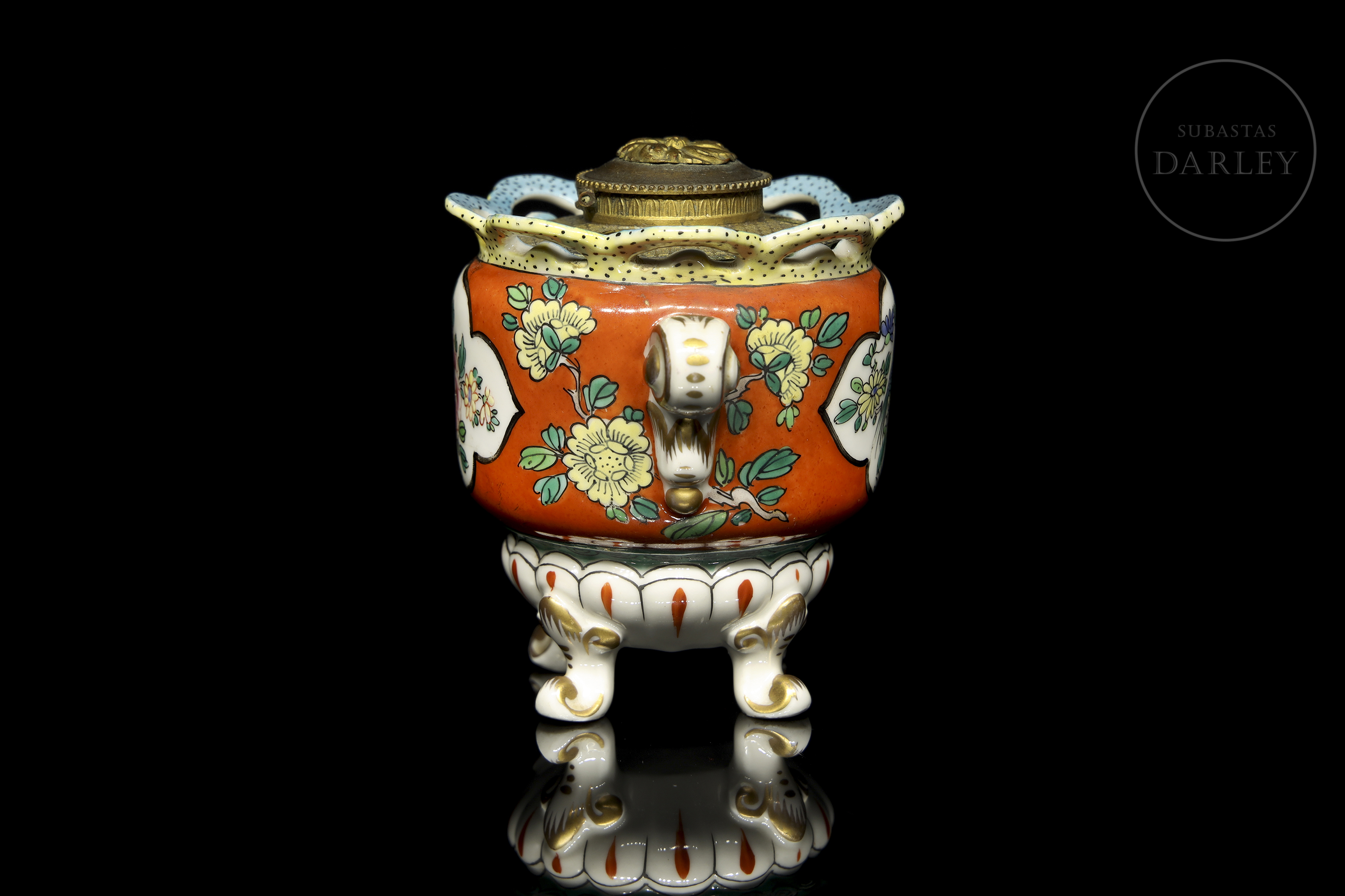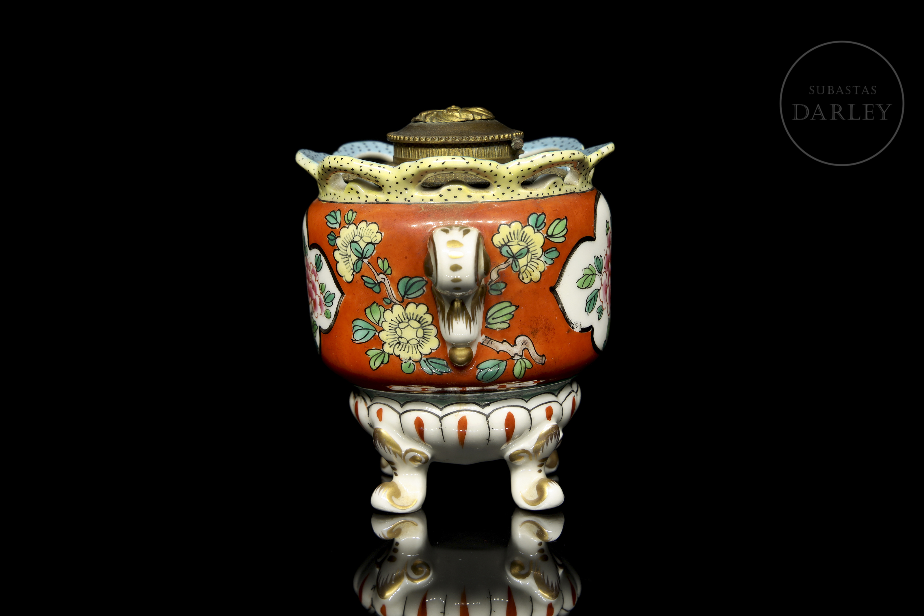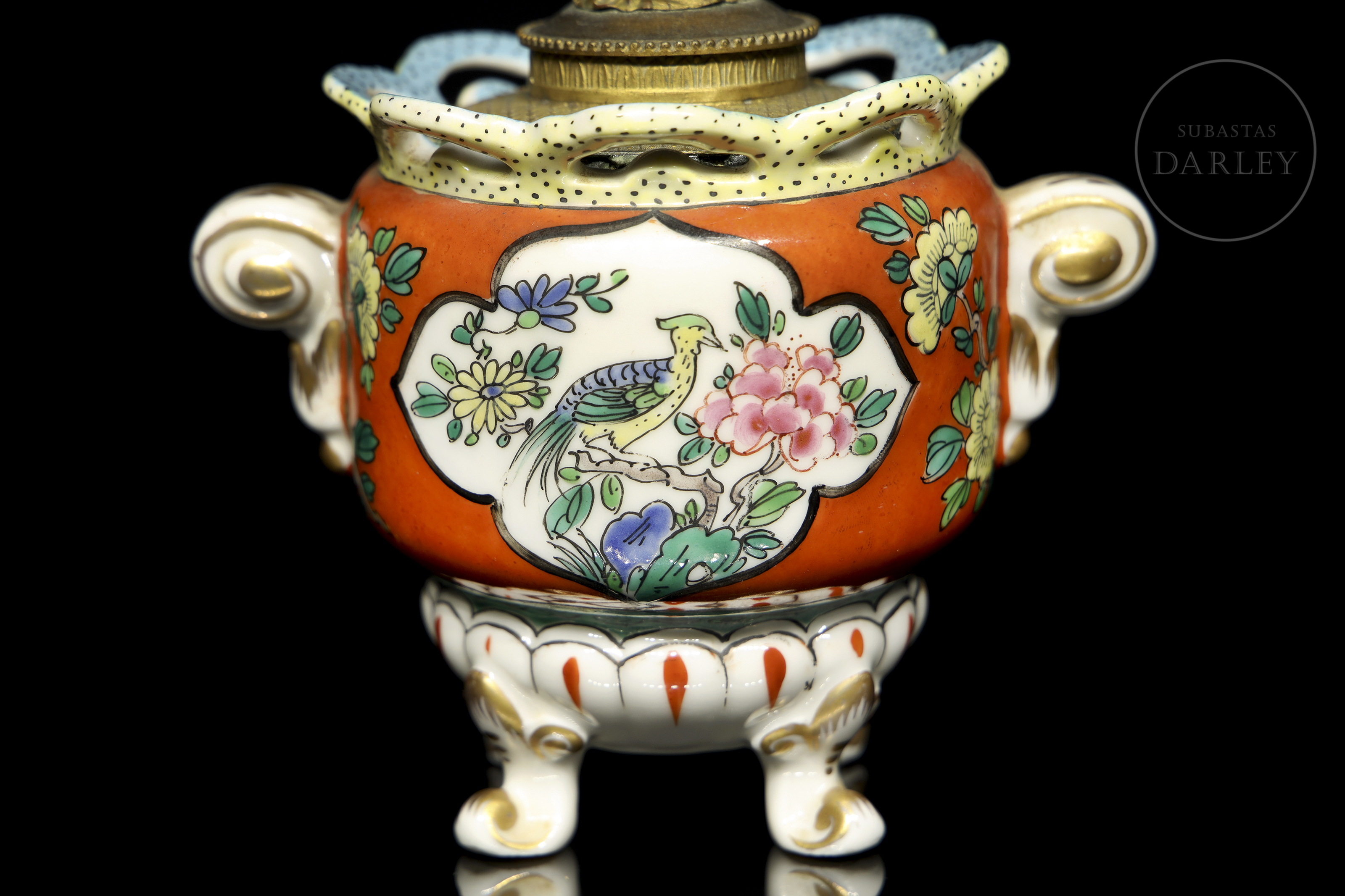 Porcelain enamelled inkwell with stands. Decorated in red with plant and animal motifs. The body depicts two scenes in reserve, a bird and pink flowers. The base of the piece has four legs to support the figure and two small handles on the sides, also in ceramic. It shows minor wear due to age.