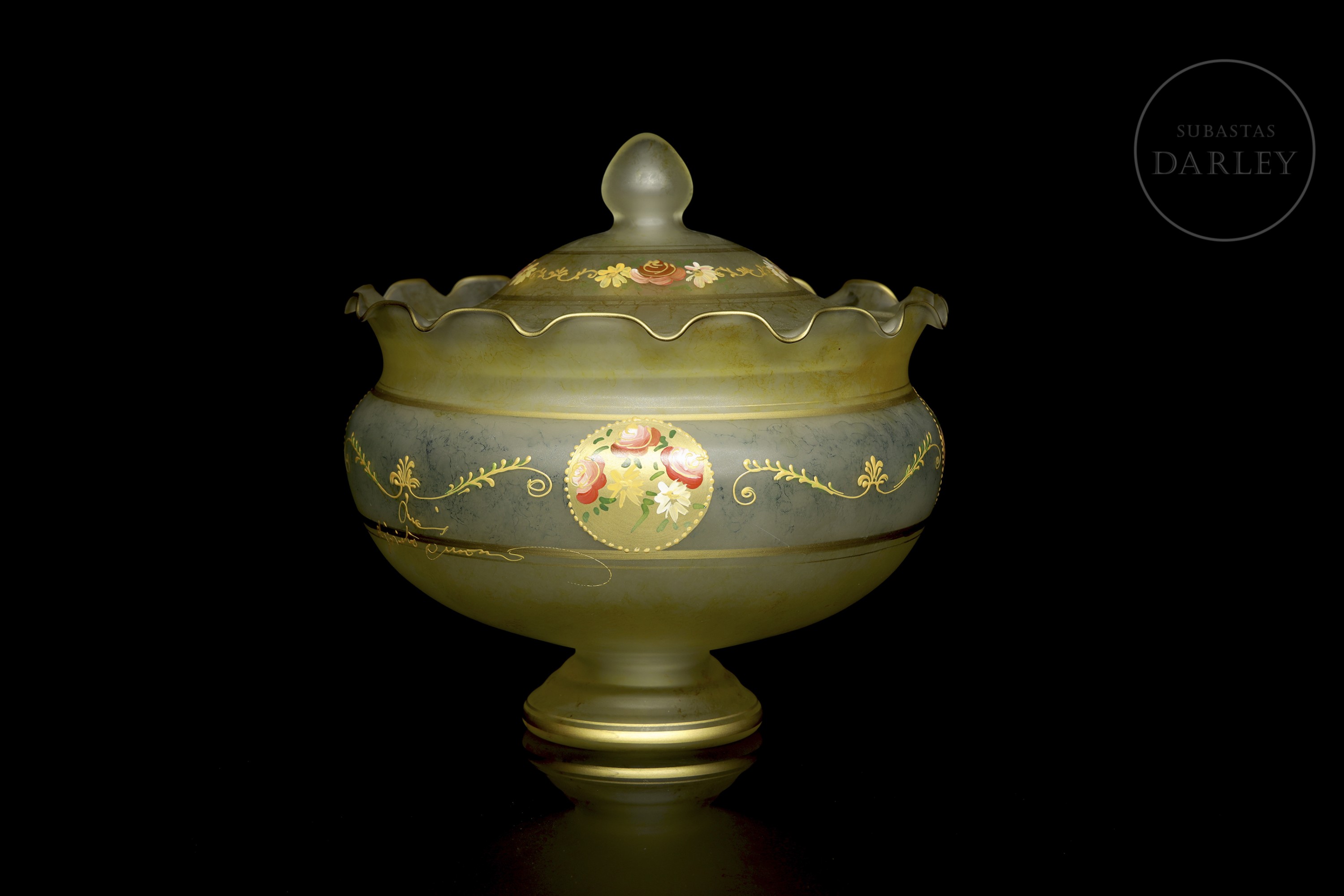 Made of green/grey satin glass with a wavy edge. It features profuse decoration with medallions of roses in polychrome enamel and numerous scrolls outlined in gold.