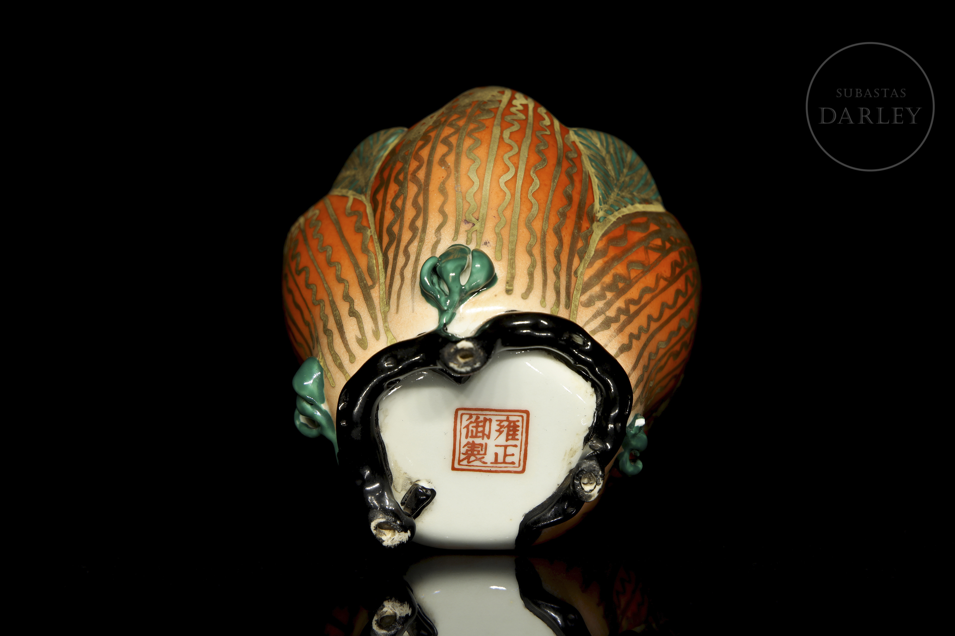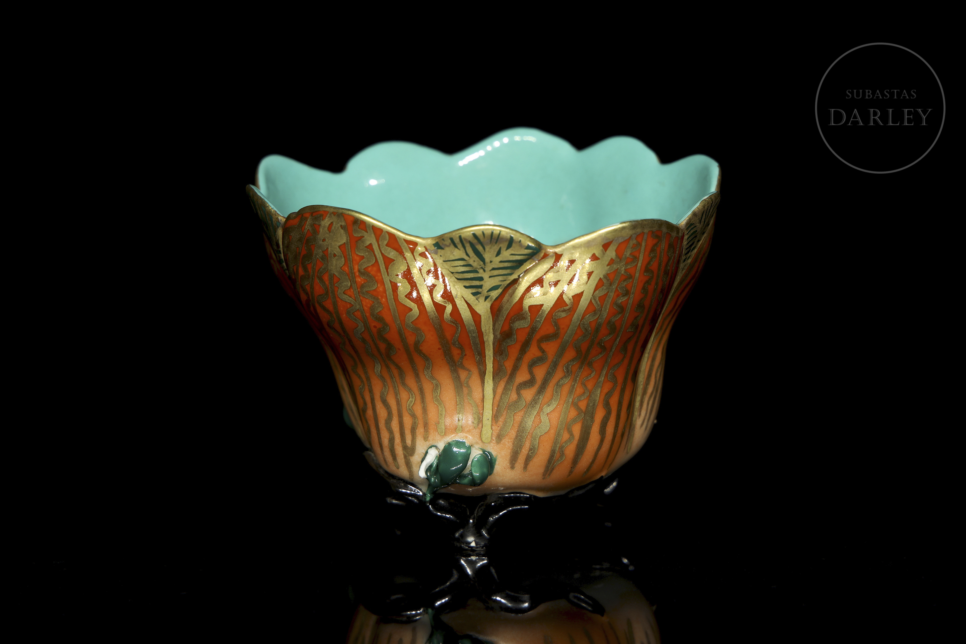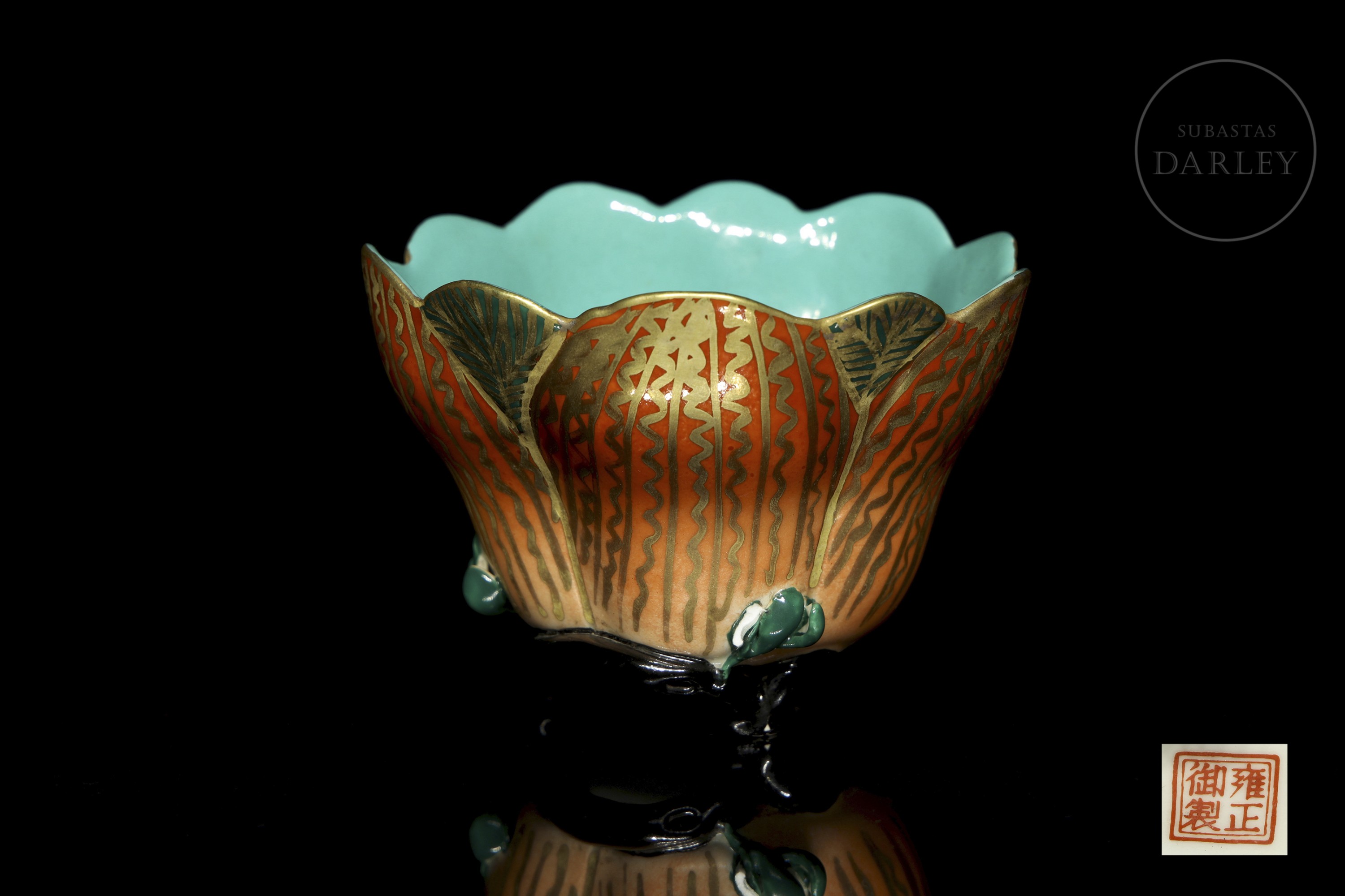 Porcelain modelled in the shape of an open flower, with a lobed outline and supported by a glazed tripod foot. Exterior decorated in orange and gold tones with green leaves; interior in turquoise enamel. The base bears a red seal with four characters: ‘雍正御製’.