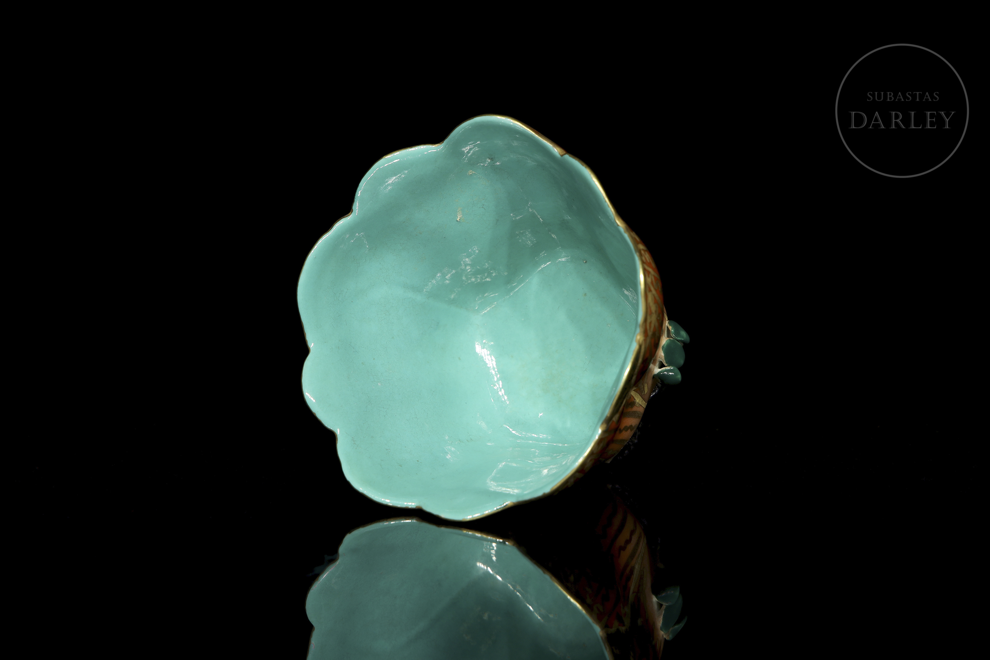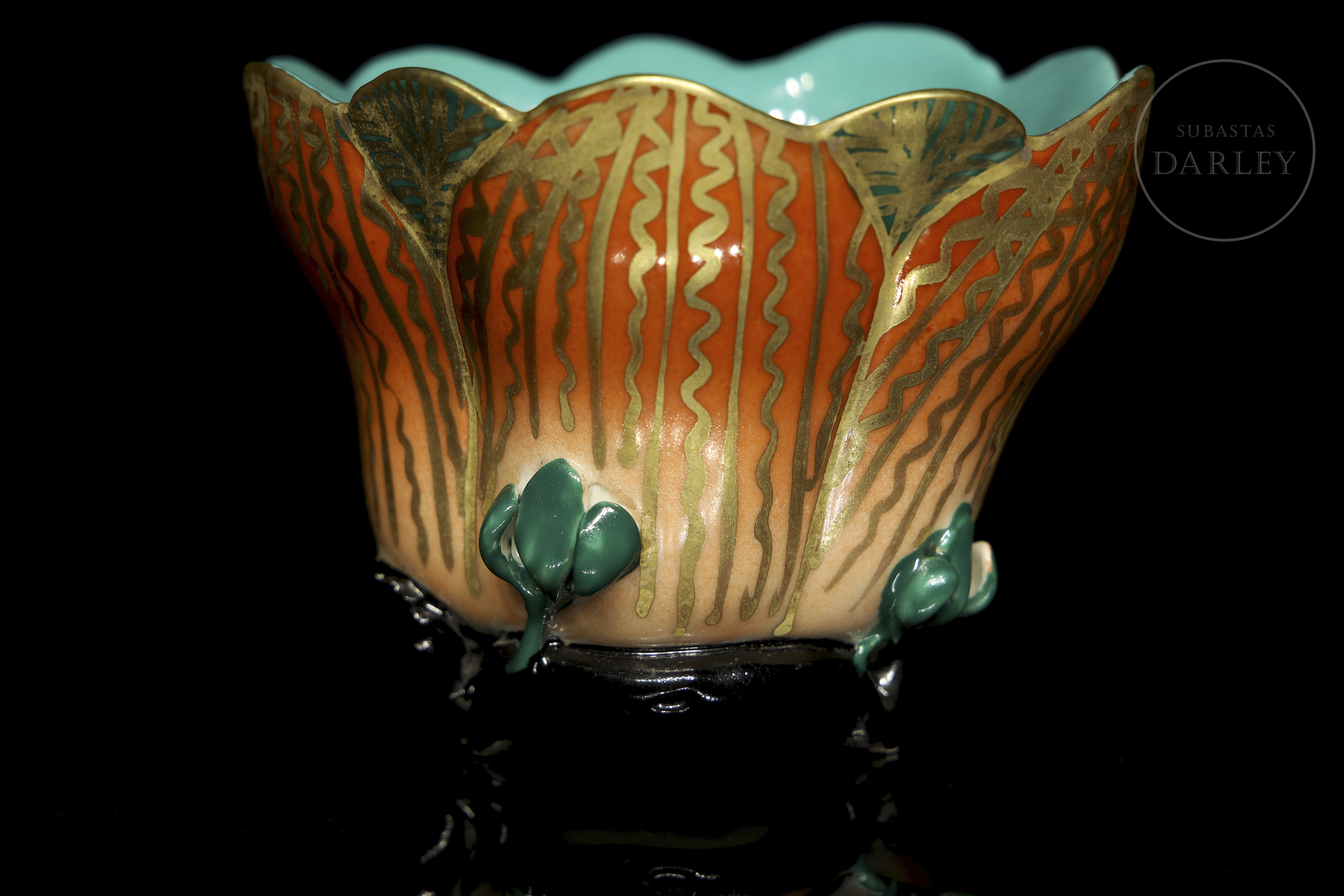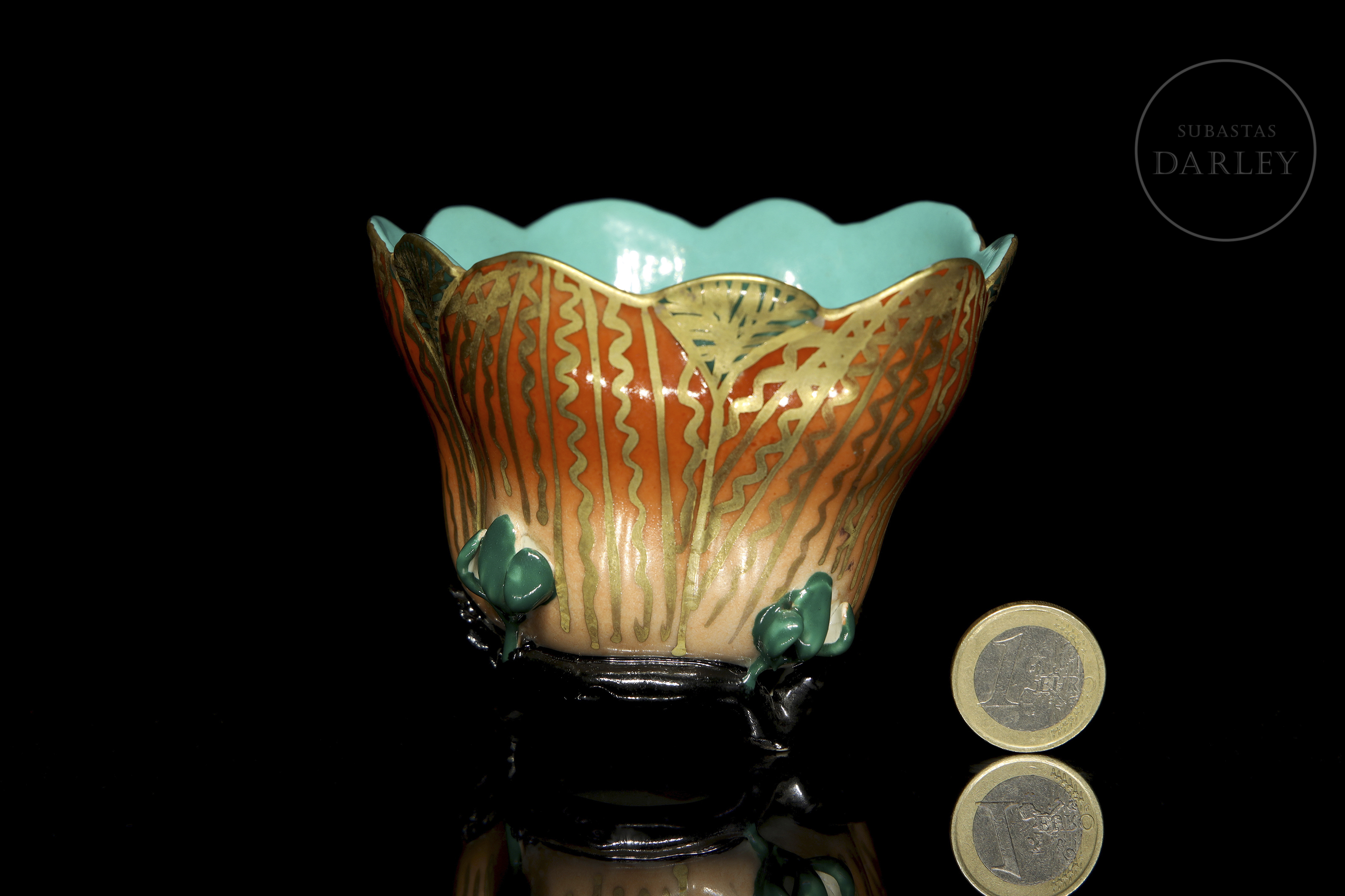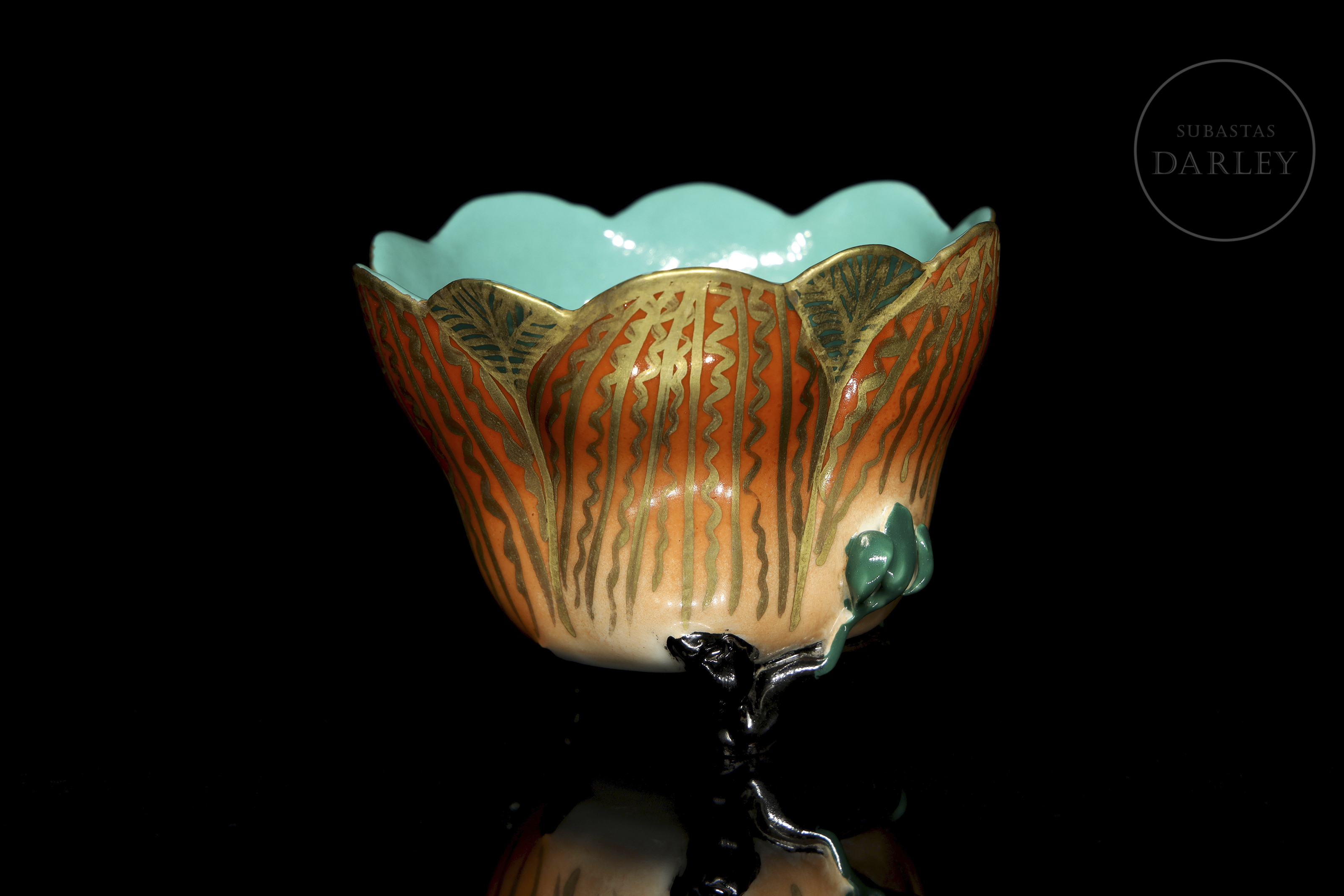 Porcelain modelled in the shape of an open flower, with a lobed outline and supported by a glazed tripod foot. Exterior decorated in orange and gold tones with green leaves; interior in turquoise enamel. The base bears a red seal with four characters: ‘雍正御製’.