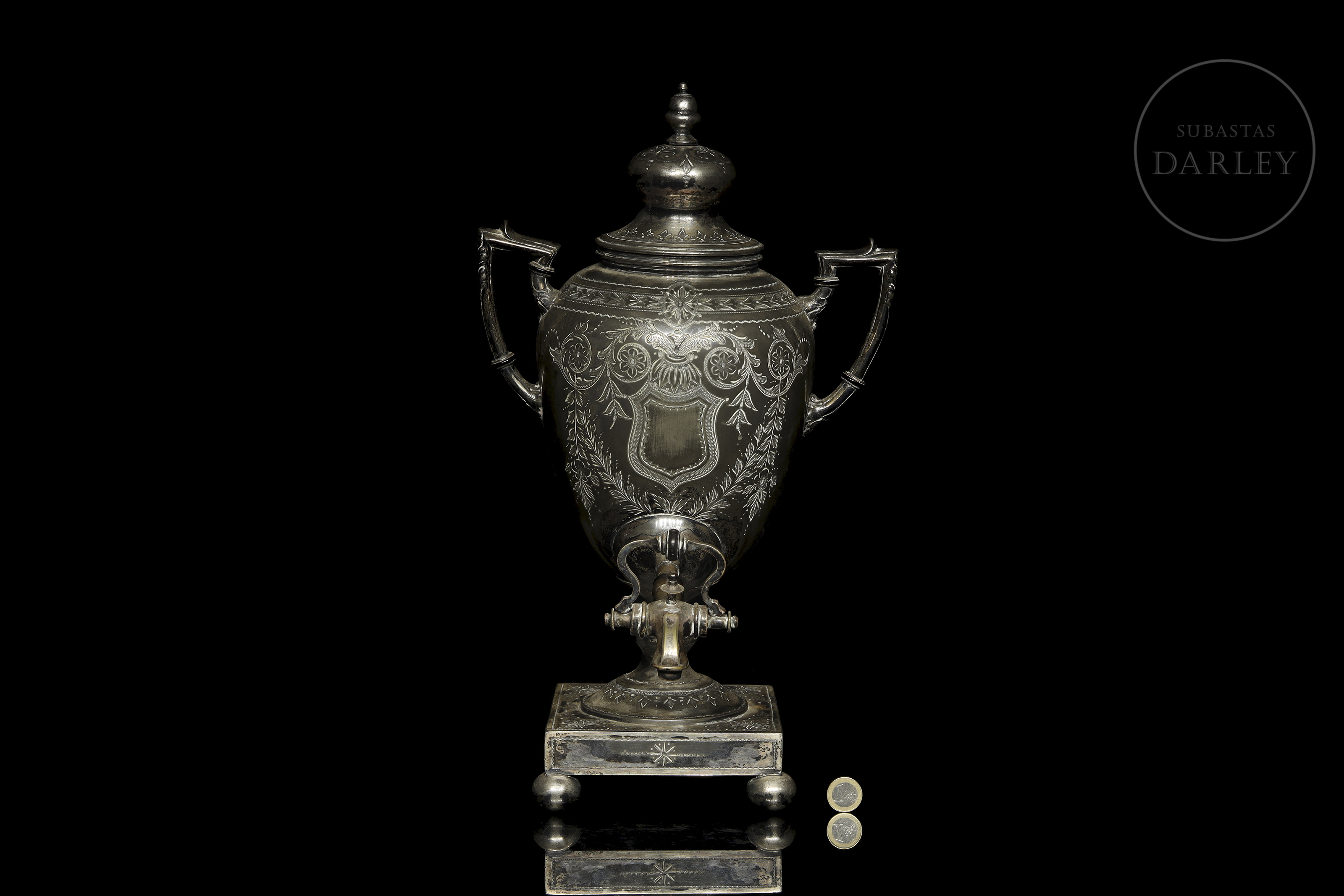 Pewter or metal ornamented with carved details of shields, garlands and borders. With manufacturing mark on the base.