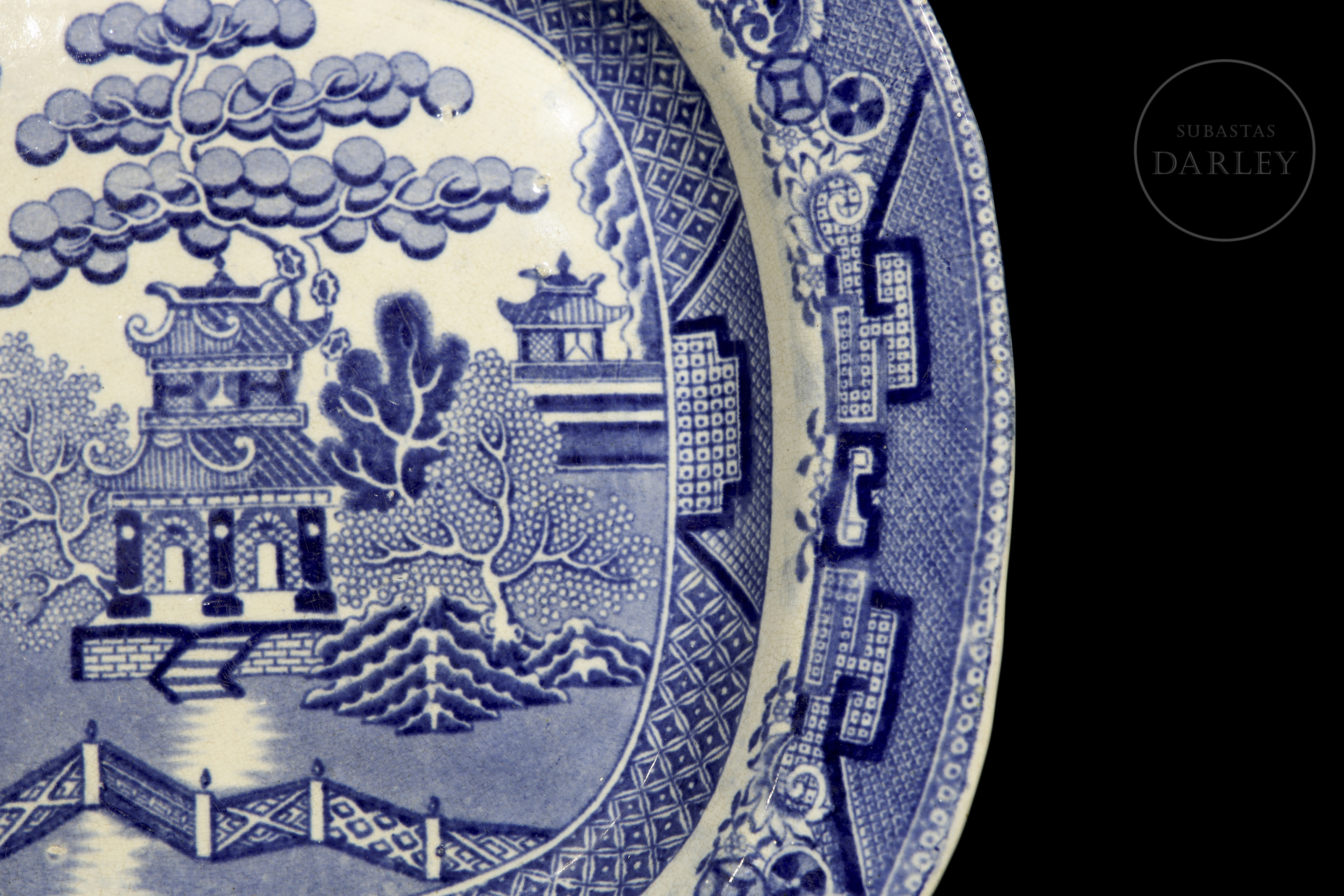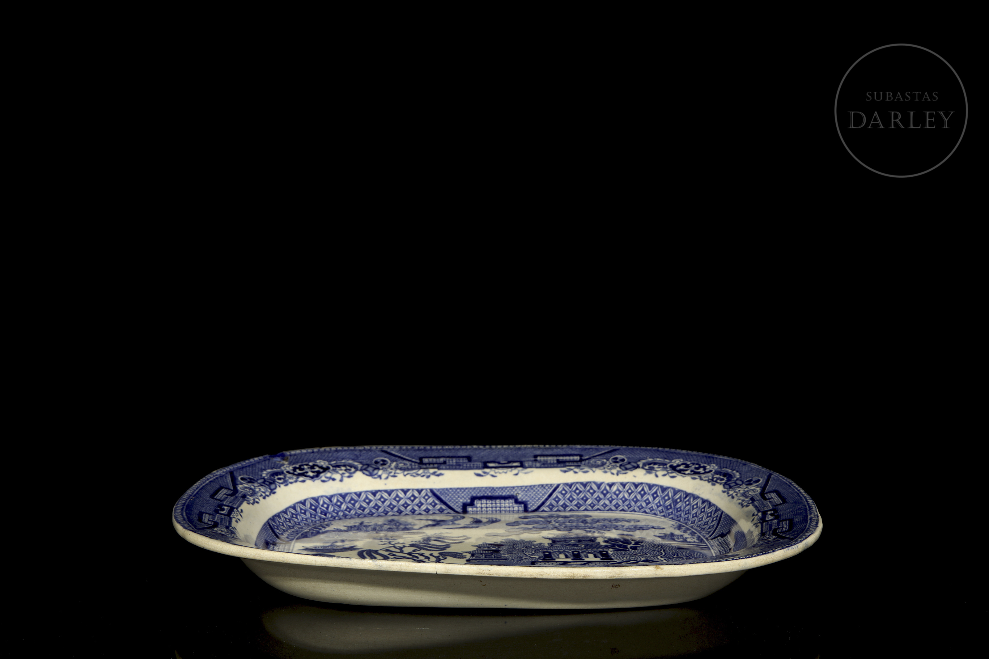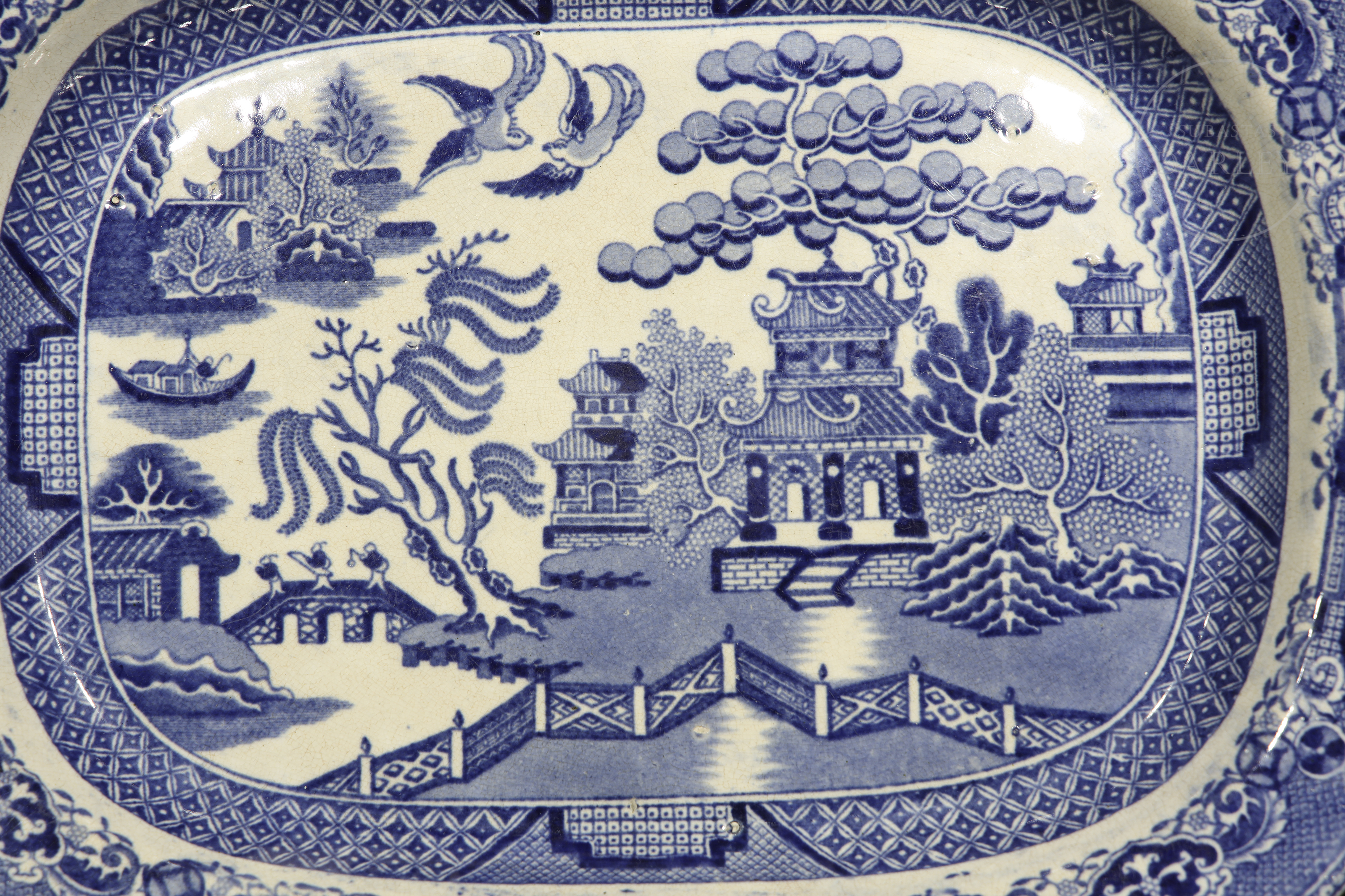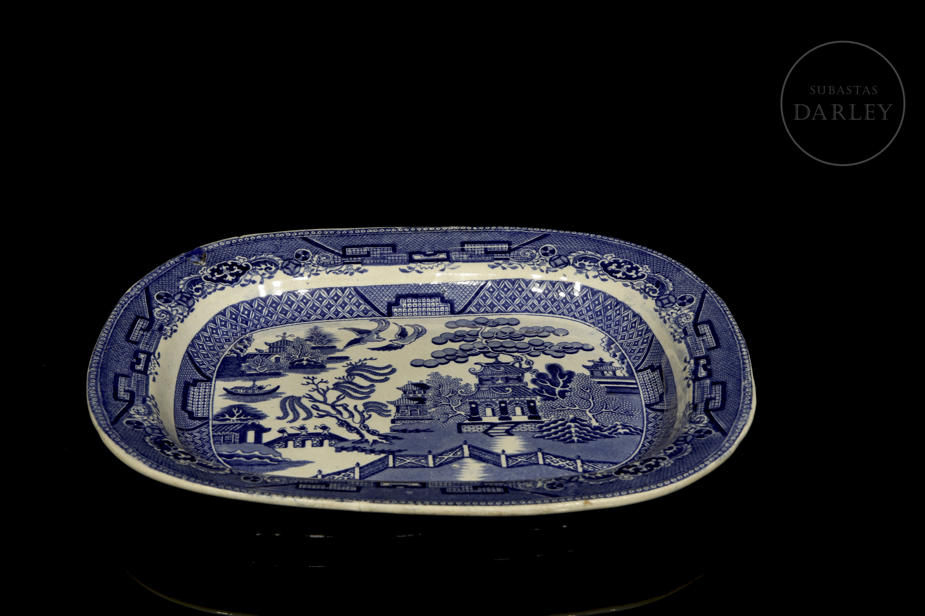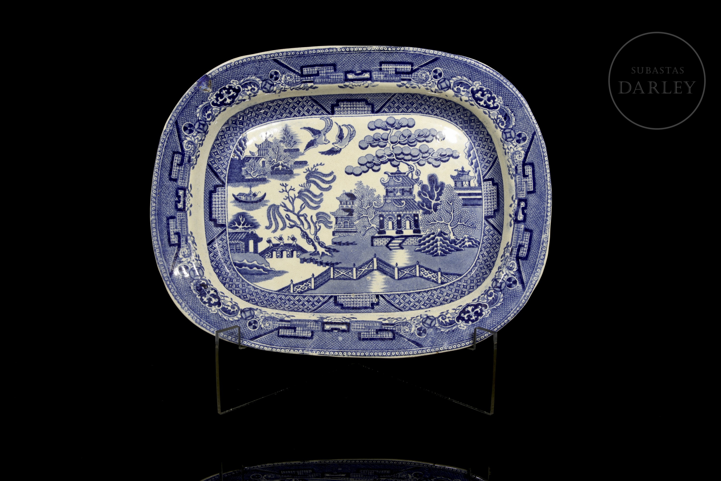 Tray or dish with the classic design known as ‘Willow Pattern’, which originated in England in the late 18th century and became very popular in the 19th century. Breakage in the upper left corner, repainted.