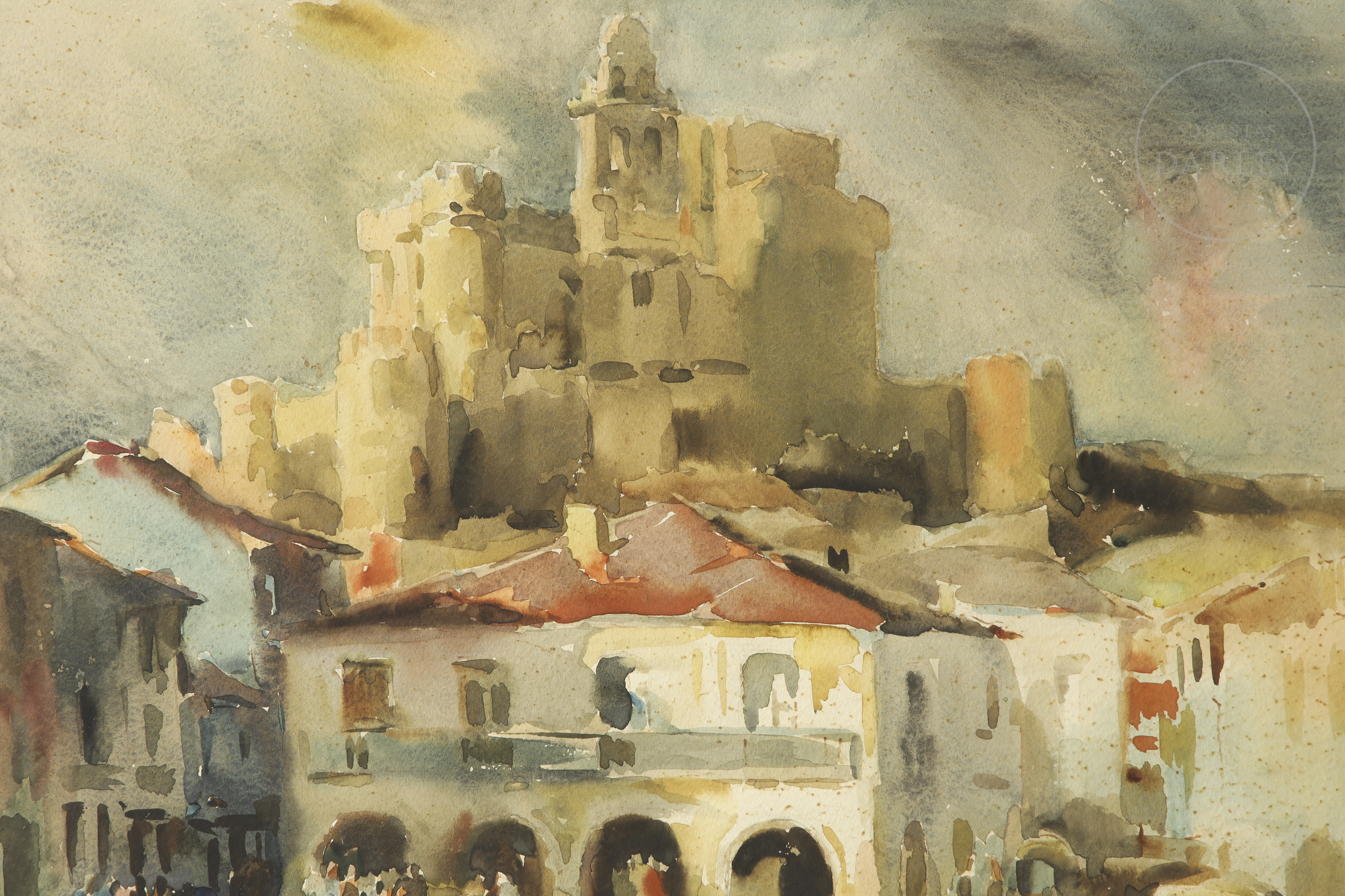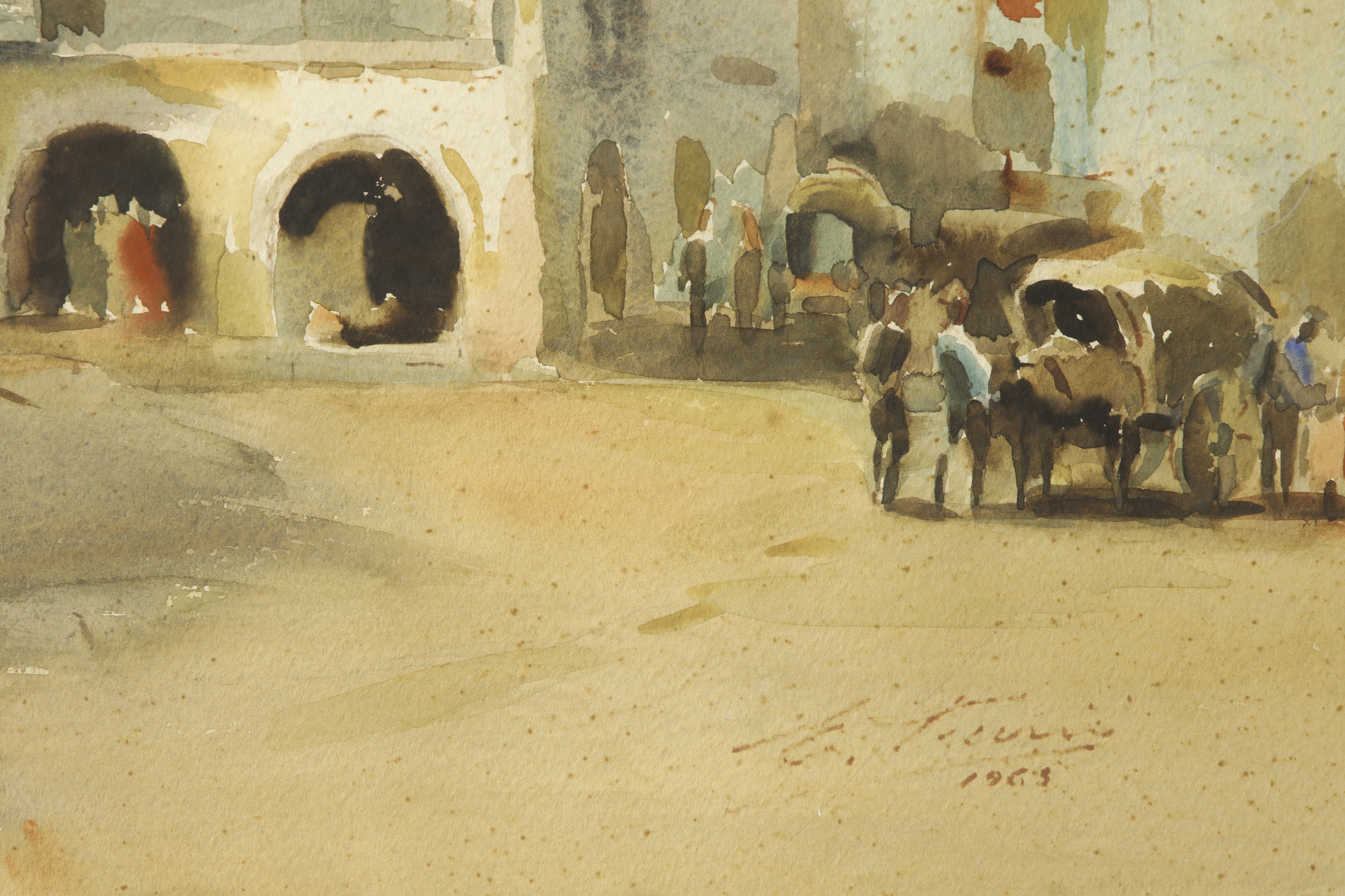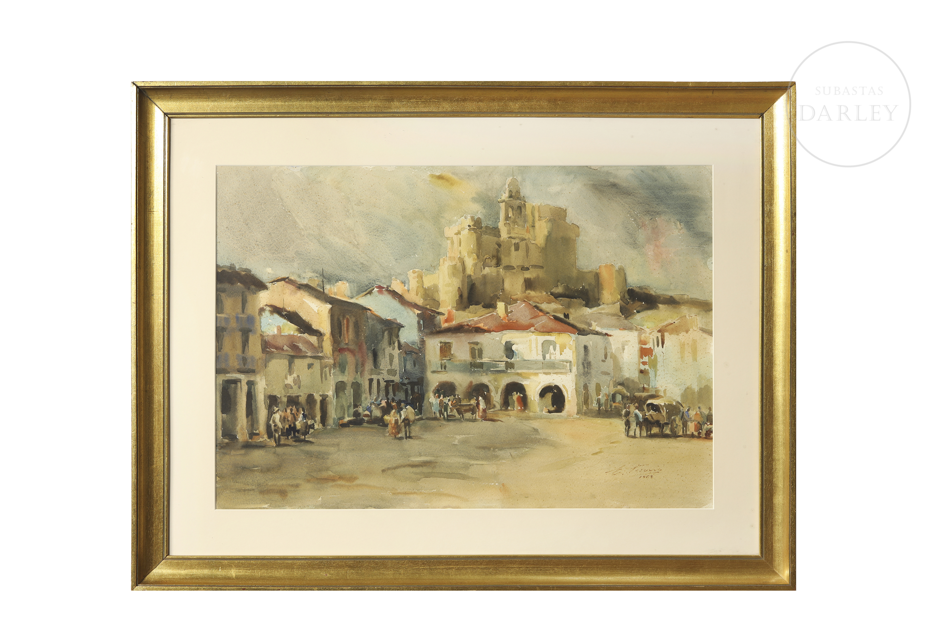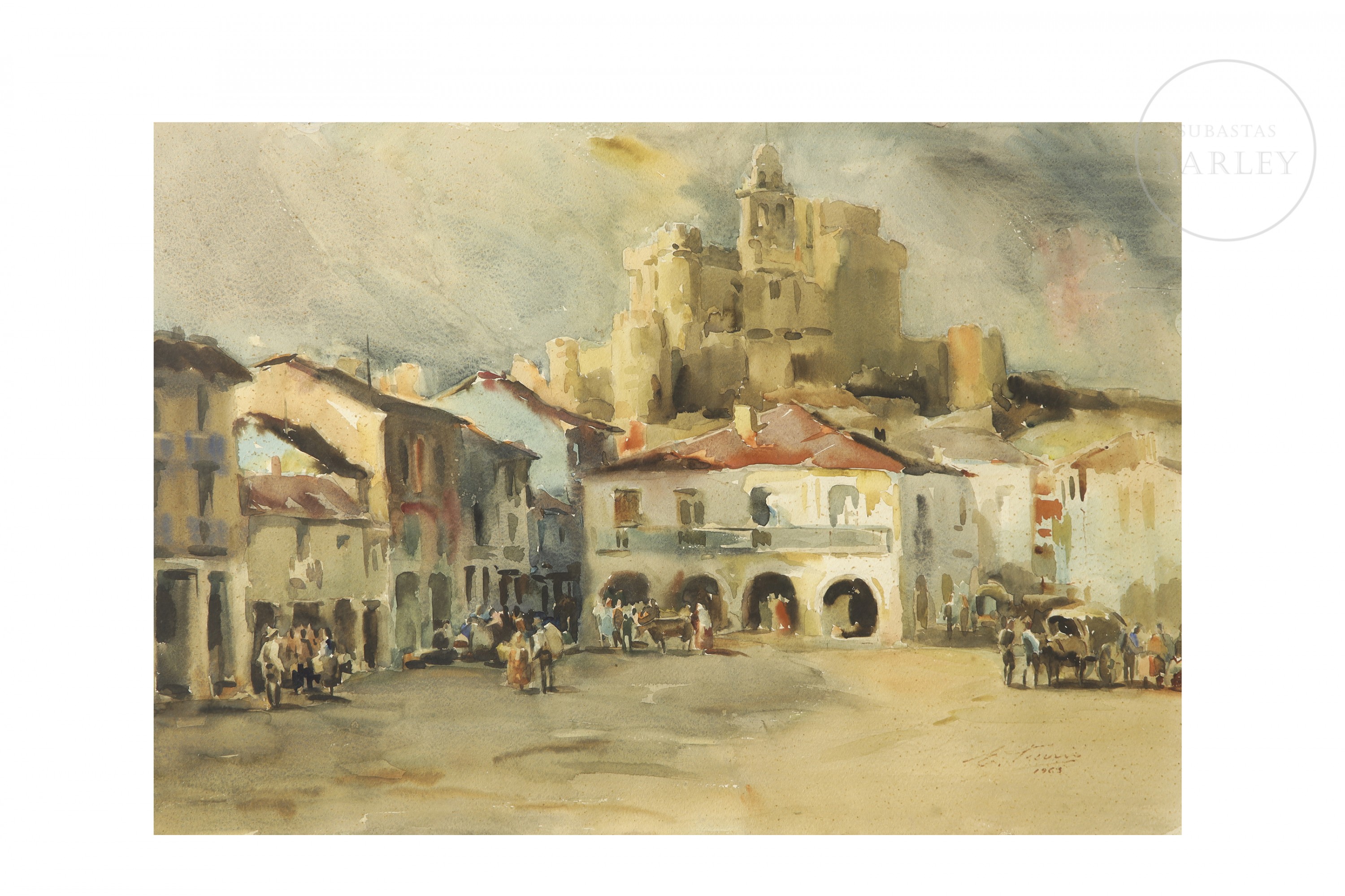 Watercolour on paper. Landscape composition depicting a square with figures, dominated in the background by the monumental silhouette of a church. Signed and dated ‘E. Furió/1963’ in the lower right corner.