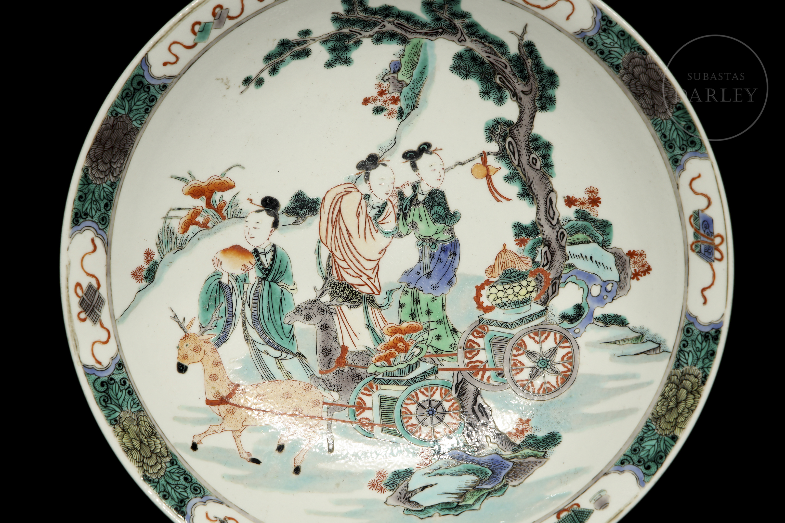 Open-wing porcelain plate decorated with ‘Famille Verte’ enamels. It depicts a court scene with ladies, a deer-drawn carriage and a landscape with pine trees and rocks. The rim features cartouches with floral motifs and ruyi ribbons. The reverse, decorated with flowering branches, bears a blue underglaze seal with six characters: ‘大清康熙年制’.